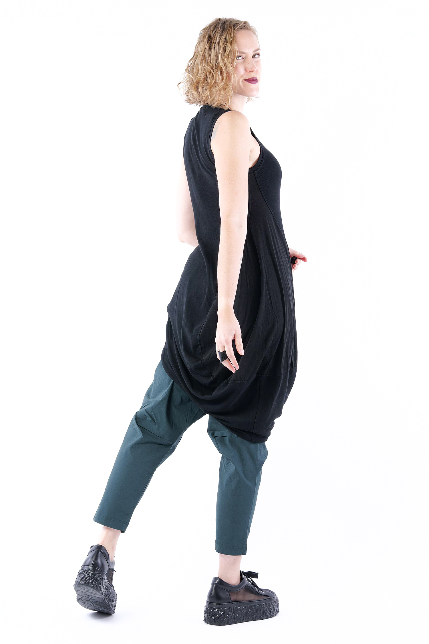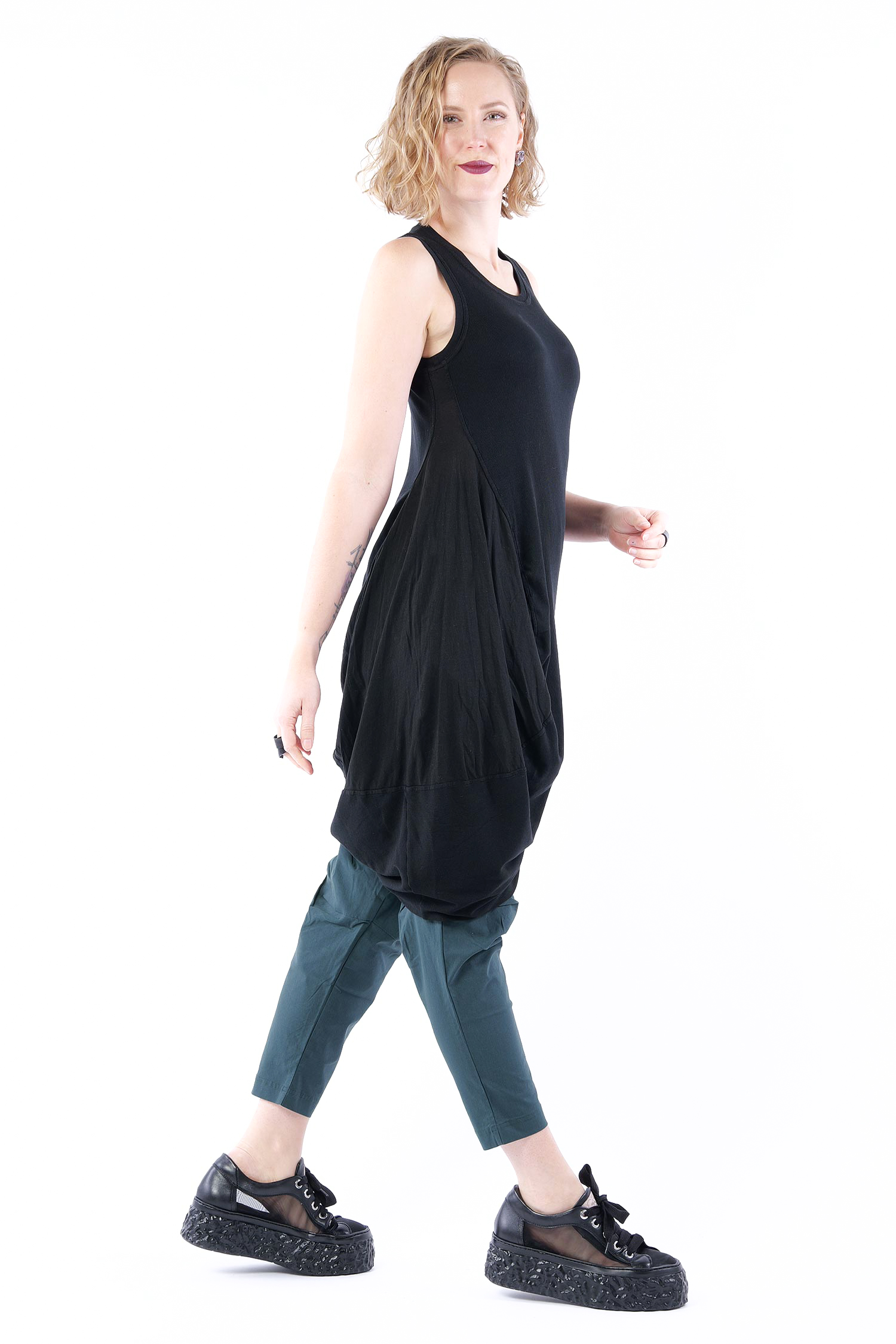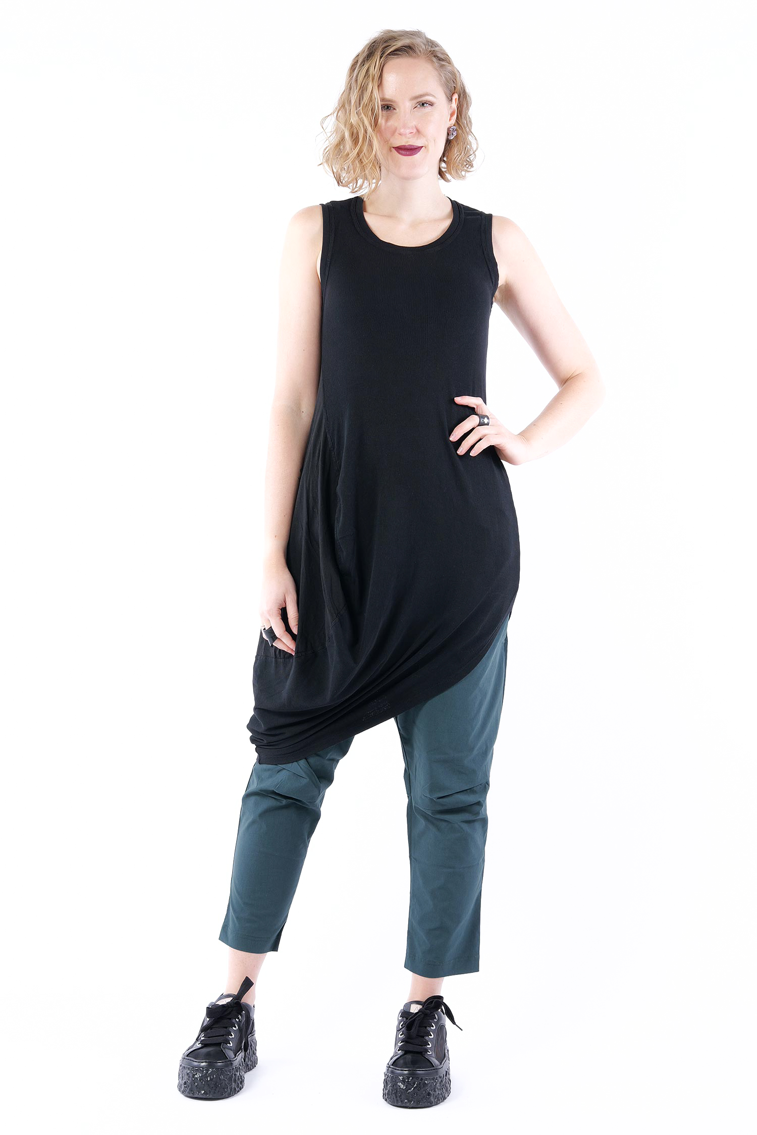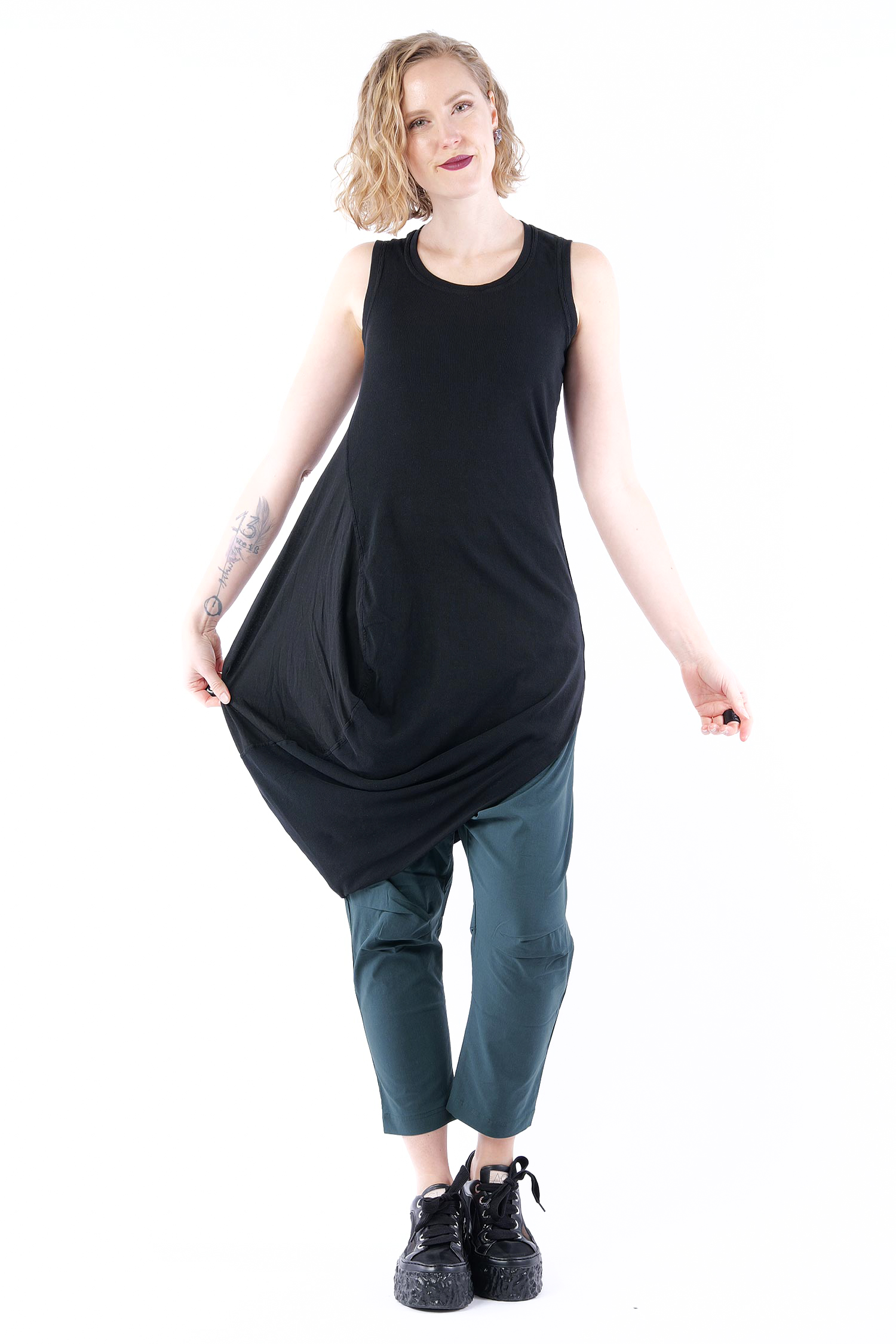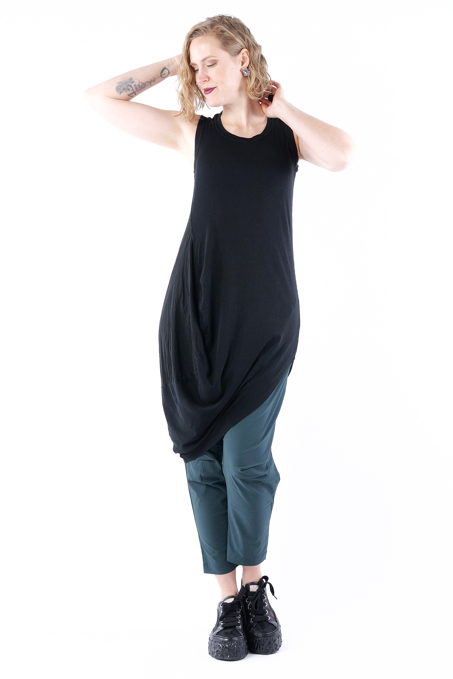 - Linke Seite tulpig geschnitten mit glattem Jersey eingesetzt, rafft sich beim tragen hoch