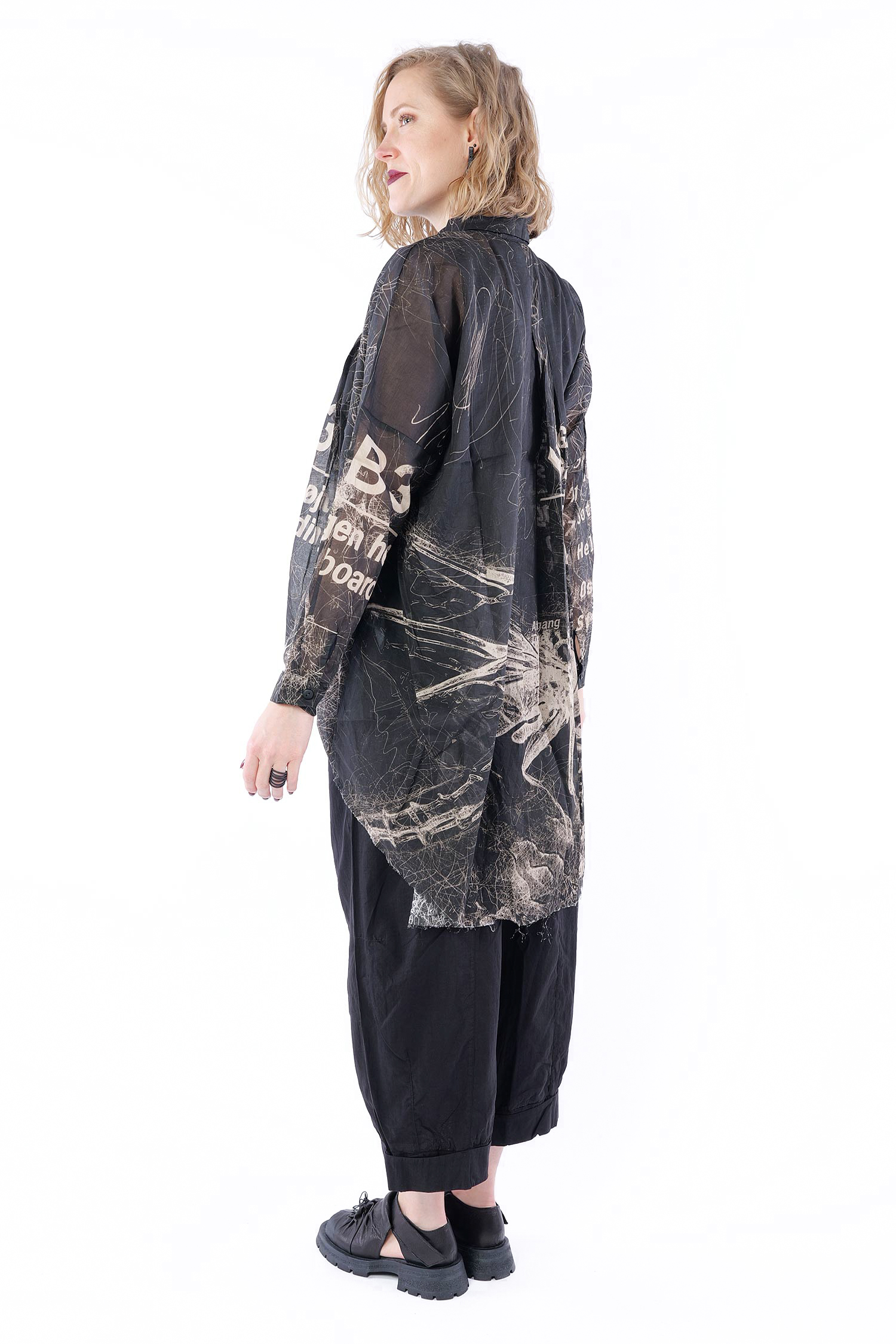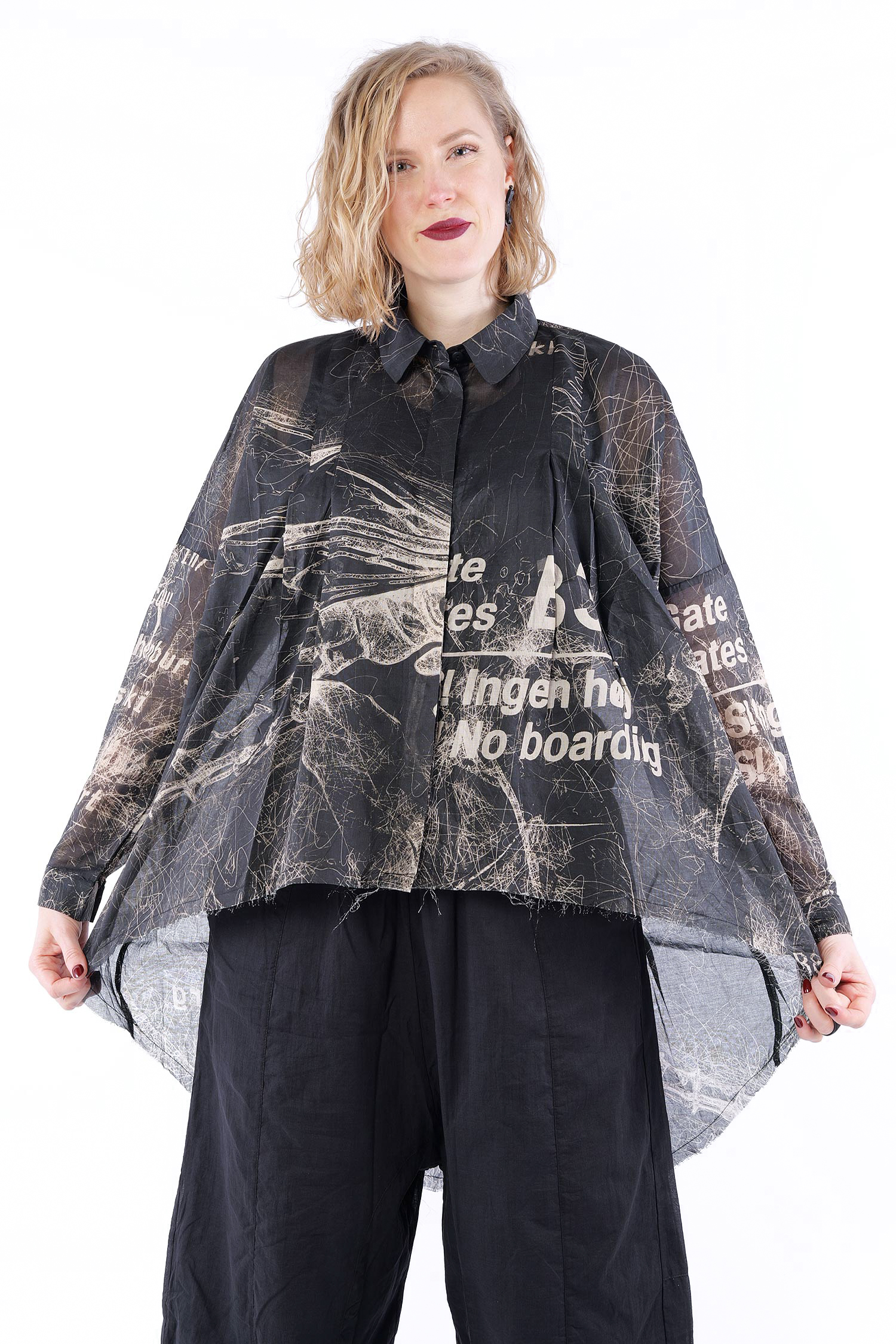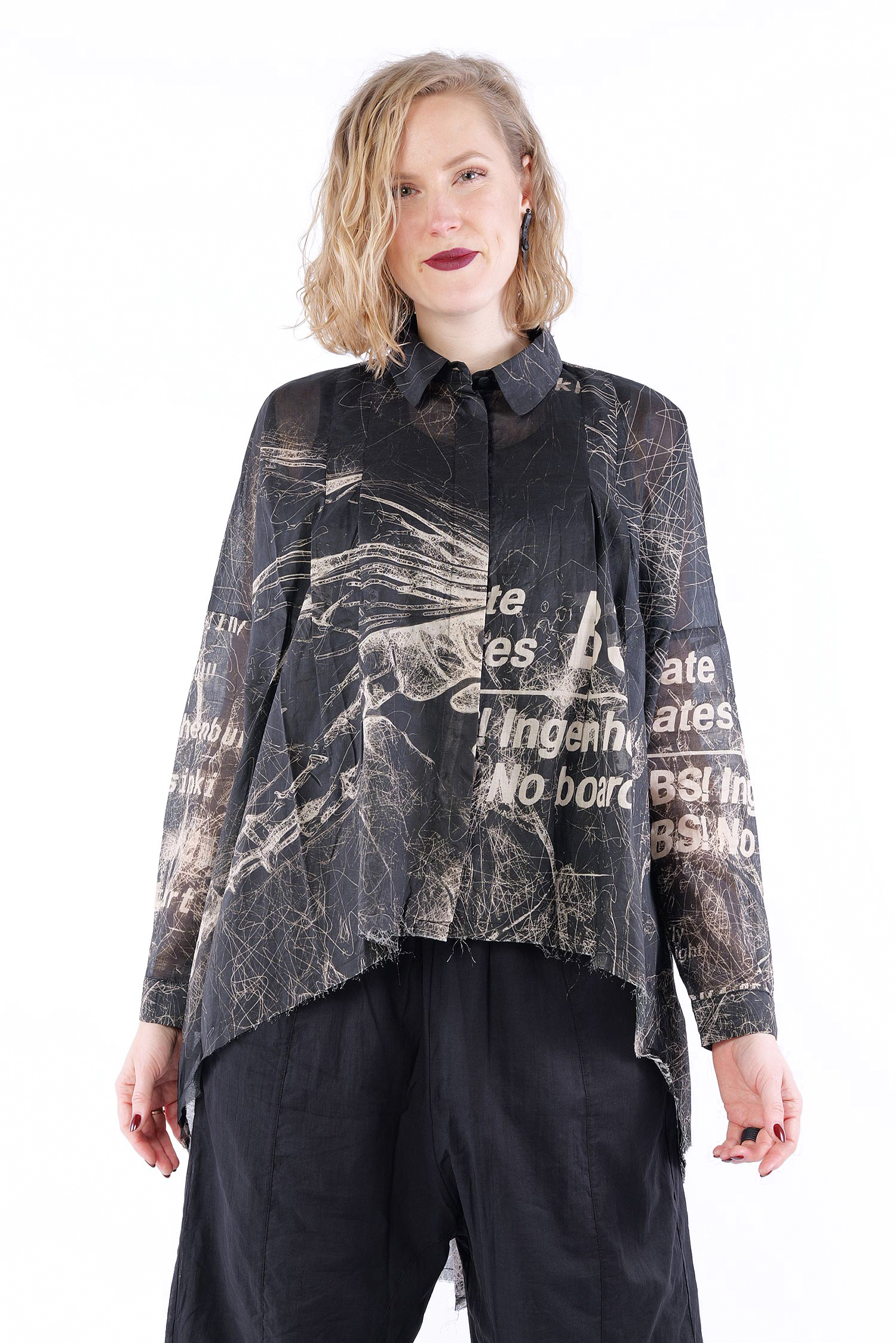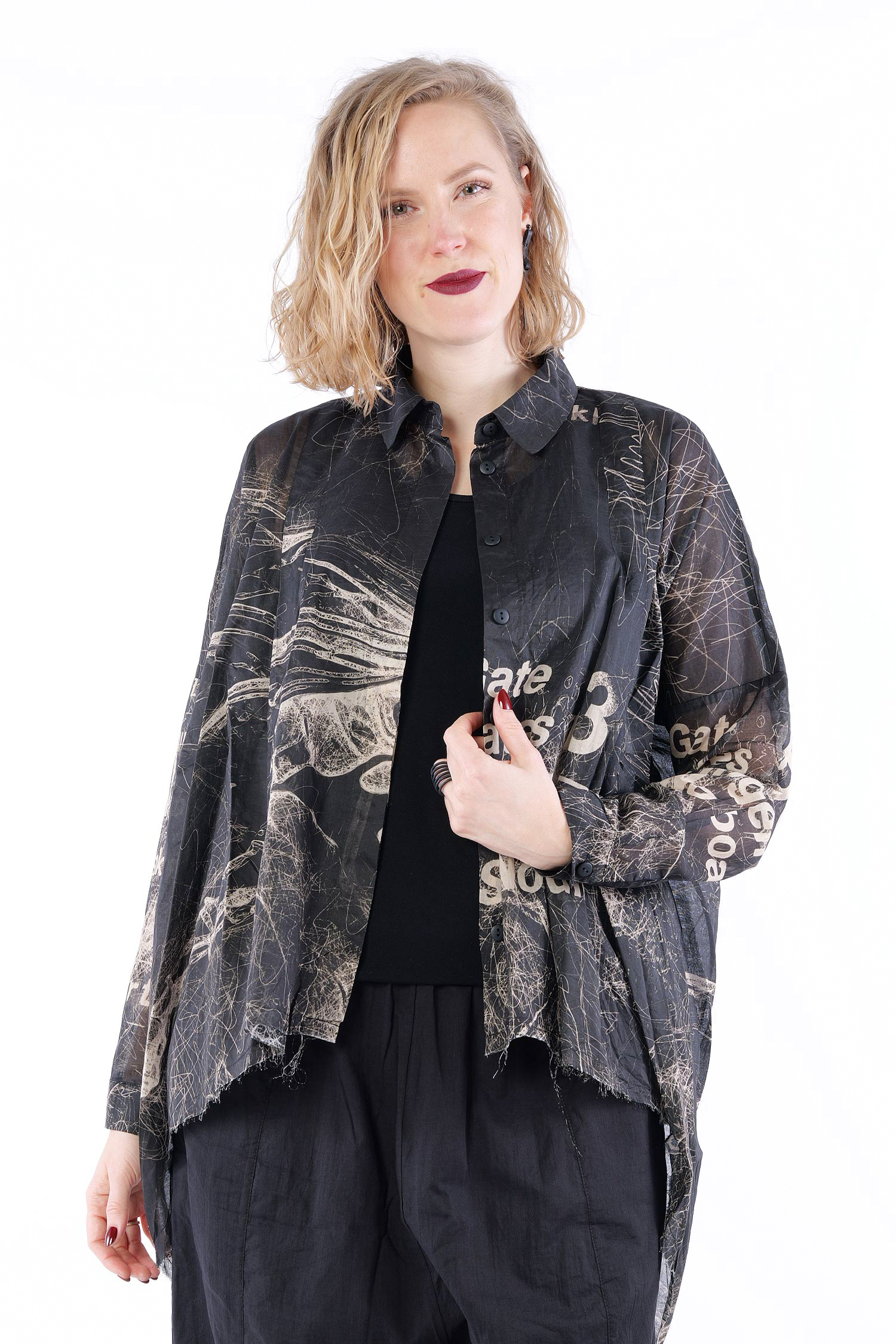 Details: - Leichter Baumwoll-Voile - Weit und kastig - Oversize - Verdeckte Knopfleiste - Kragen - Abgerundeter Saum - Ärmelsaum mit einem Knopf und Schlitz - Offene fransige Kanten - Hinten deutlich länger - Falten im Brustbereich - Kellerfalte im oberen Rücken