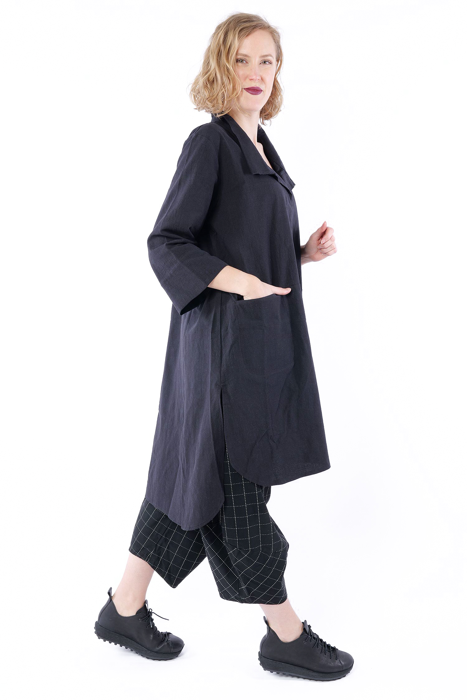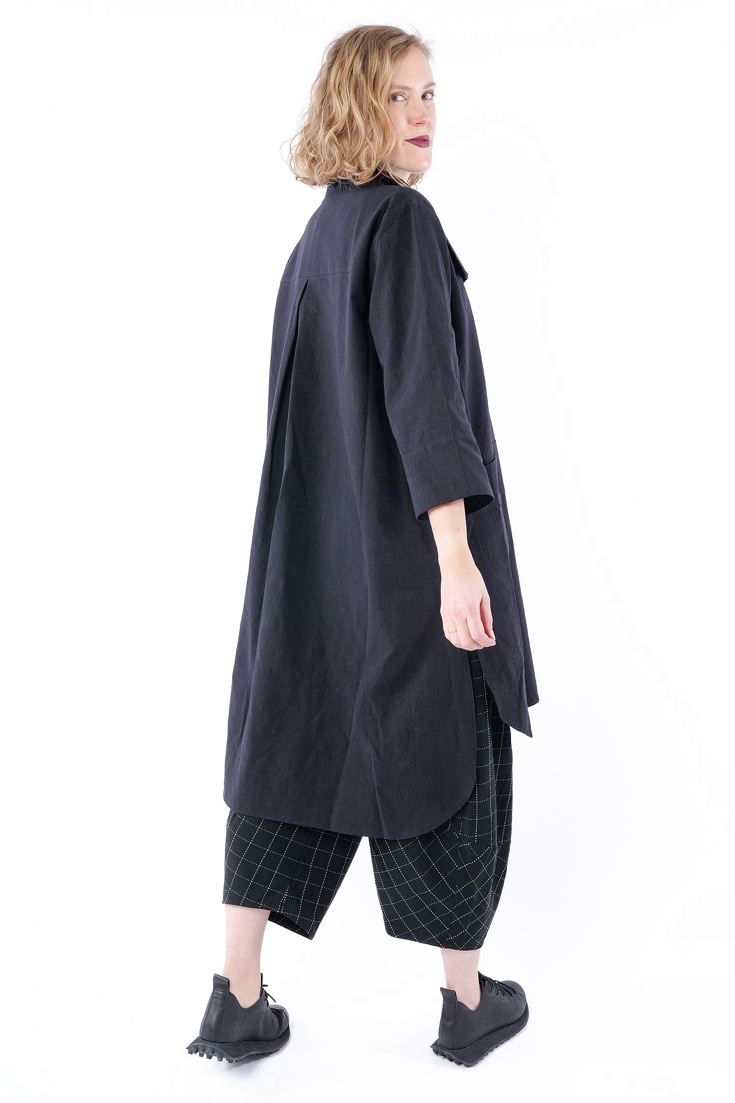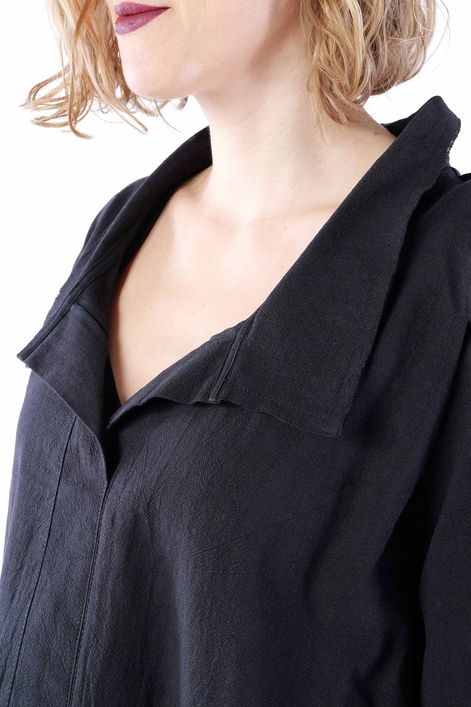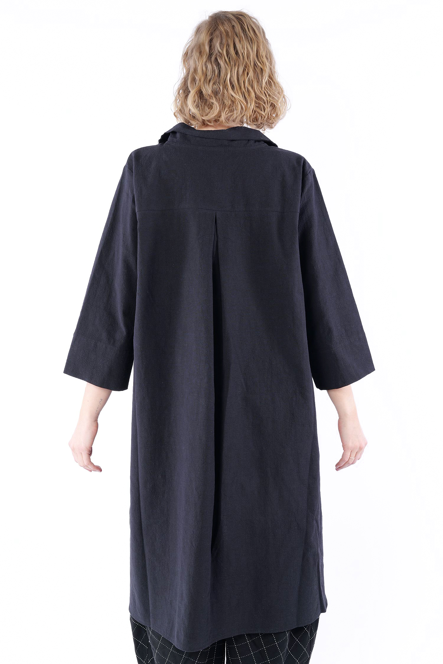 Details: - Hinten länger - Seitlich geschlitzt - Saum abgerundet - Weit und minimal ausgestellt - Poloausschnitt mit großem Kragen - Taschen vorn - 3/4tel Ärmel - Kanten versäubert - Strukturiertes Material