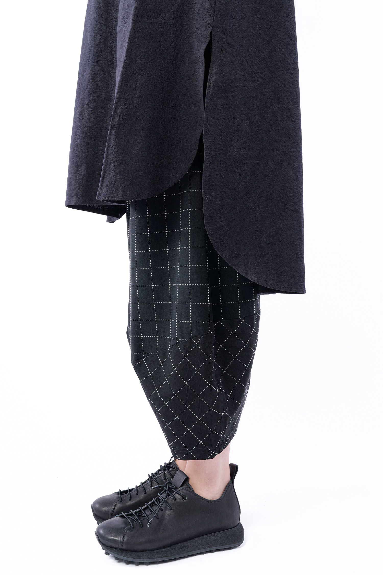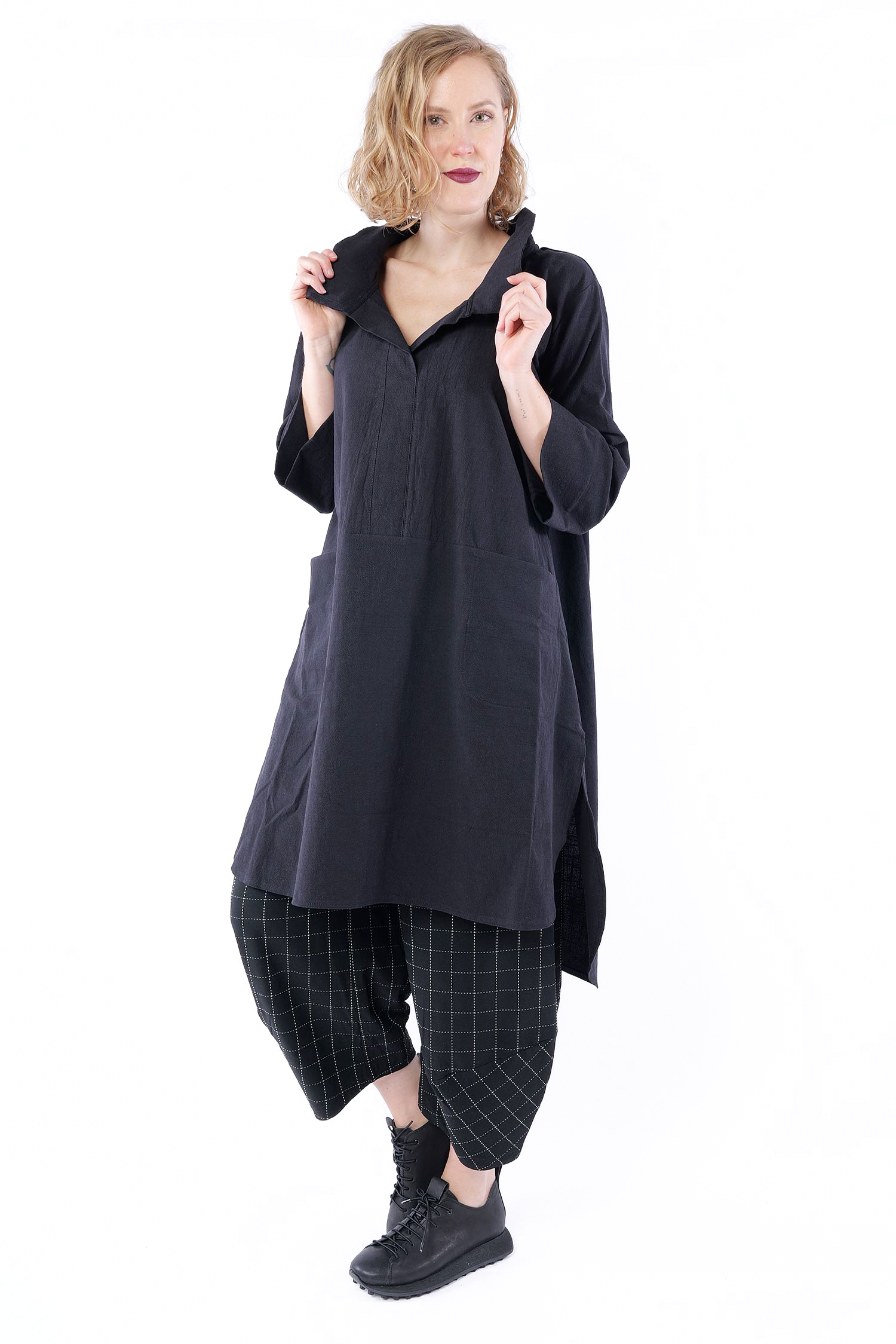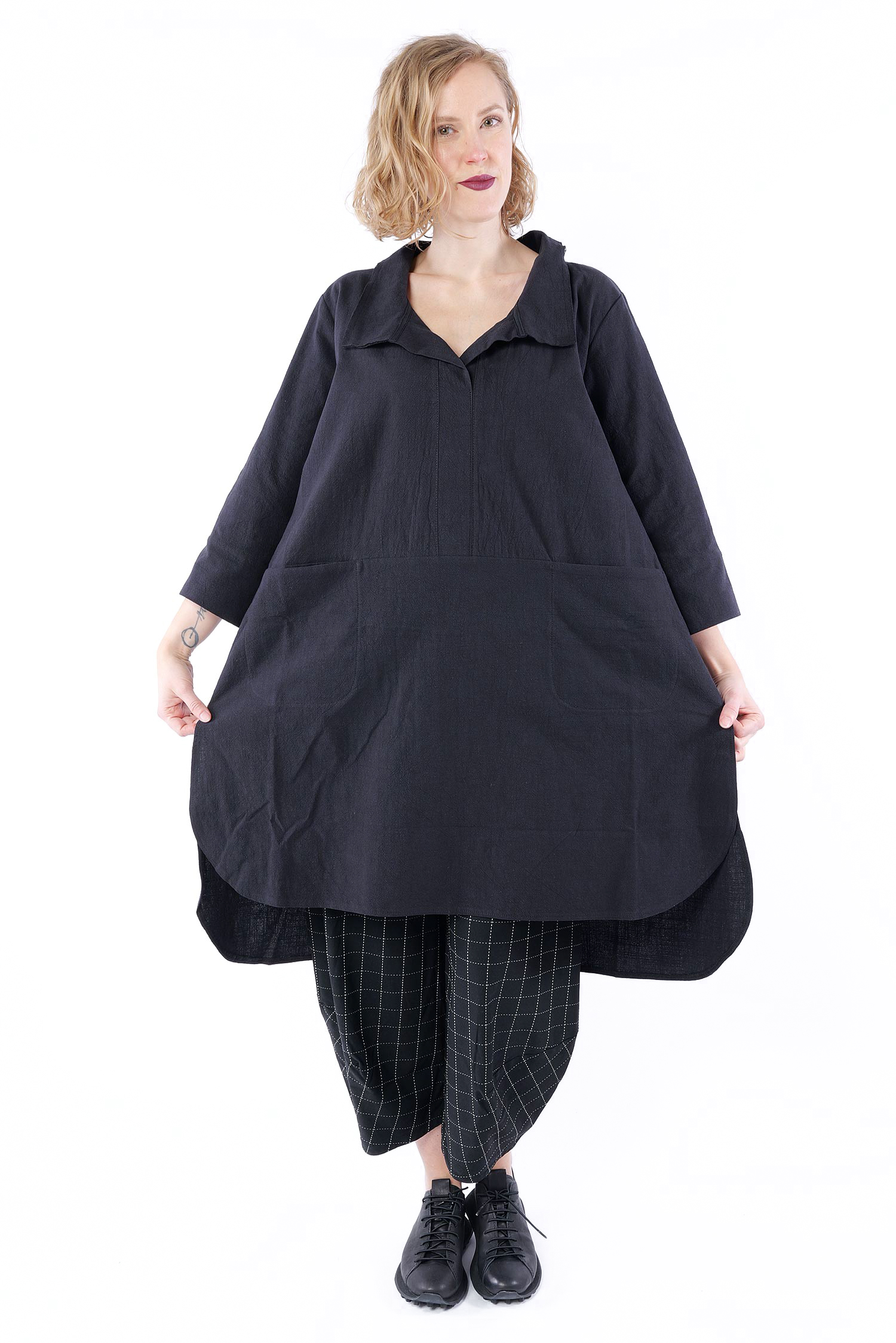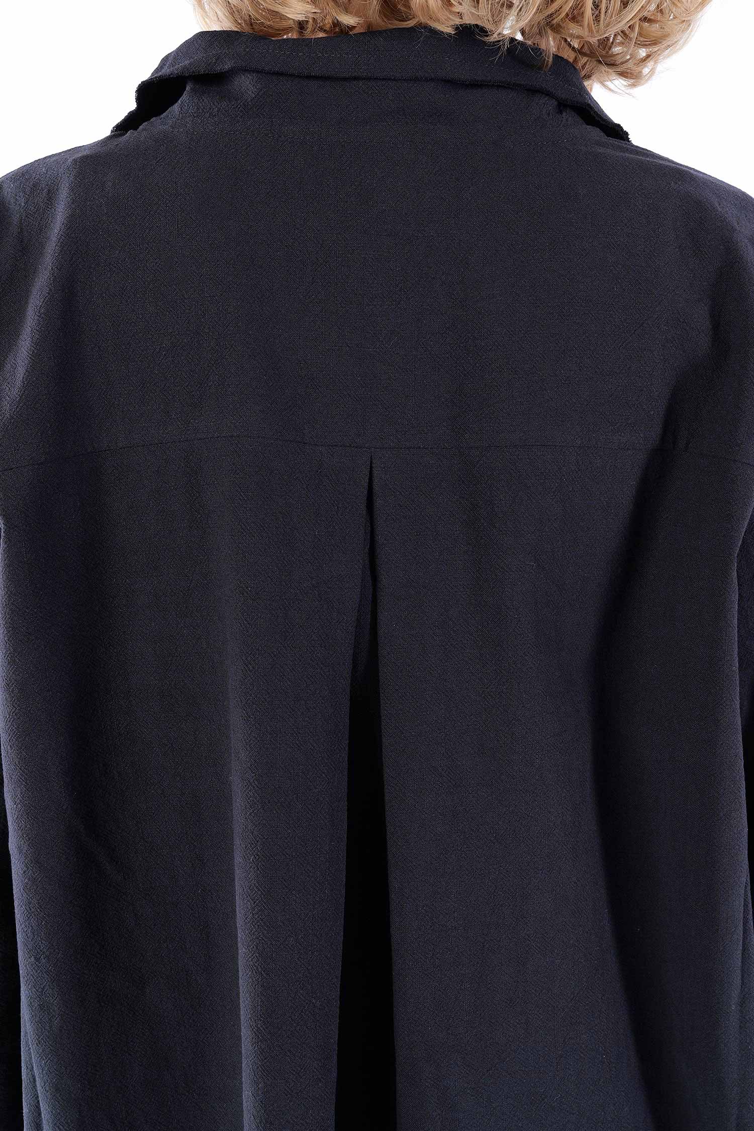 Details: - Hinten länger - Seitlich geschlitzt - Saum abgerundet - Weit und minimal ausgestellt - Poloausschnitt mit großem Kragen - Taschen vorn - 3/4tel Ärmel - Kanten versäubert - Strukturiertes Material
