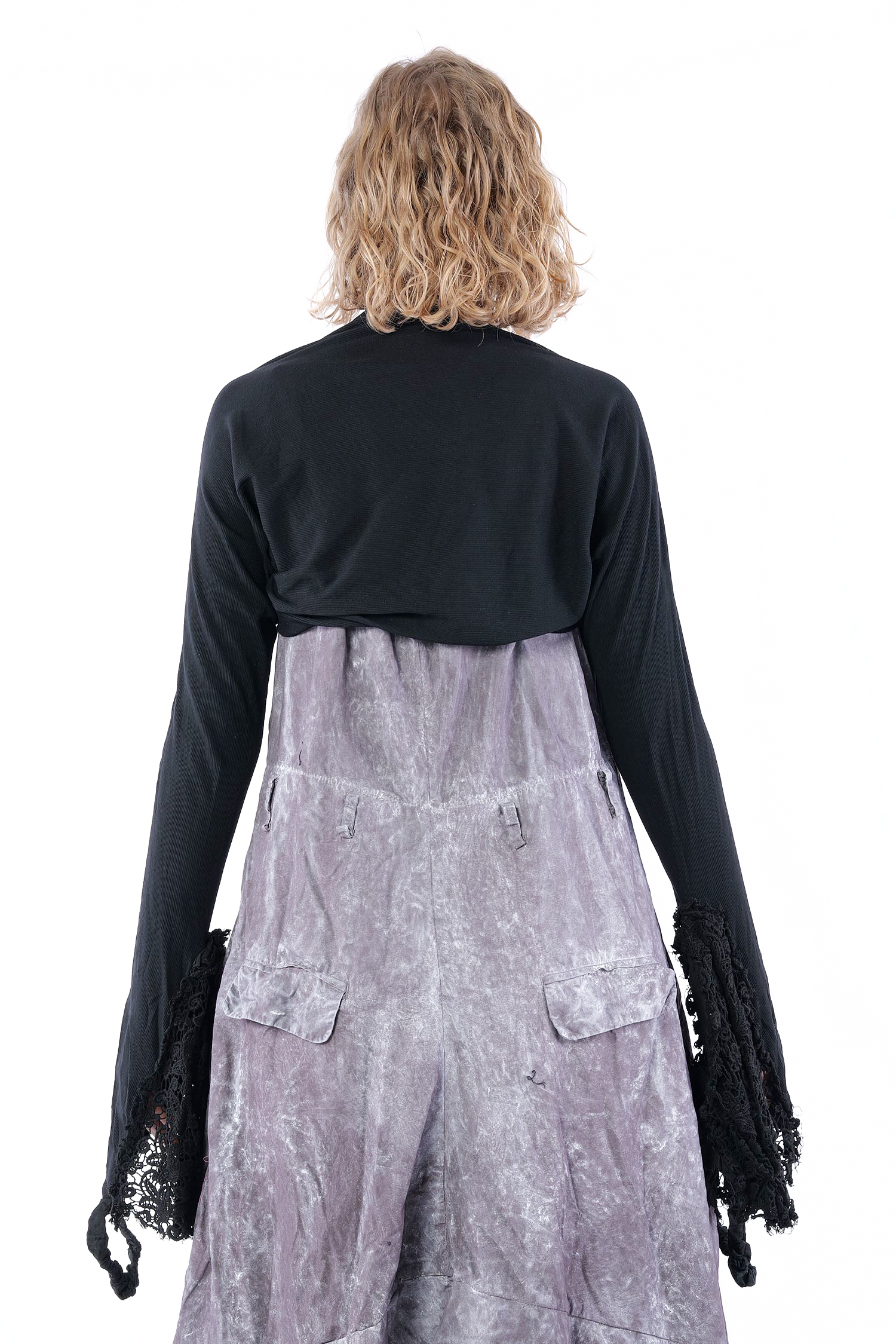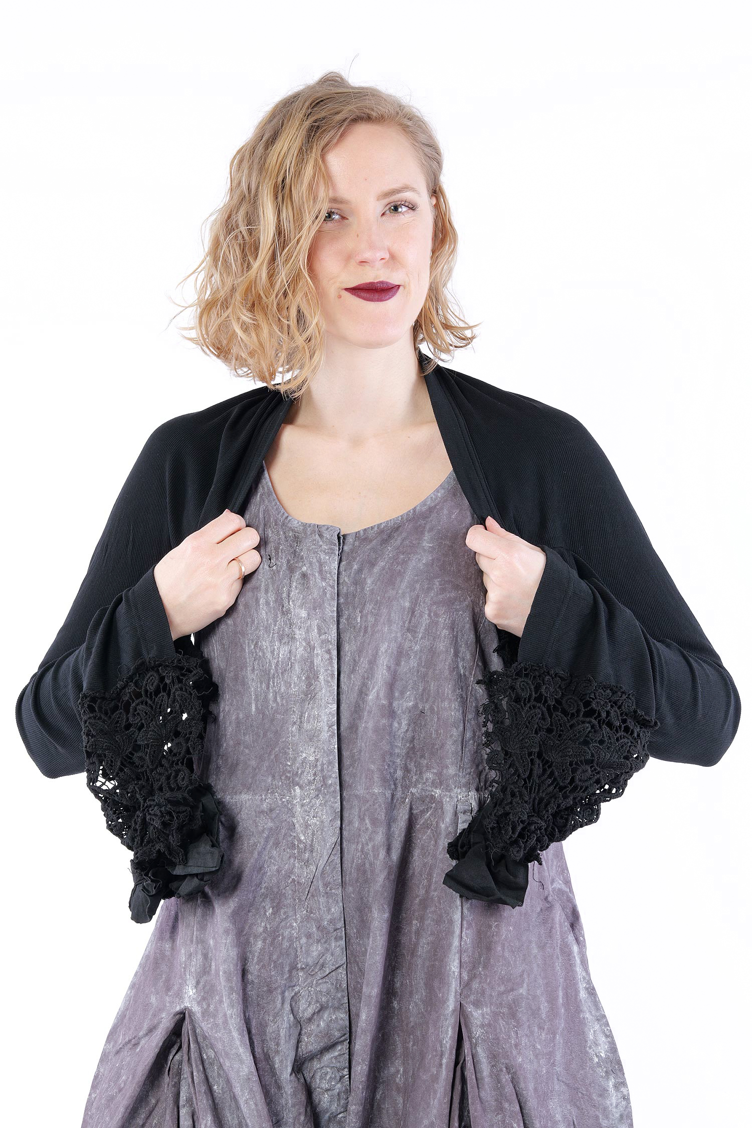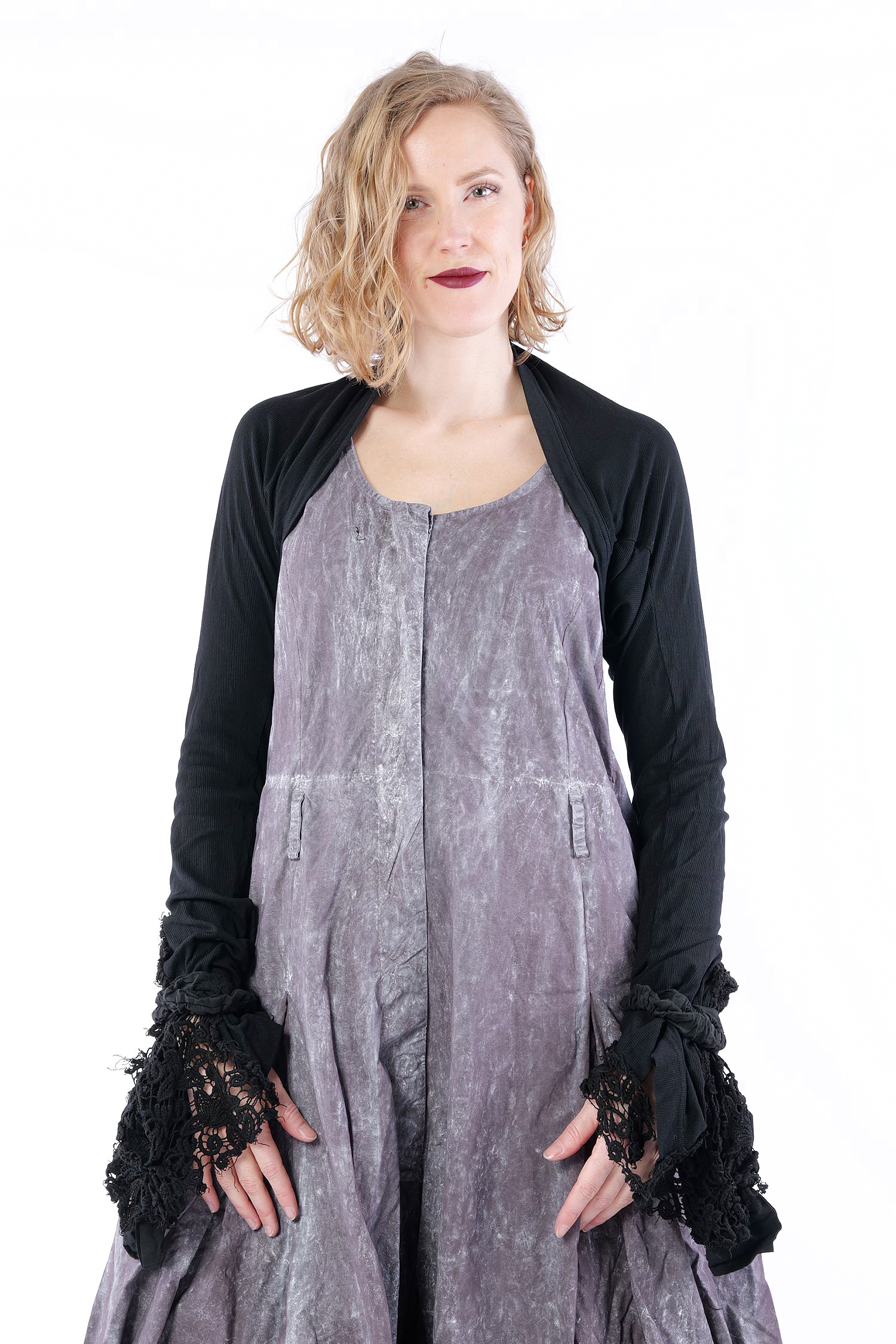 Details: - Wird offen getragen - Lange Ärmel - Ärmelsaum aus Baumwollspitze mit Gummiband zur „Befestigung“ - Used Look bei der Spitze - Korpus aus Rippjersey