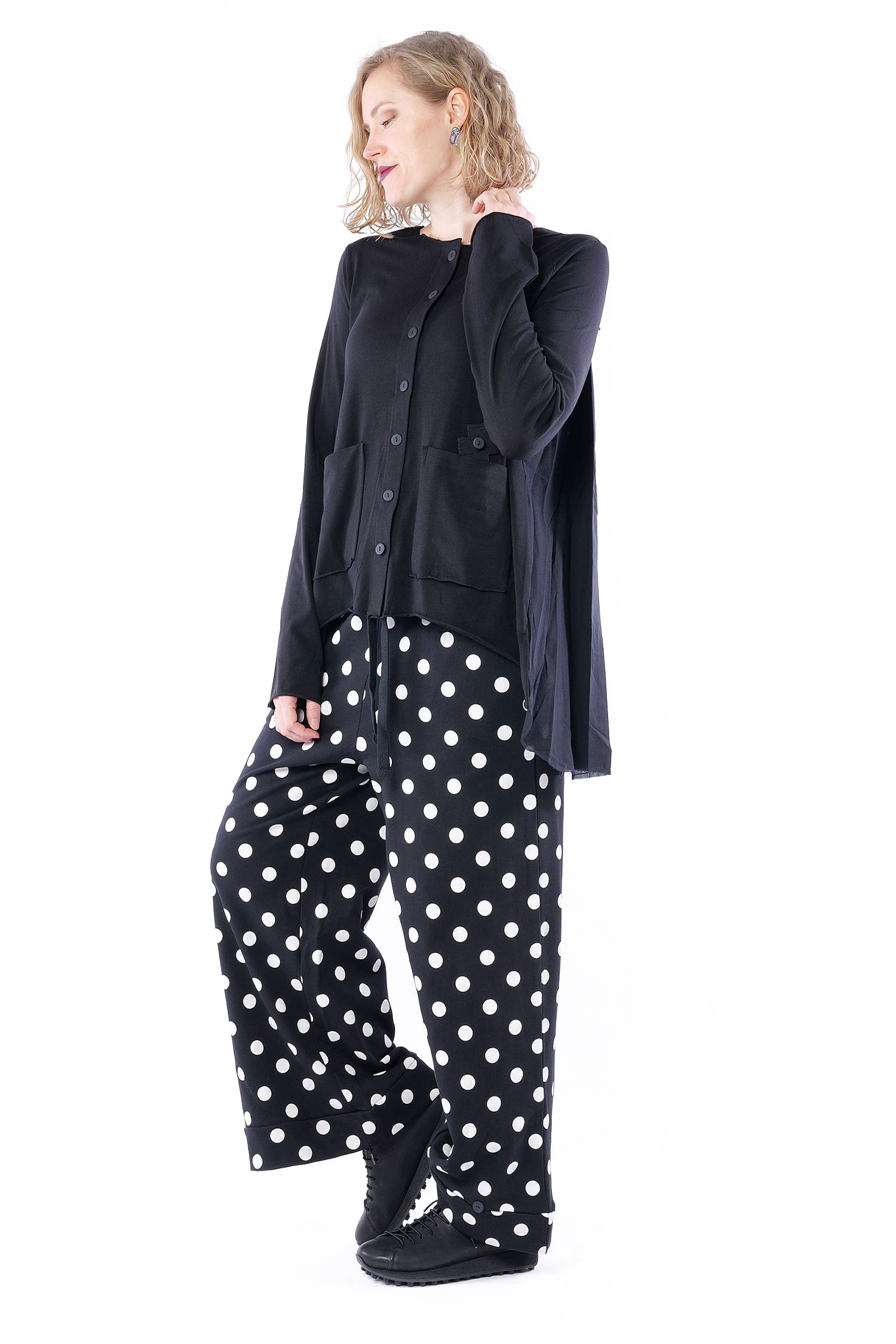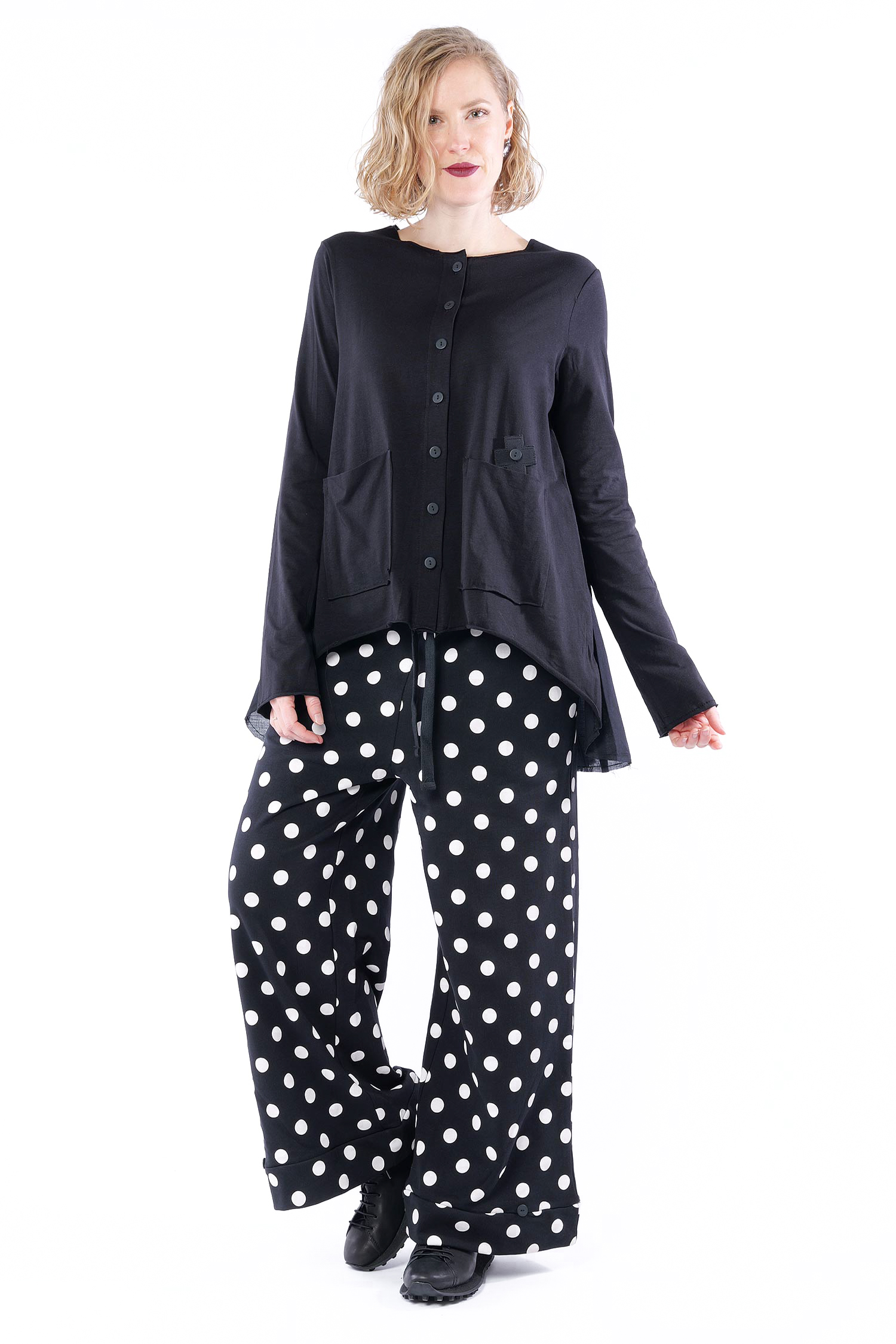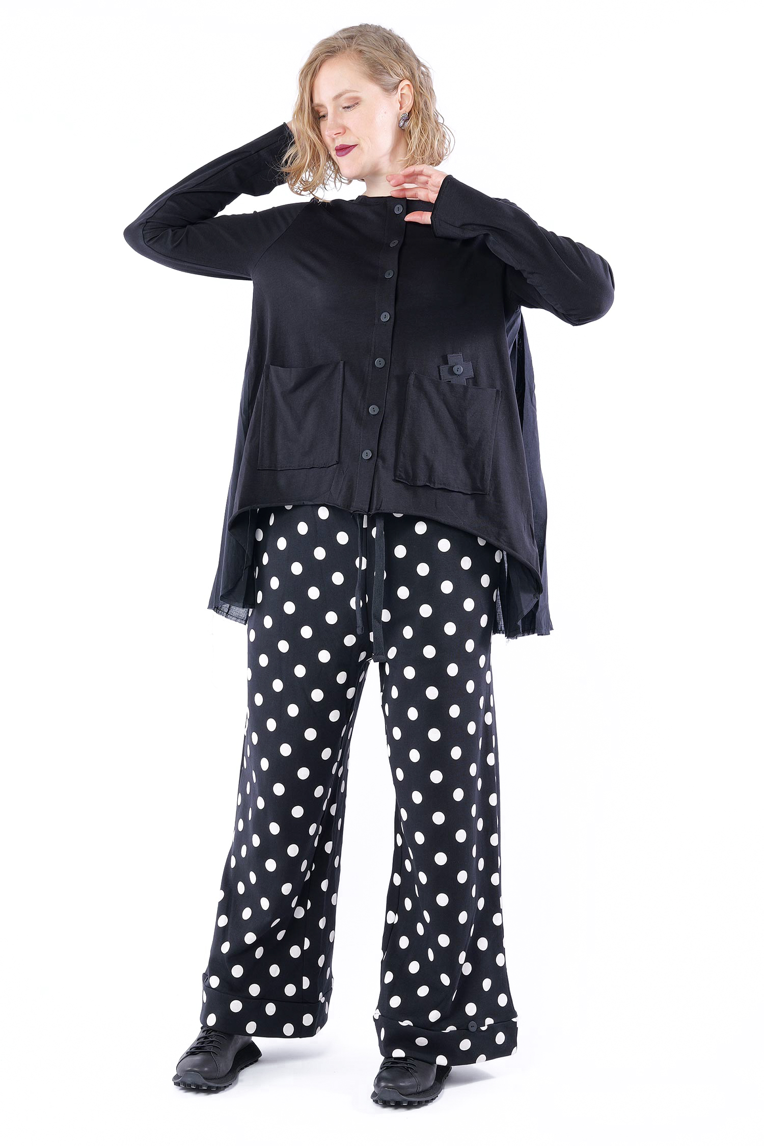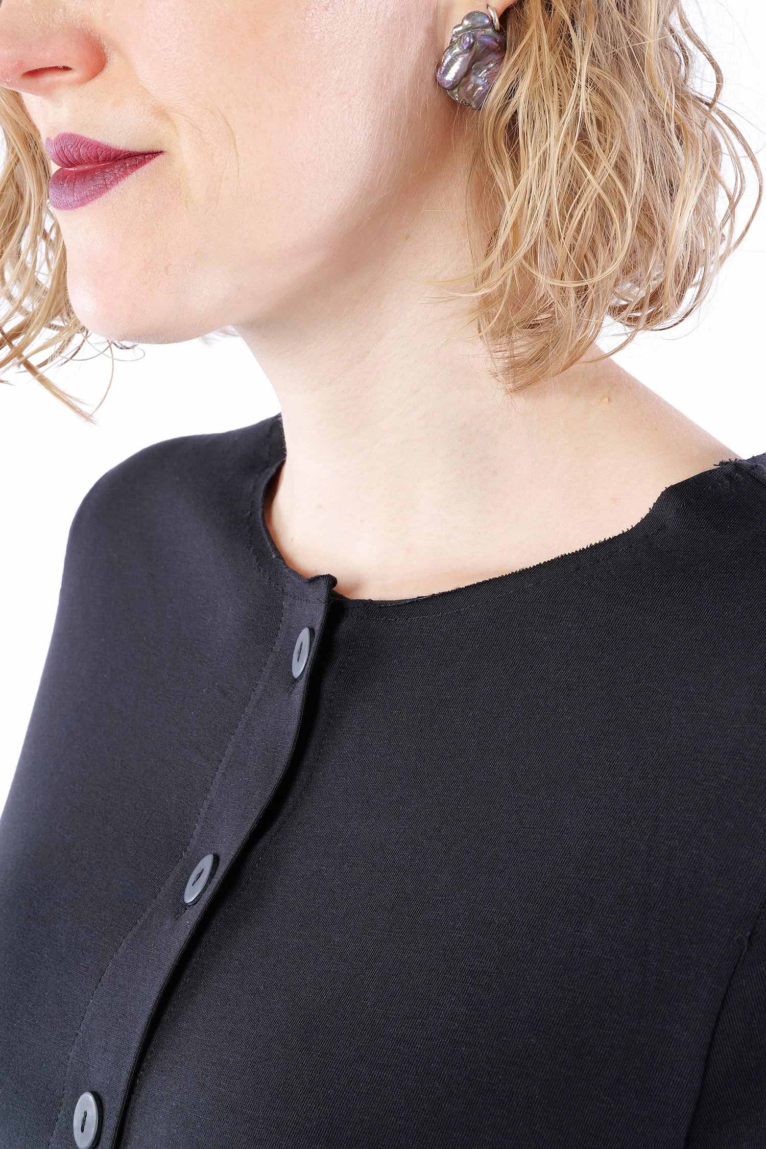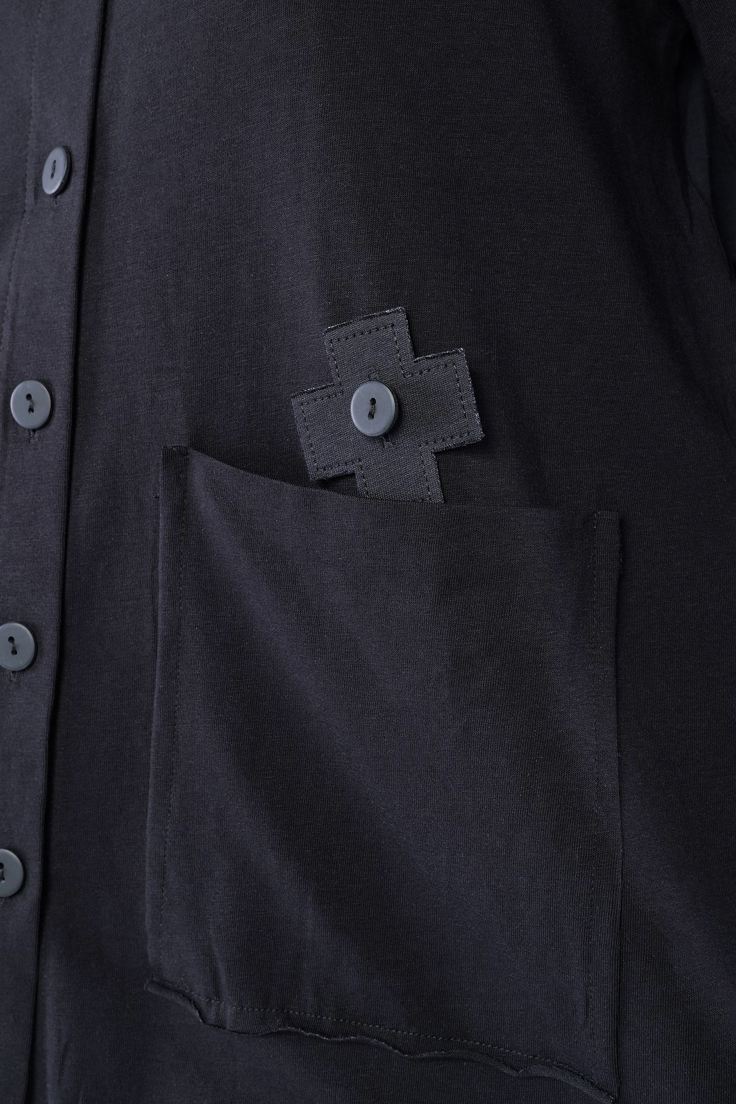 Details: - A Linie - Hinten länger - Rückteil aus Baumwoll-Voile gerüscht - Knopfleiste - Aufgesetzte Taschen vorne - Offene Kanten mit Stoppnaht - Plus-Patch - Säume rollen sich auf