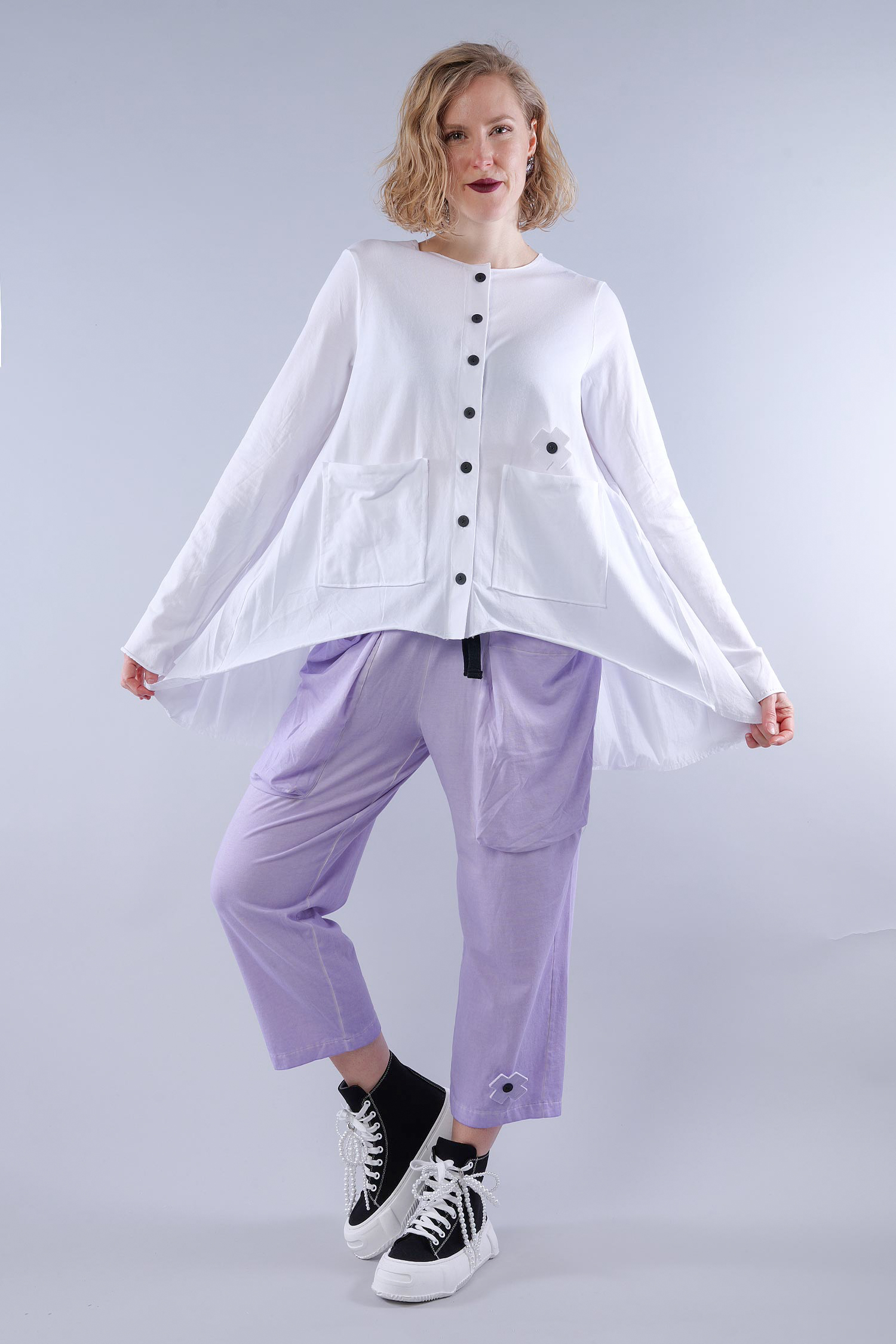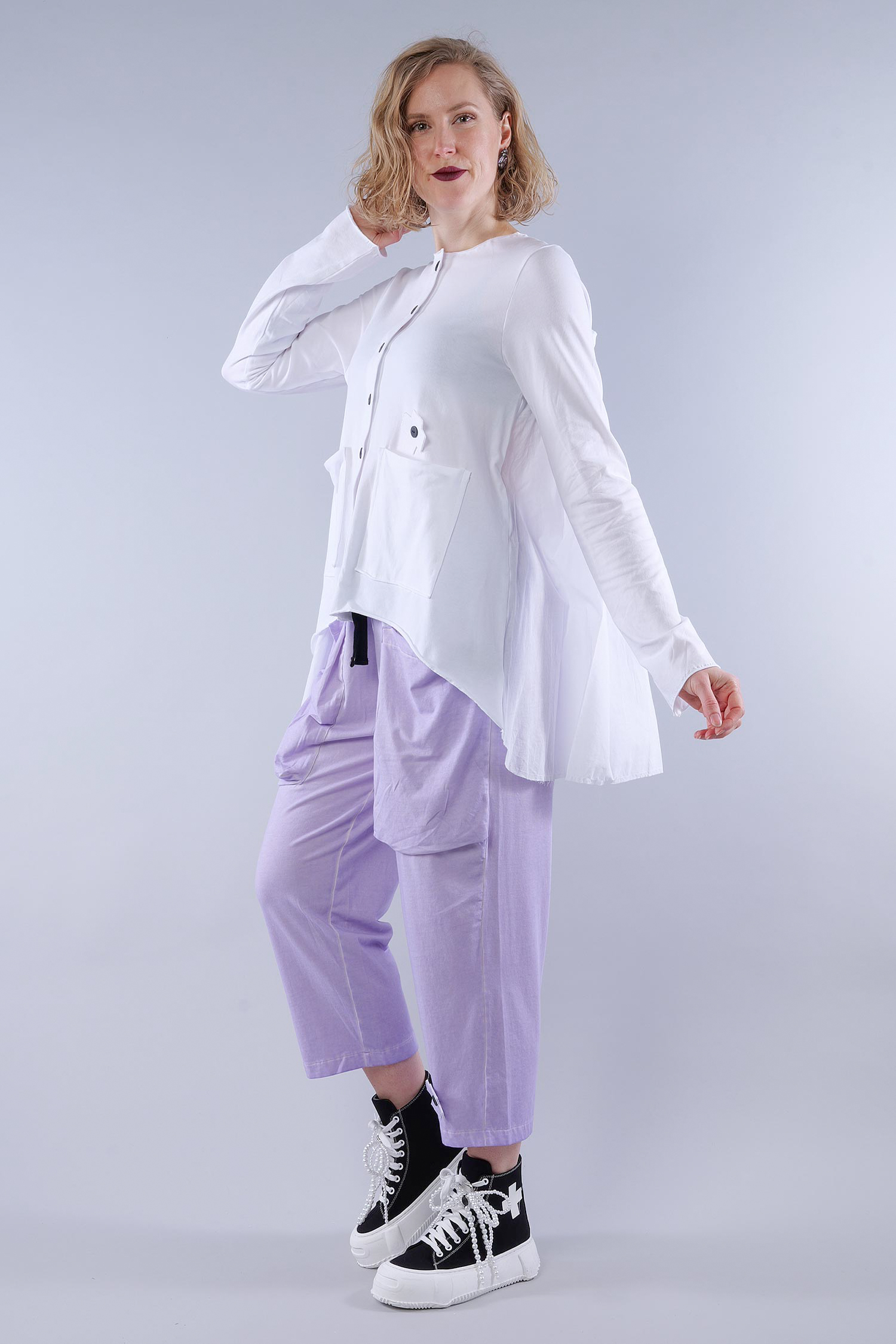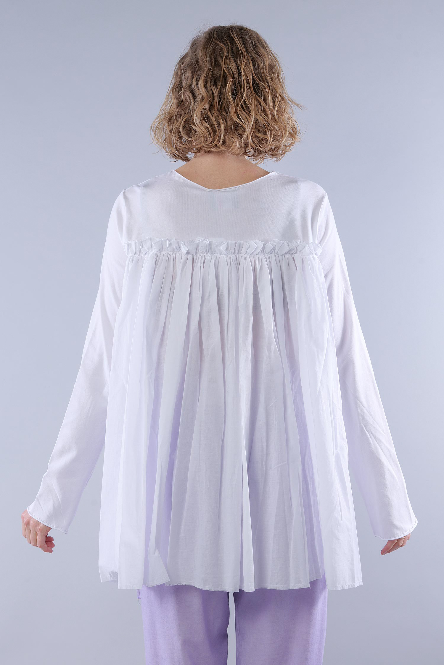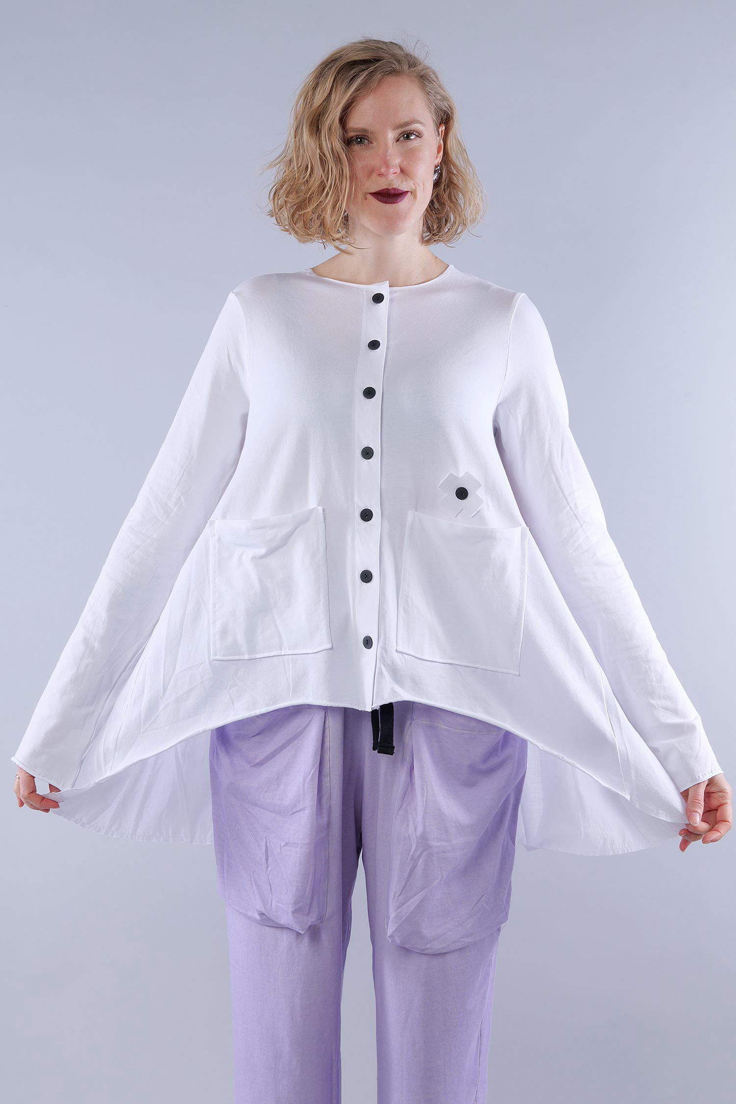 Details: - A Linie - Hinten länger - Rückteil aus Baumwoll-Voile gerüscht - Knopfleiste - Aufgesetzte Taschen vorne - Offene Kanten mit Stoppnaht - Plus-Patch - Säume rollen sich auf