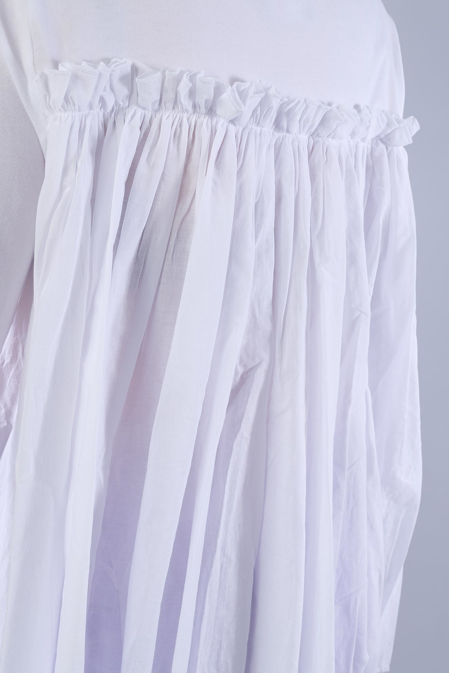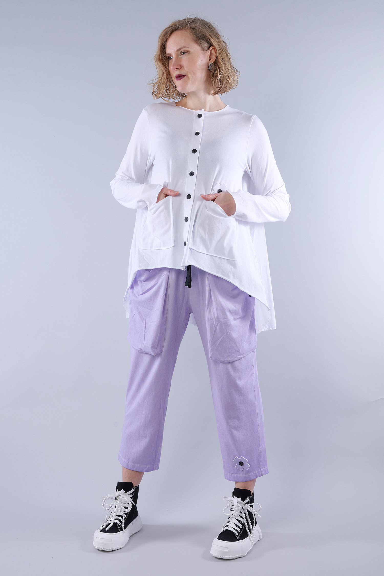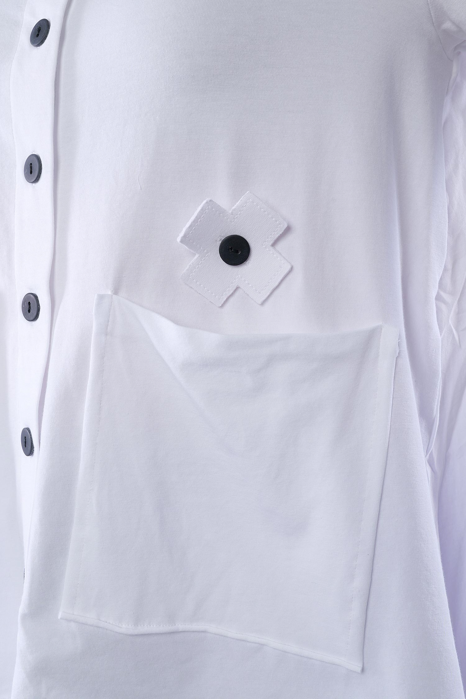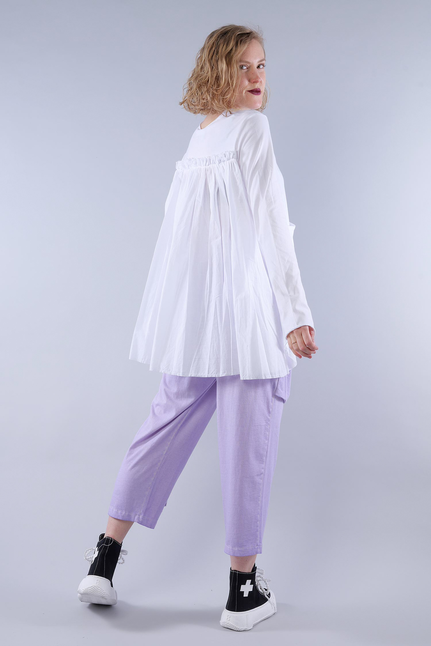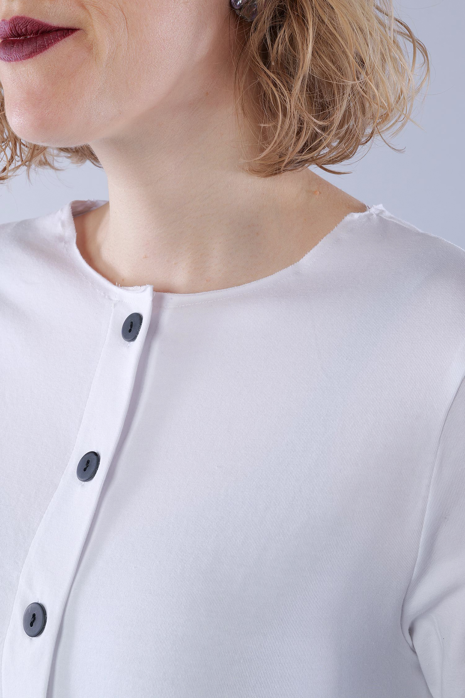 Details: - A Linie - Hinten länger - Rückteil aus Baumwoll-Voile gerüscht - Knopfleiste - Aufgesetzte Taschen vorne - Offene Kanten mit Stoppnaht - Plus-Patch - Säume rollen sich auf