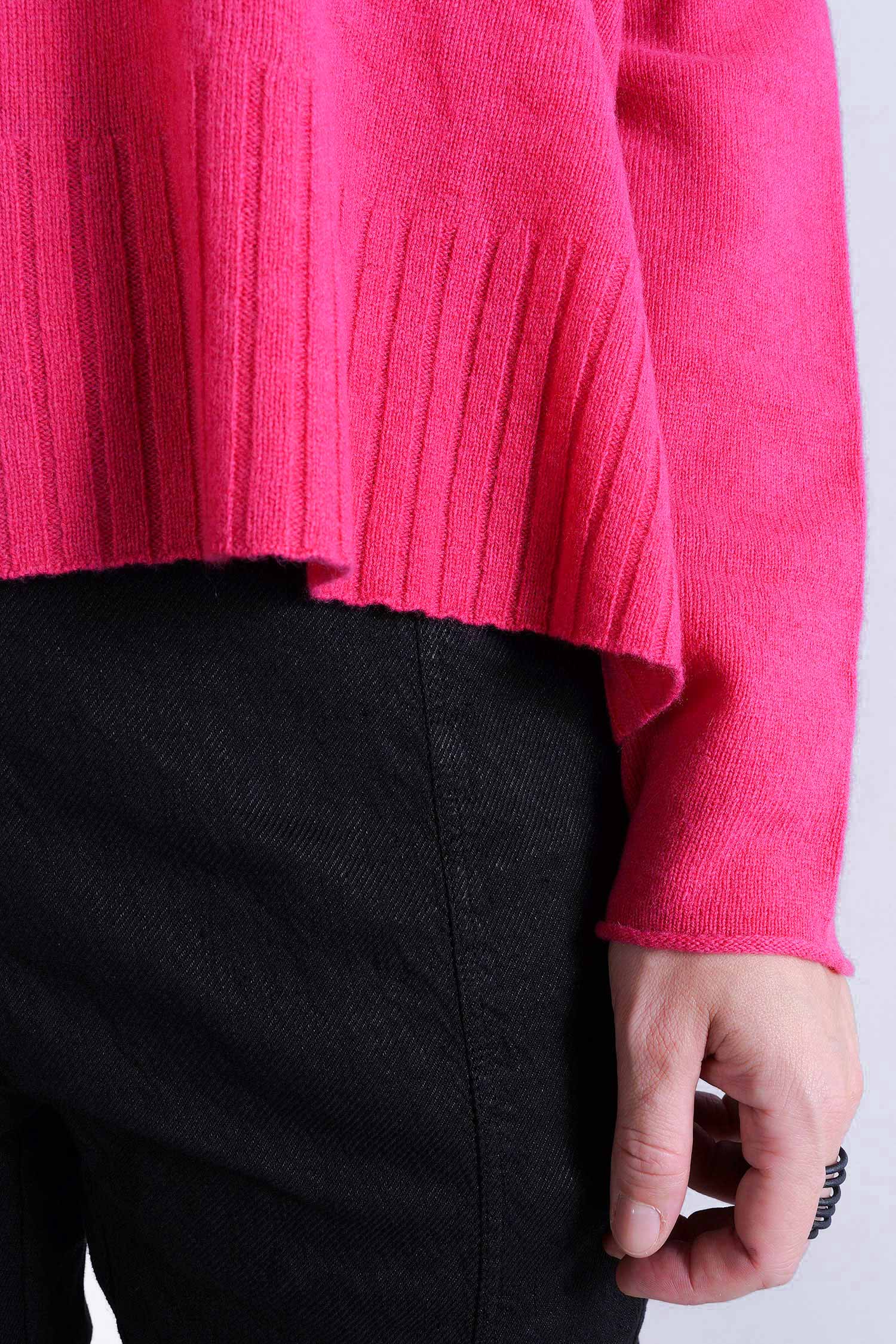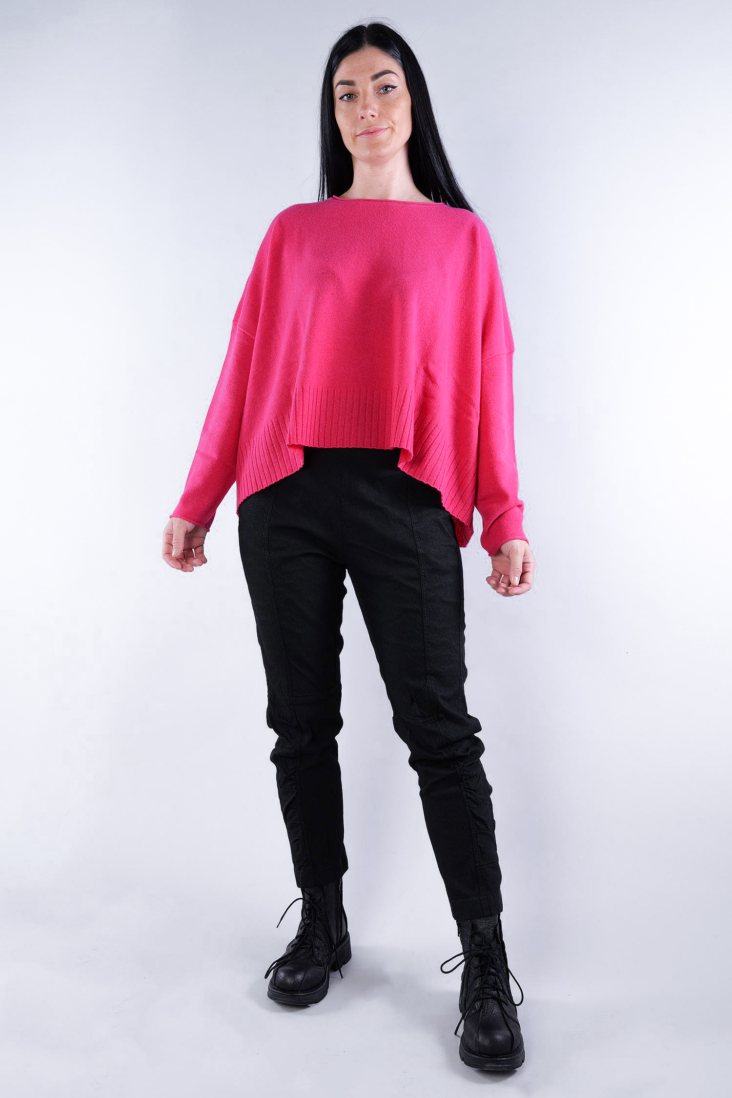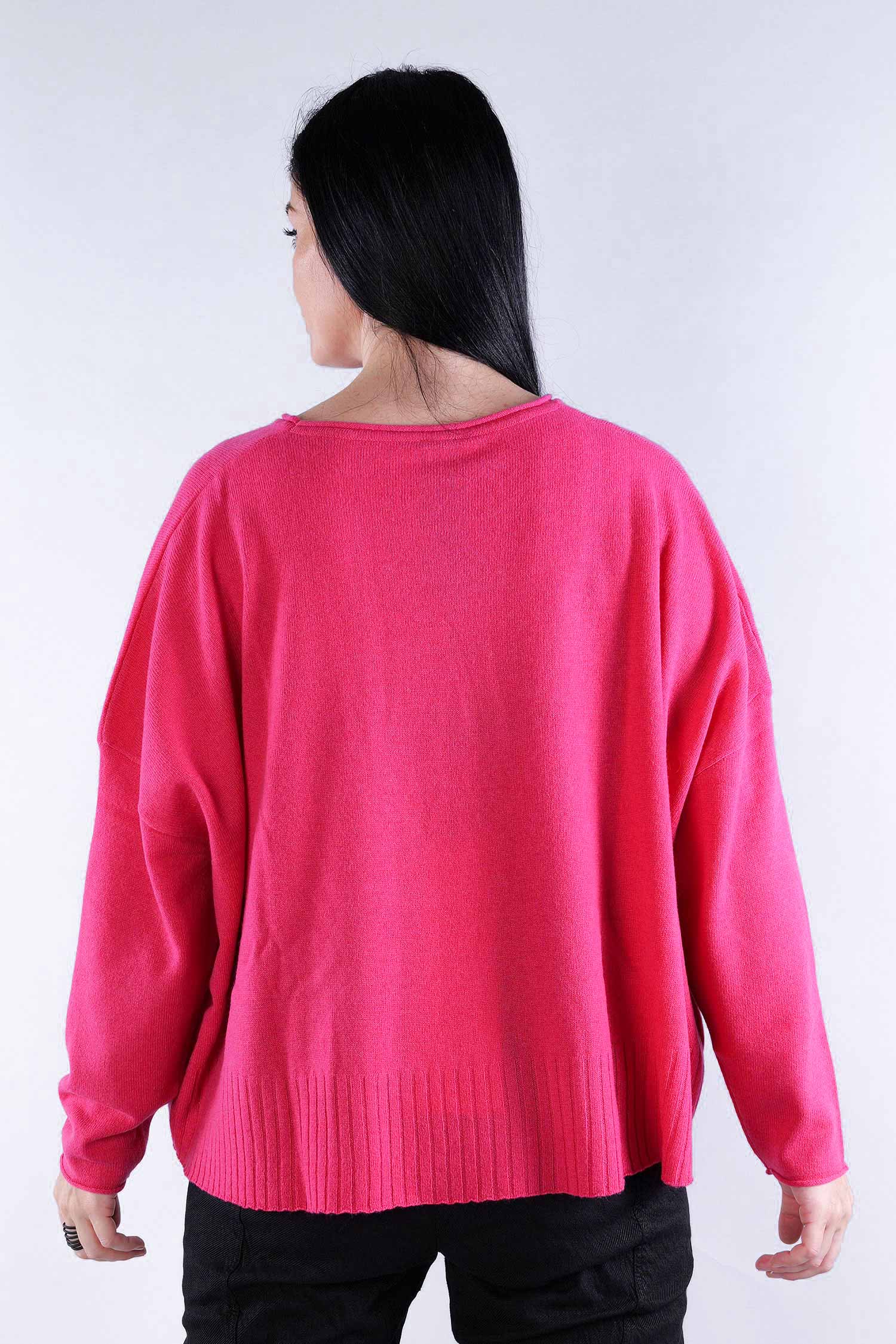 Details: - Weit und kastig - Feinstrick - Rippstricksaum - Hinten länger - Überschnittene Schulter - Rundhalsausschnitt - Säume rollen sich nach außen