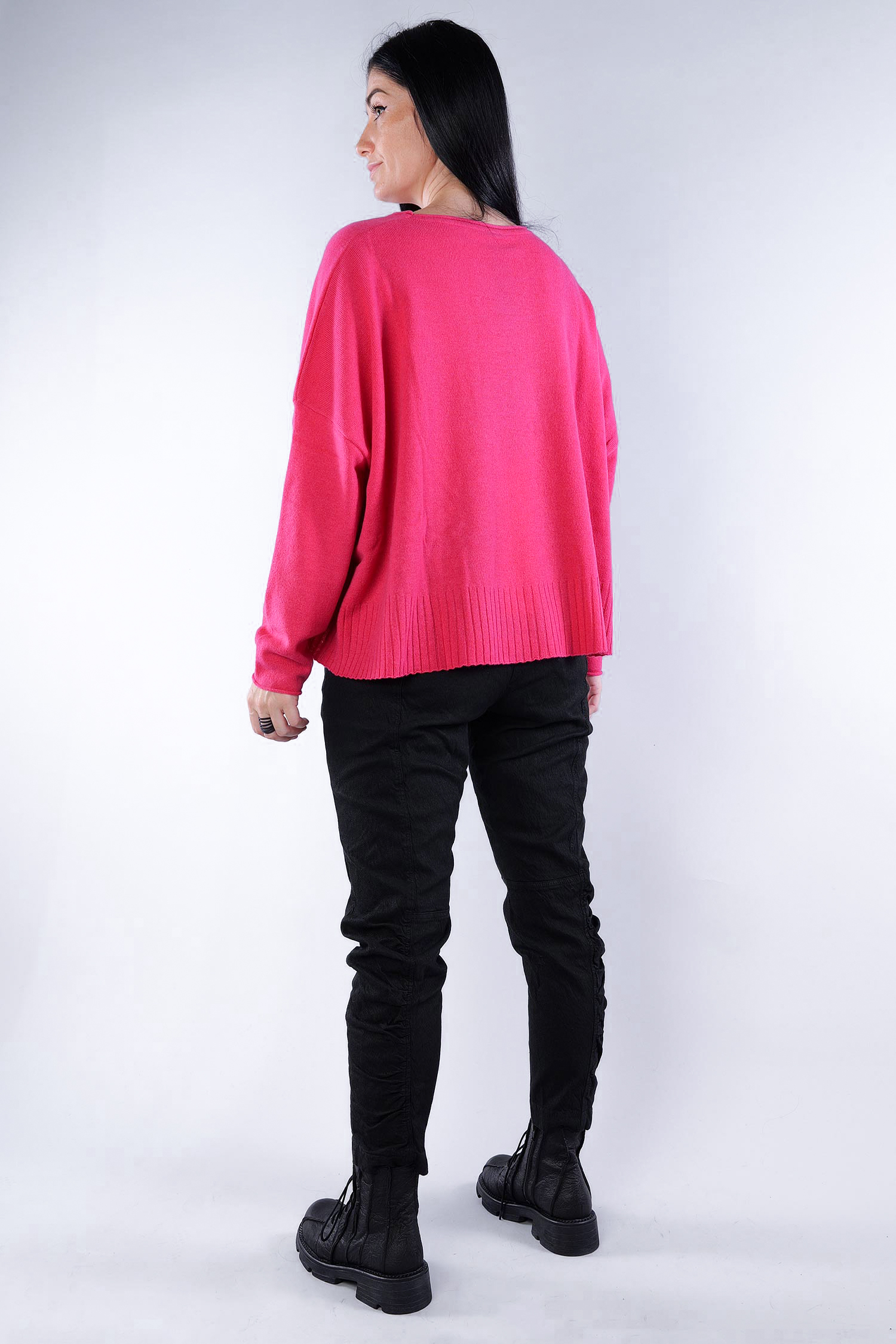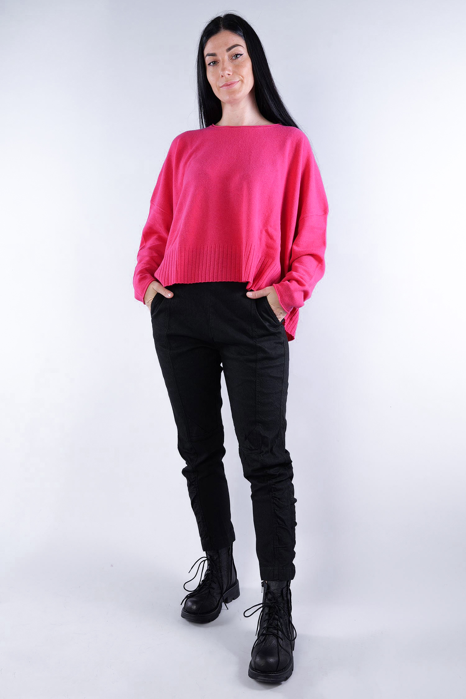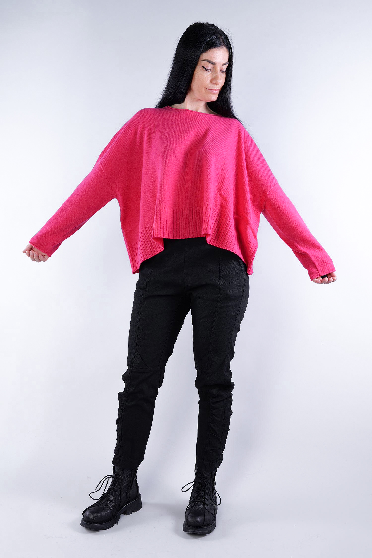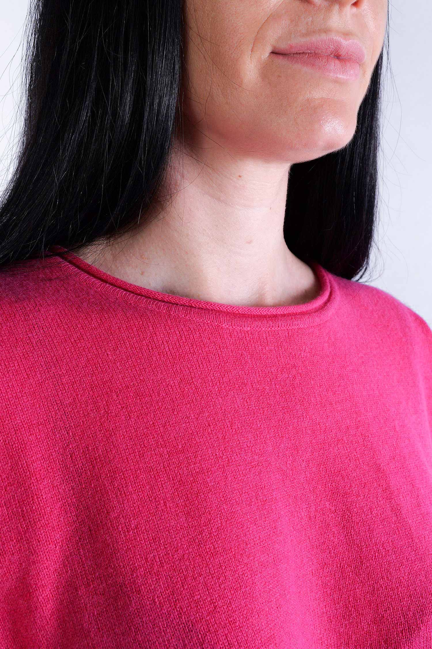 Details: - Weit und kastig - Feinstrick - Rippstricksaum - Hinten länger - Überschnittene Schulter - Rundhalsausschnitt - Säume rollen sich nach außen