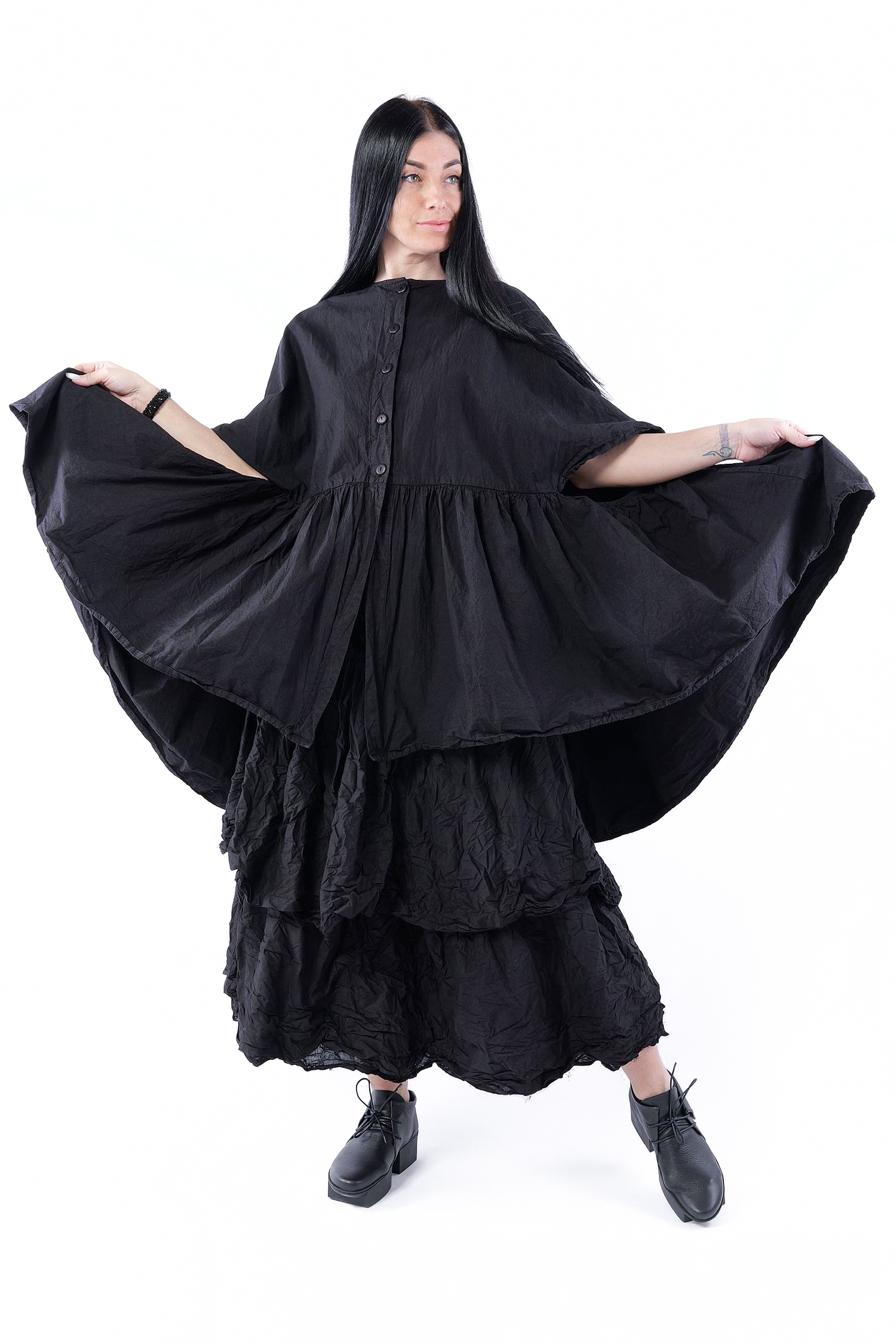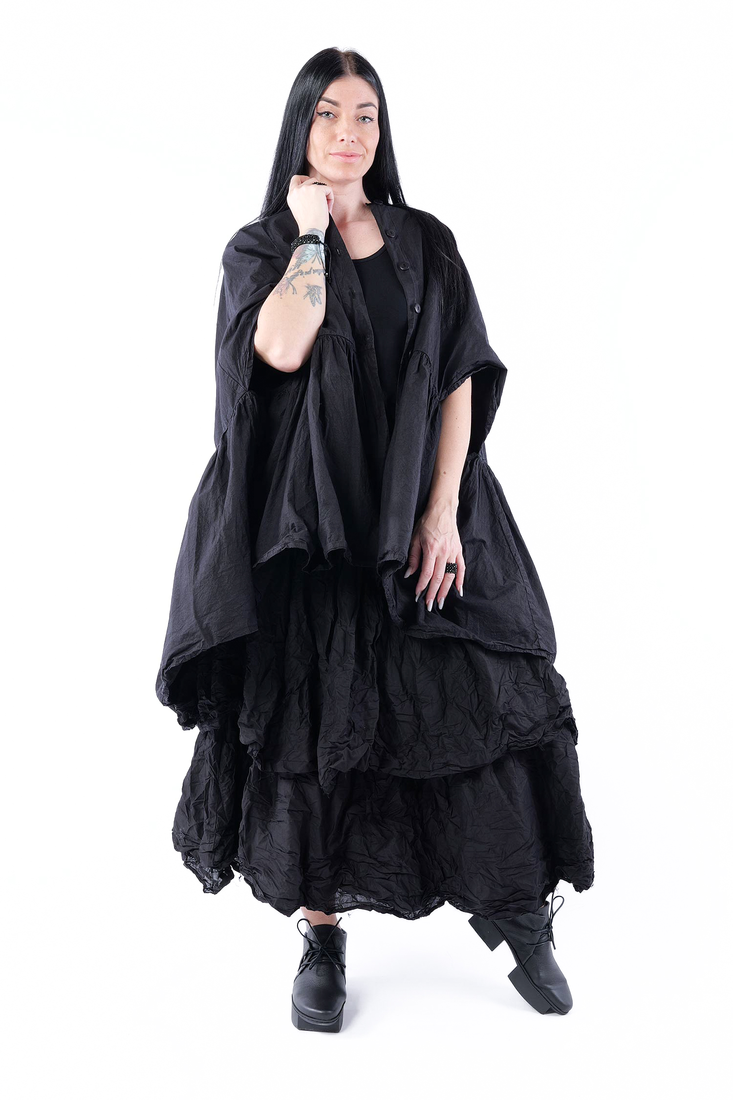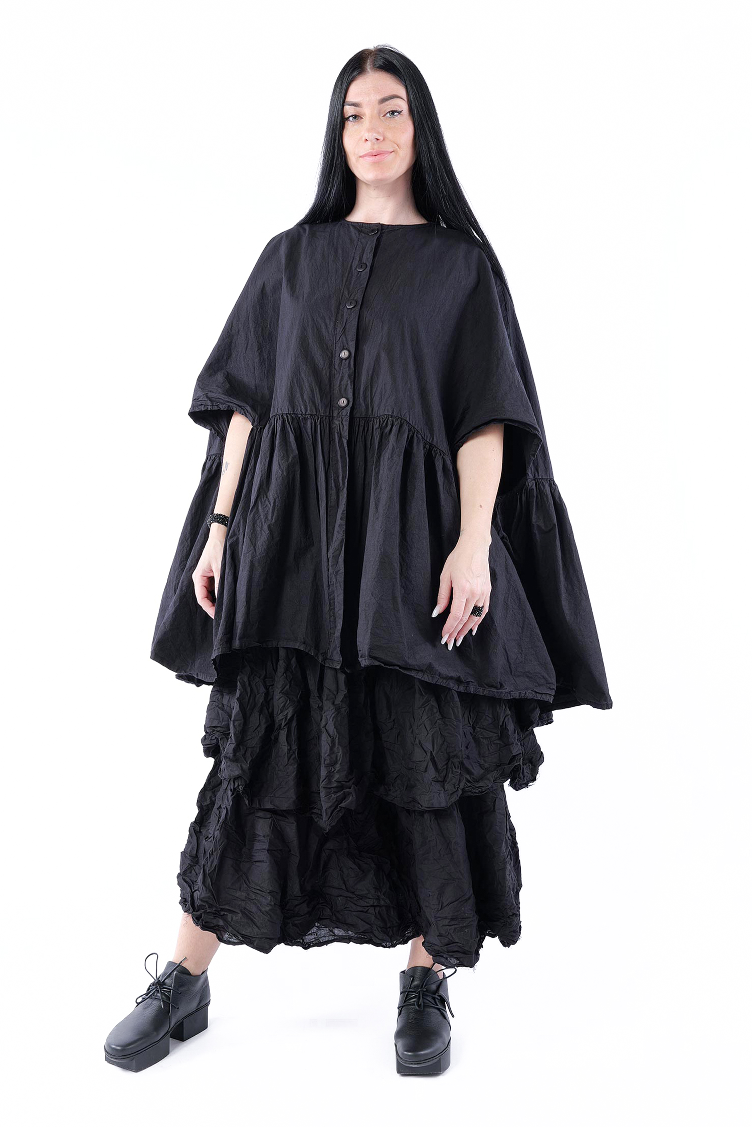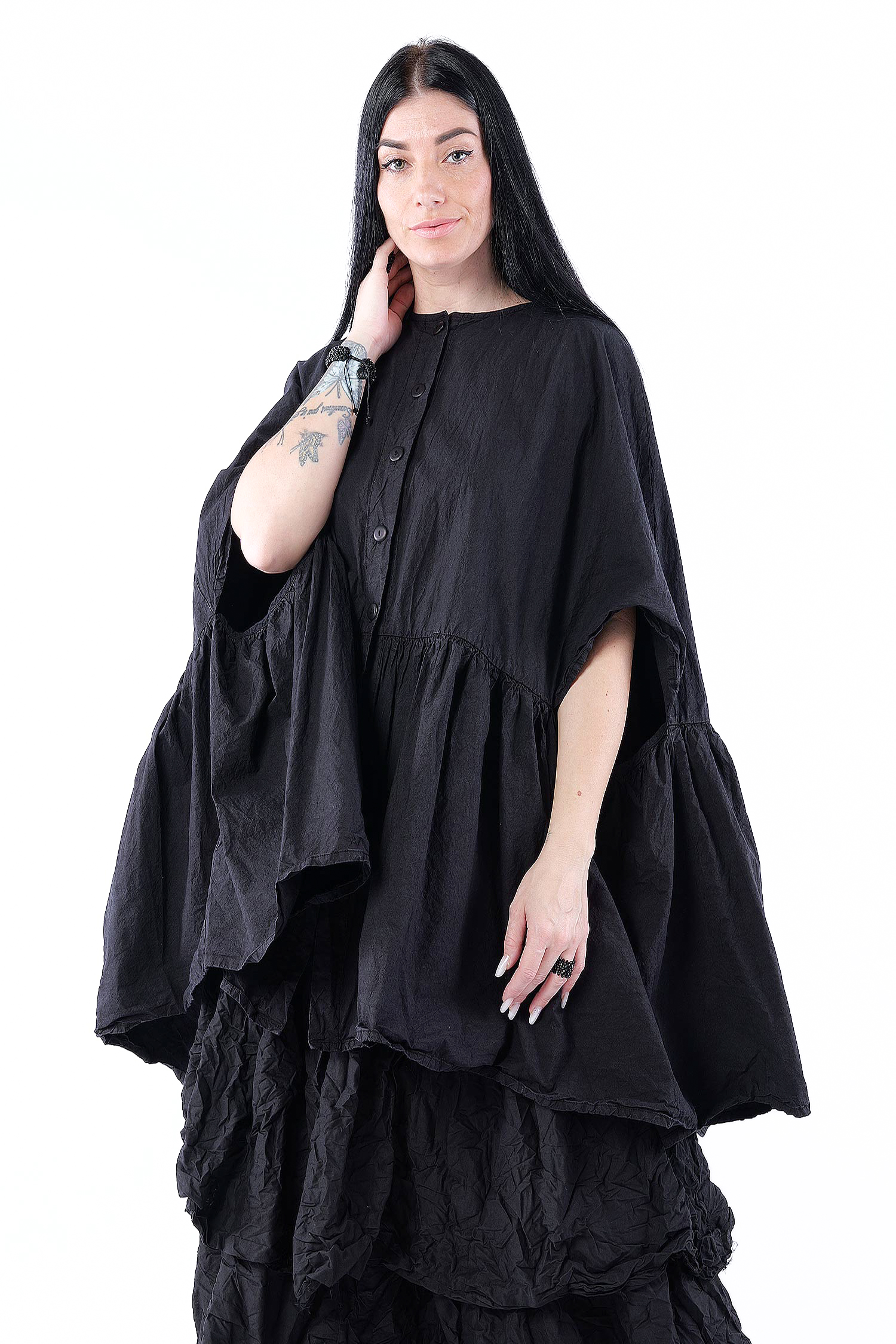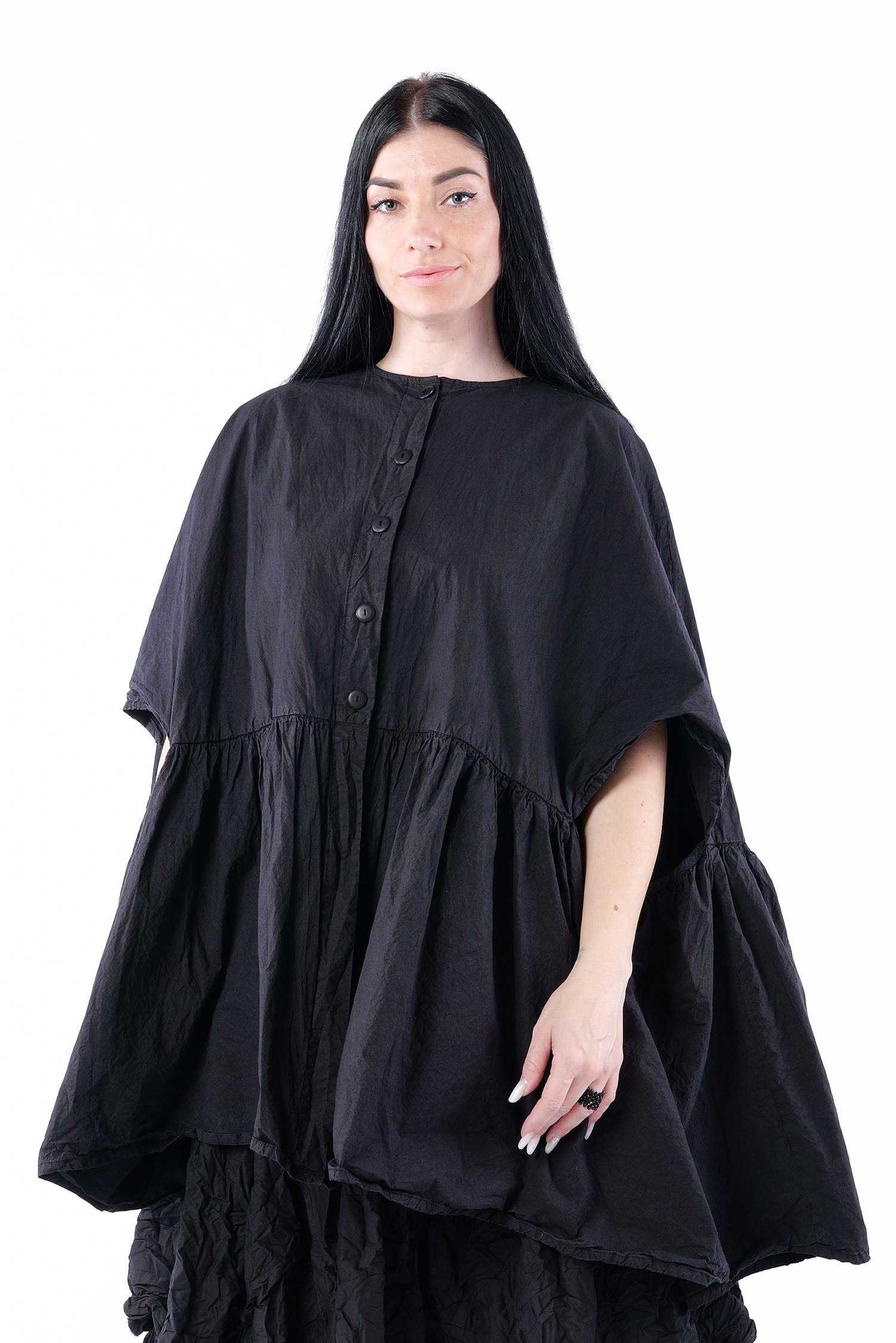 Details: - Knopfleiste - Geräuschebaumwolle - Hinten länger - Überschnittene Schulter ohne Ärmelnaht - Ziernaht in der hinteren Mitte im oberen Bereich - Armlöcher etwas nach vorne versetzt - Capeform - Rundhalsausschnitt - Versäuberte Kanten