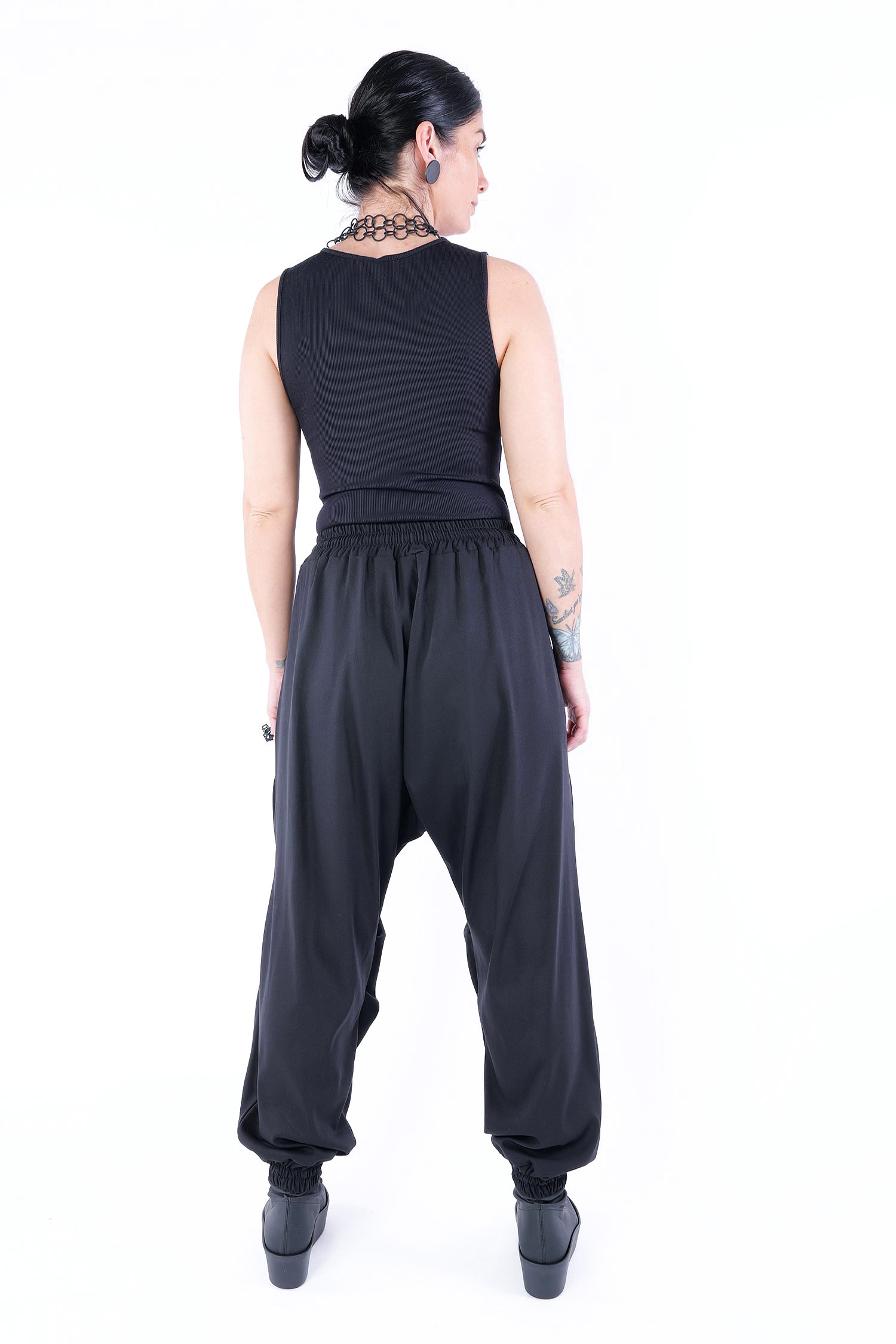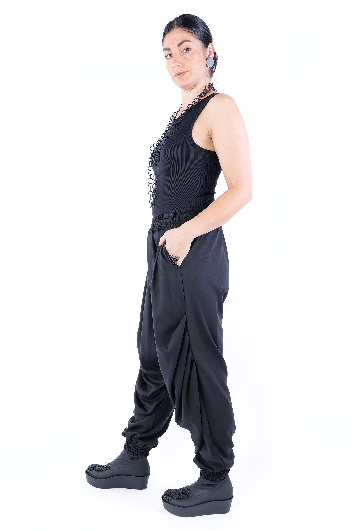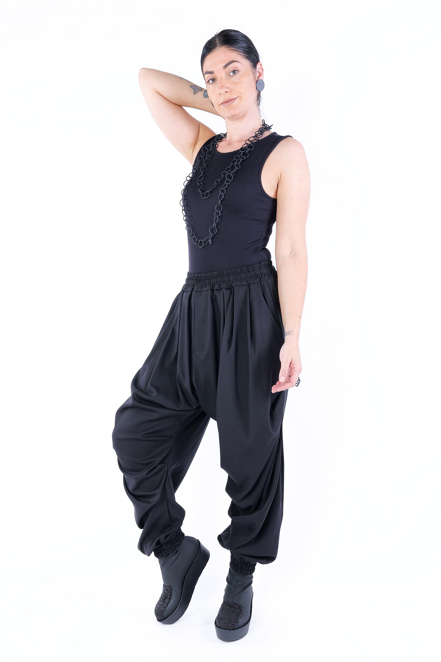 Größe M: Bund ungedehnt = 37 cm, gedehnt = 56 cm / Schritthöhe = 46 cm / Hüfte = 68 cm / Länge = 101 cm