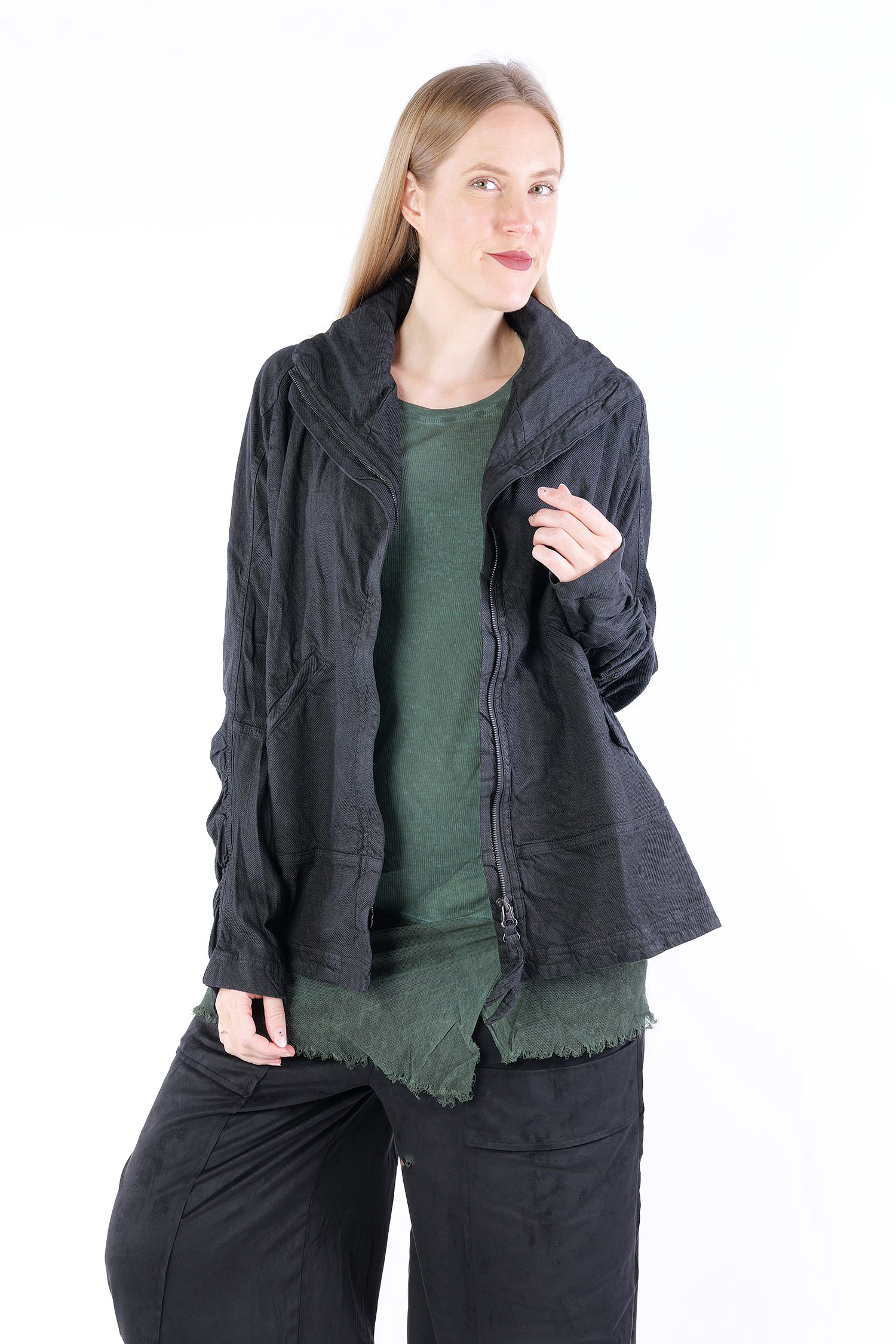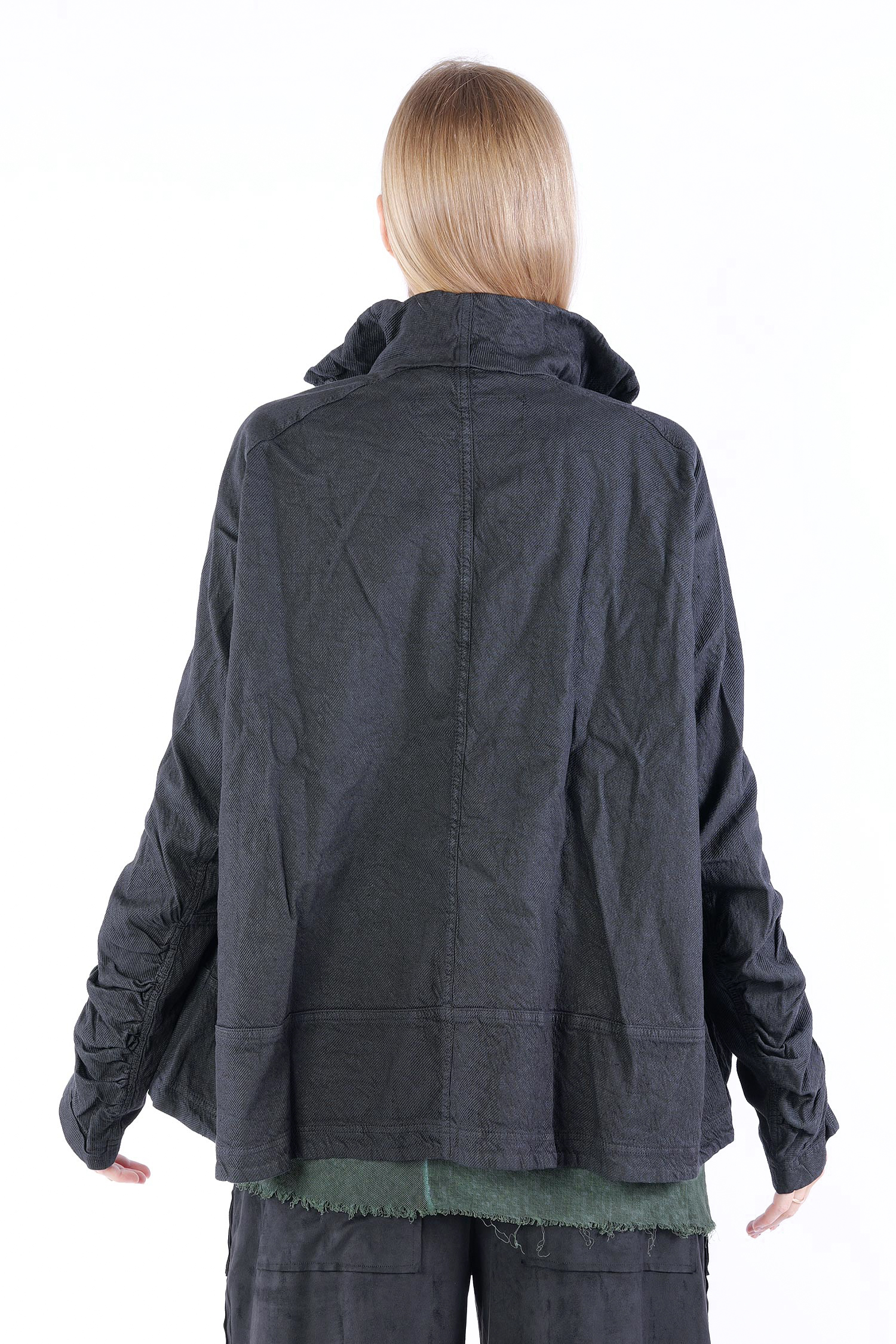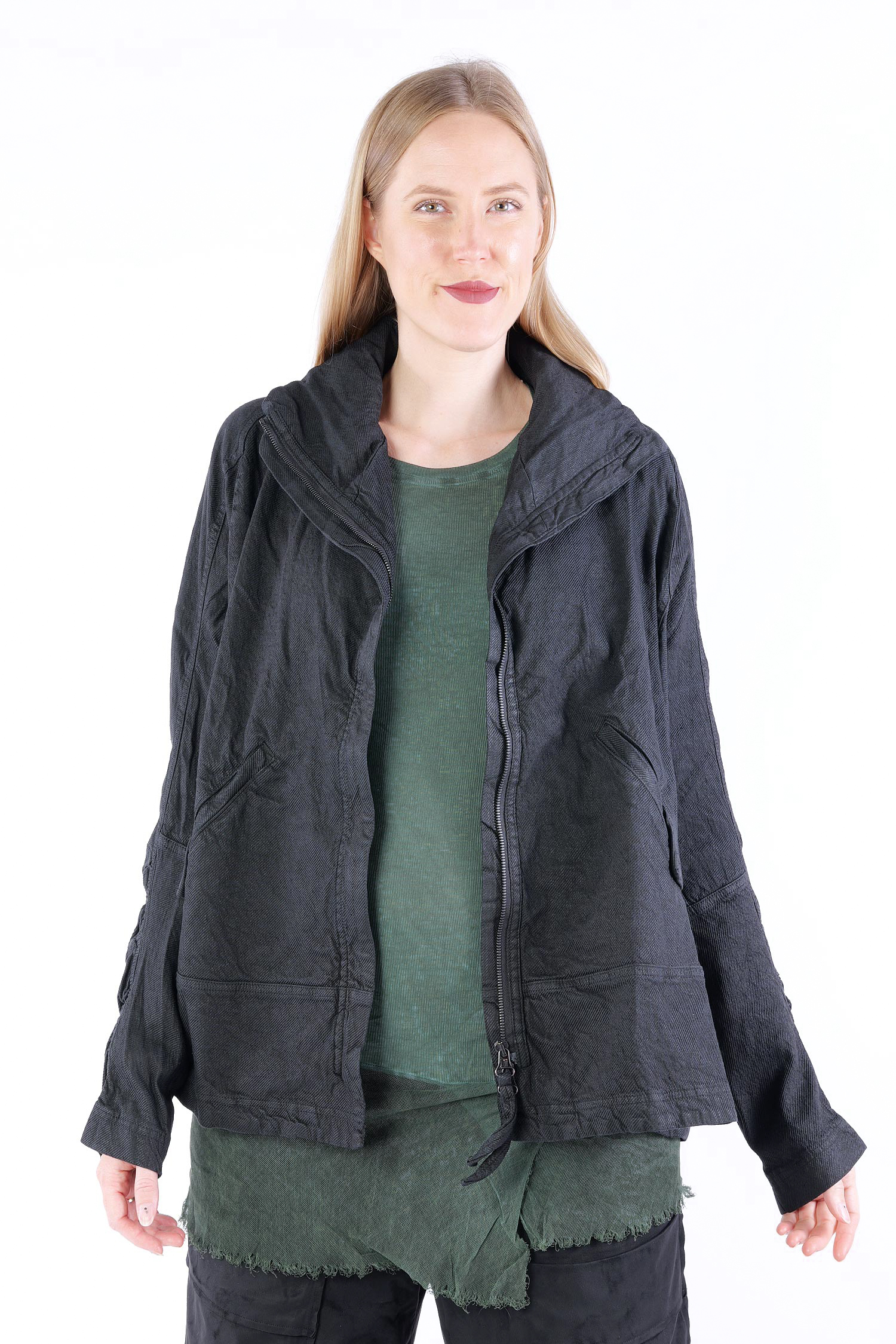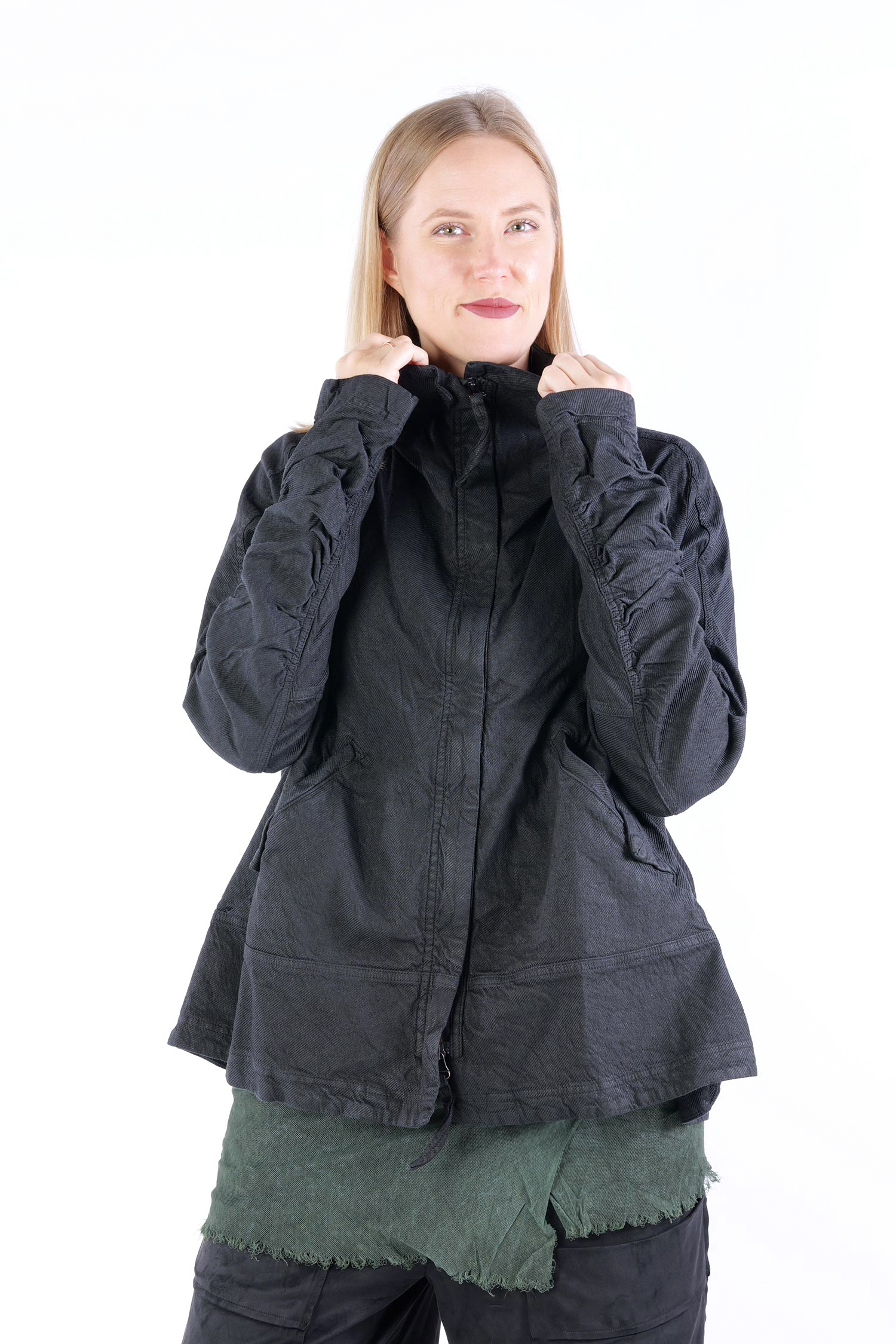 Details: - Verdeckter Metall-Reißverschluss - Weit und kastig - Stehkragen - Lange Ärmel mit normaler Weite - Vorne Paspeltaschen in Briefumschlag-Optik mit Knopf - Am Ärmel gerafft - Strukturiertes Material -Vesäuberte Kanten