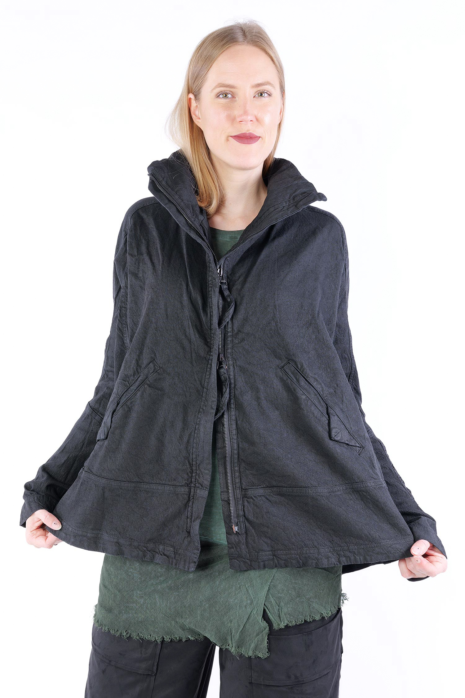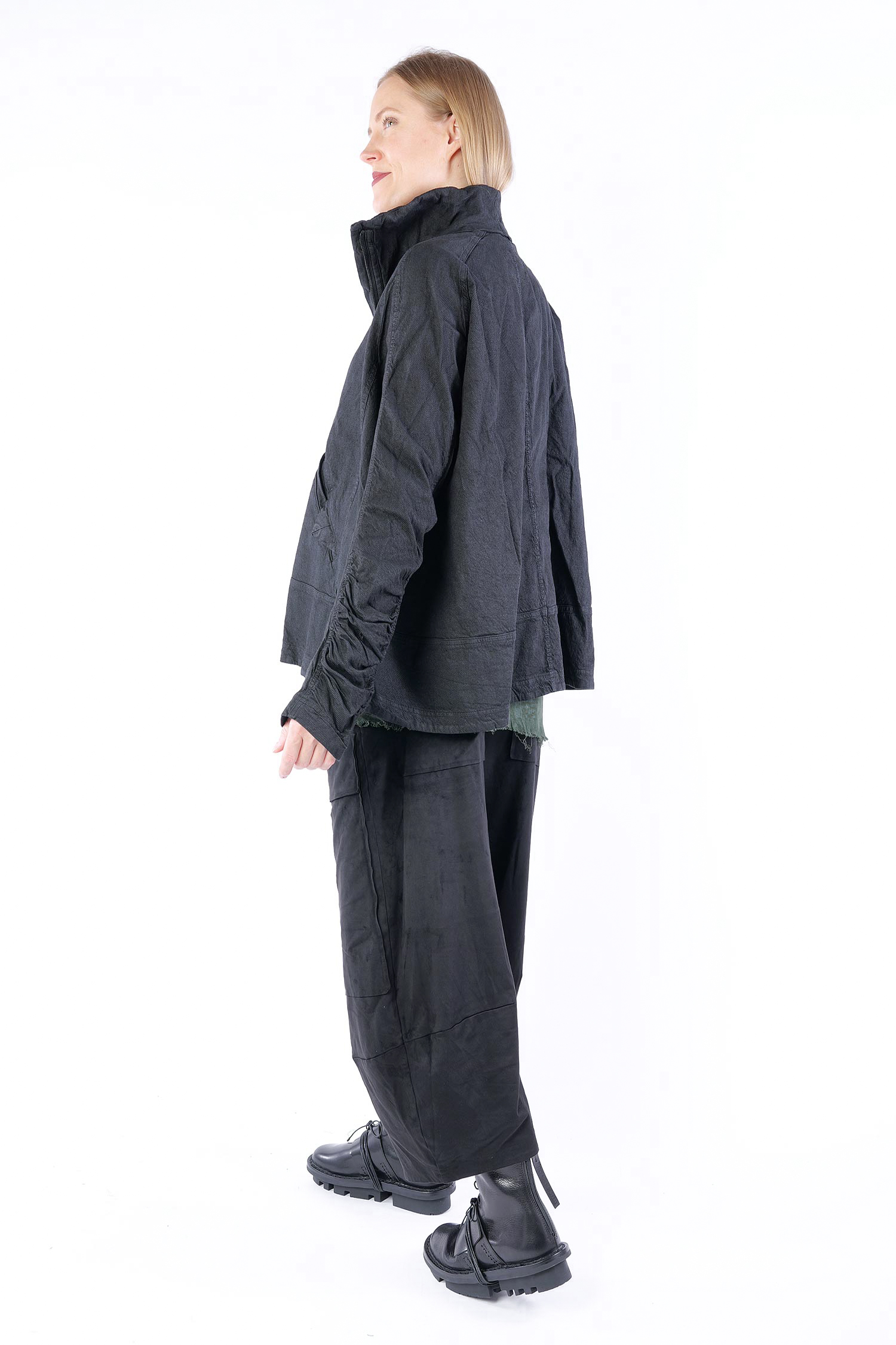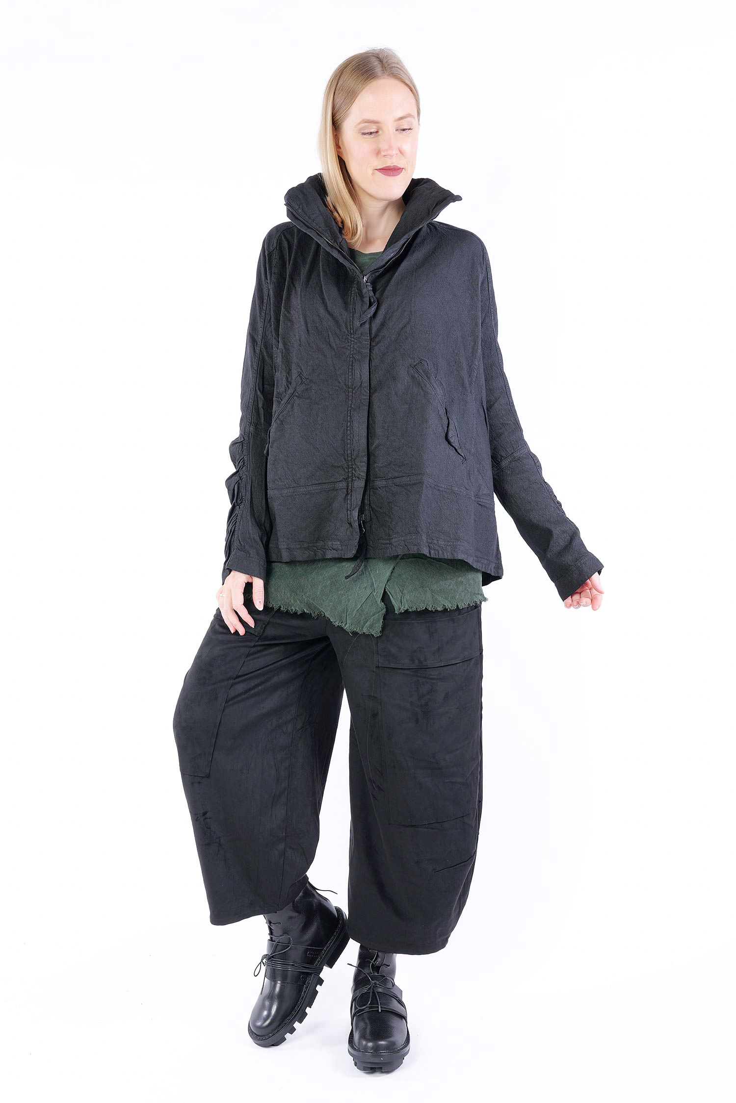 Details: - Verdeckter Metall-Reißverschluss - Weit und kastig - Stehkragen - Lange Ärmel mit normaler Weite - Vorne Paspeltaschen in Briefumschlag-Optik mit Knopf - Am Ärmel gerafft - Strukturiertes Material -Vesäuberte Kanten