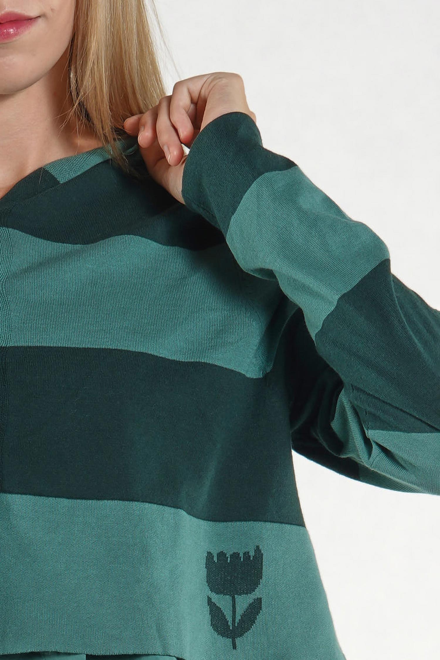Details: - Feinstrick - Knopfleiste - Hinten im Nacken geschlitzt - A-Linie - Seitlich geschlitzt - Lange Ärmel - Versäuberte Kanten - Tulpe am Saum eingestrickt (Jacquard)