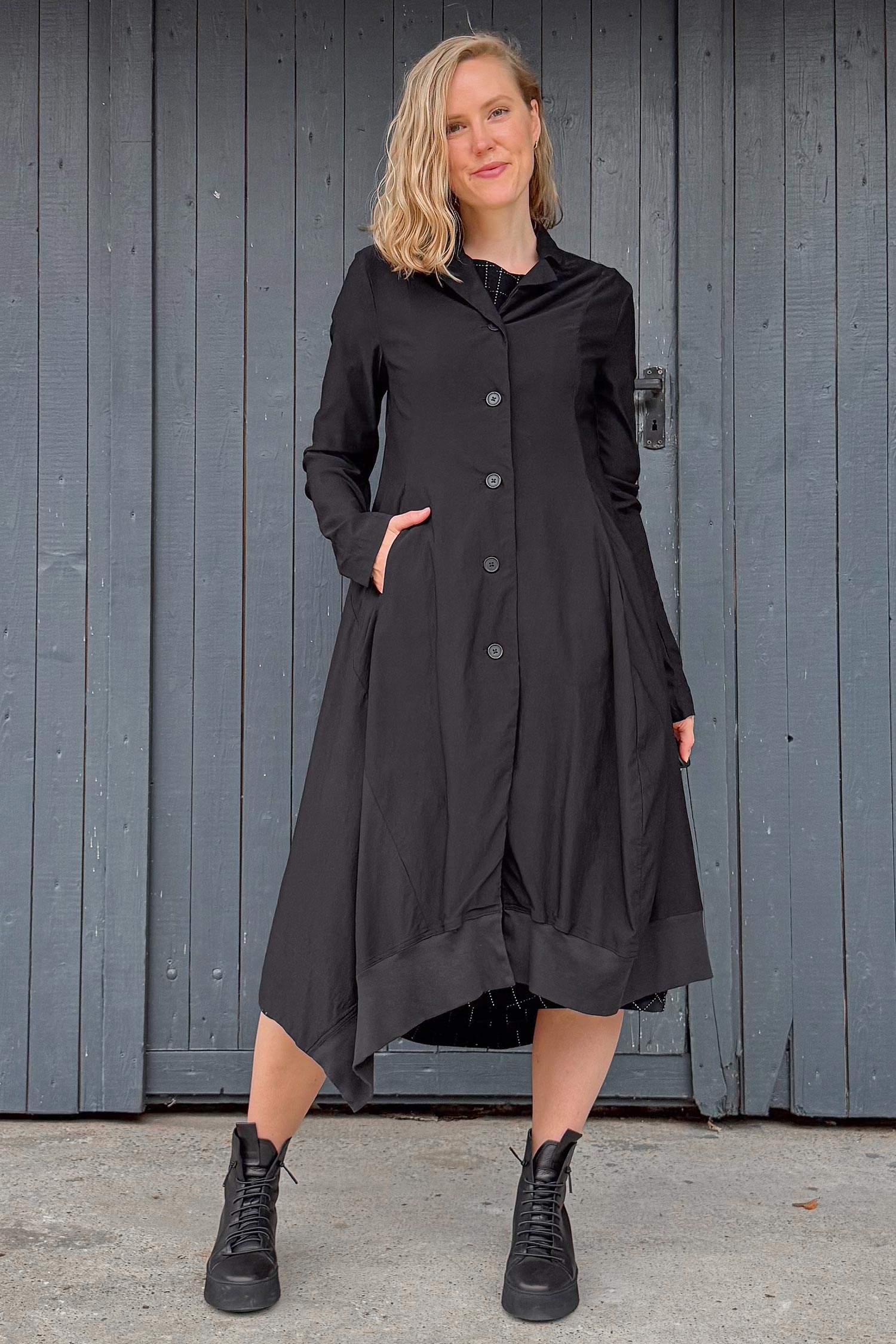 Langer Mantel aus super elastischem Material von Rundholz Black Label.