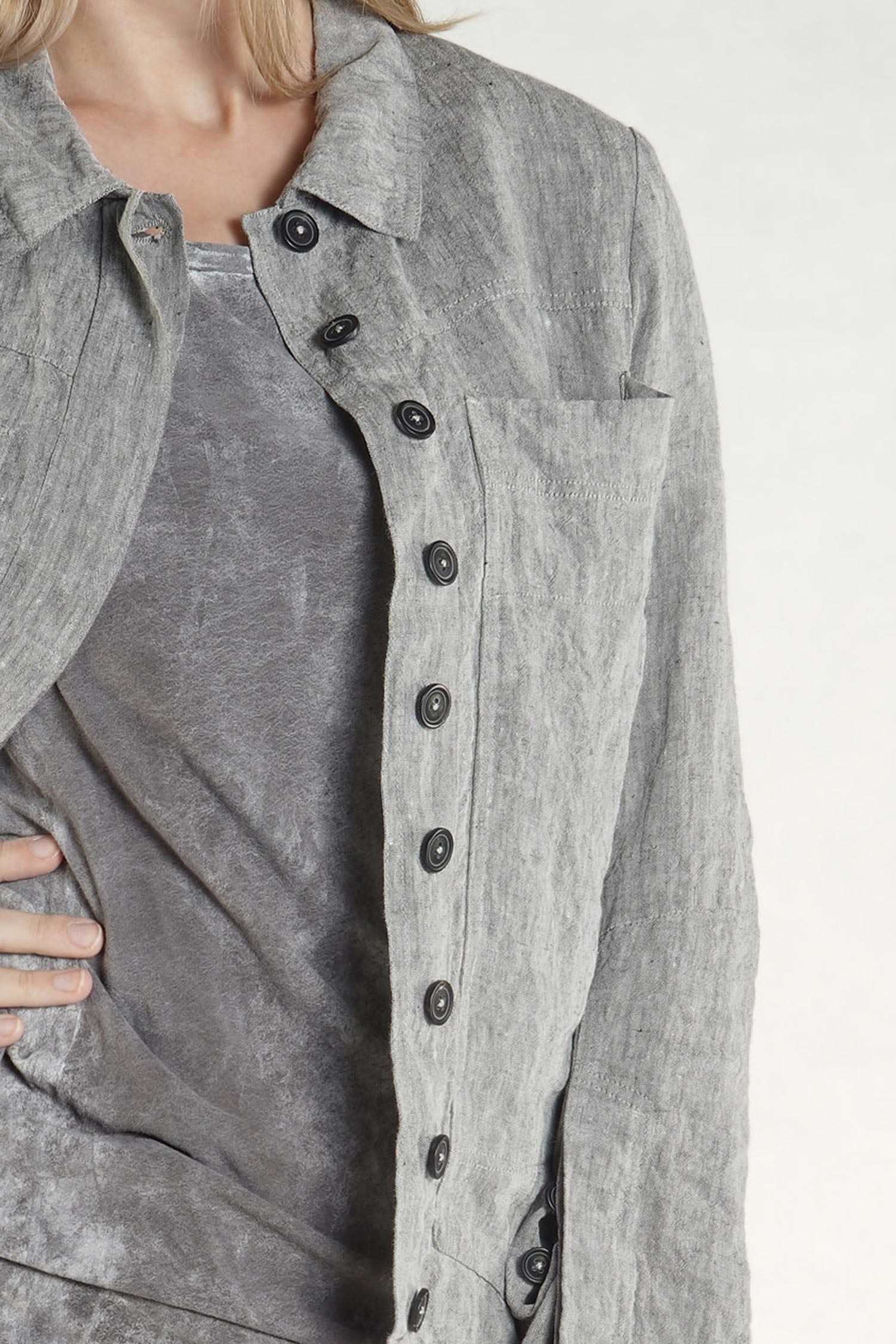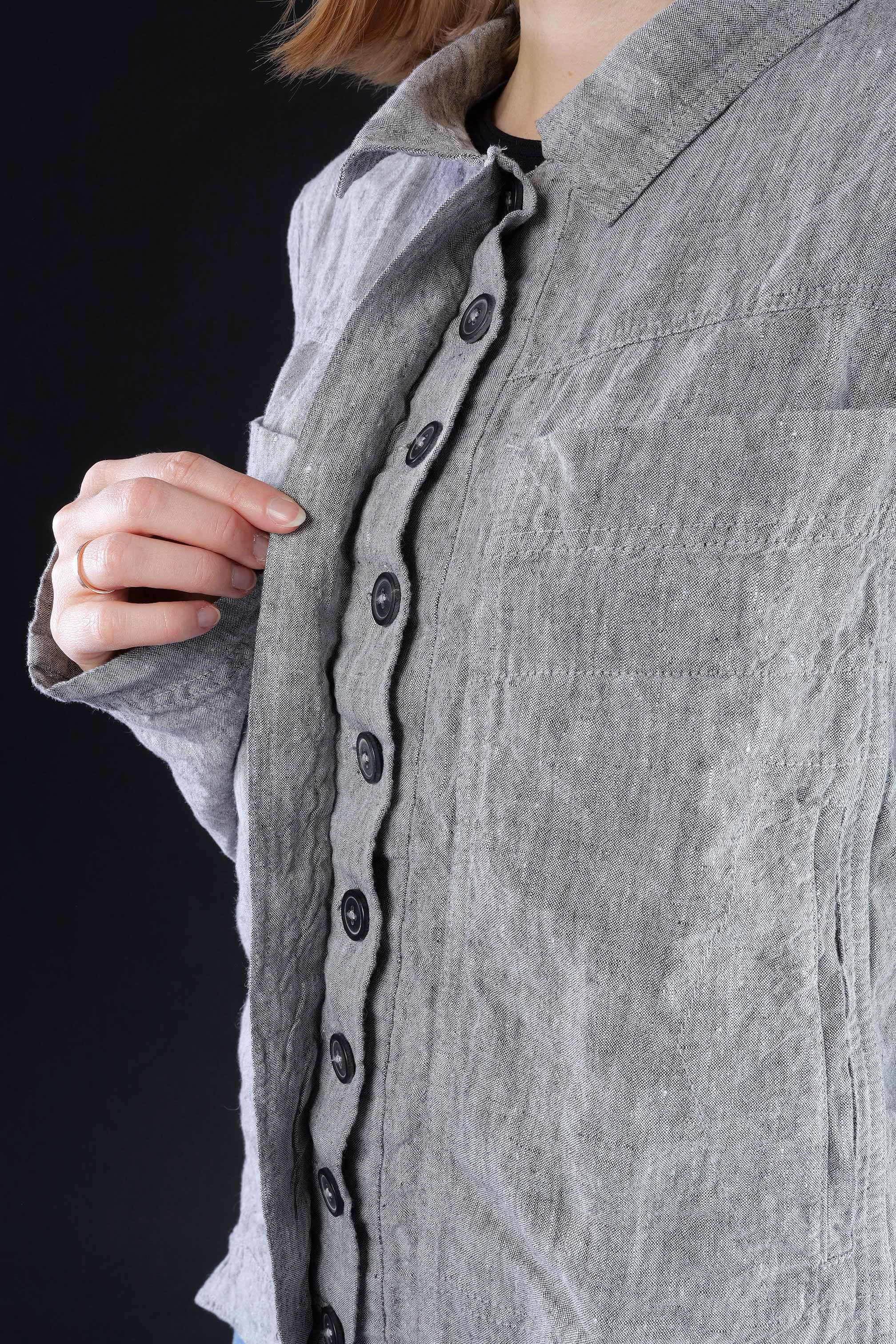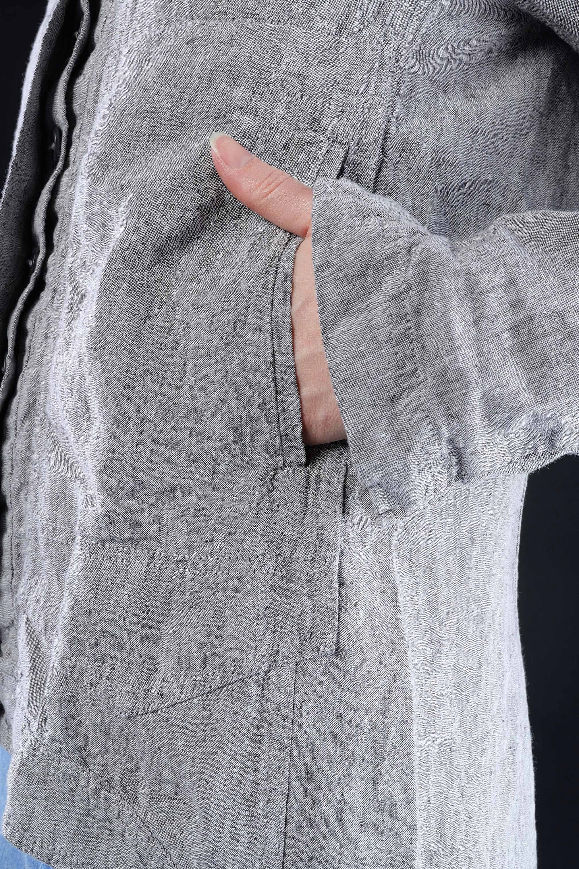 Details: - Frackflügel, hinten mittig hoch geschlitzt - Verdeckte Knopfleiste - Versäuberte Kanten - Leinen - Kragen - Ärmel mit Schlitz und Knöpfen - Eingrifftaschen seitlich - Abnäher am Ellbogen - Hinten länger - Große Brusttaschen