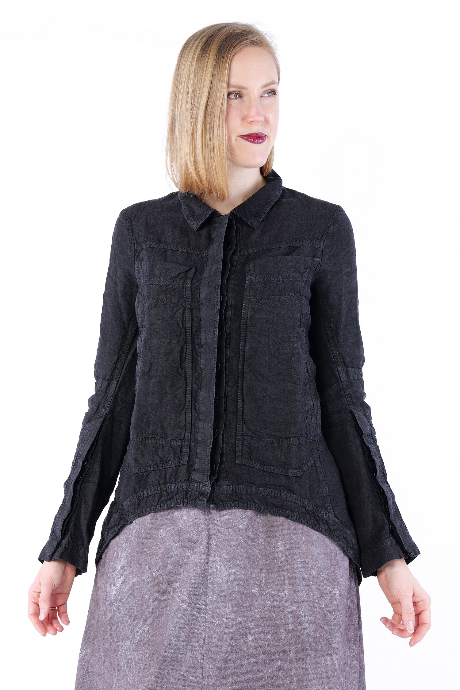 Details: - Frackflügel, hinten mittig hoch geschlitzt - Verdeckte Knopfleiste - Versäuberte Kanten - Leinen - Kragen - Ärmel mit Schlitz und Knöpfen - Eingrifftaschen seitlich - Abnäher am Ellbogen - Hinten länger - Große Brusttaschen