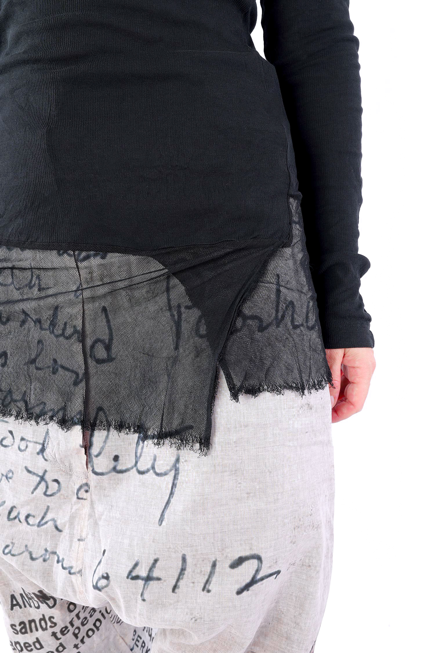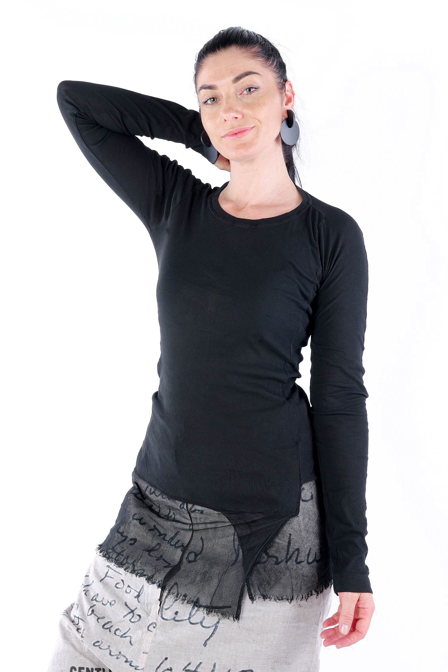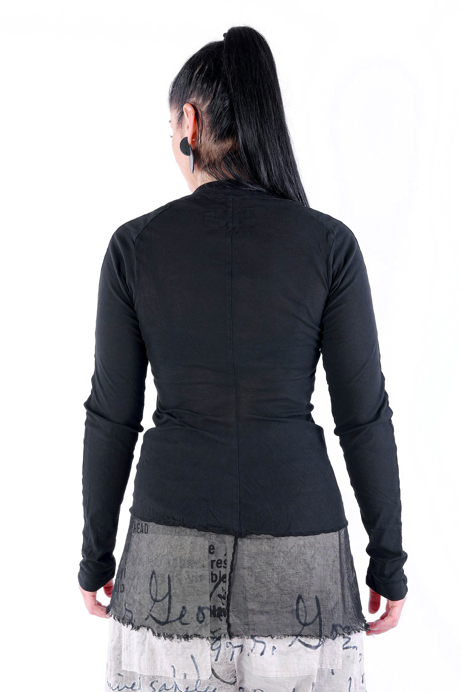 Details: - Dünnes Rippjersey - Tüll mit fransigen Kanten am Saum - Lange Ärmel - Schmaler Schnitt - Rundhalsausschnitt - Kanten beim Jersey versäubert