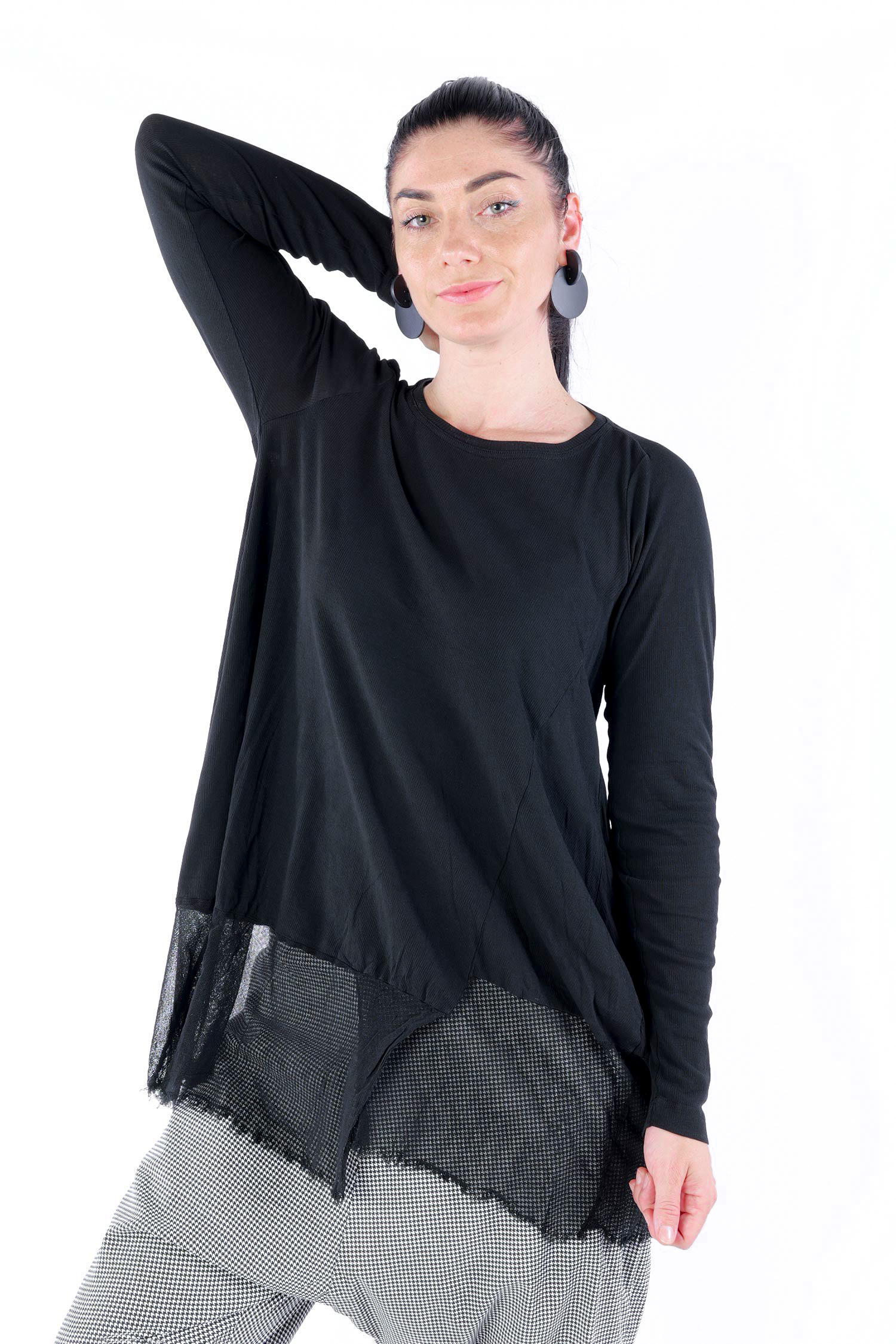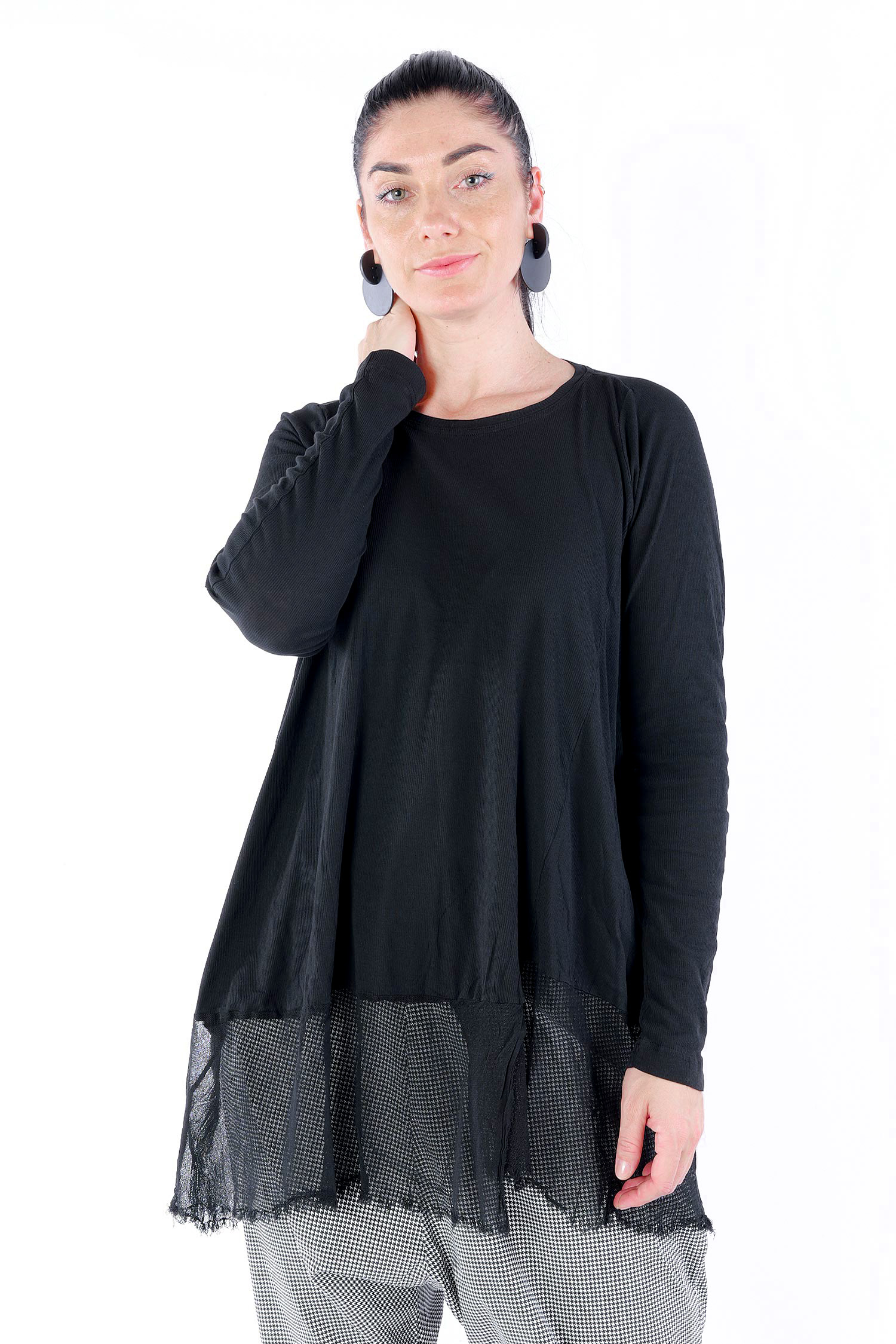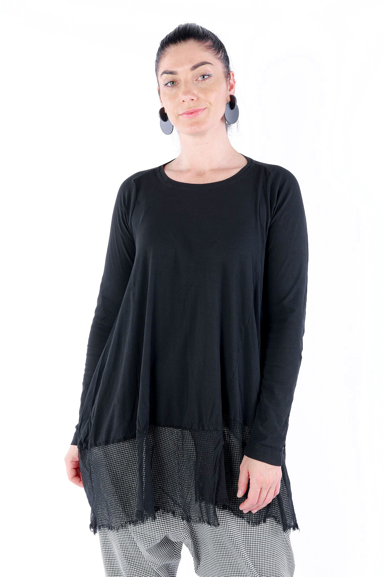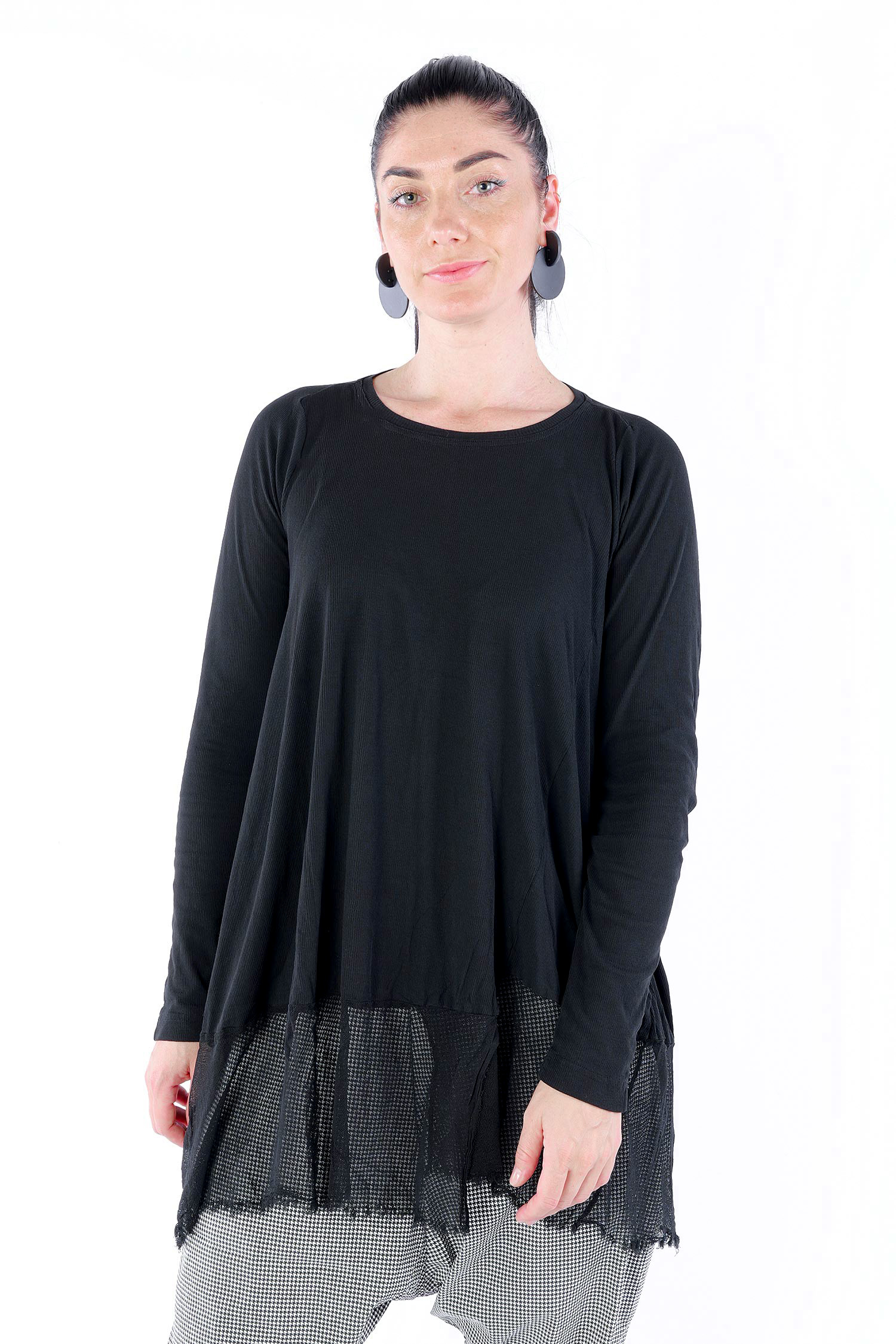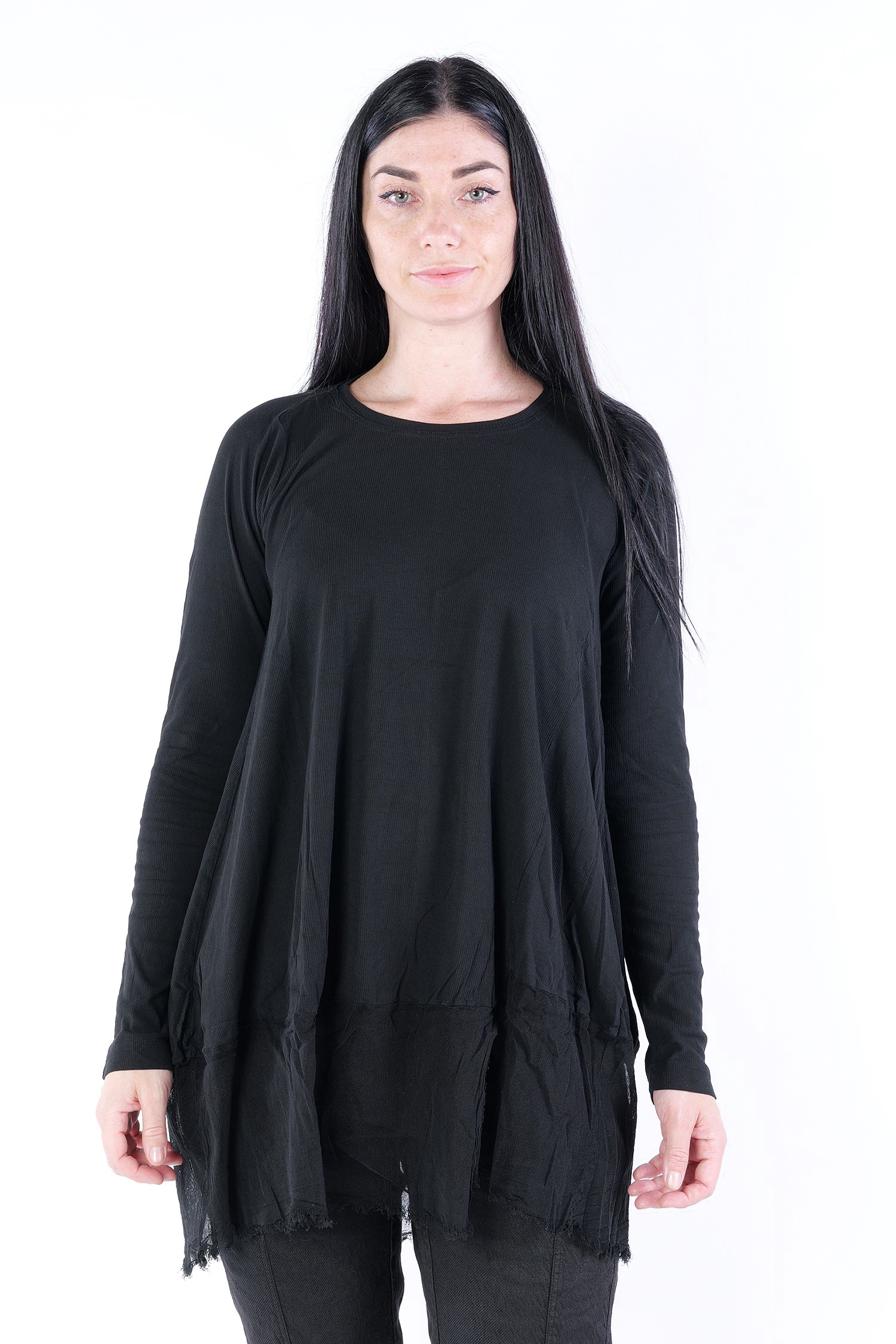 Details: - Dünnes Rippjersey - Tüll mit fransigen Kanten am Saum - Lange Ärmel - Tulpiger Schnitt - Rundhalsausschnitt - Saum asymmetrisch lang