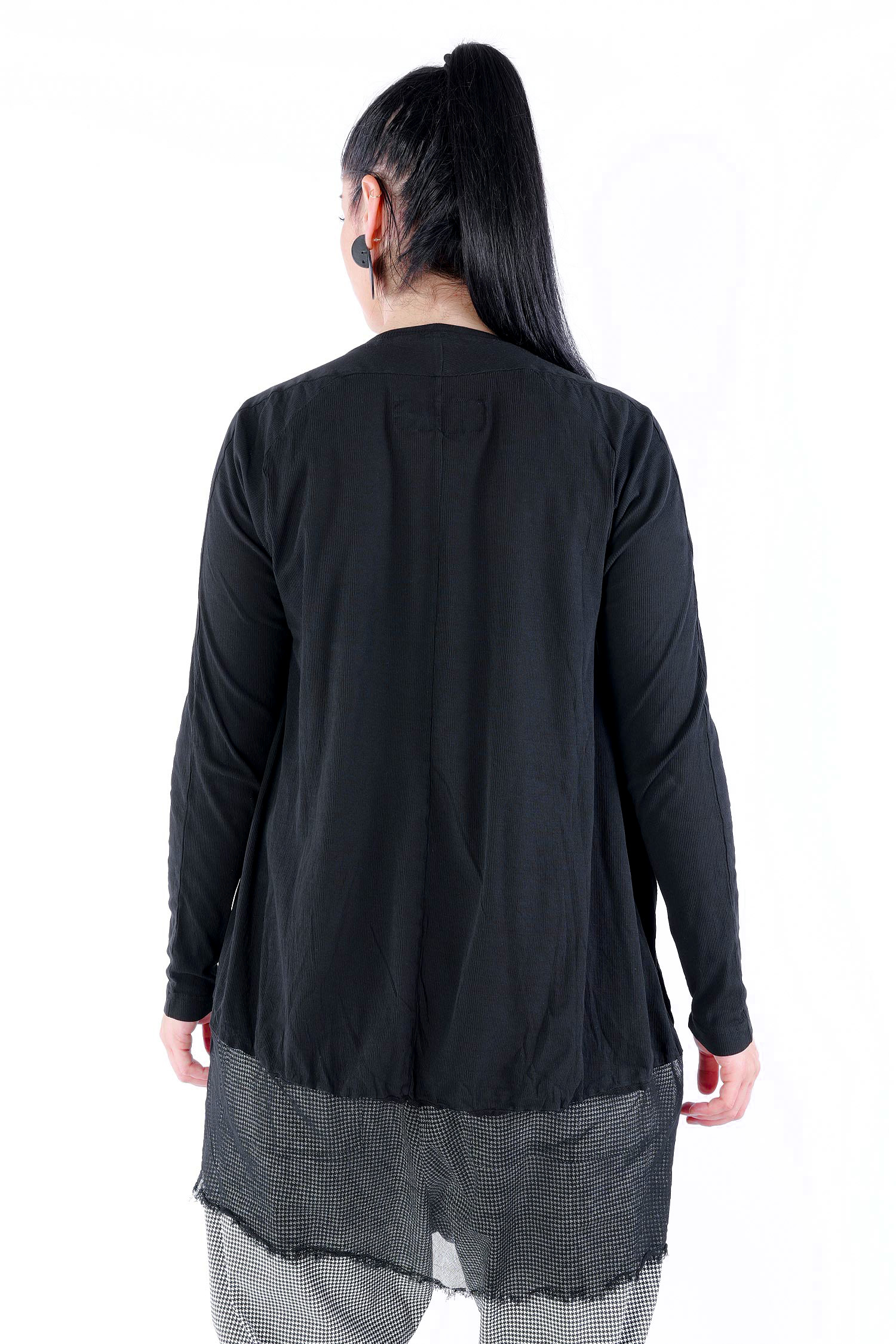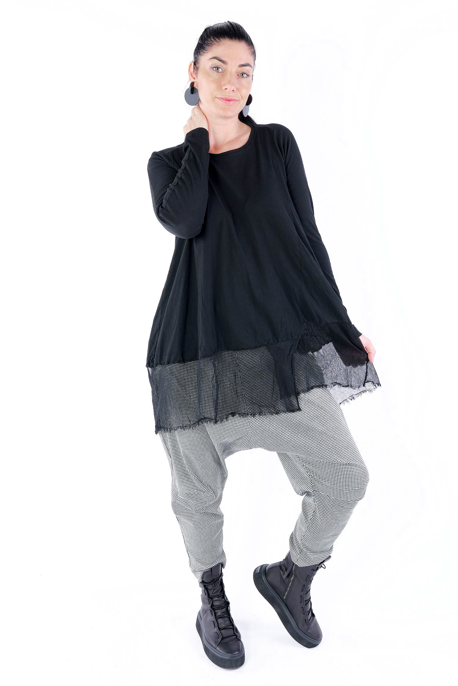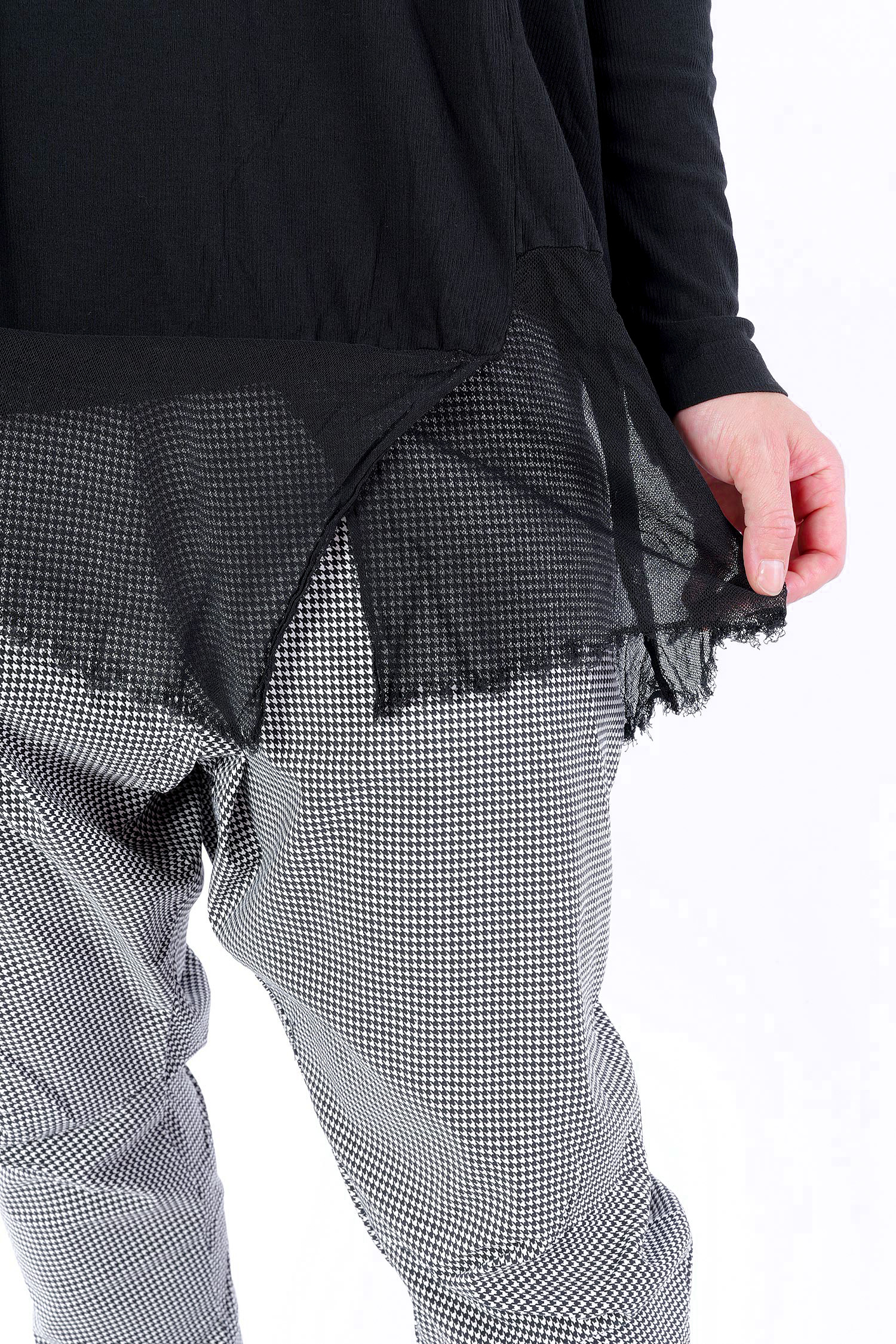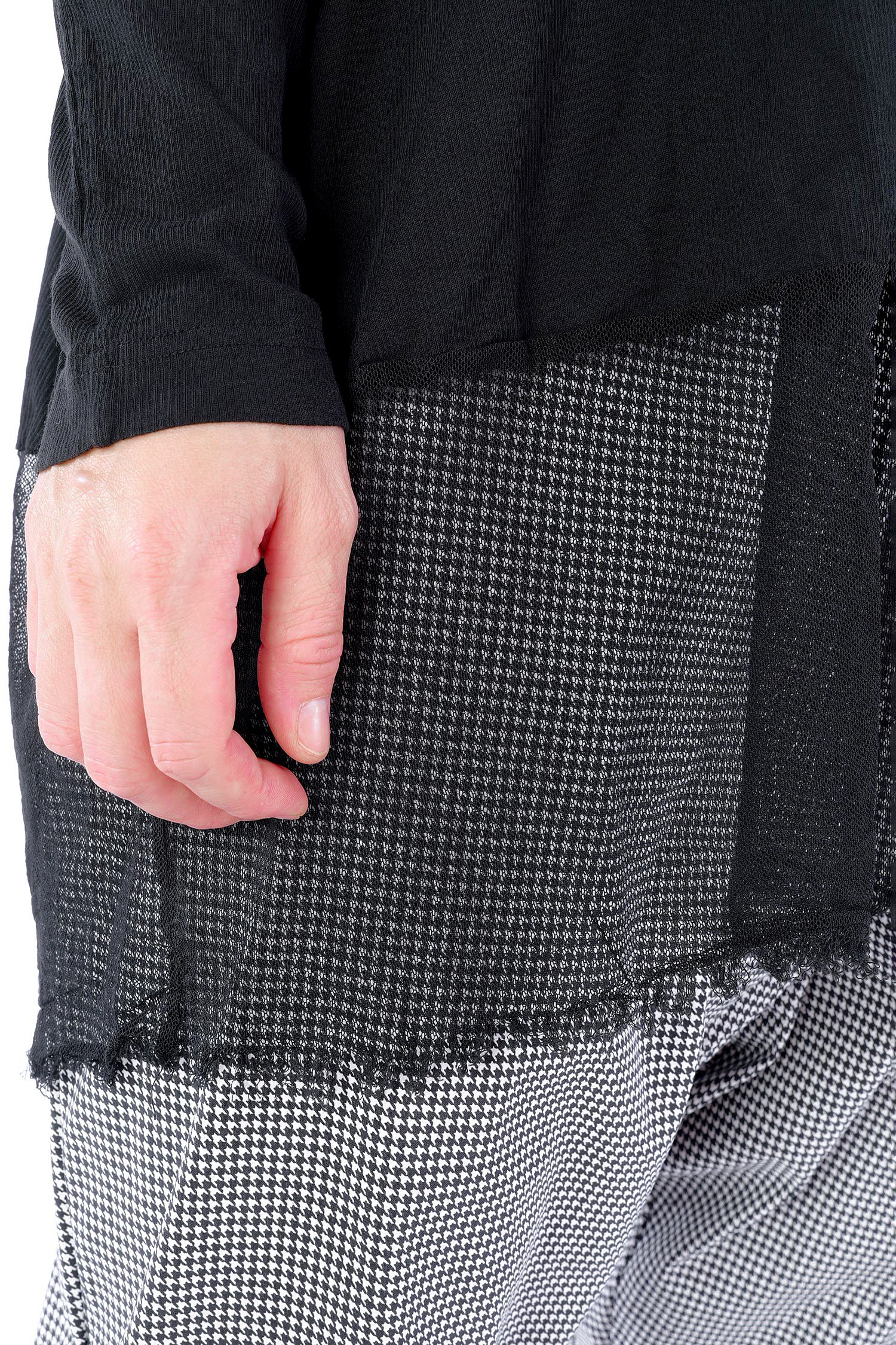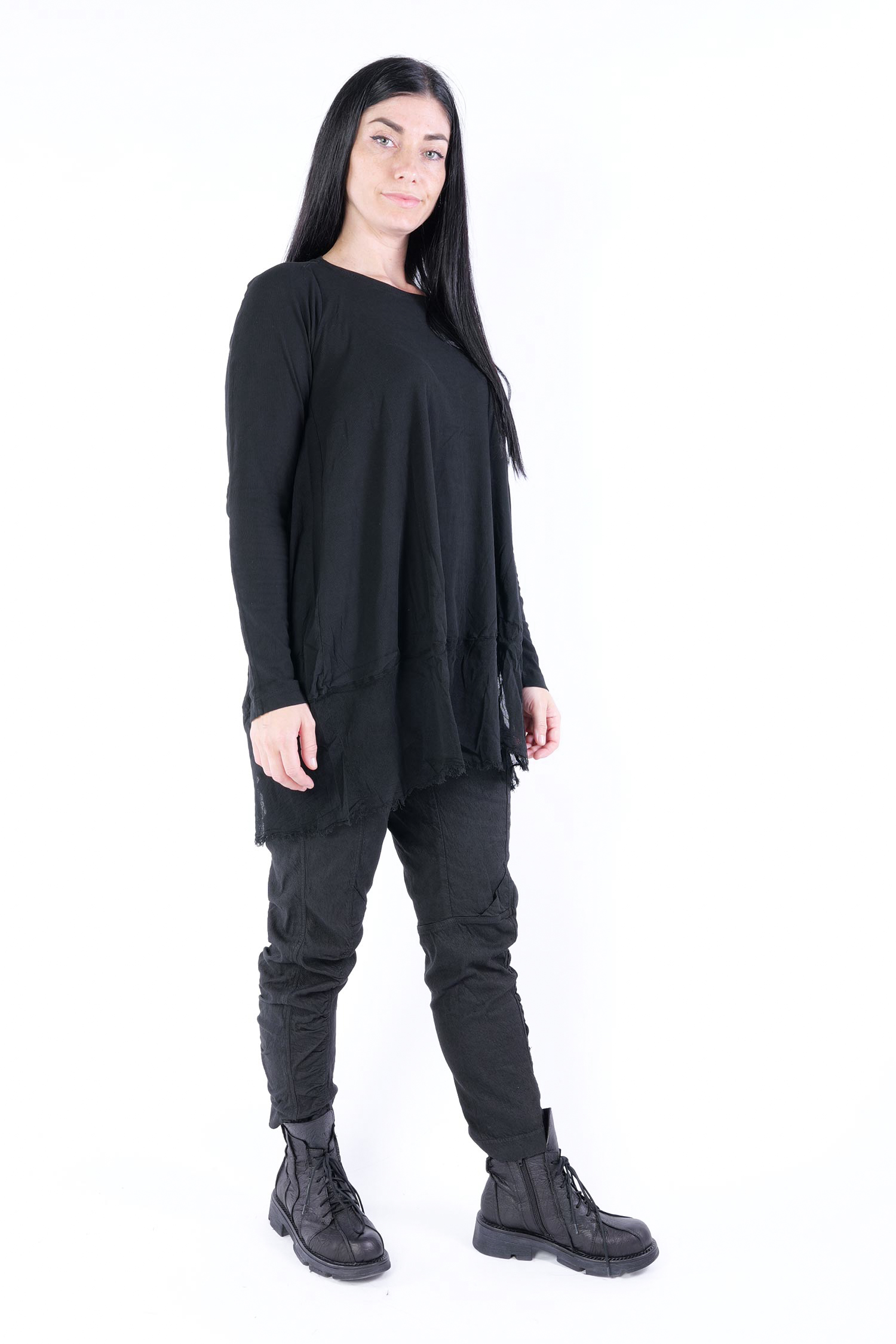 Details: - Dünnes Rippjersey - Tüll mit fransigen Kanten am Saum - Lange Ärmel - Tulpiger Schnitt - Rundhalsausschnitt - Saum asymmetrisch lang