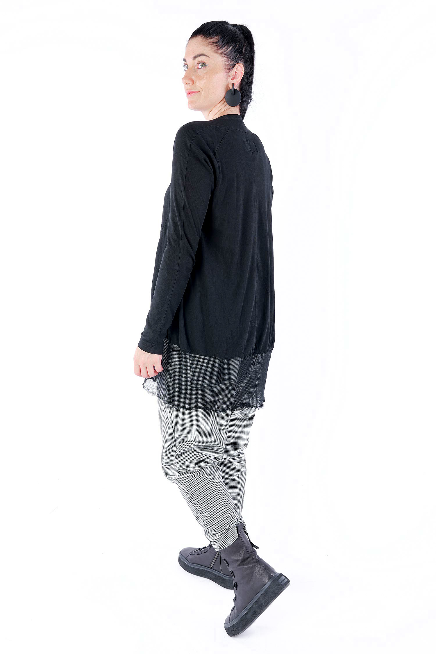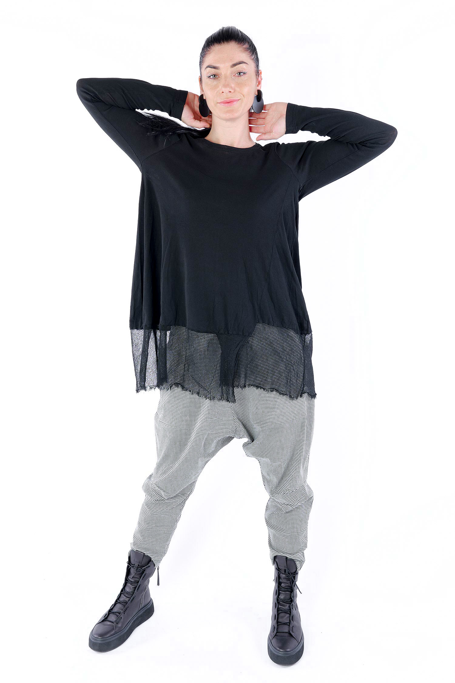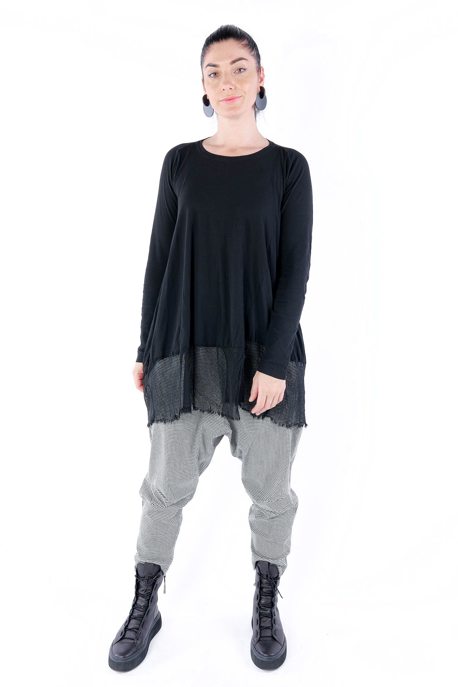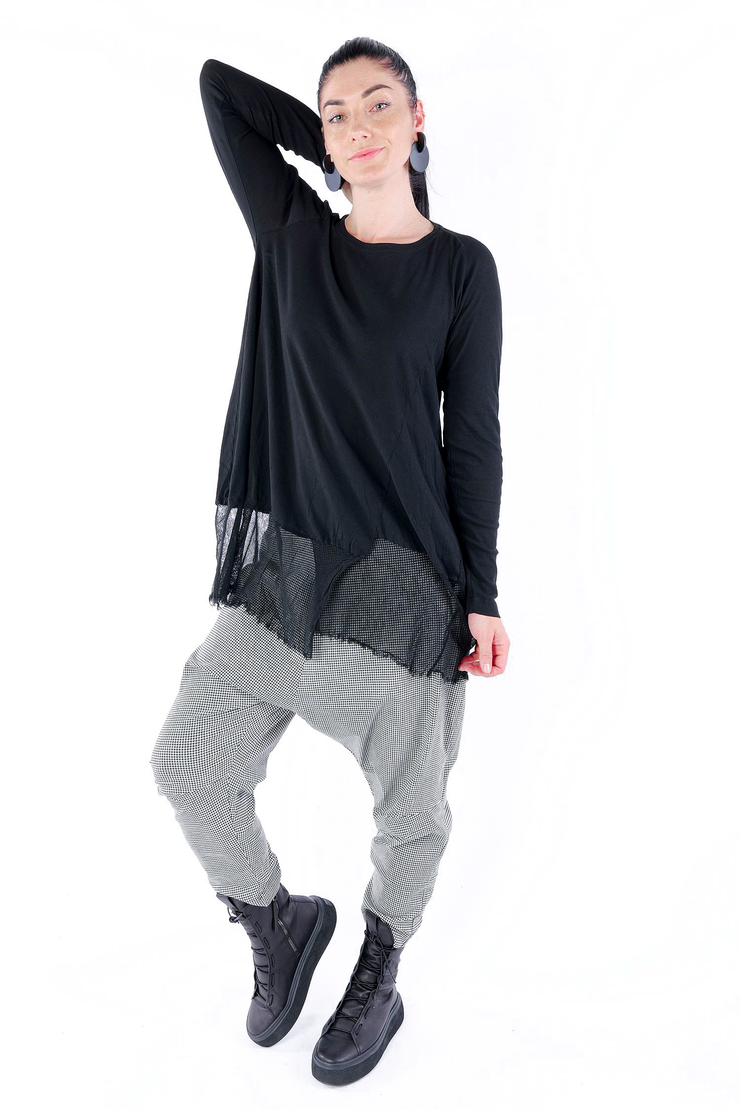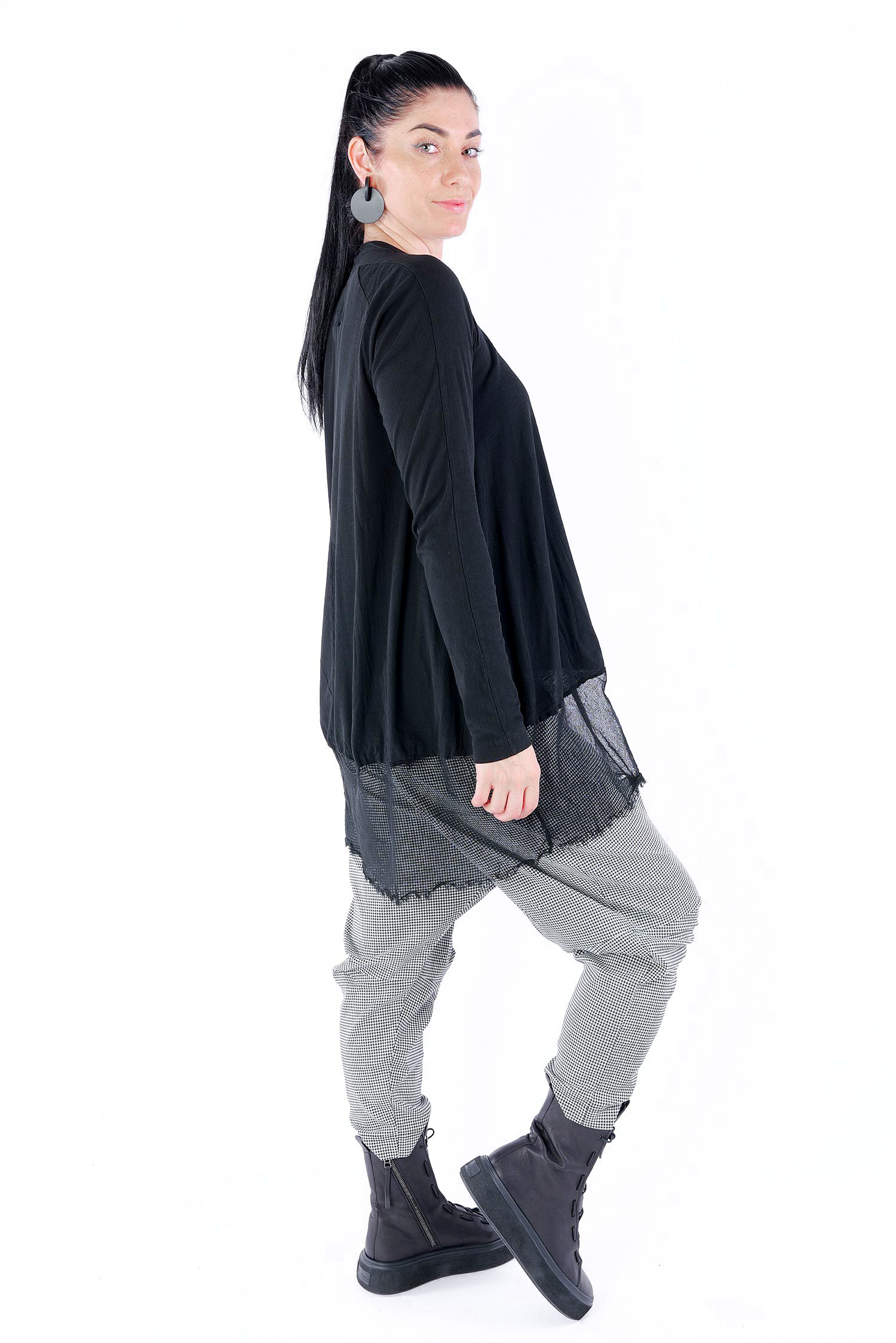 Details: - Dünnes Rippjersey - Tüll mit fransigen Kanten am Saum - Lange Ärmel - Tulpiger Schnitt - Rundhalsausschnitt - Saum asymmetrisch lang
