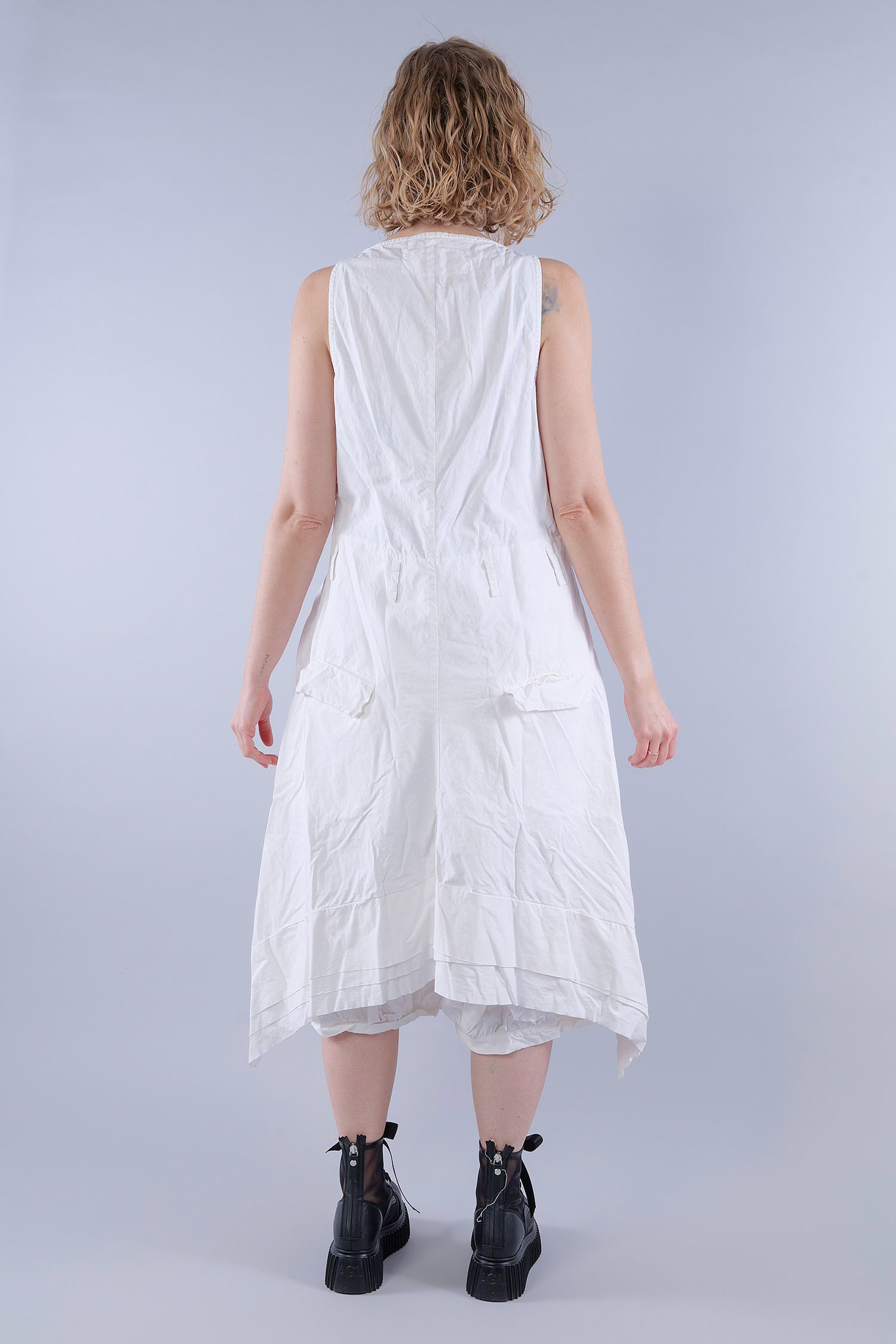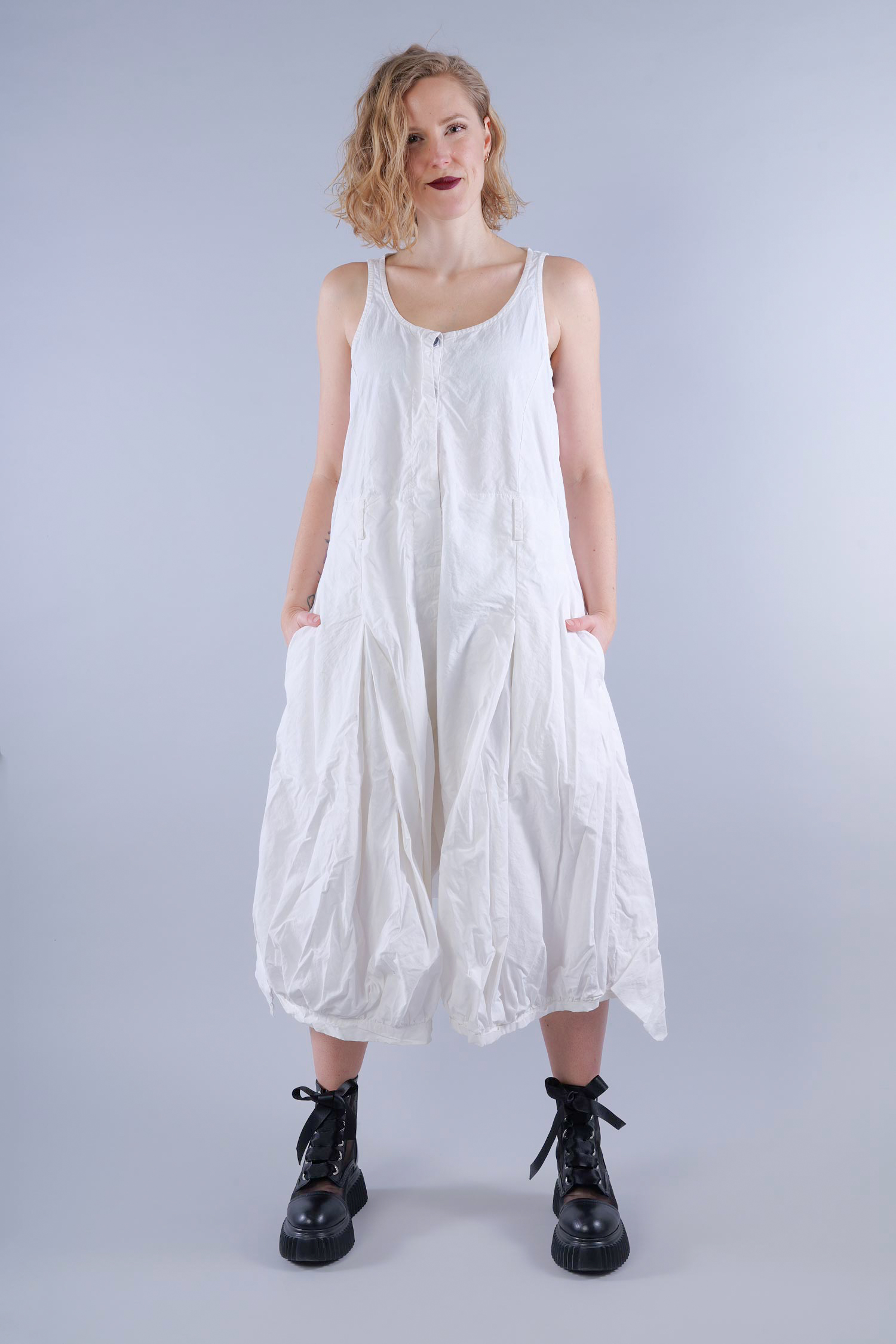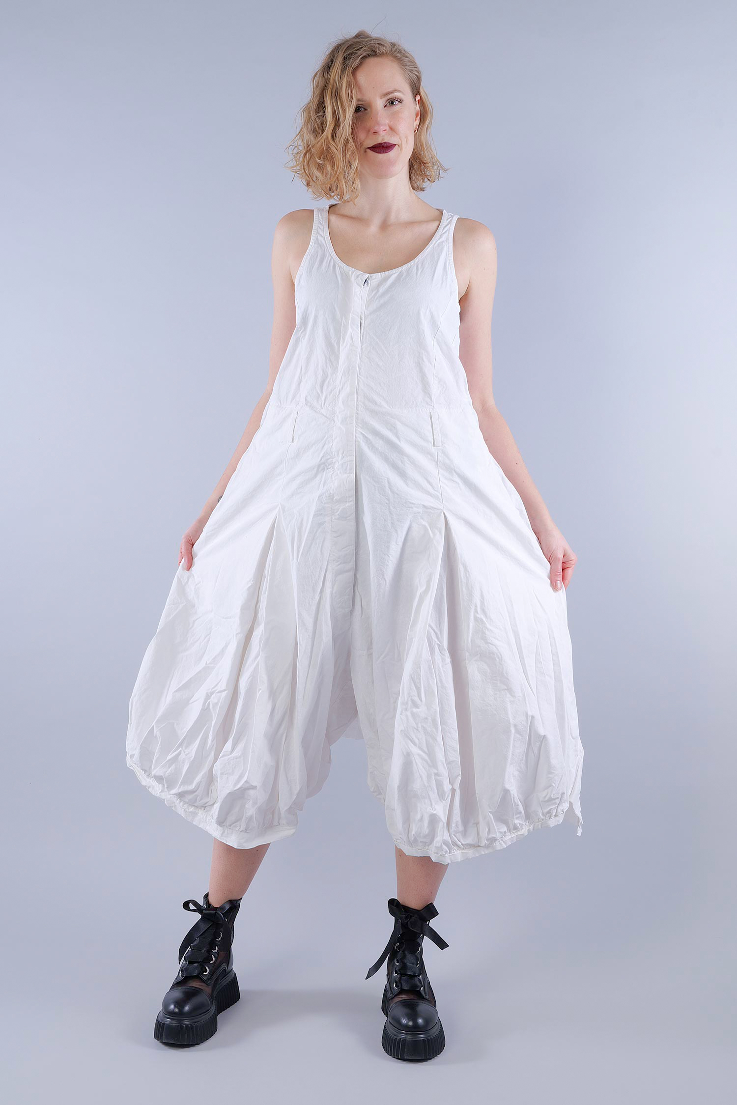 Details: - Schmale Träger - Verdeckte Knopfleiste - Kellerfalten - Gürtelschlaufen - Zum Teil offene Kanten - Sehr weites tulpiges Bein - Eingrifftaschen seitlich - Pattentaschen hinten - Hinten doppellagig, sehr dekorativ