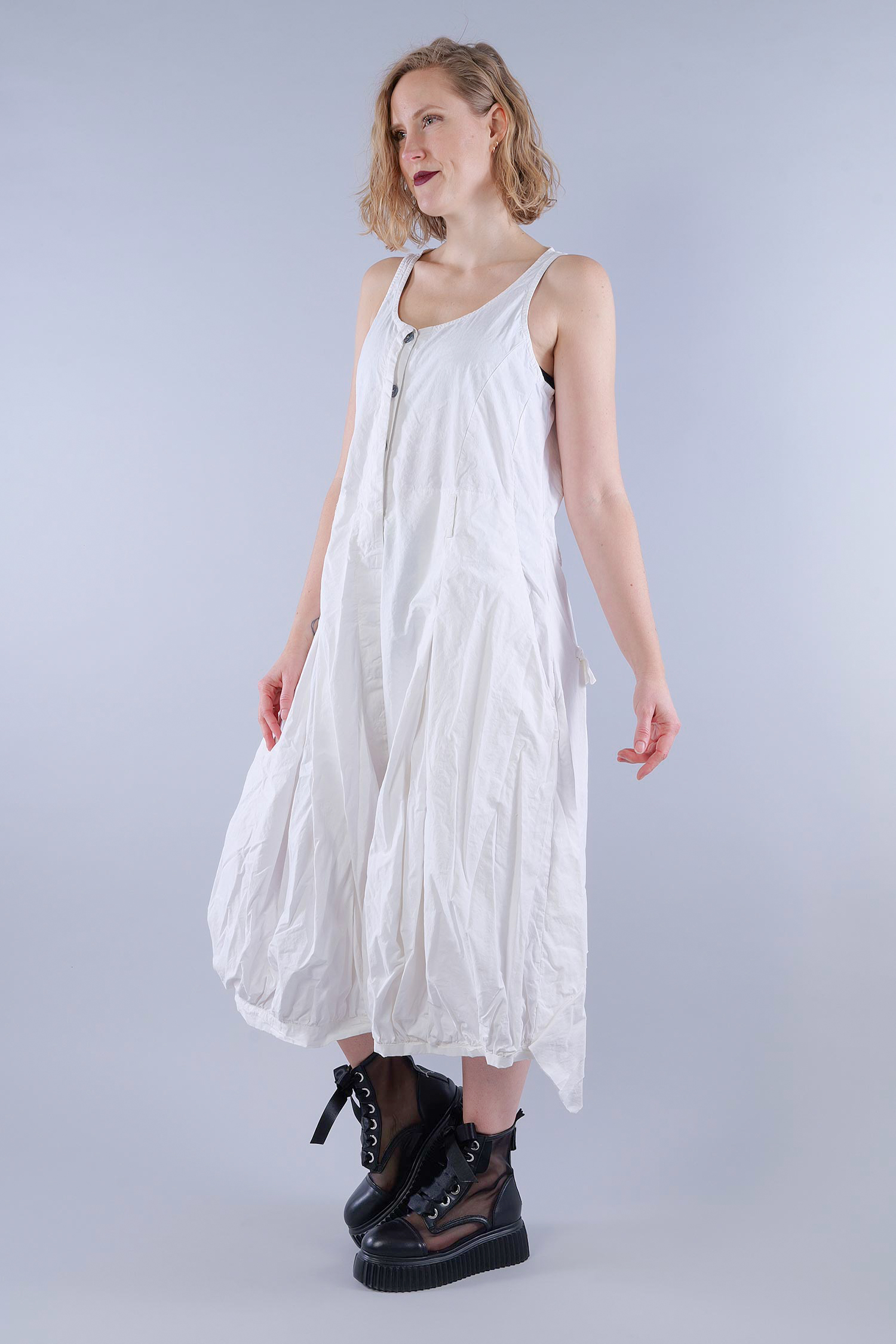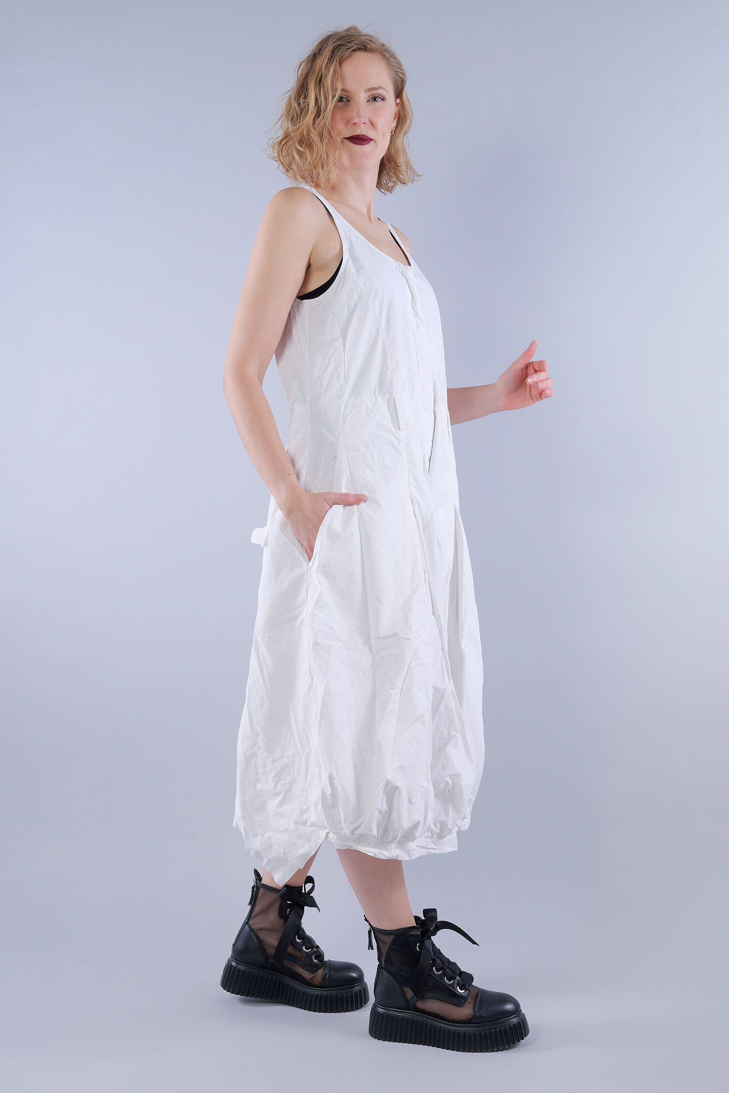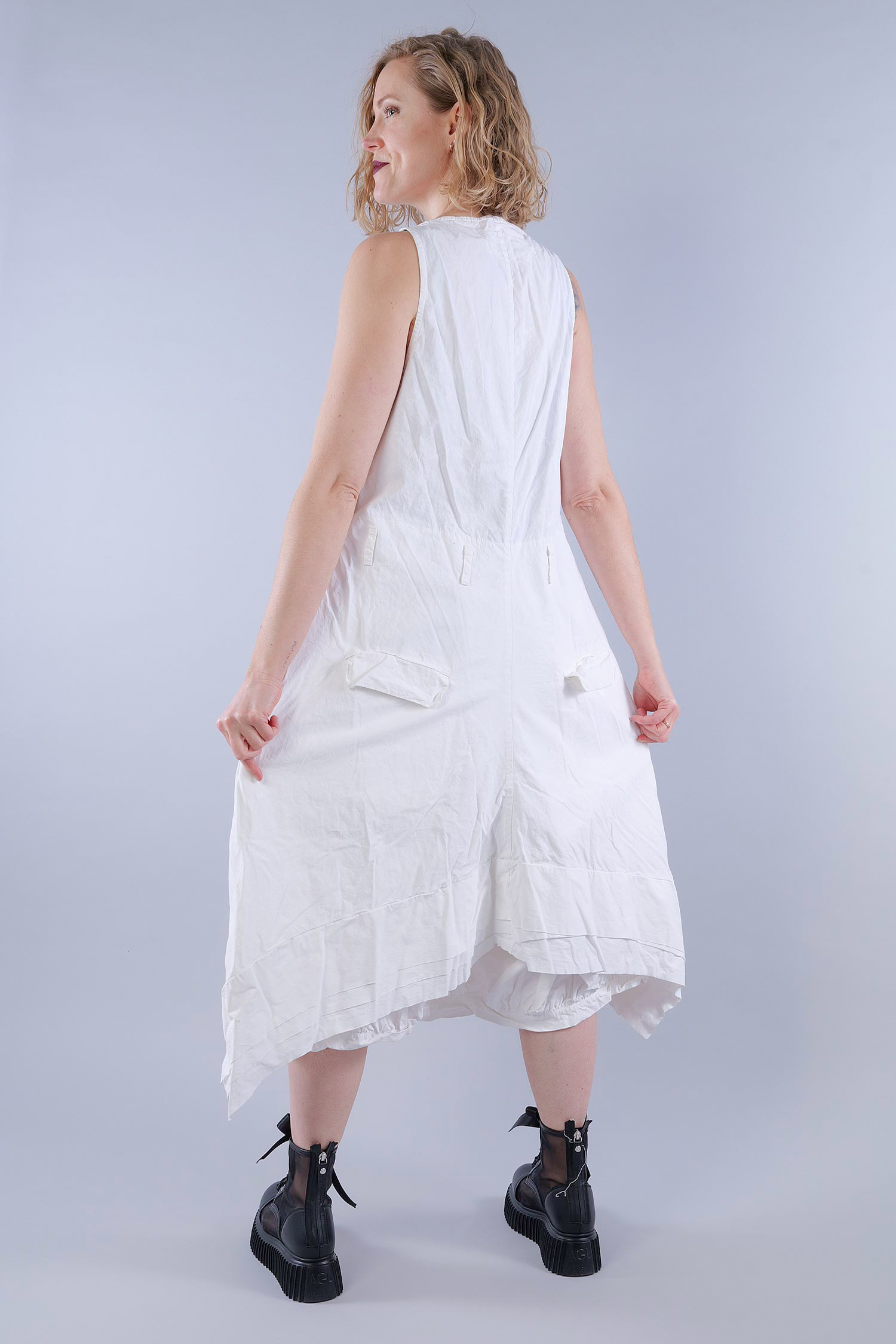 Details: - Schmale Träger - Verdeckte Knopfleiste - Kellerfalten - Gürtelschlaufen - Zum Teil offene Kanten - Sehr weites tulpiges Bein - Eingrifftaschen seitlich - Pattentaschen hinten - Hinten doppellagig, sehr dekorativ