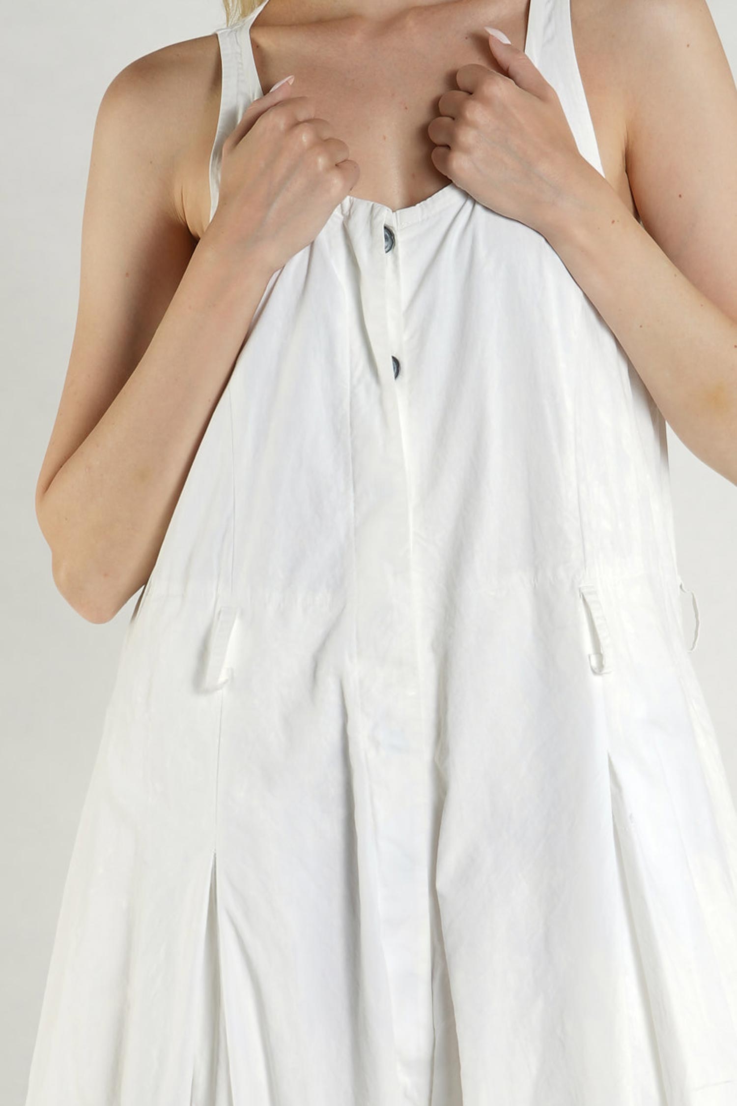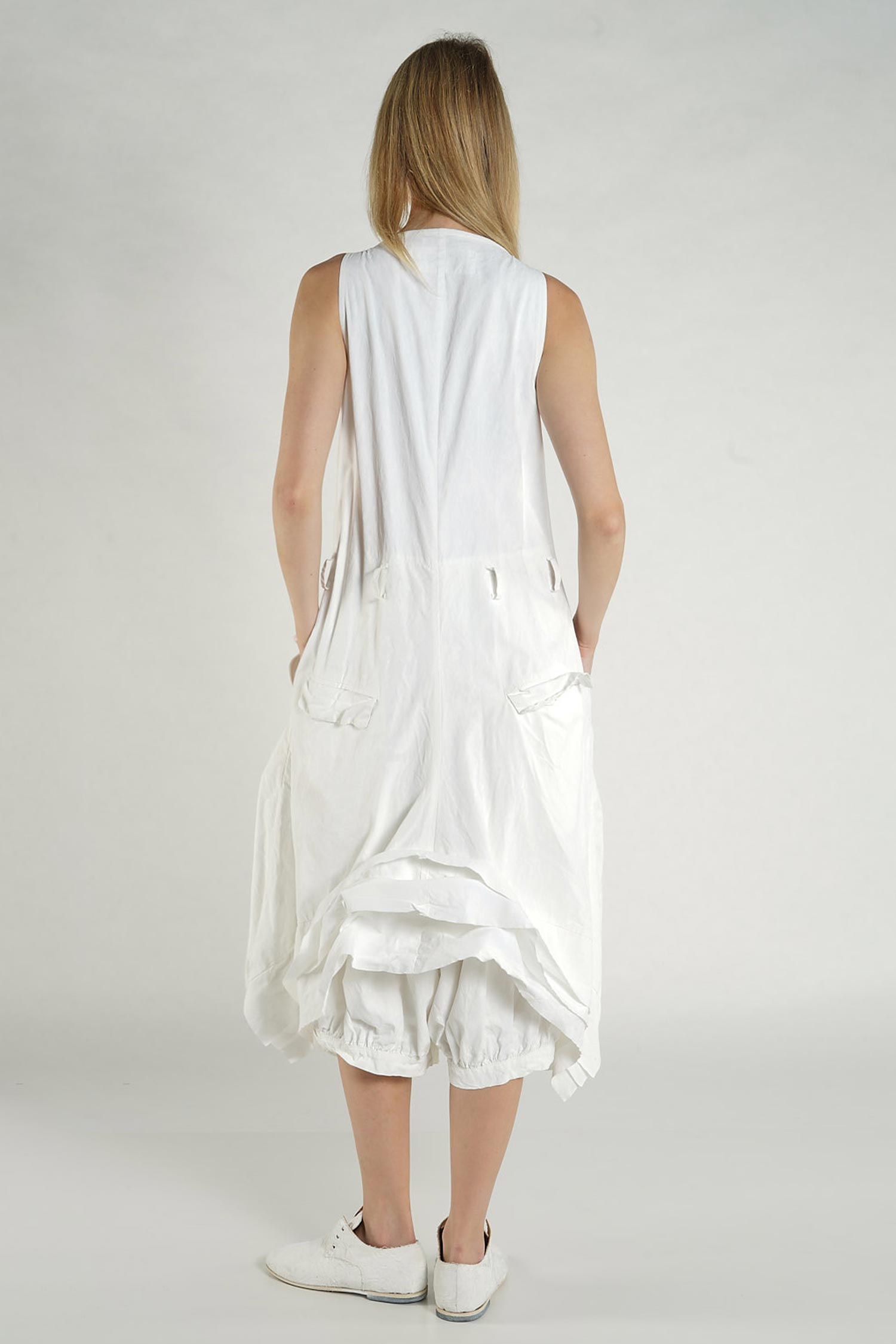 Details: - Schmale Träger - Verdeckte Knopfleiste - Kellerfalten - Gürtelschlaufen - Zum Teil offene Kanten - Sehr weites tulpiges Bein - Eingrifftaschen seitlich - Pattentaschen hinten - Hinten doppellagig, sehr dekorativ