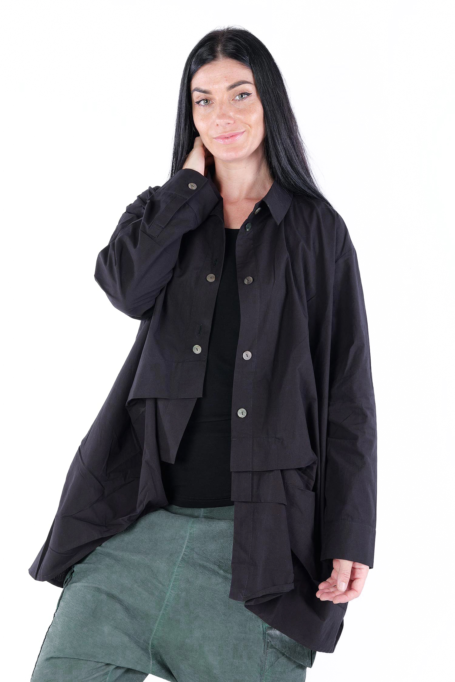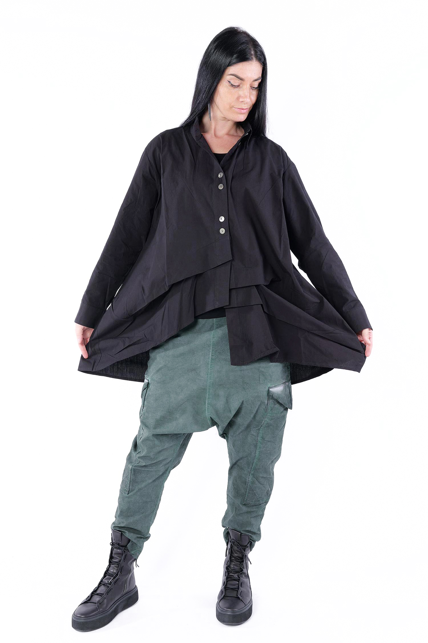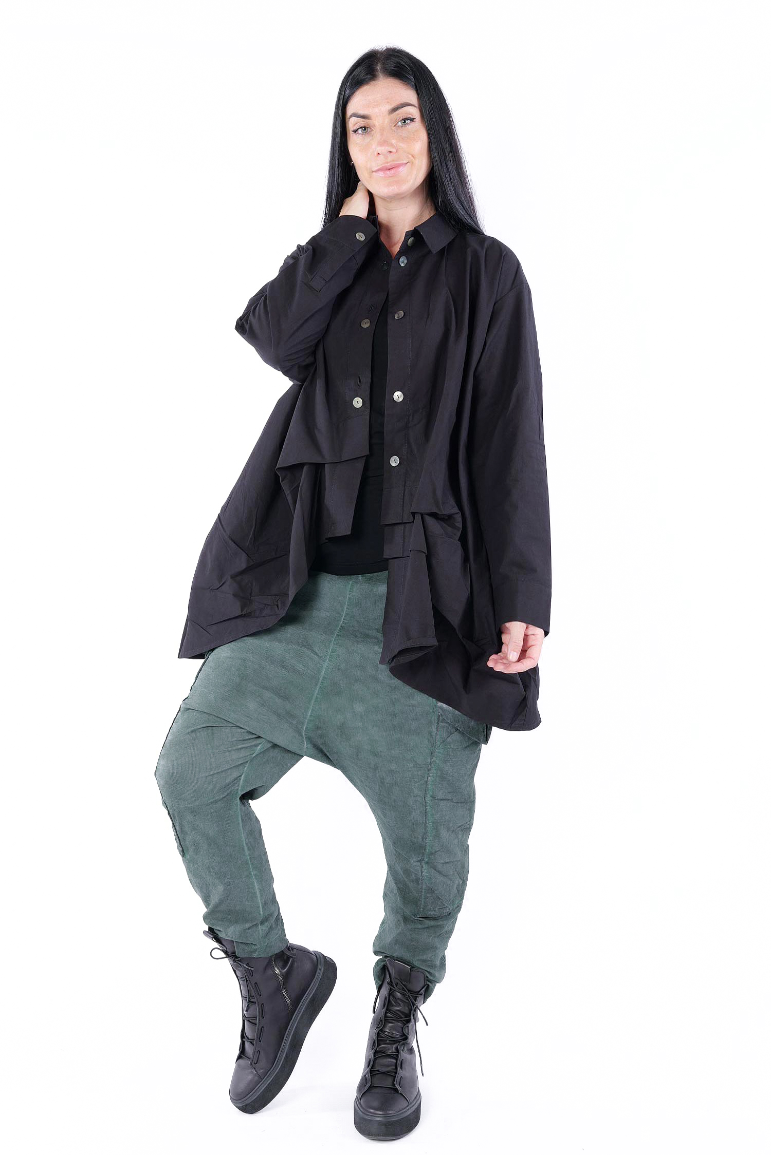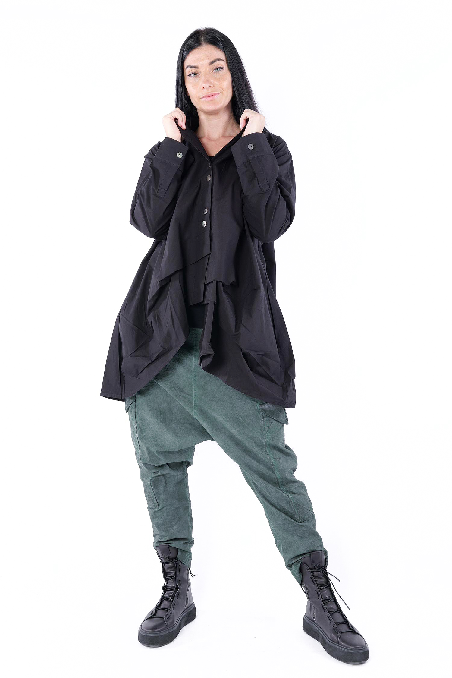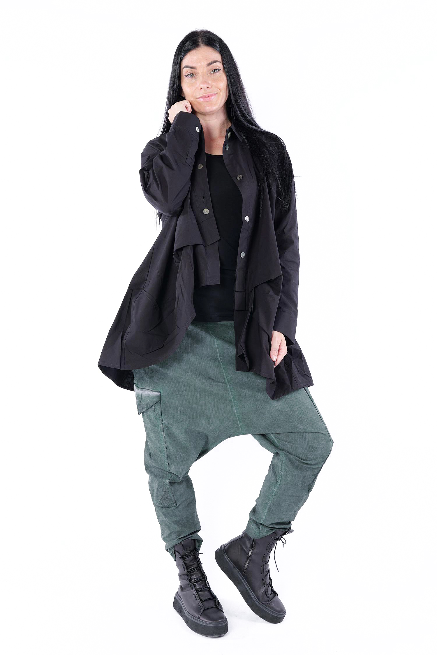 - Vorne Faltendesign – Knöpfung sieht optisch asymmetrisch aus