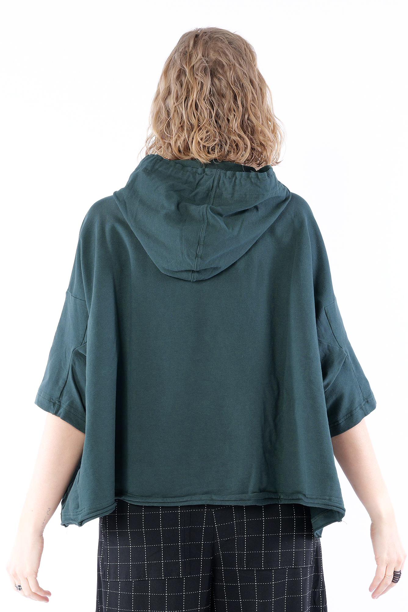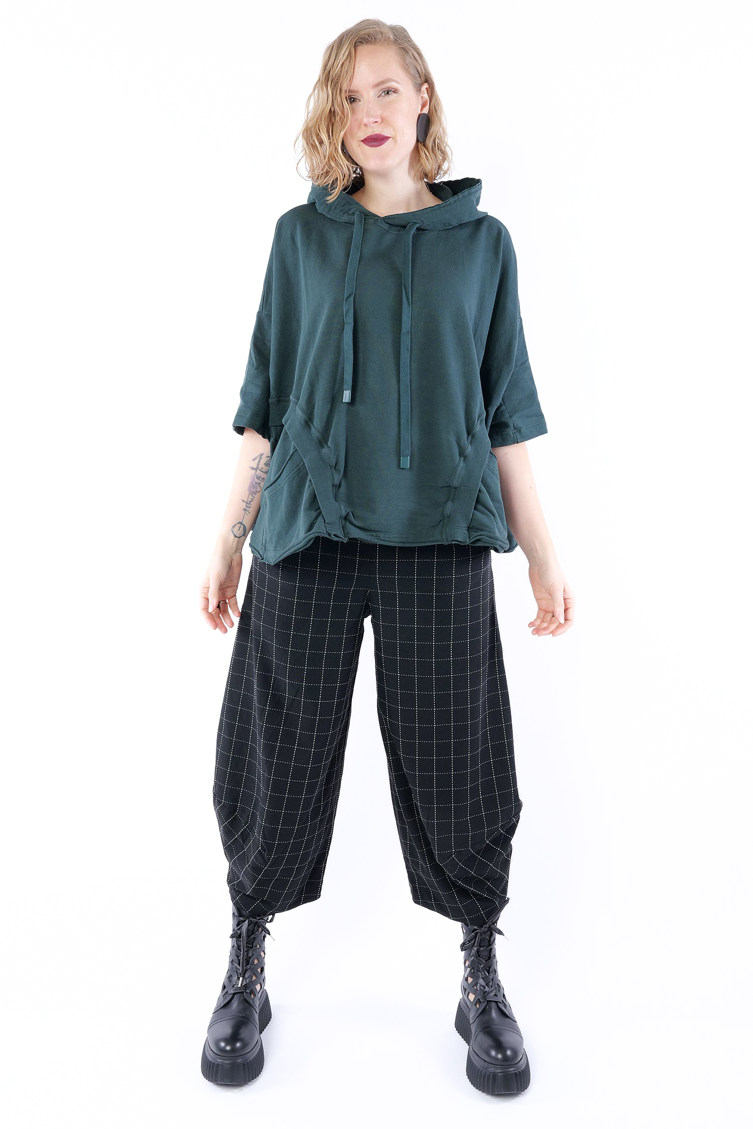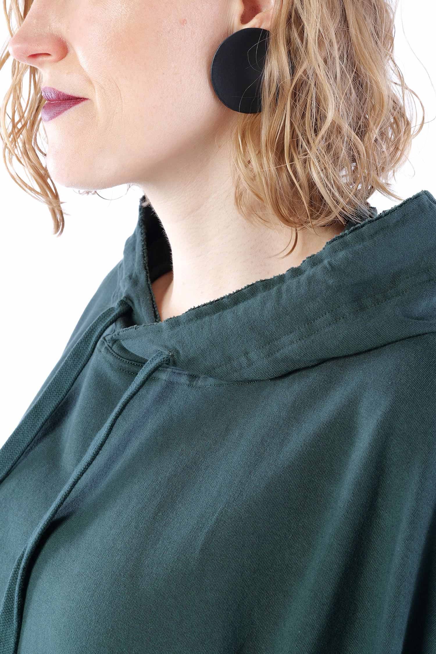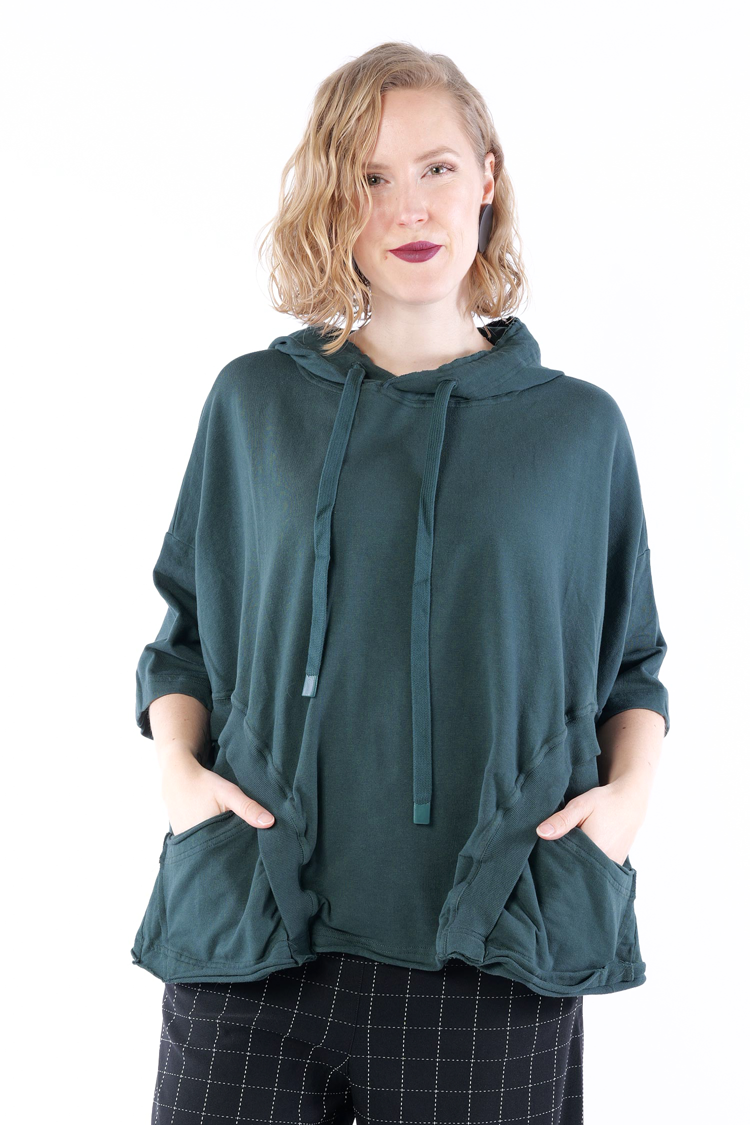 Details: - Weit und kastig - Oversize Schnitt - Dekorativer Schnitt mit aufwendigen Nähten - Sweatmaterial - Kapuze mit Zugband - Details aus Rippjersey - Offene Kanten - Halblange Ärmel - Eingrifftaschen vorne