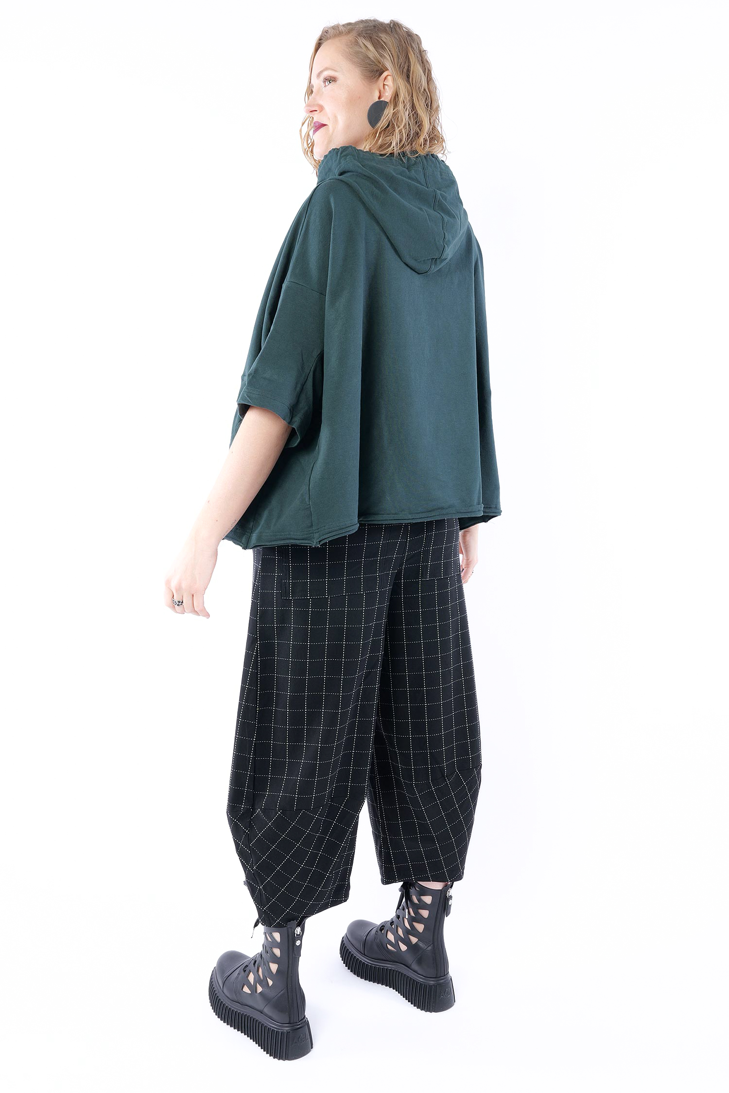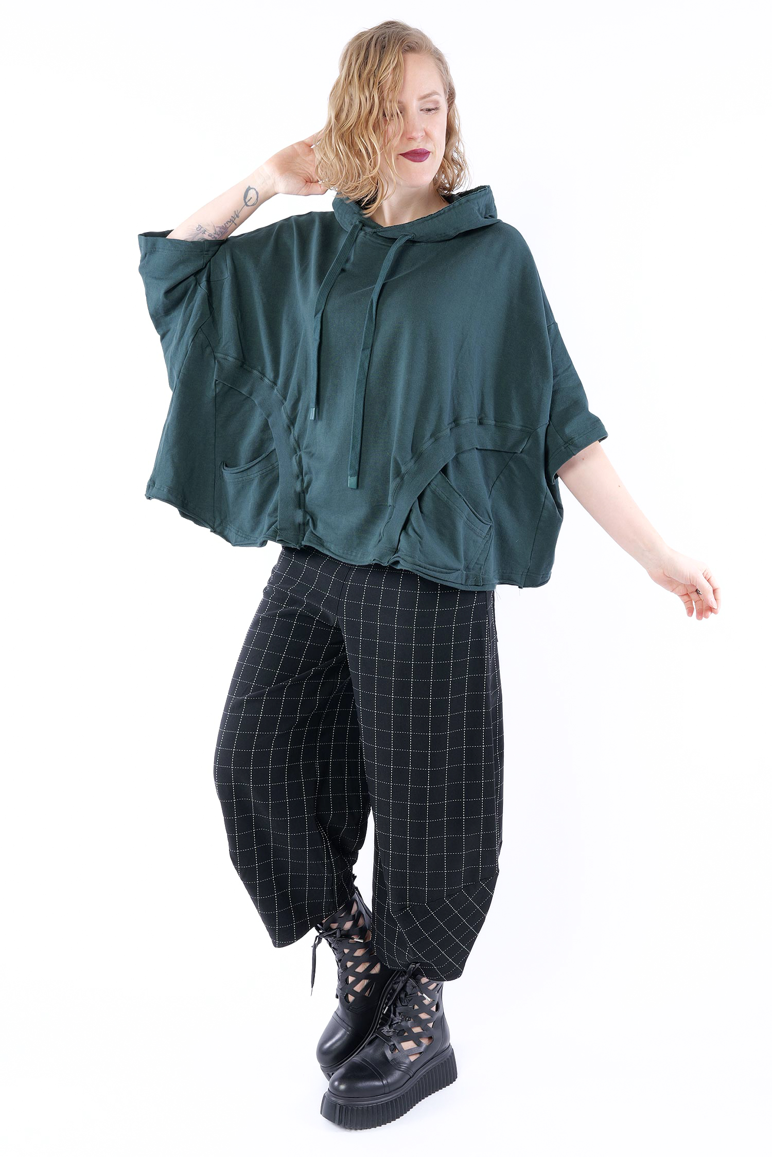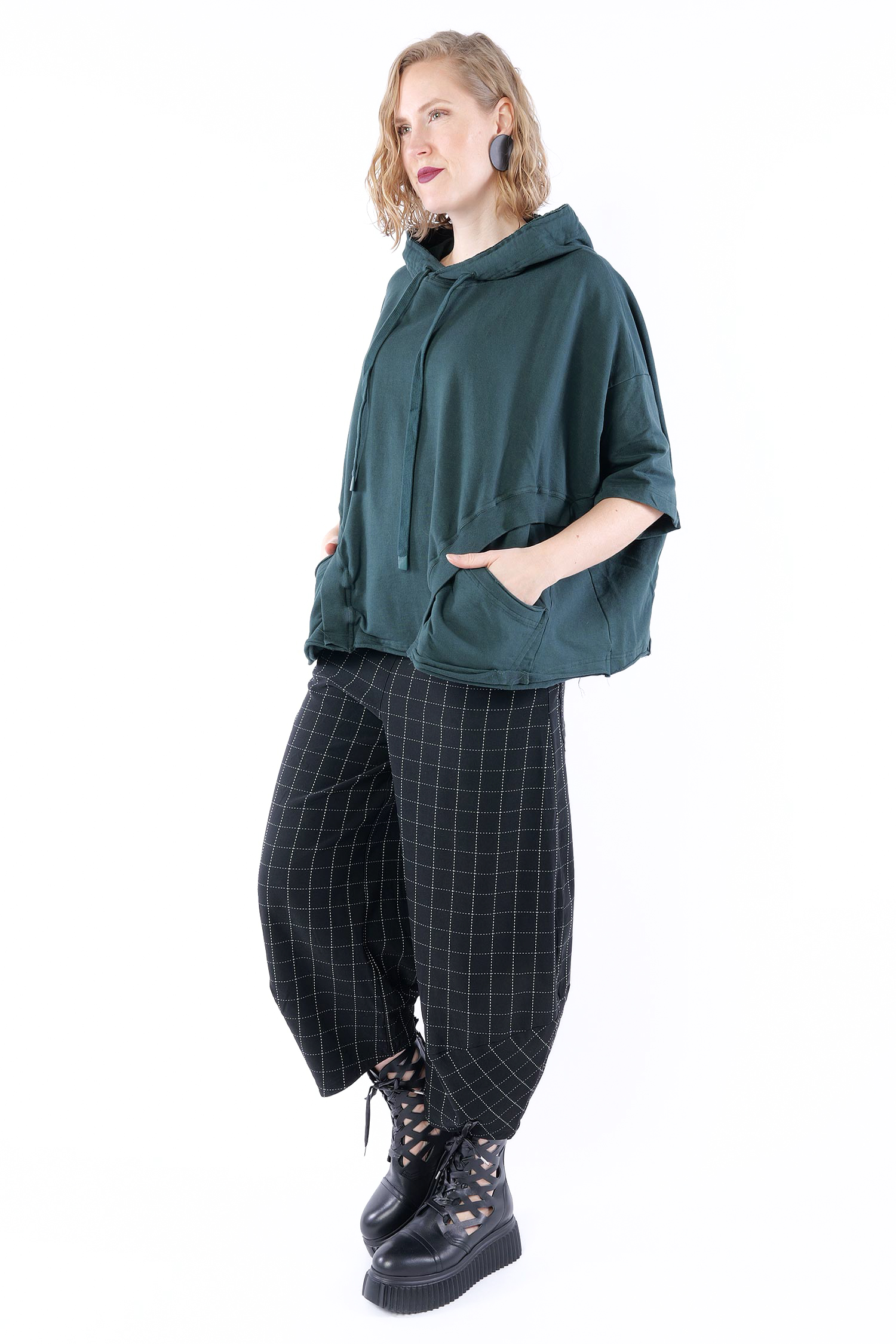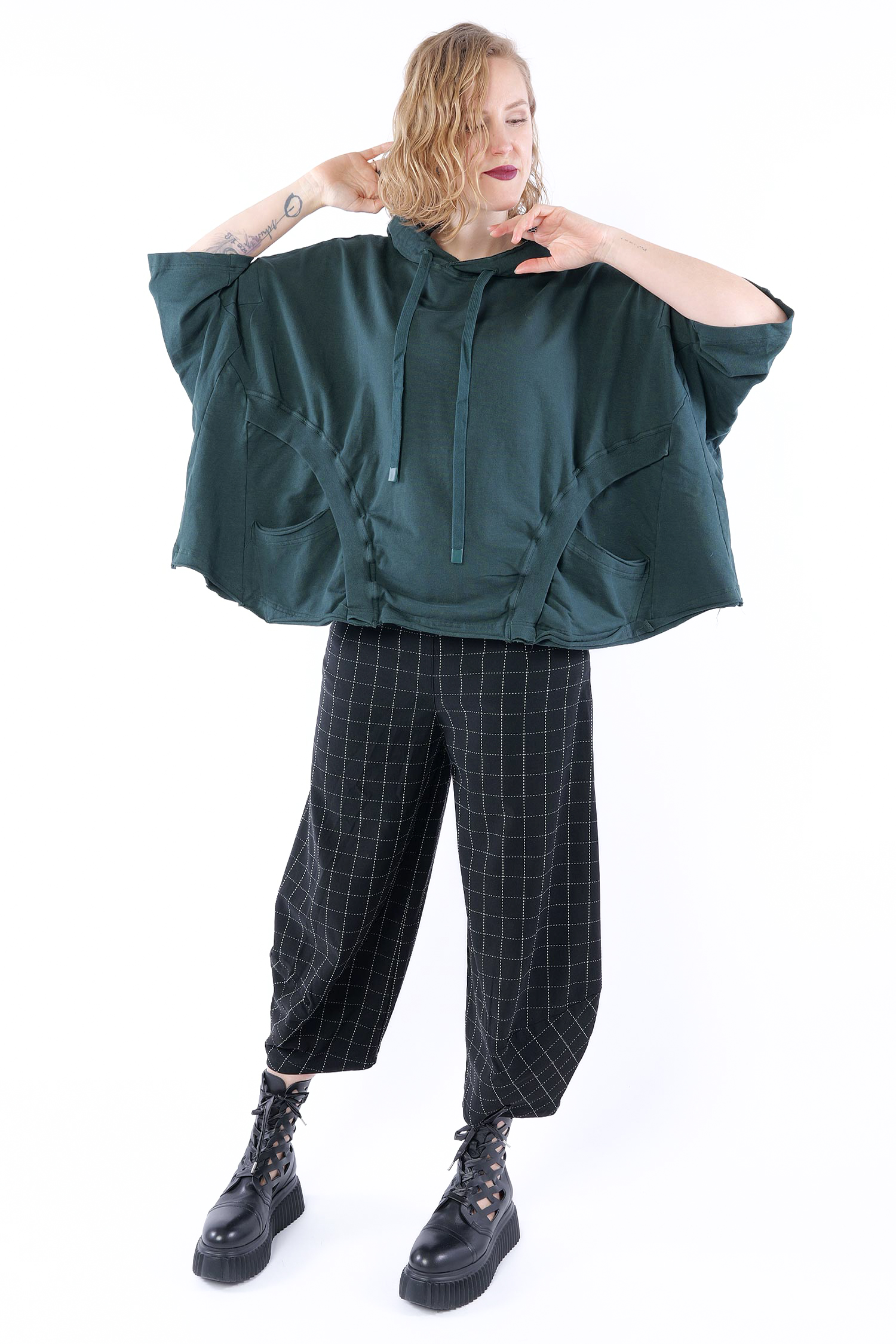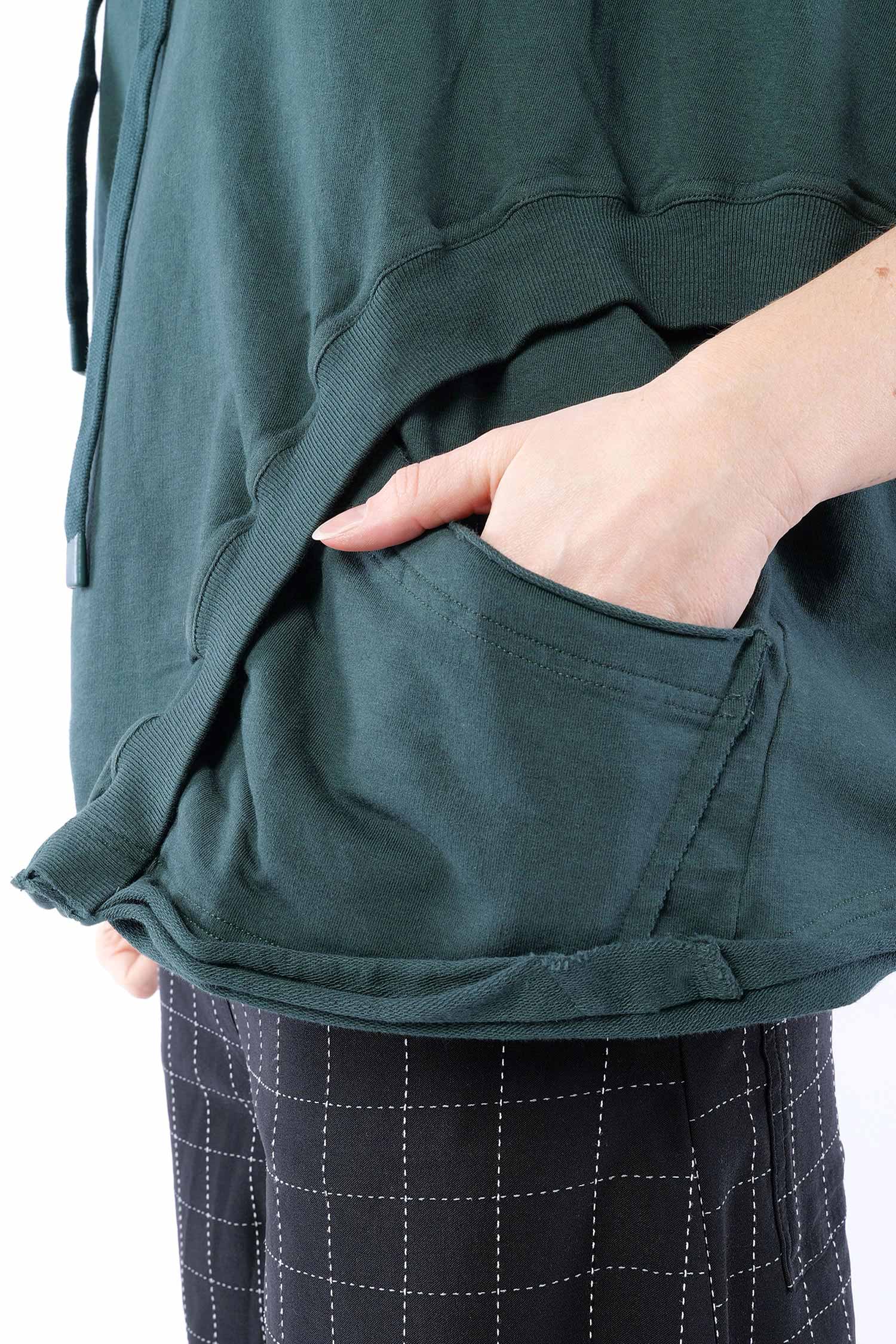 Details: - Weit und kastig - Oversize Schnitt - Dekorativer Schnitt mit aufwendigen Nähten - Sweatmaterial - Kapuze mit Zugband - Details aus Rippjersey - Offene Kanten - Halblange Ärmel - Eingrifftaschen vorne