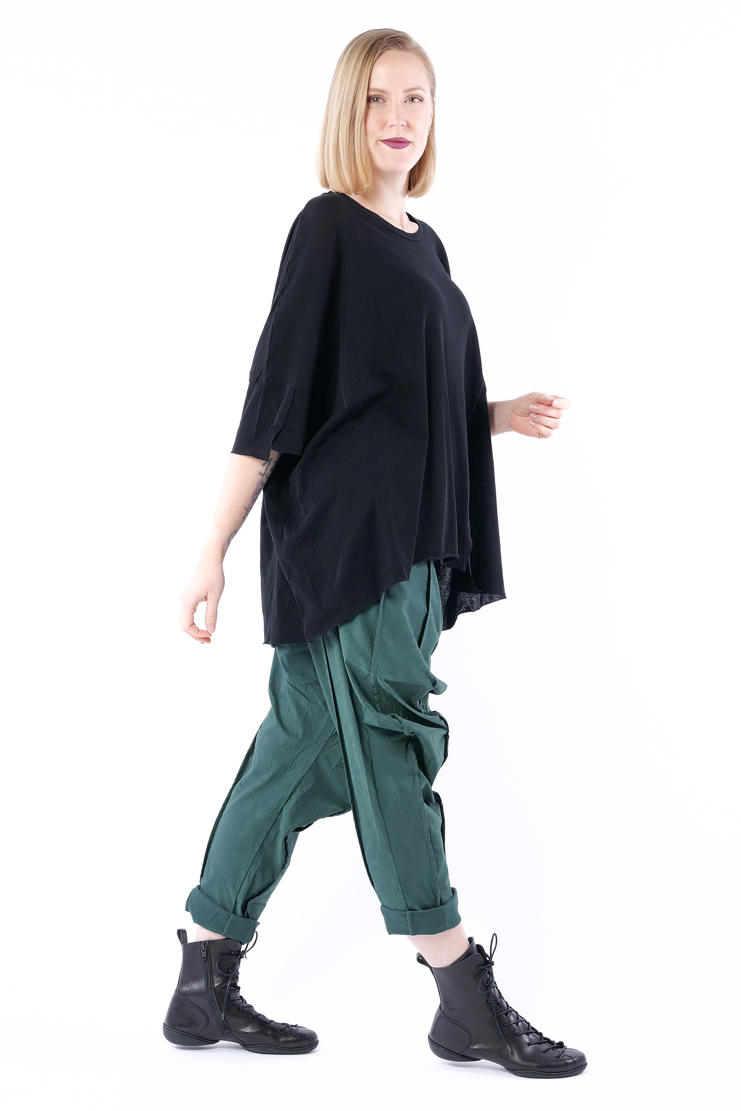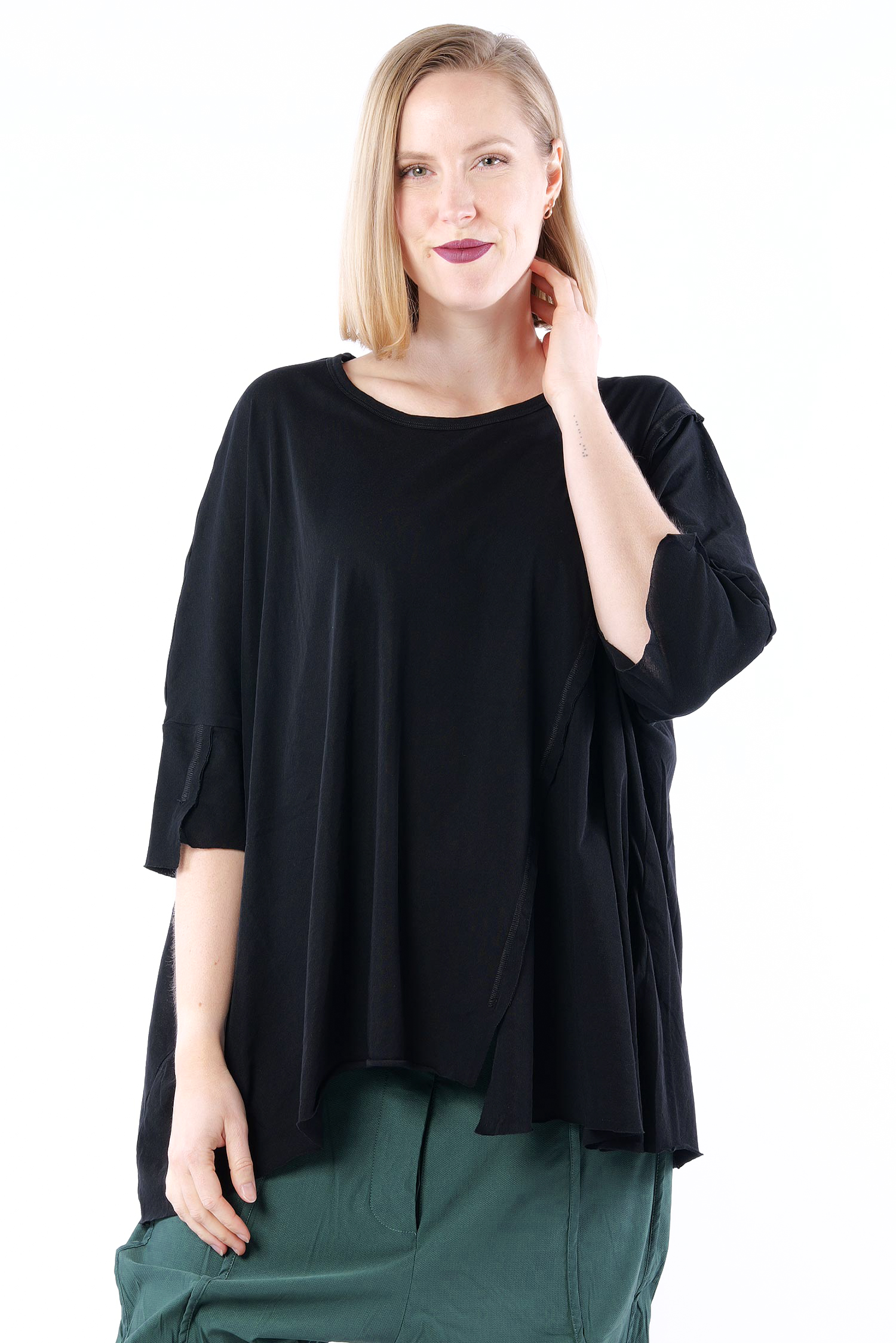 Details: - Weit und kastig - Ziernähte nach außen - Weiter, halsferner Rundhalsausschnitt - Griffiges T-Shirt Jersey - Asymmetrischer Saum mit kleinen Schlitzen - Überschnittene Schulter - Halblange Ärmel mit asymmetrischem Saum - Ärmeln und Saum offene Kanten - Ärmel geschlitzt - Hinten etwas länger