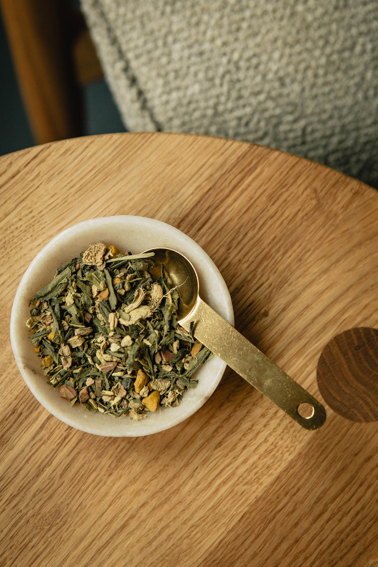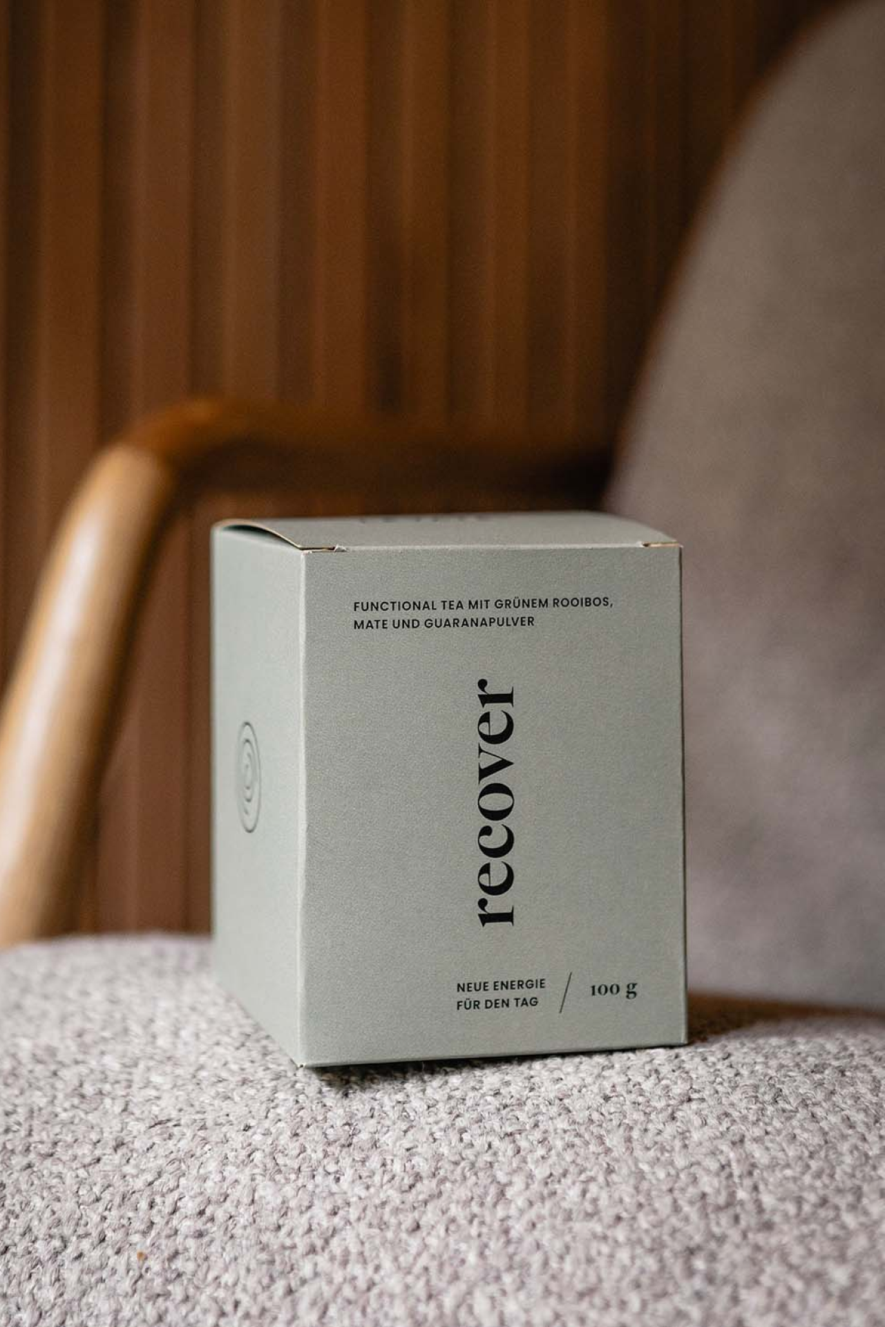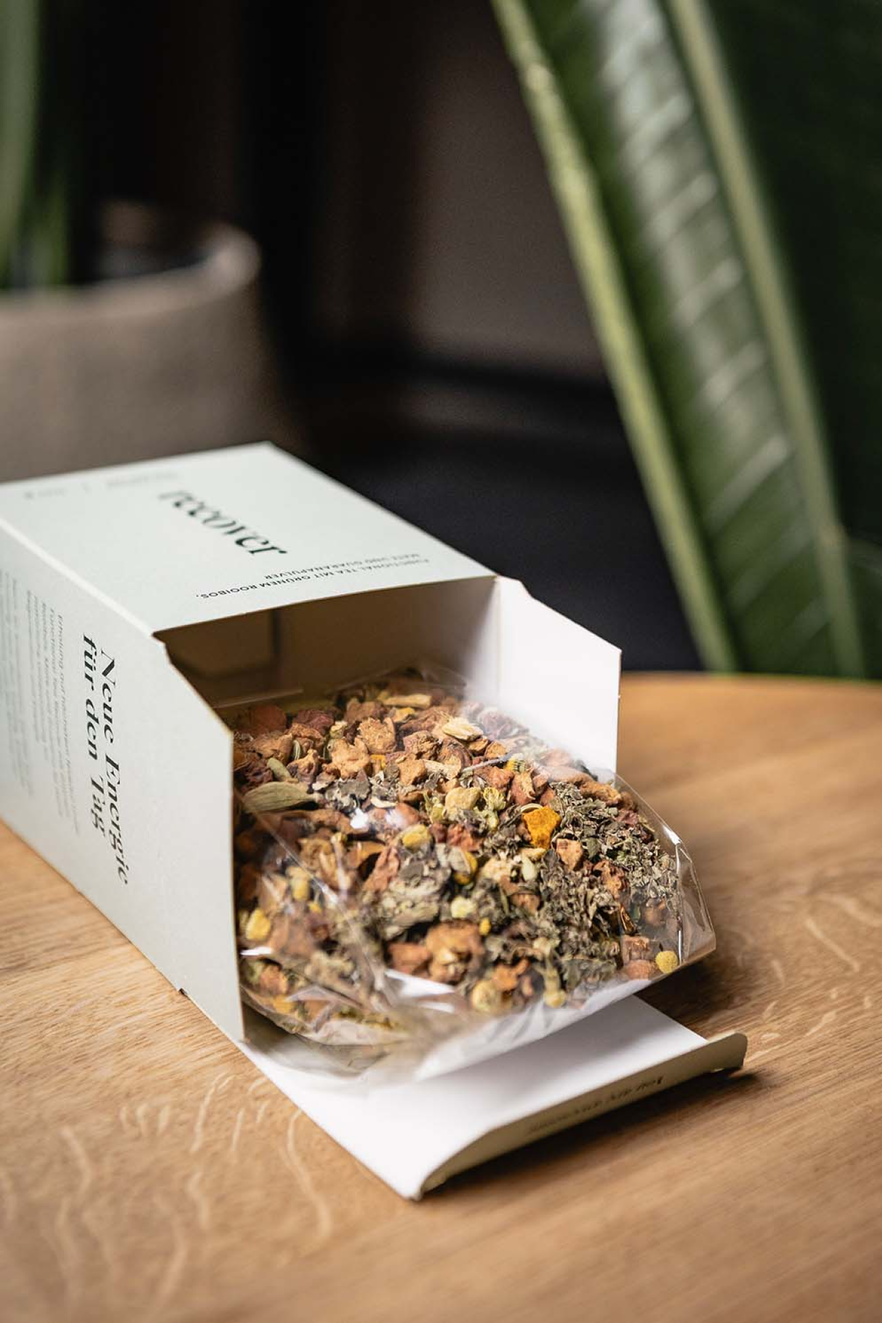Synergetischer Funktionstee zur Regeneration mit Apfelstücken, Mate, Grünem Rooibos, Ingwerstücken, Kamille, Himbeerblättern, Kurkumawurzel, Kardamom, Guaranapulver und Schwarzem Pfeffer.
