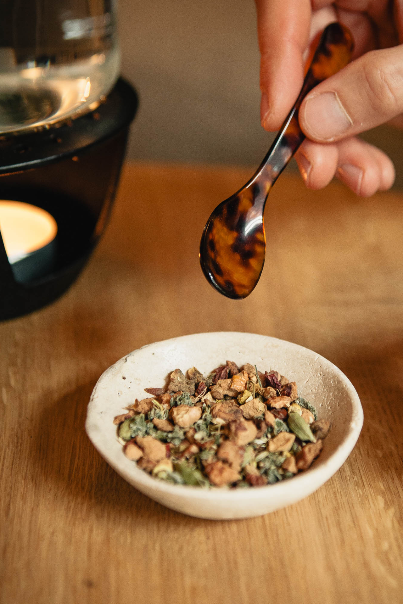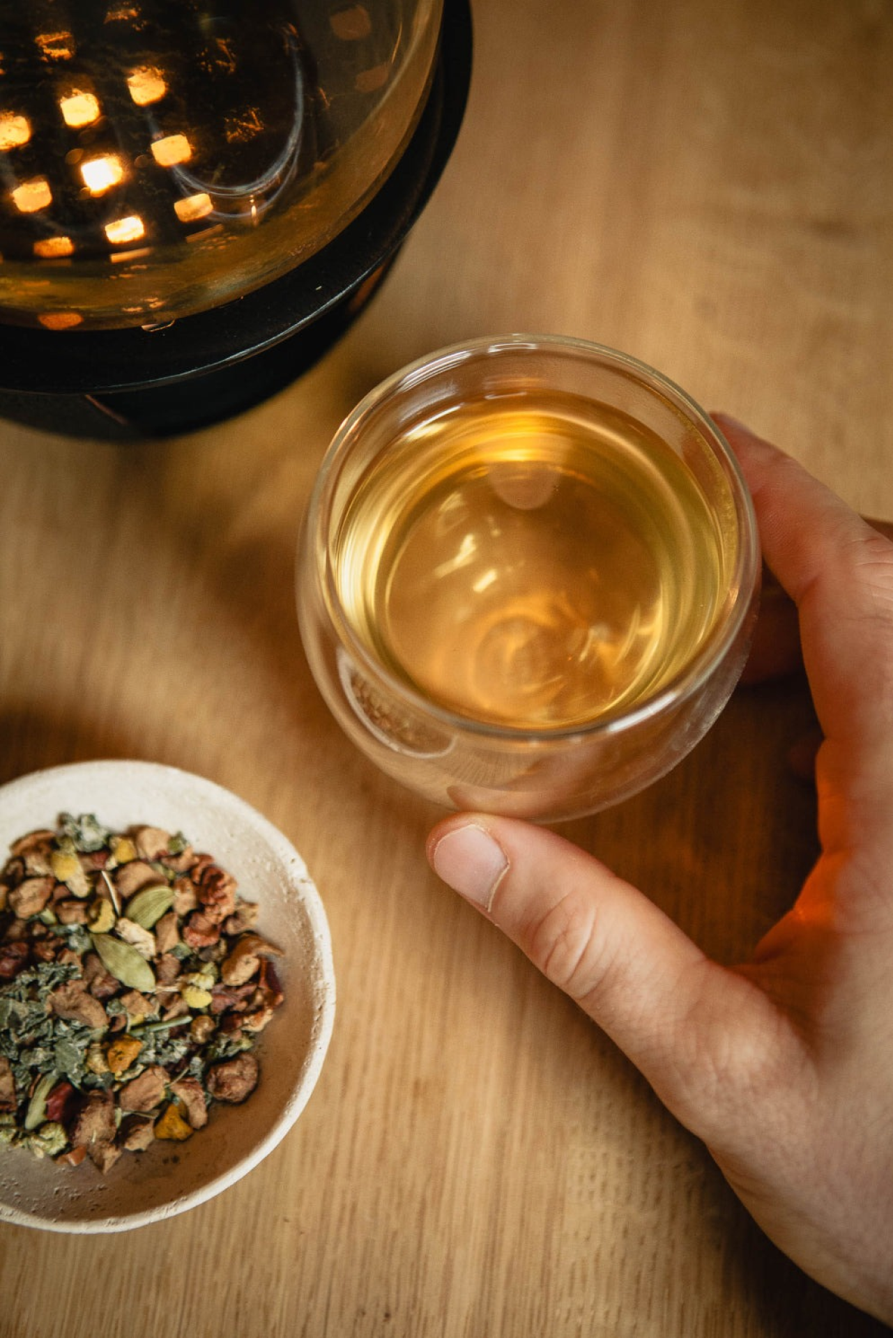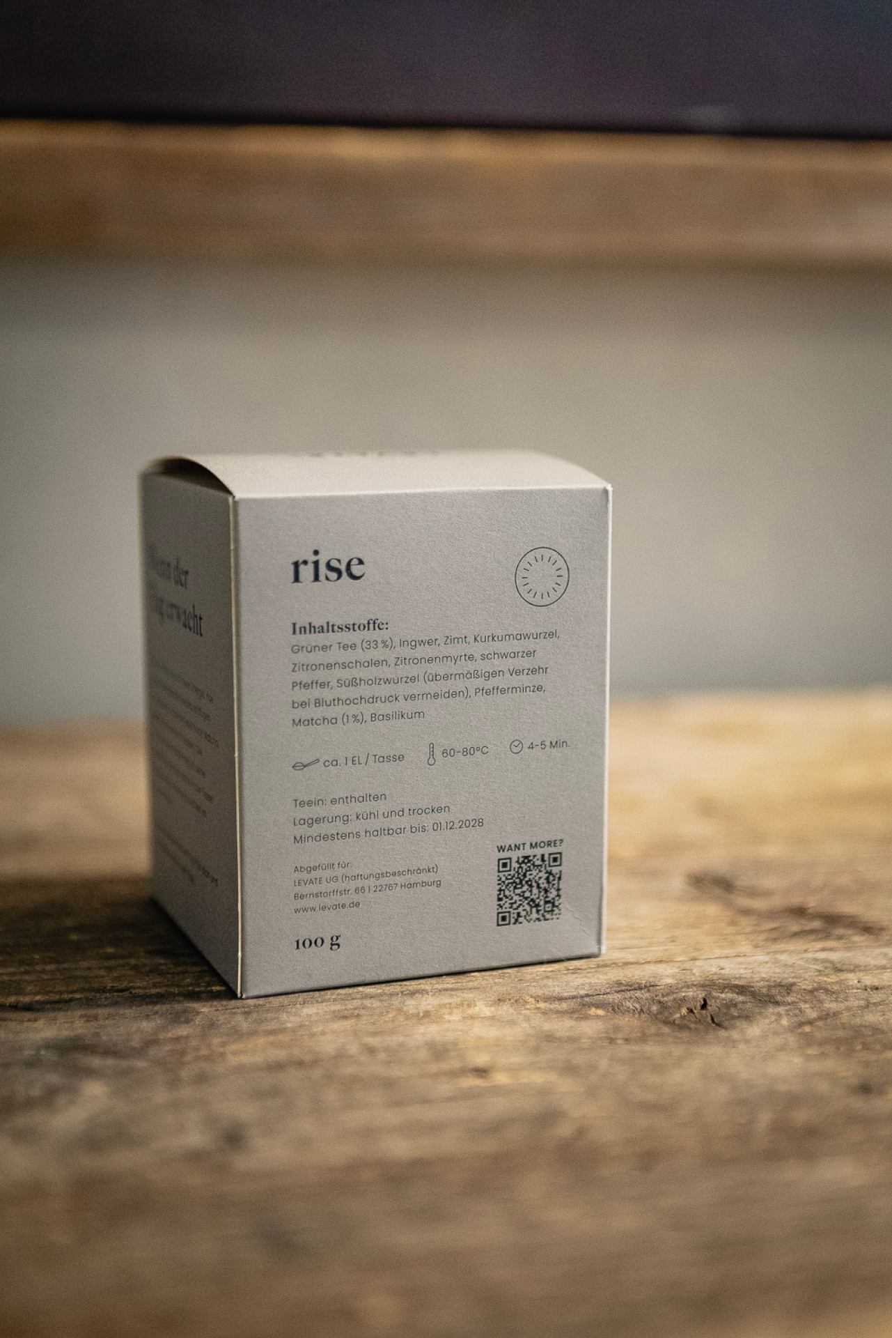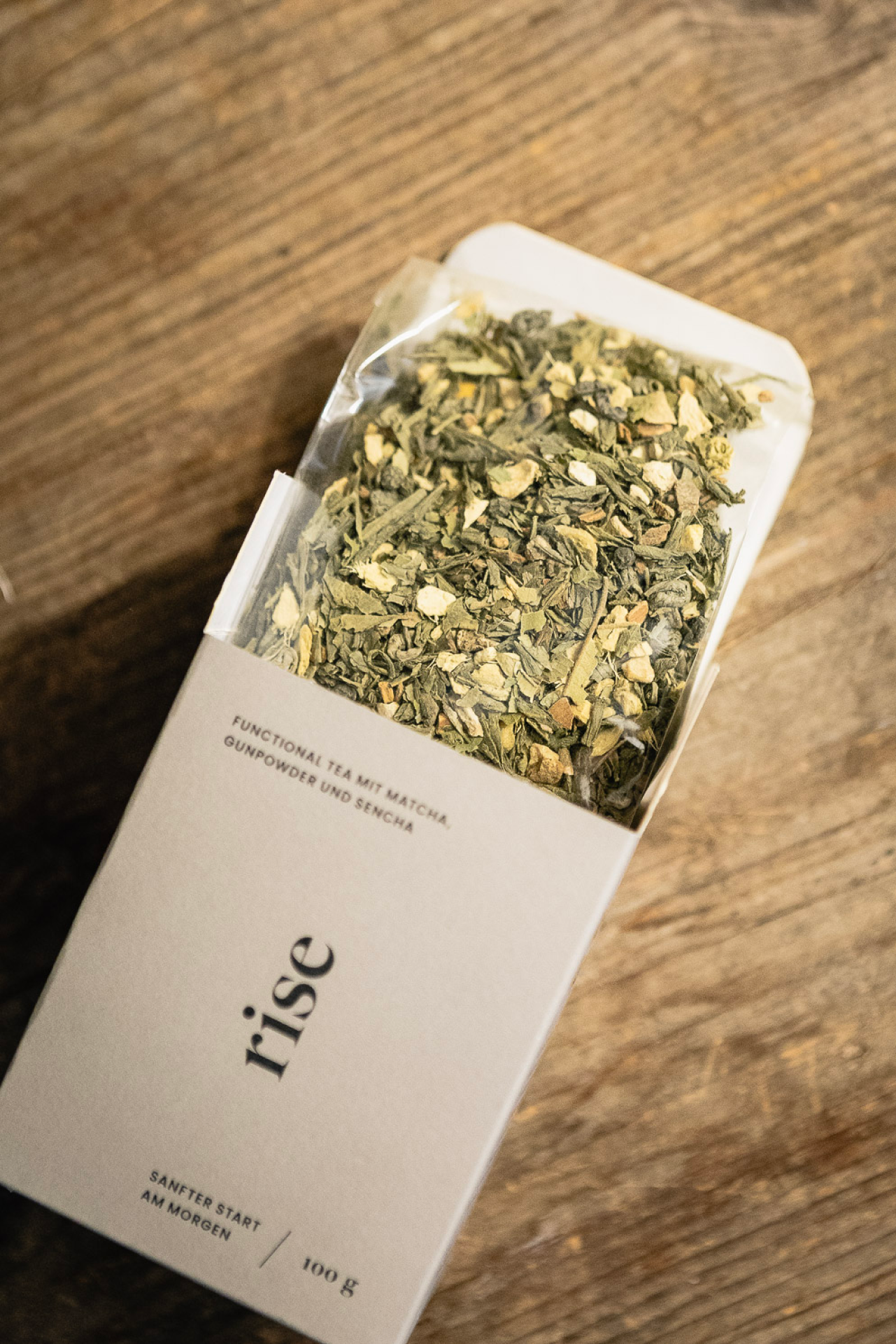 Synergetischer Funktionstee für sanfte Energie am Morgen mit grünem Tee (Sencha, Gunpowder, Matcha), Ingwer, Zimt, Kurkumawurzel, Zitronenschalen, Zitronenmyrte, schwarzer Pfeffer, Süßholzwurzel, Pfefferminze, Basilikum.