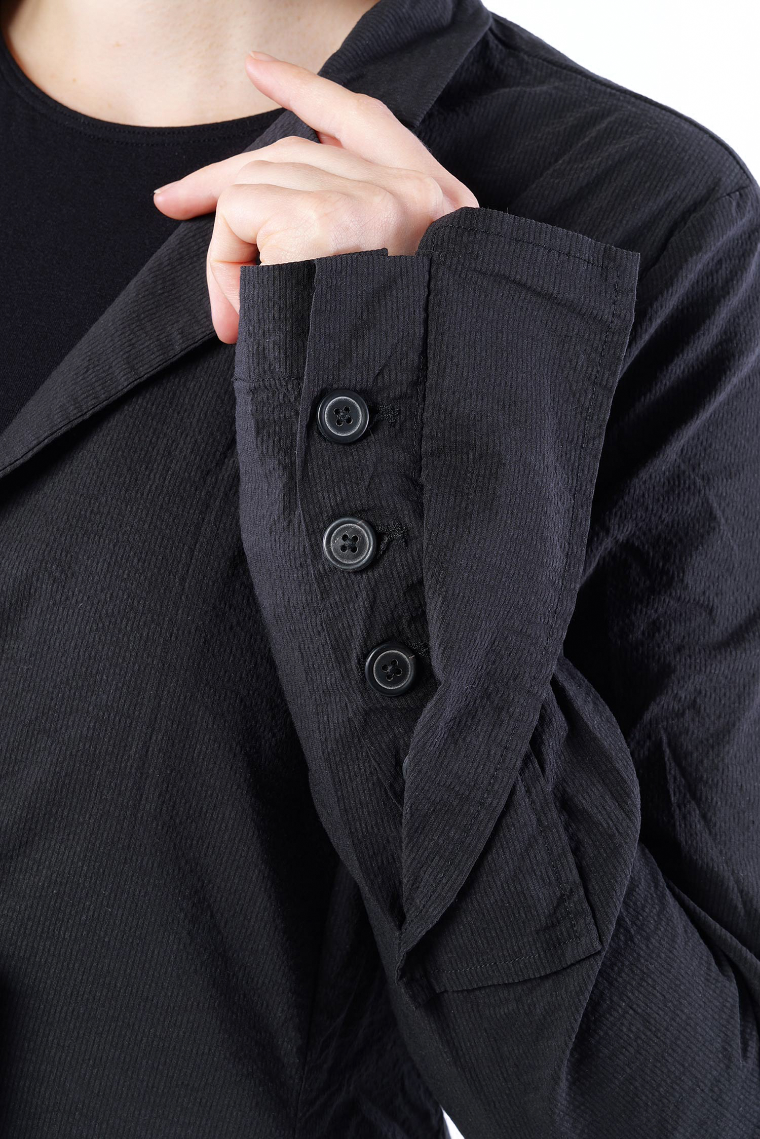 Details: - Reverskragen - Mit einem Knopf schließbar - Aufgenähte Applikation am Ärmel - Ärmel mit Schlitz und verdeckter Knofleiste - Tulpiger Schnitt - Superelastisches Material mit Struktur - Große aufwendige Taschen vorne - Versäuberte Kanten