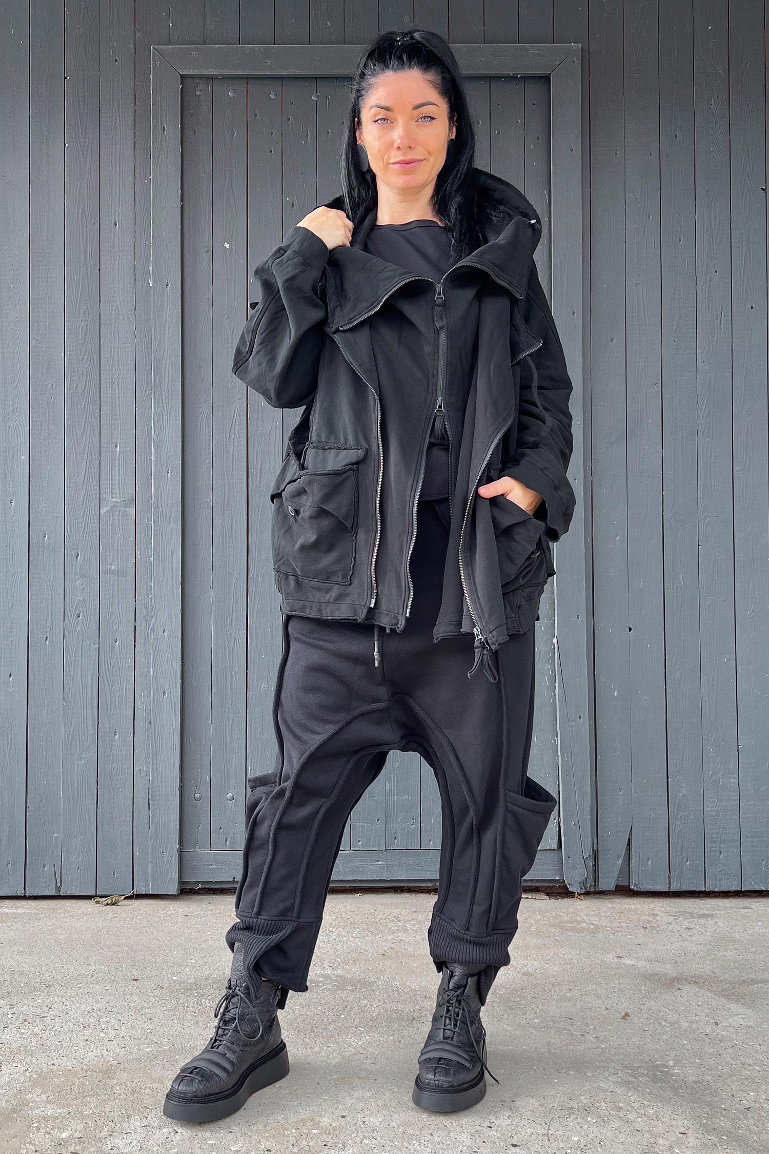 - Saum asymmetrisch lang, teilweise offene Kanten