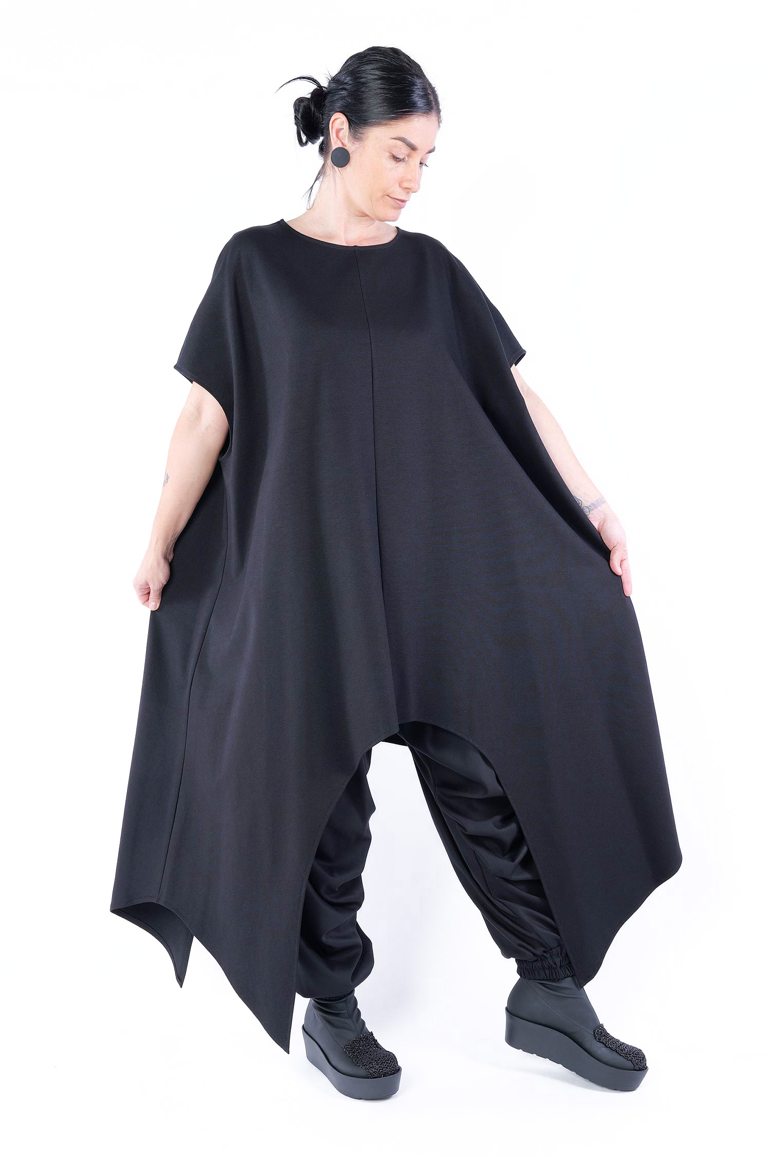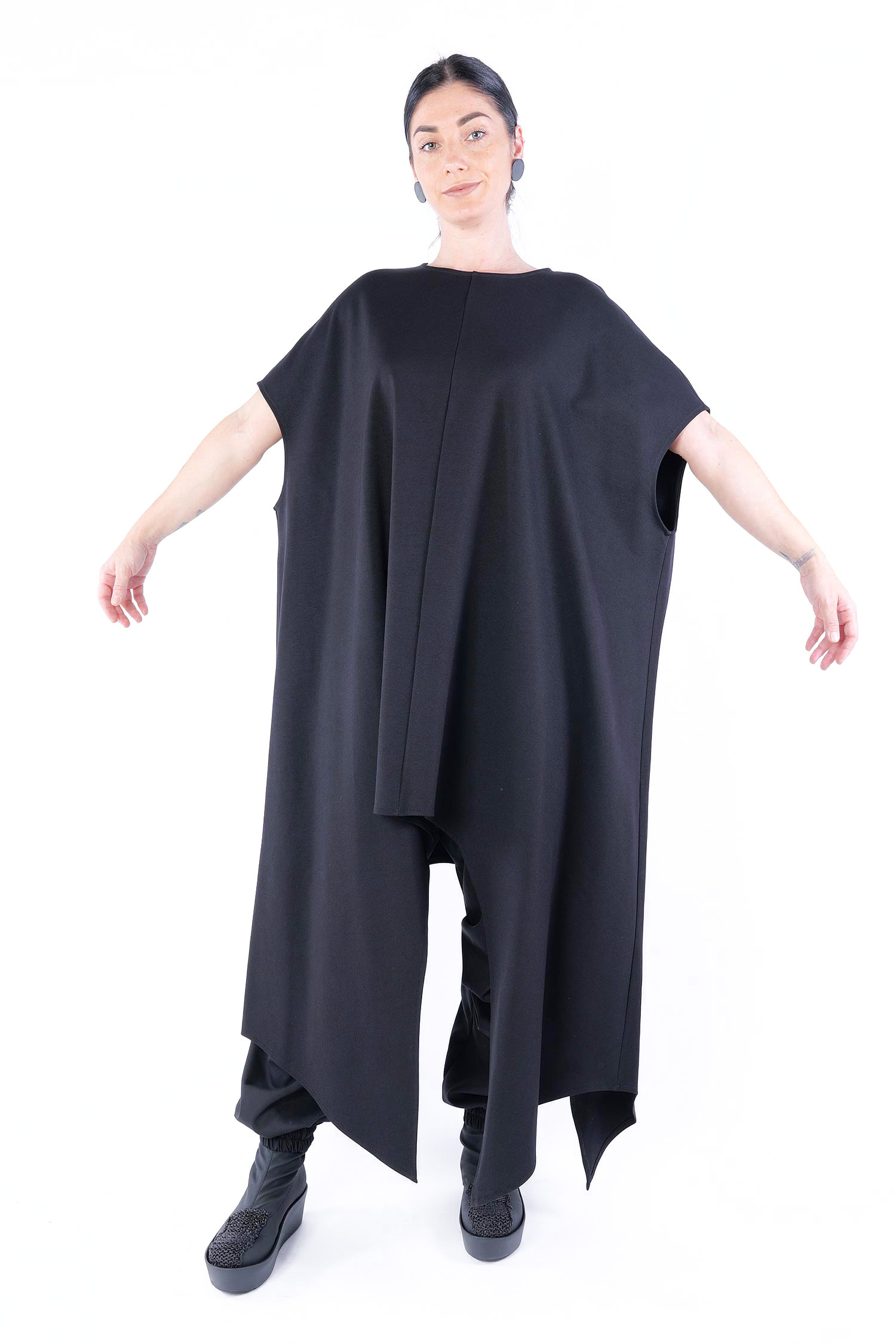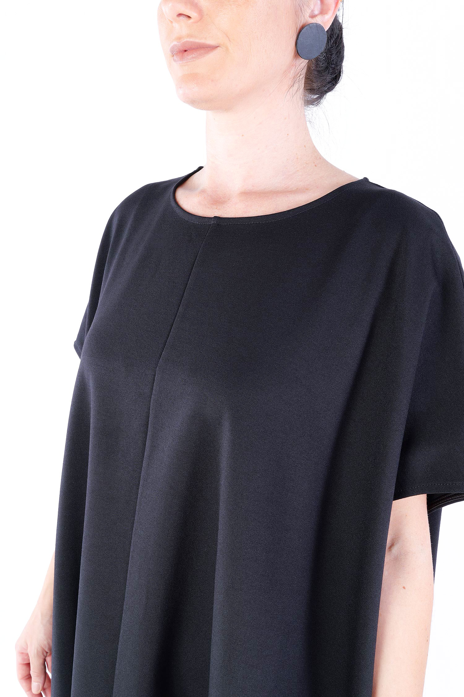 Details: - Asymmetrical cut, longer at the side - Short sleeves, therefor extended shoulder - Oversize cut - Round neck - Decorative seam at central front and back side - Trimmed edges - Thicker and smooth sweat material
