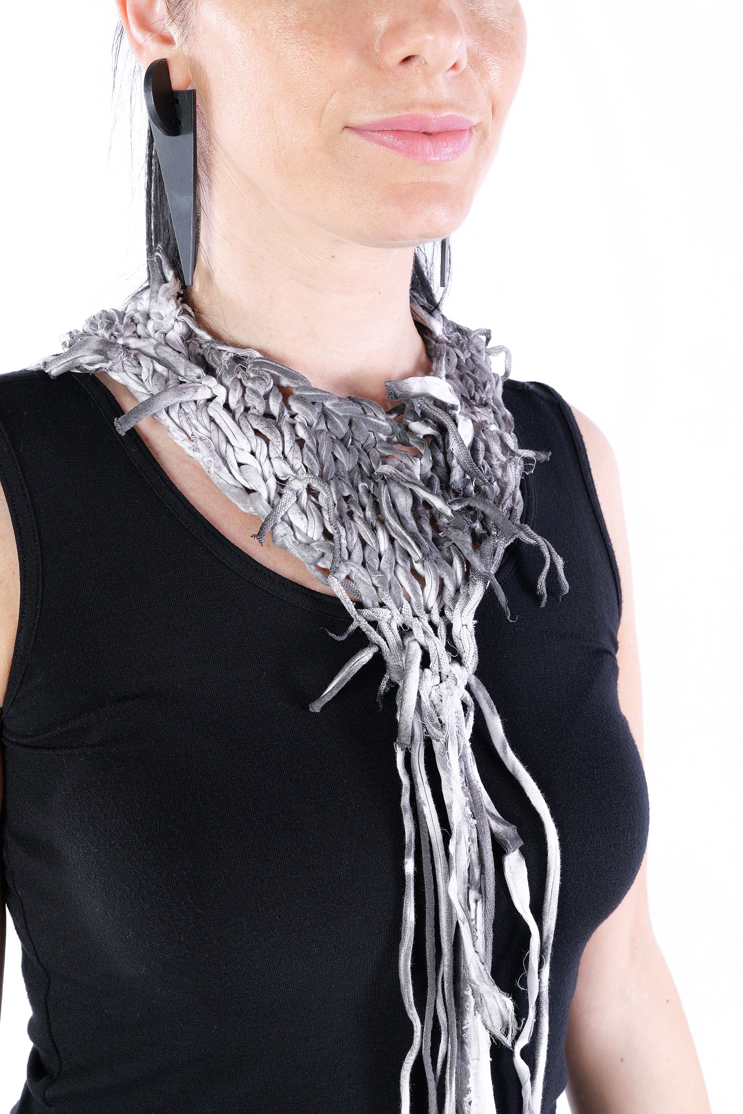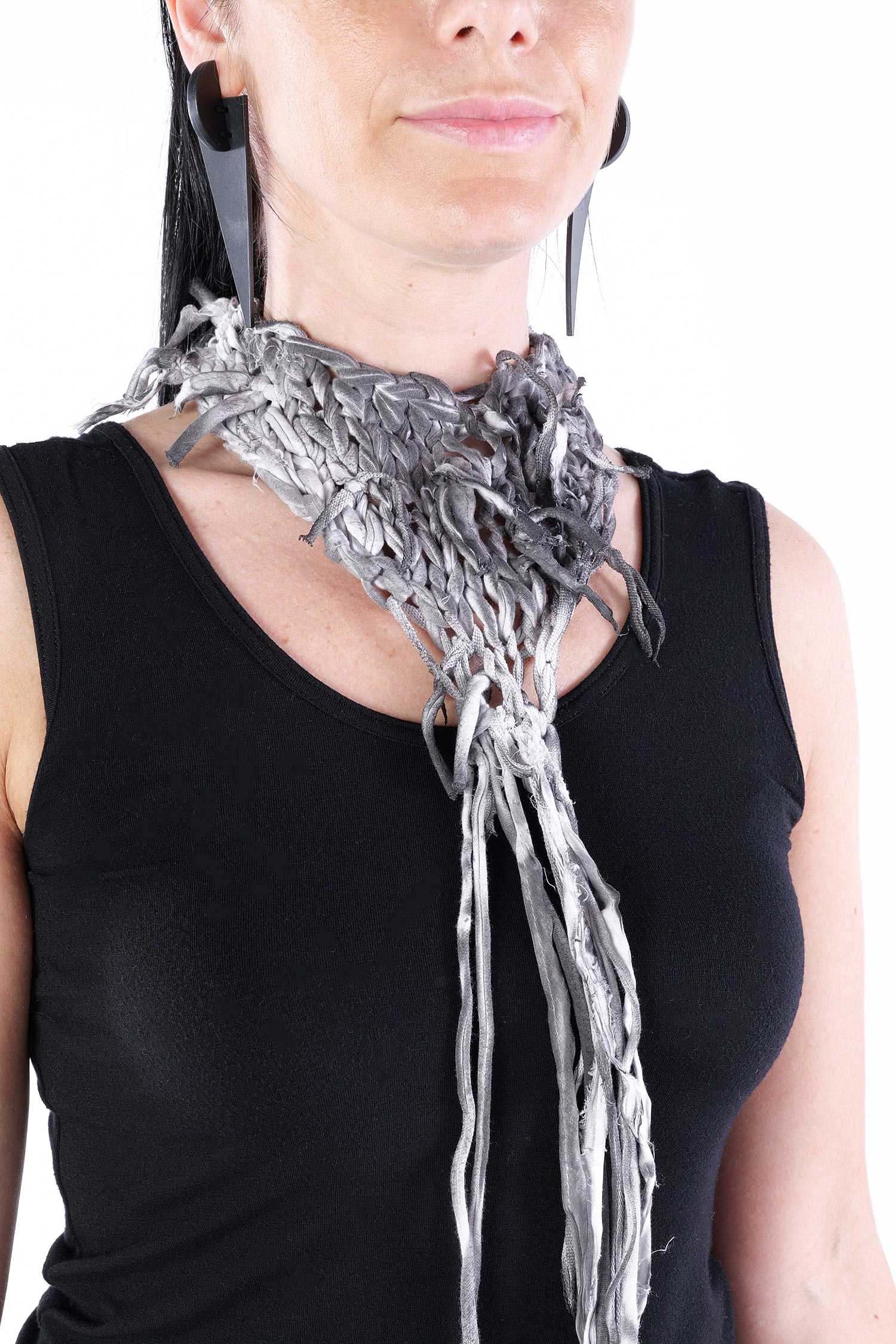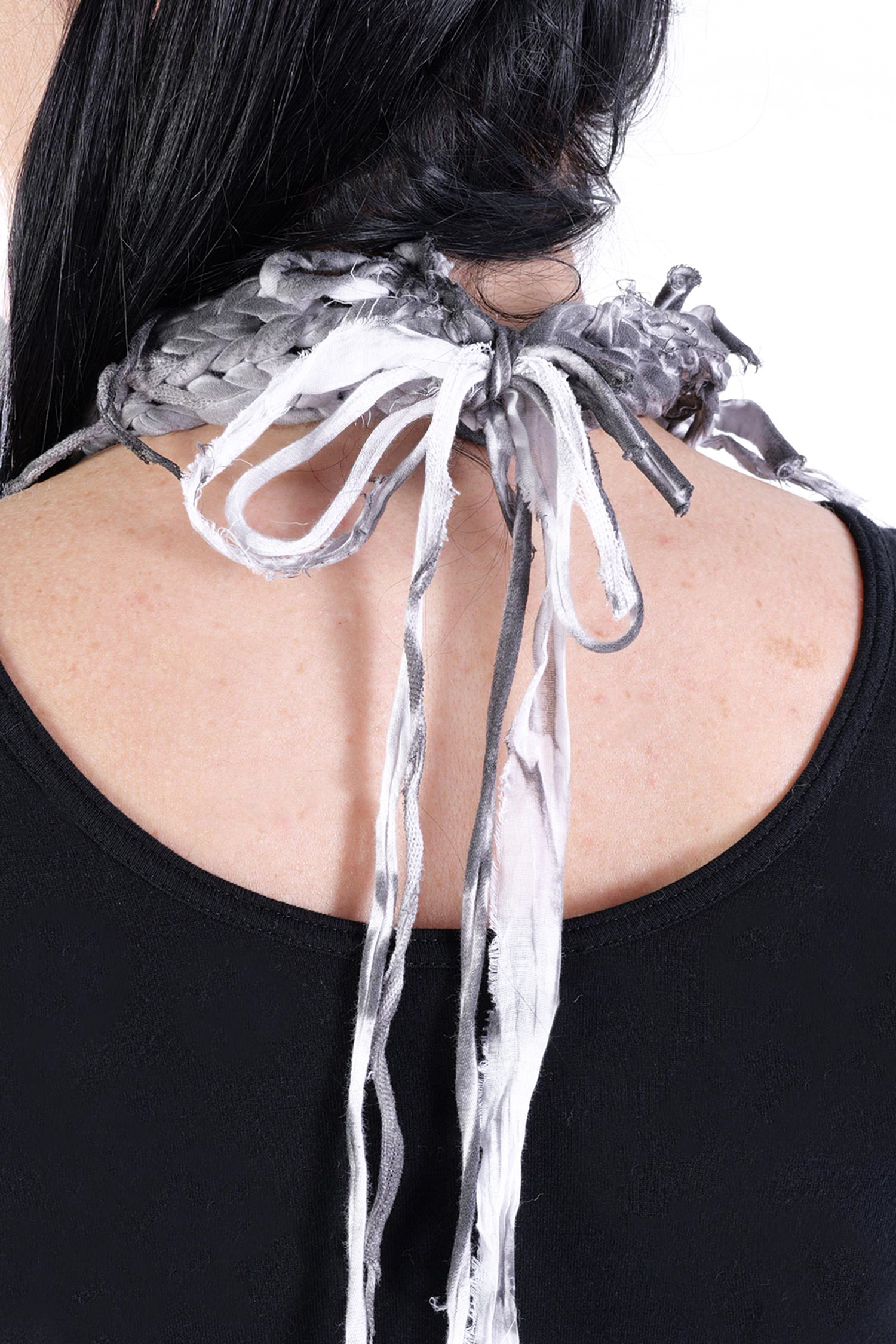 Details: - Hand-knitted - Stitches of different size - Strings of different length - Every item is unique - Tied at the back (adjustable) - Tulle details