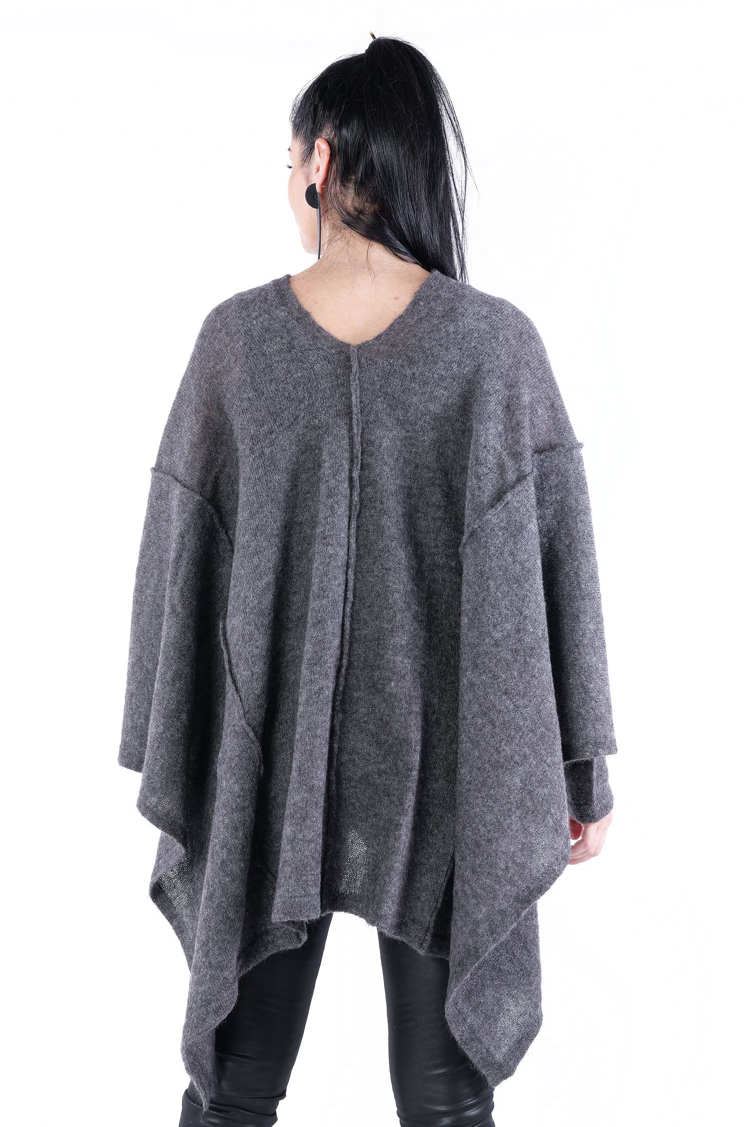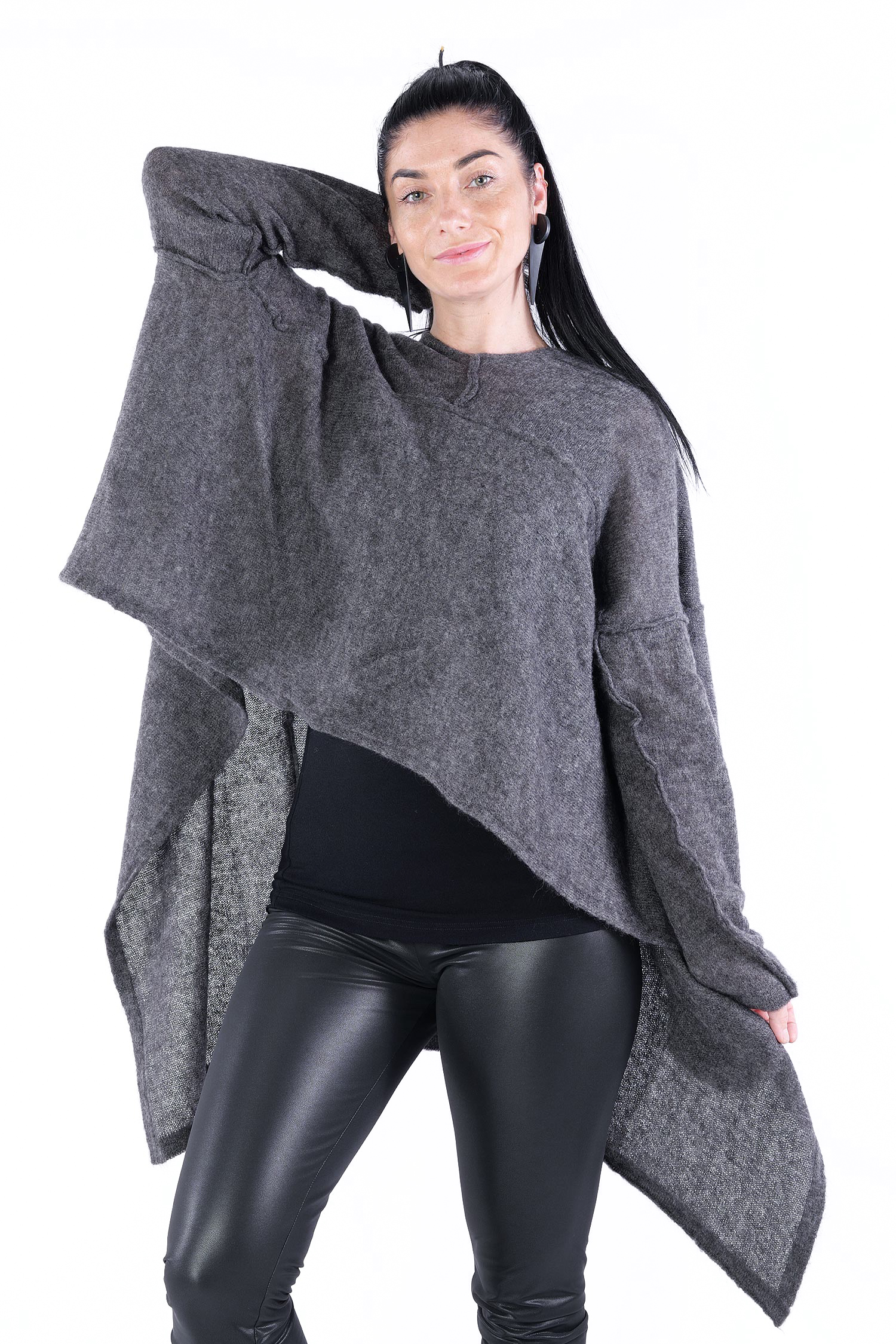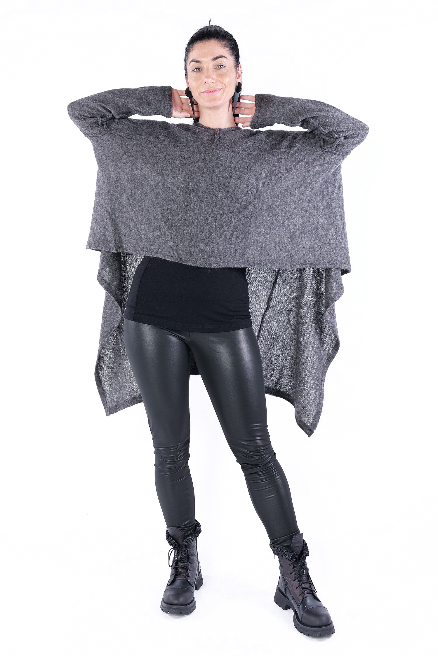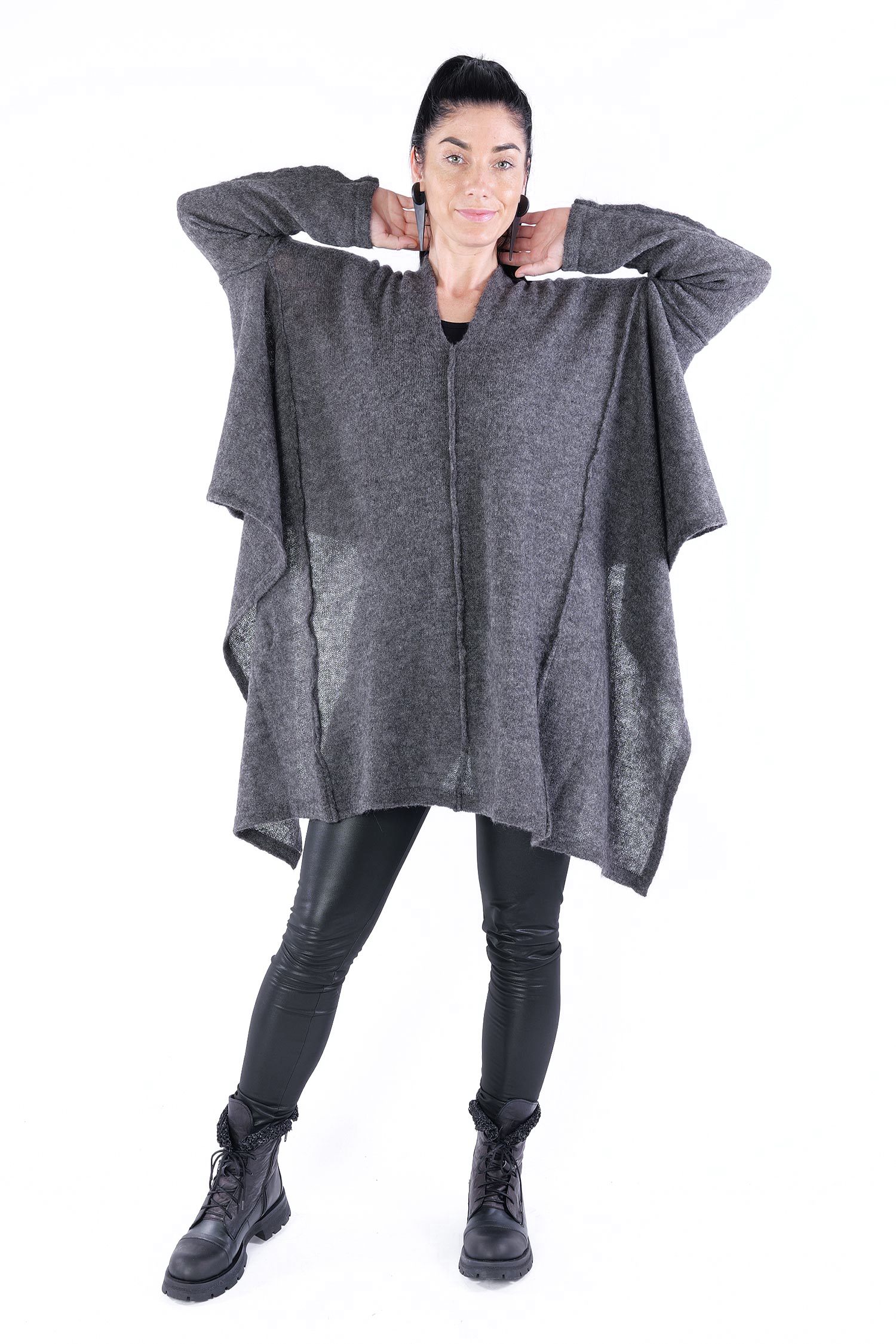 - Can be worn as a voluminous tunic or coat (if you do not put your head through neckline it can be worn as a knit coat, the neckline is located at the upper back then)