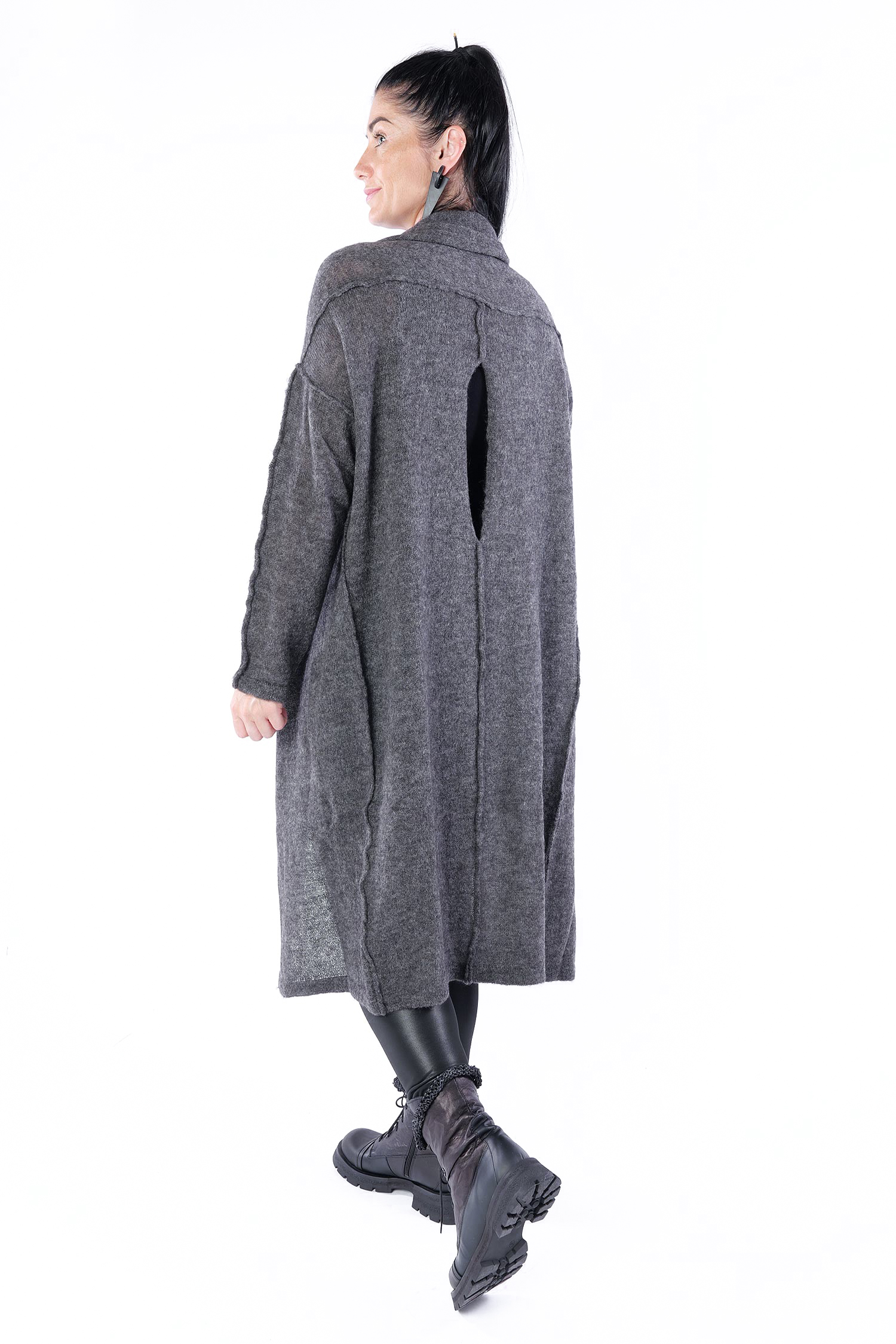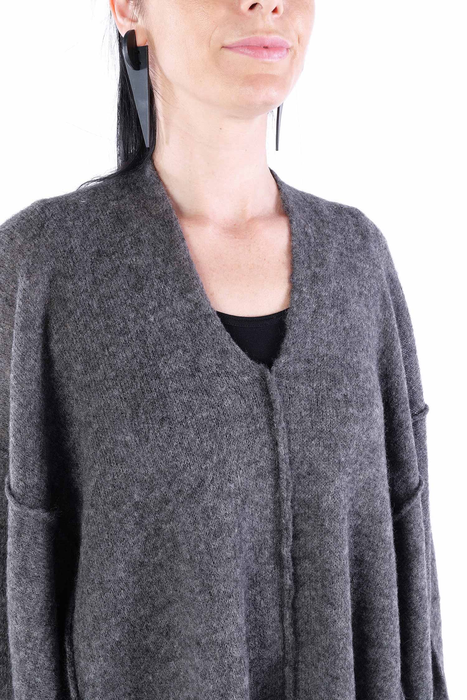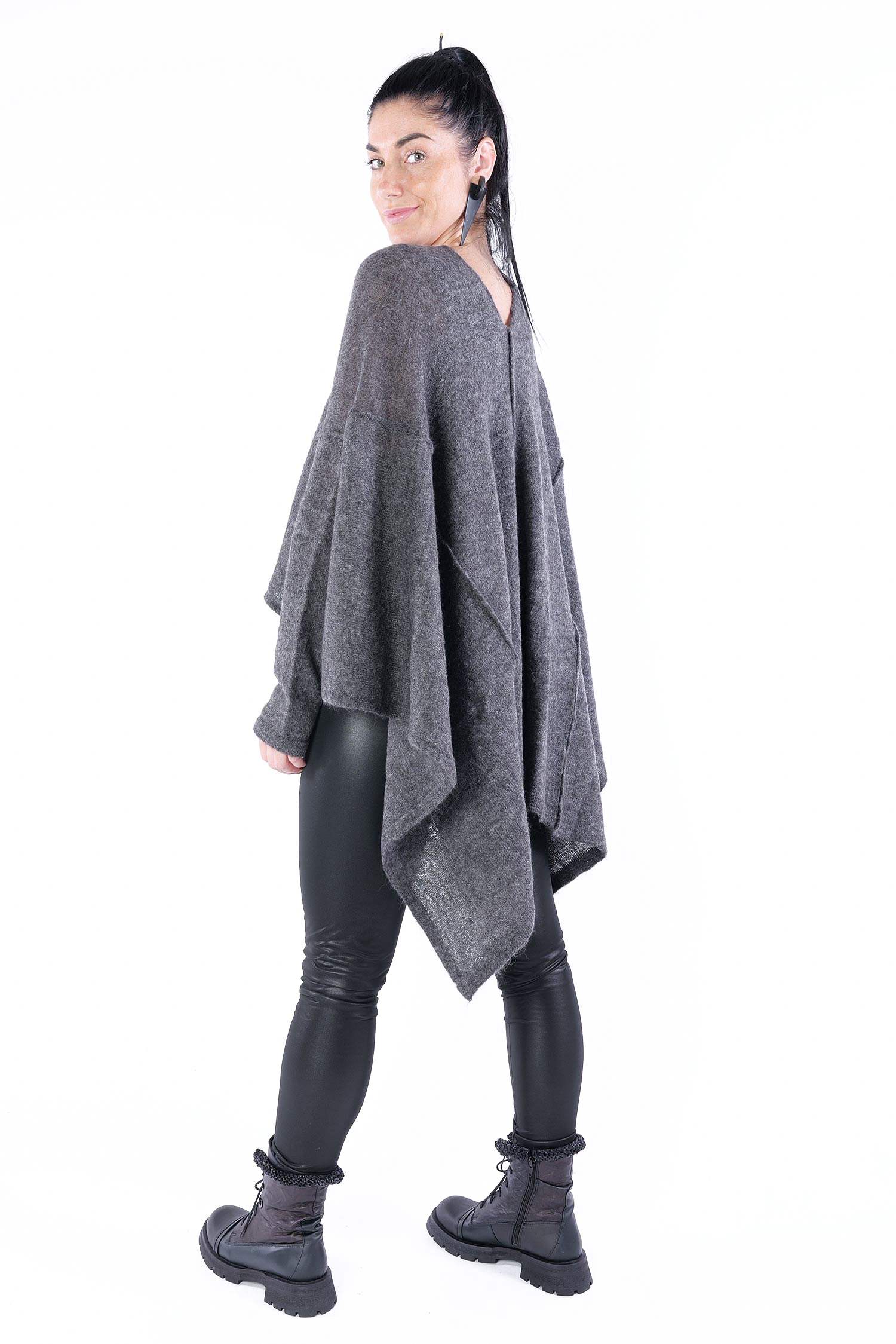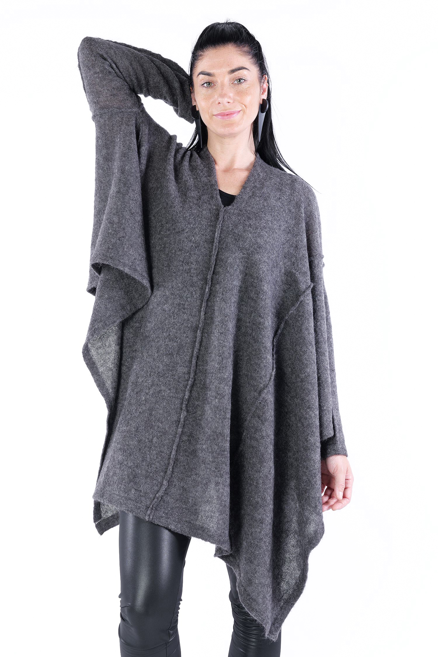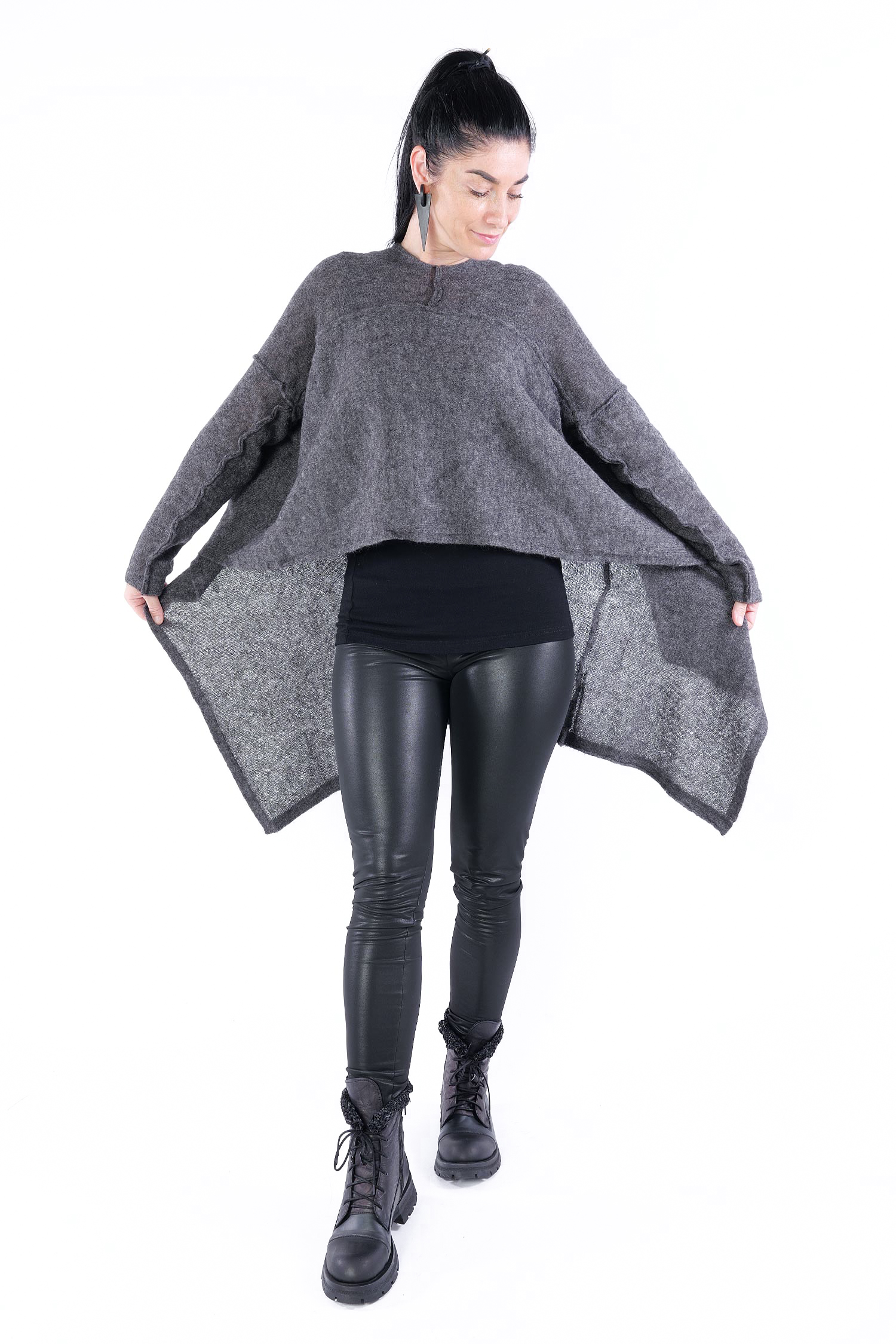 - Can be worn as a voluminous tunic or coat (if you do not put your head through neckline it can be worn as a knit coat, the neckline is located at the upper back then)