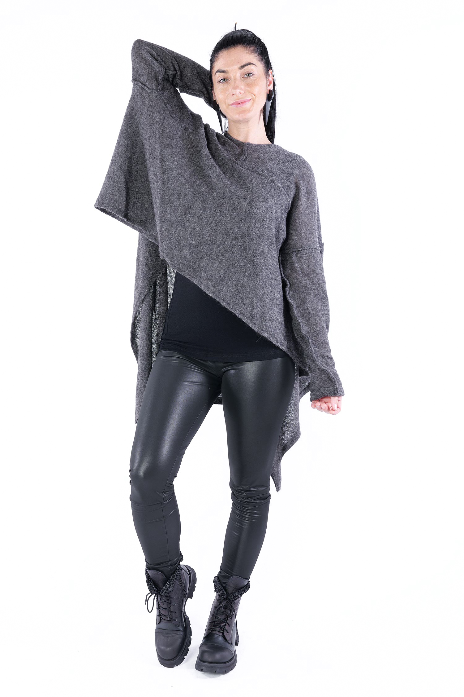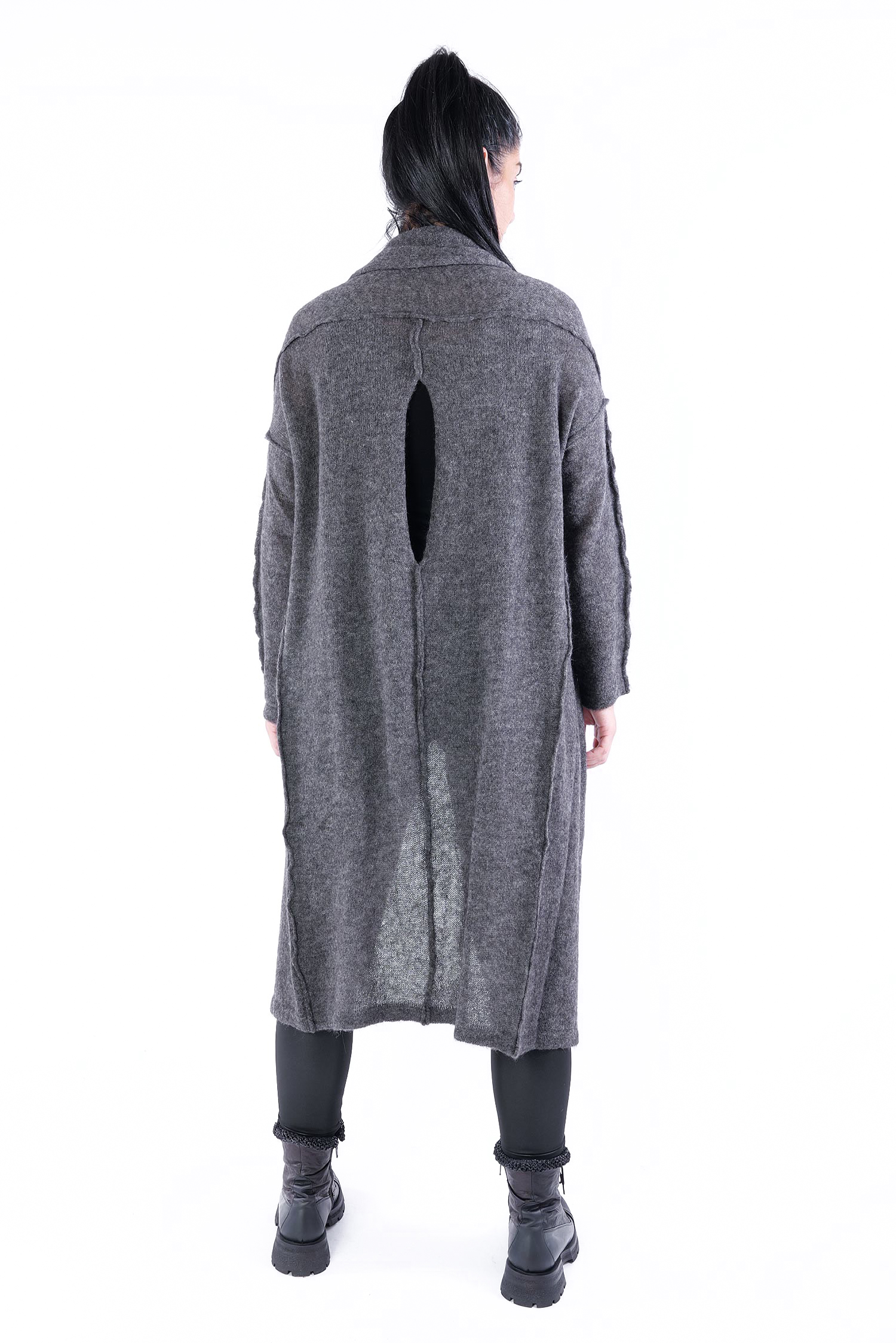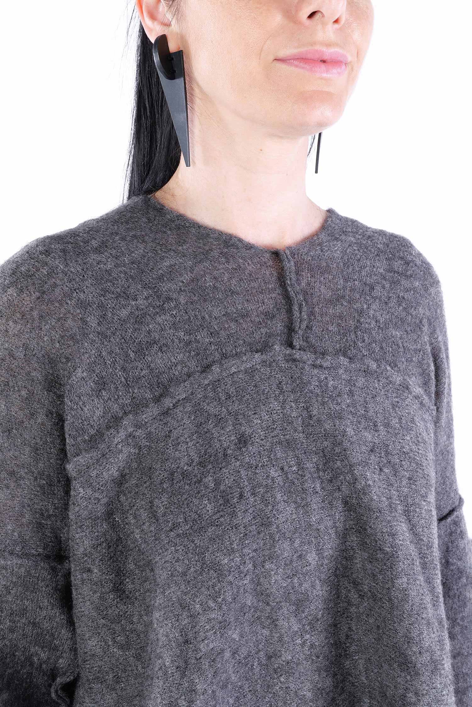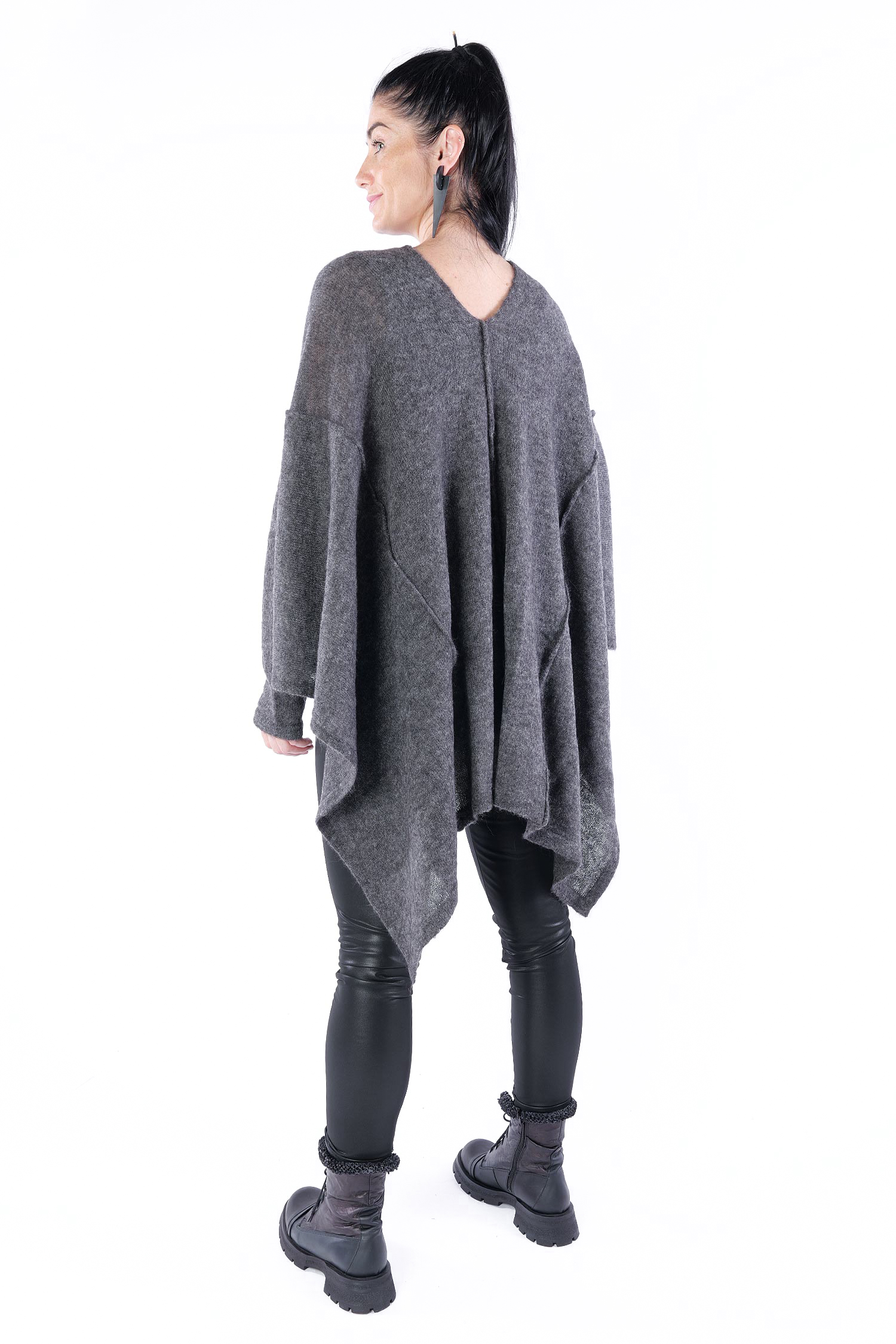 - Can be worn as a voluminous tunic or coat (if you do not put your head through neckline it can be worn as a knit coat, the neckline is located at the upper back then)