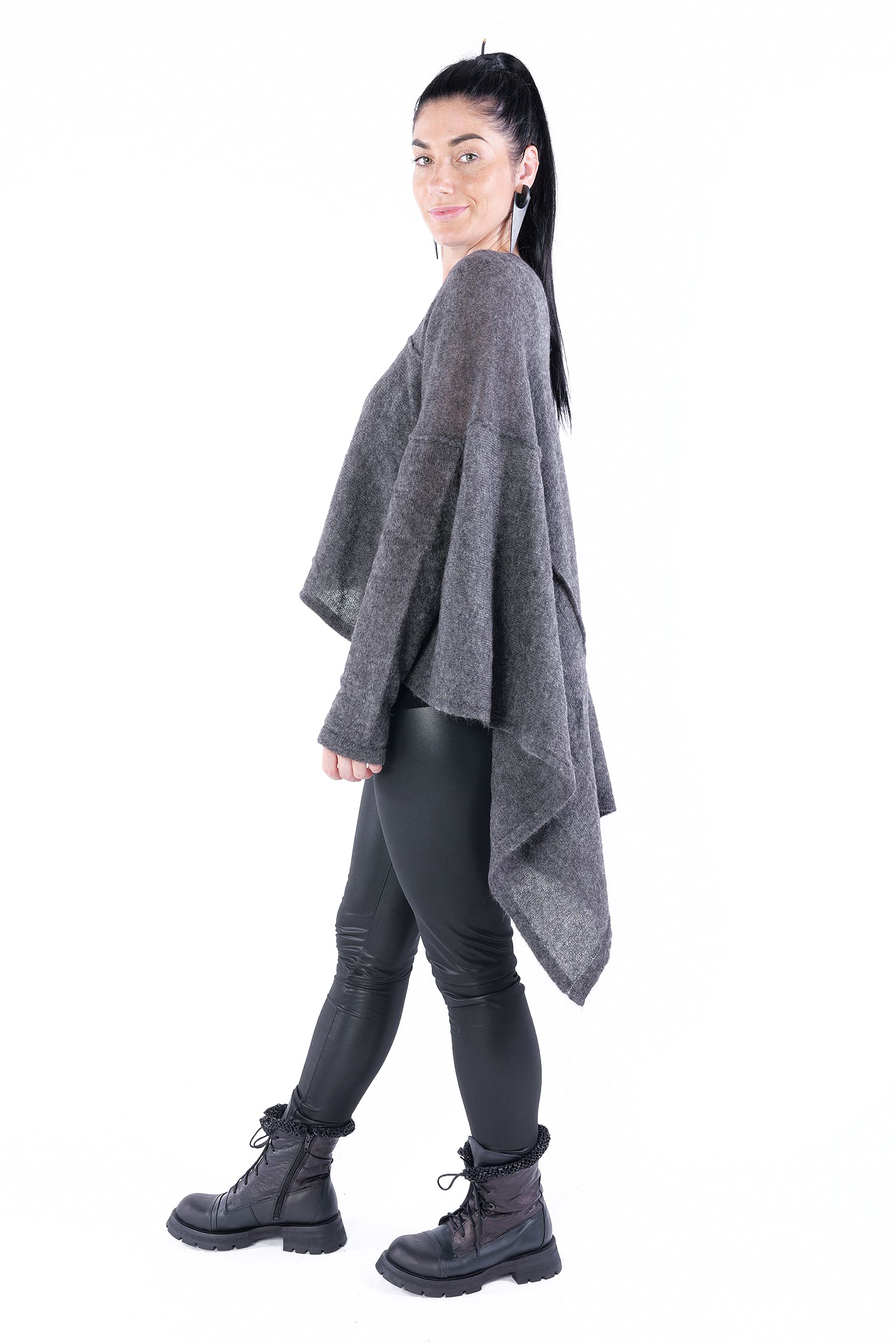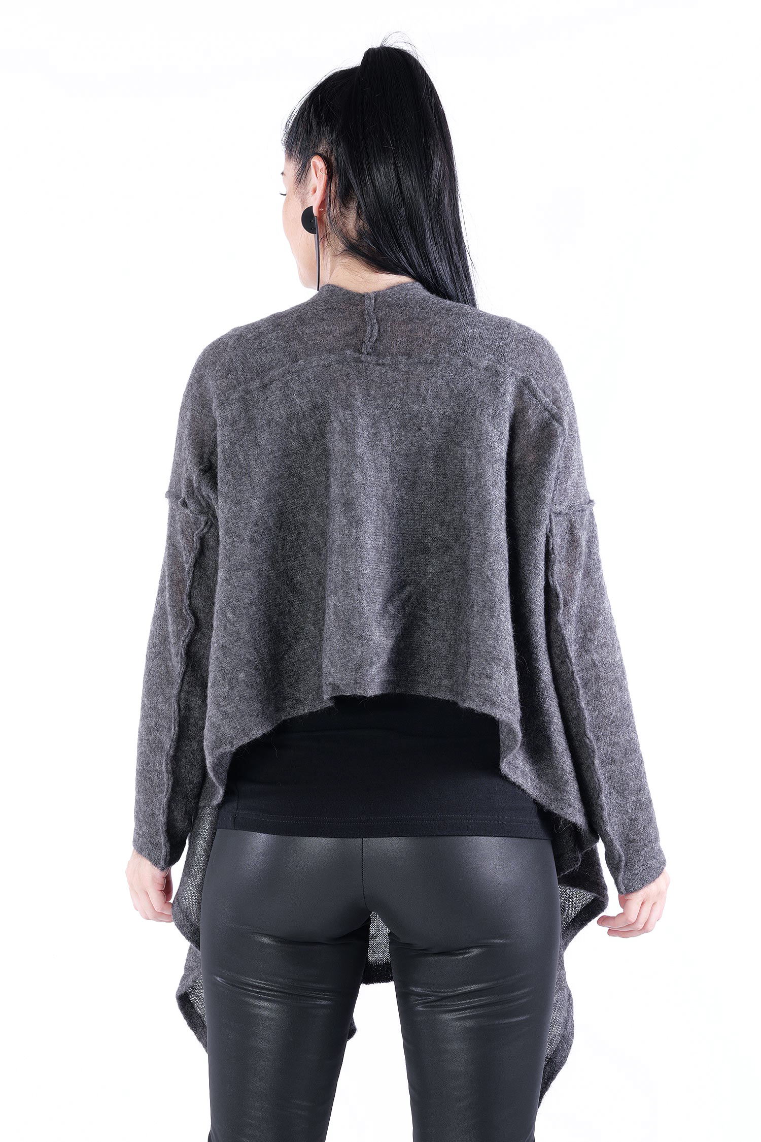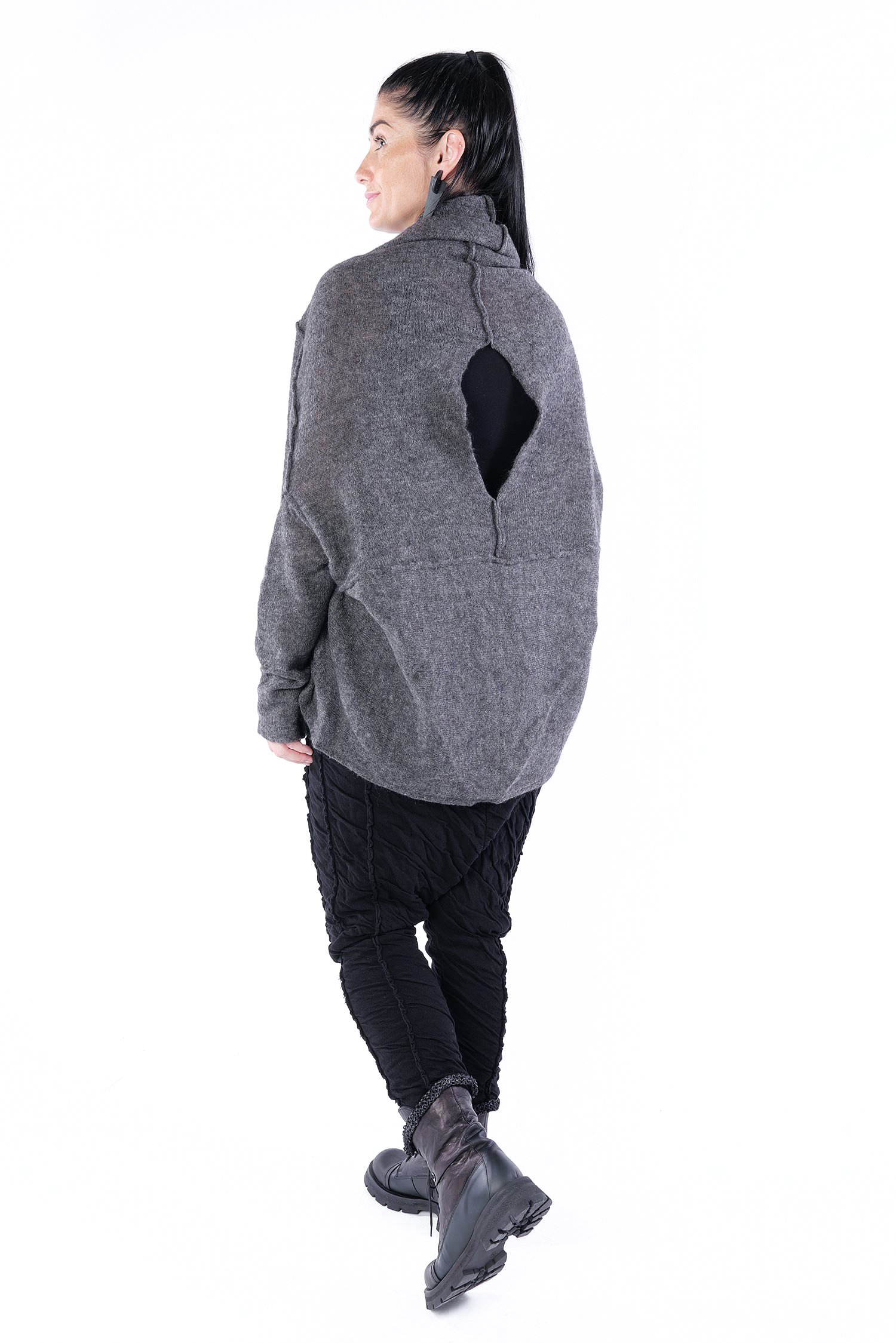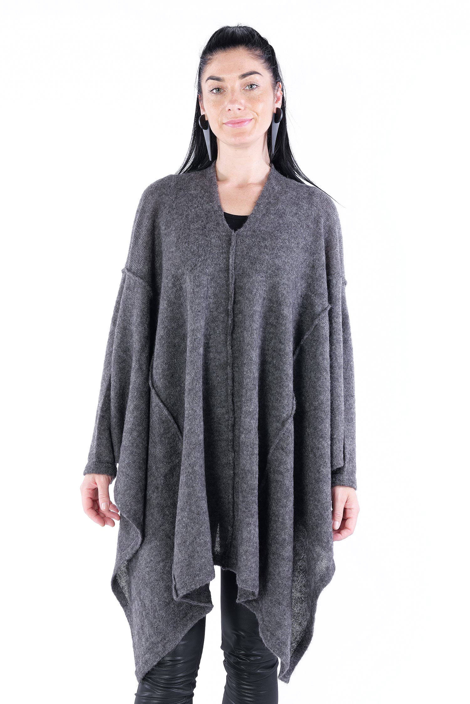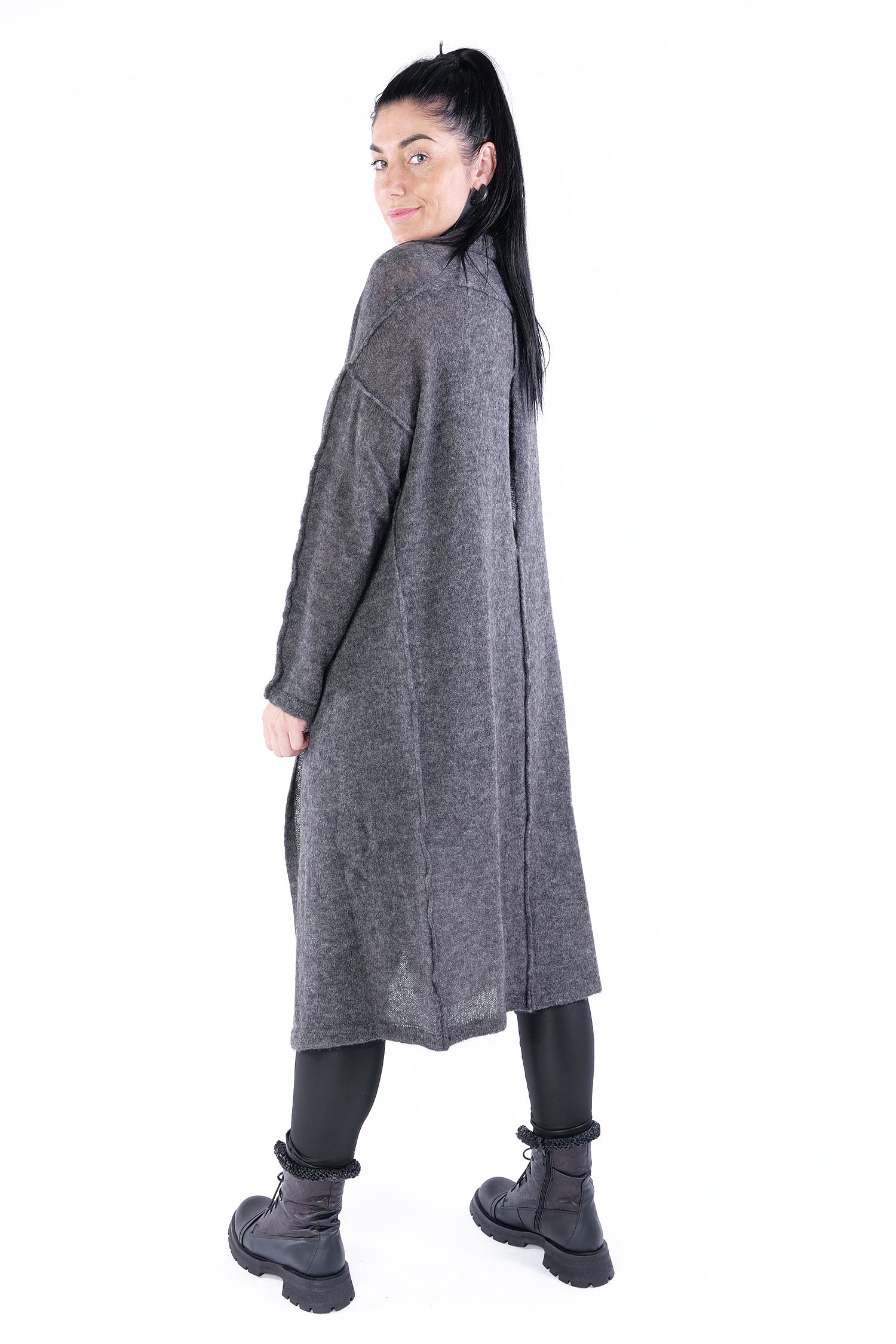 - Can be worn as a voluminous tunic or coat (if you do not put your head through neckline it can be worn as a knit coat, the neckline is located at the upper back then)