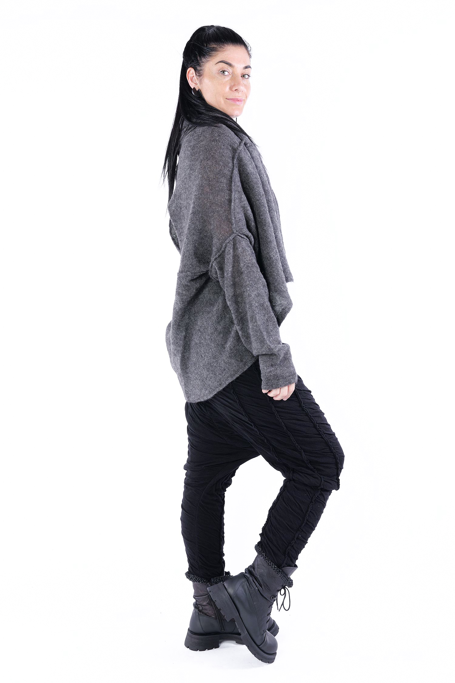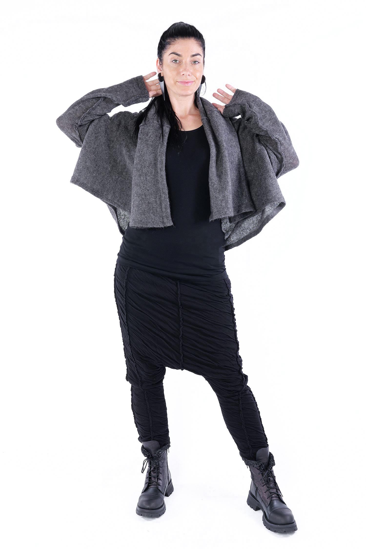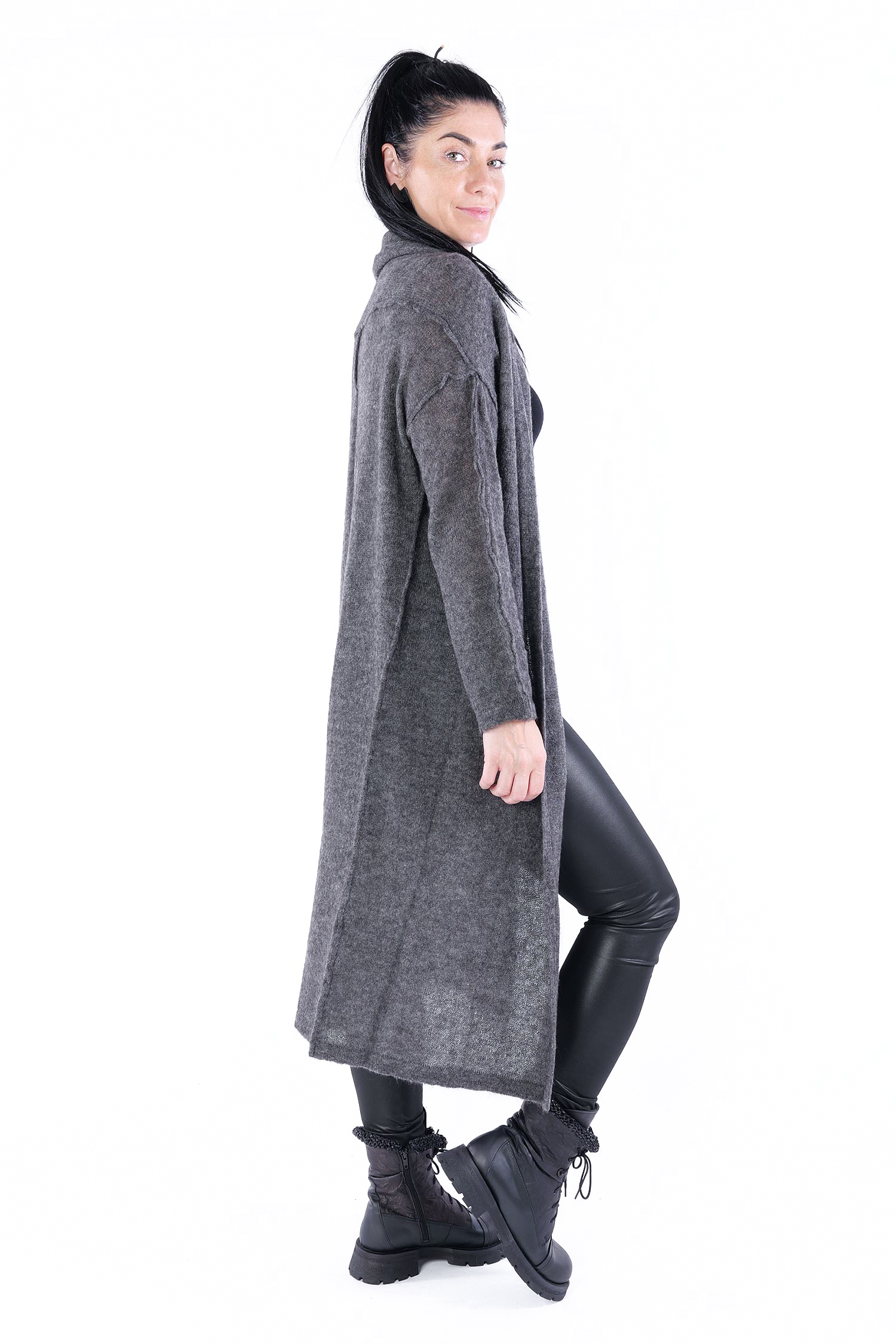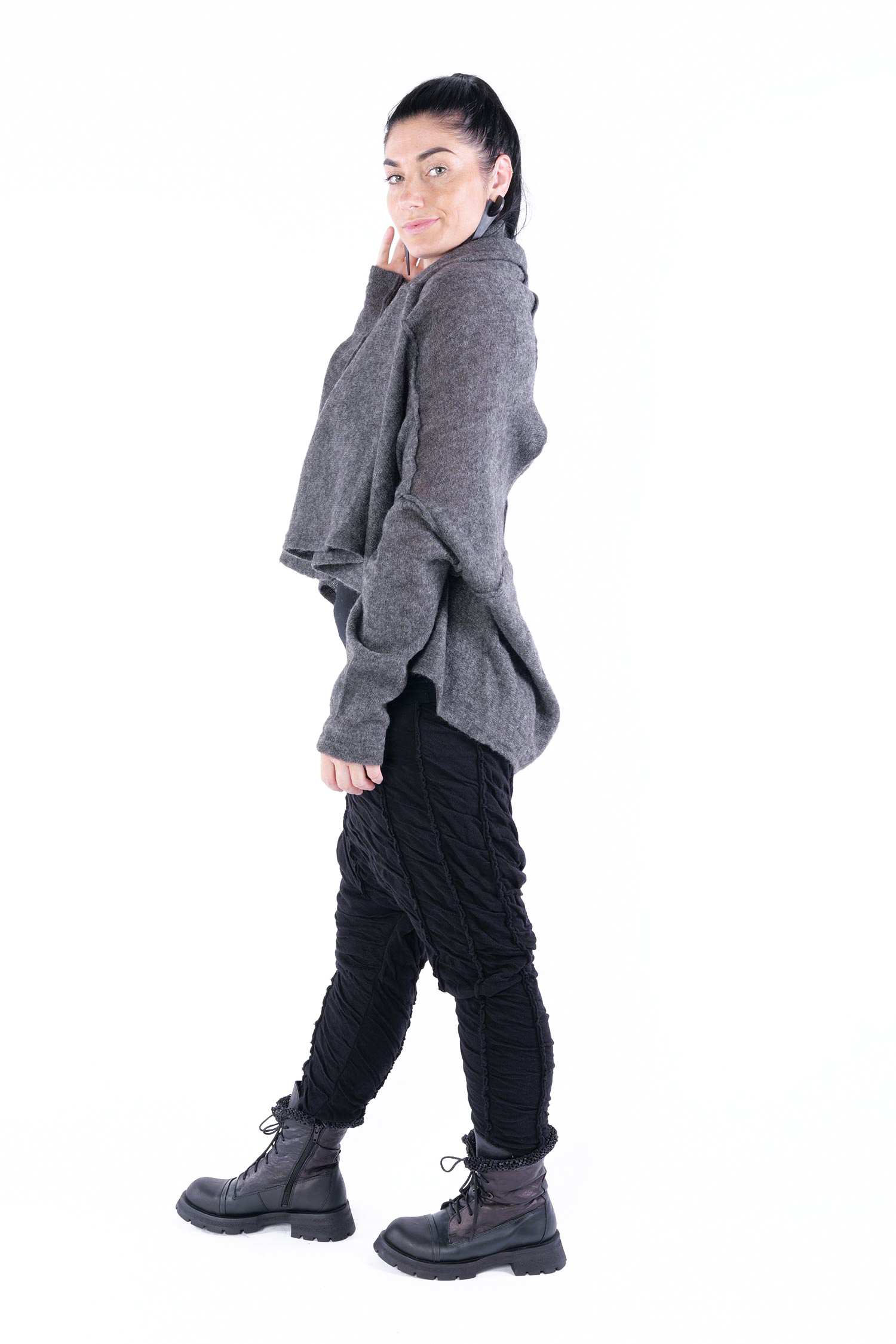 - Can be worn as a voluminous tunic or coat (if you do not put your head through neckline it can be worn as a knit coat, the neckline is located at the upper back then)
