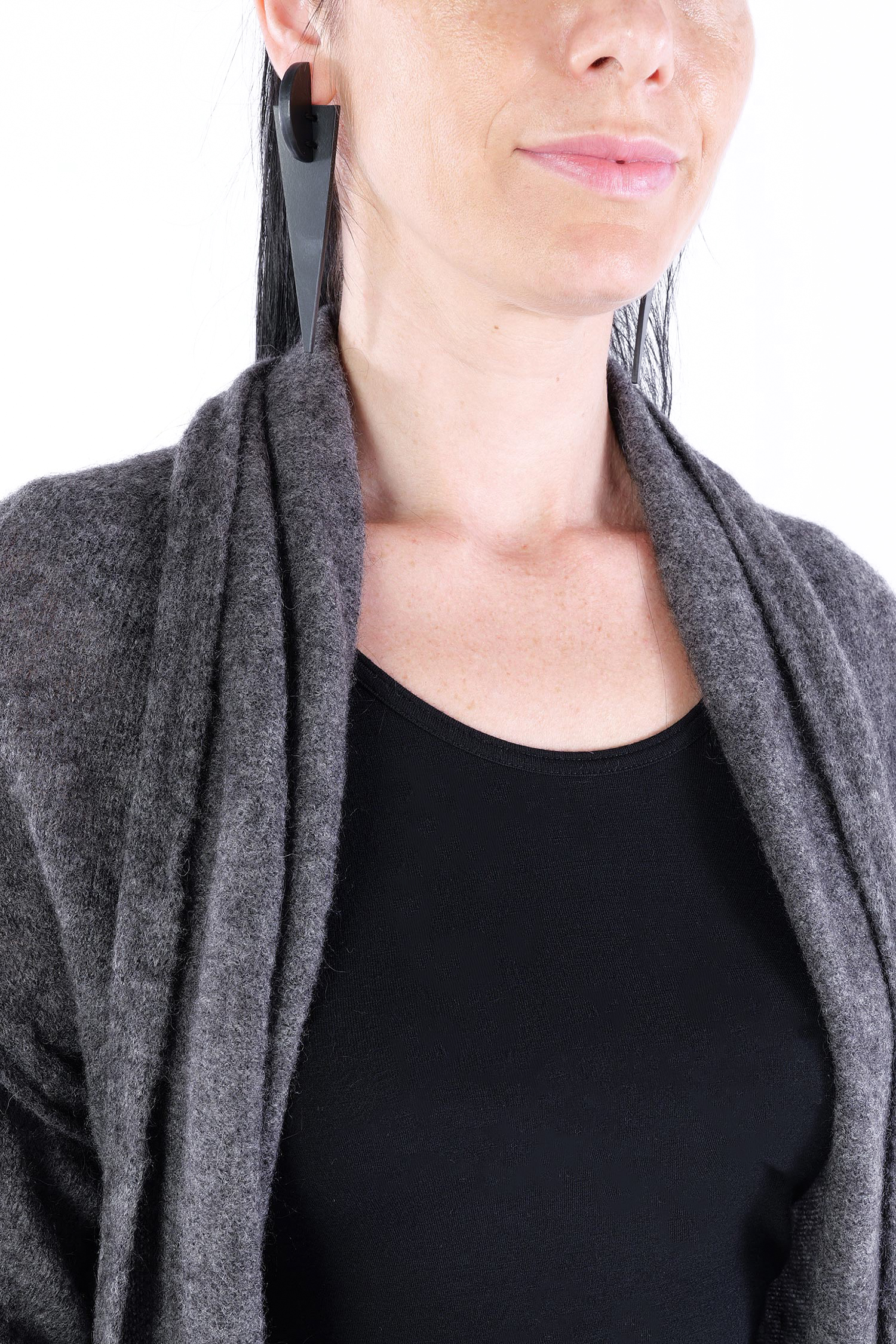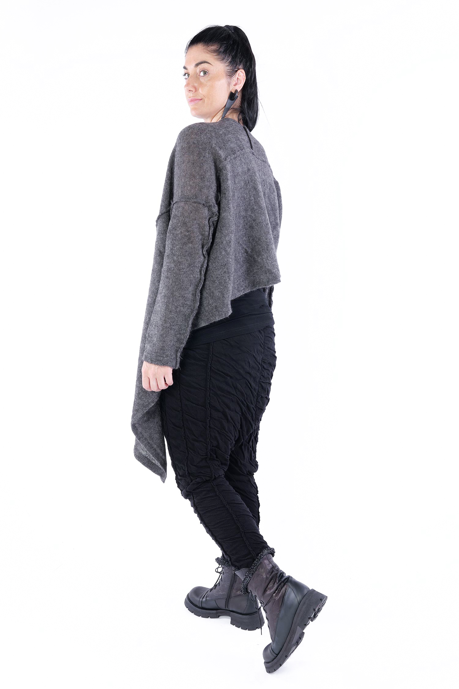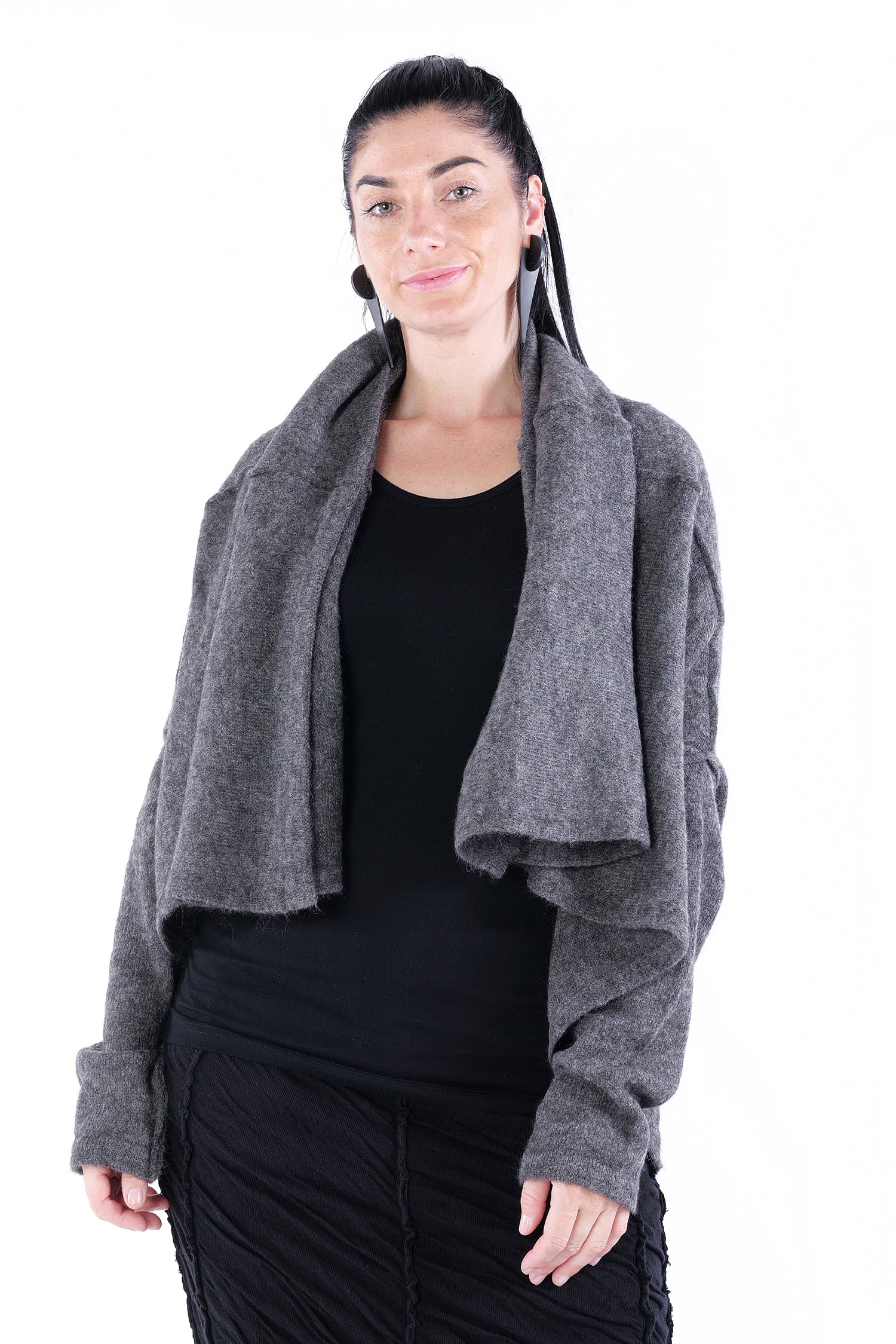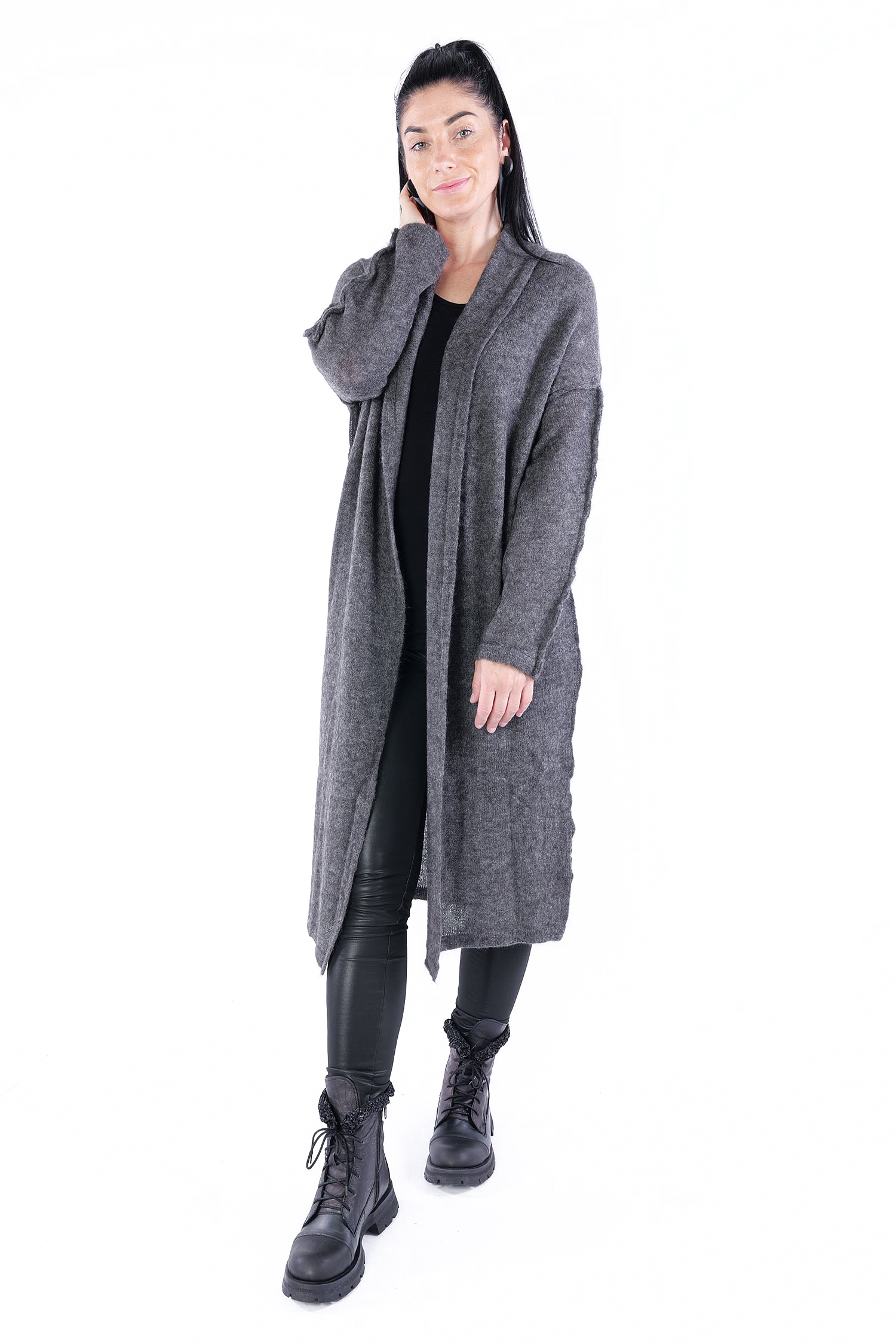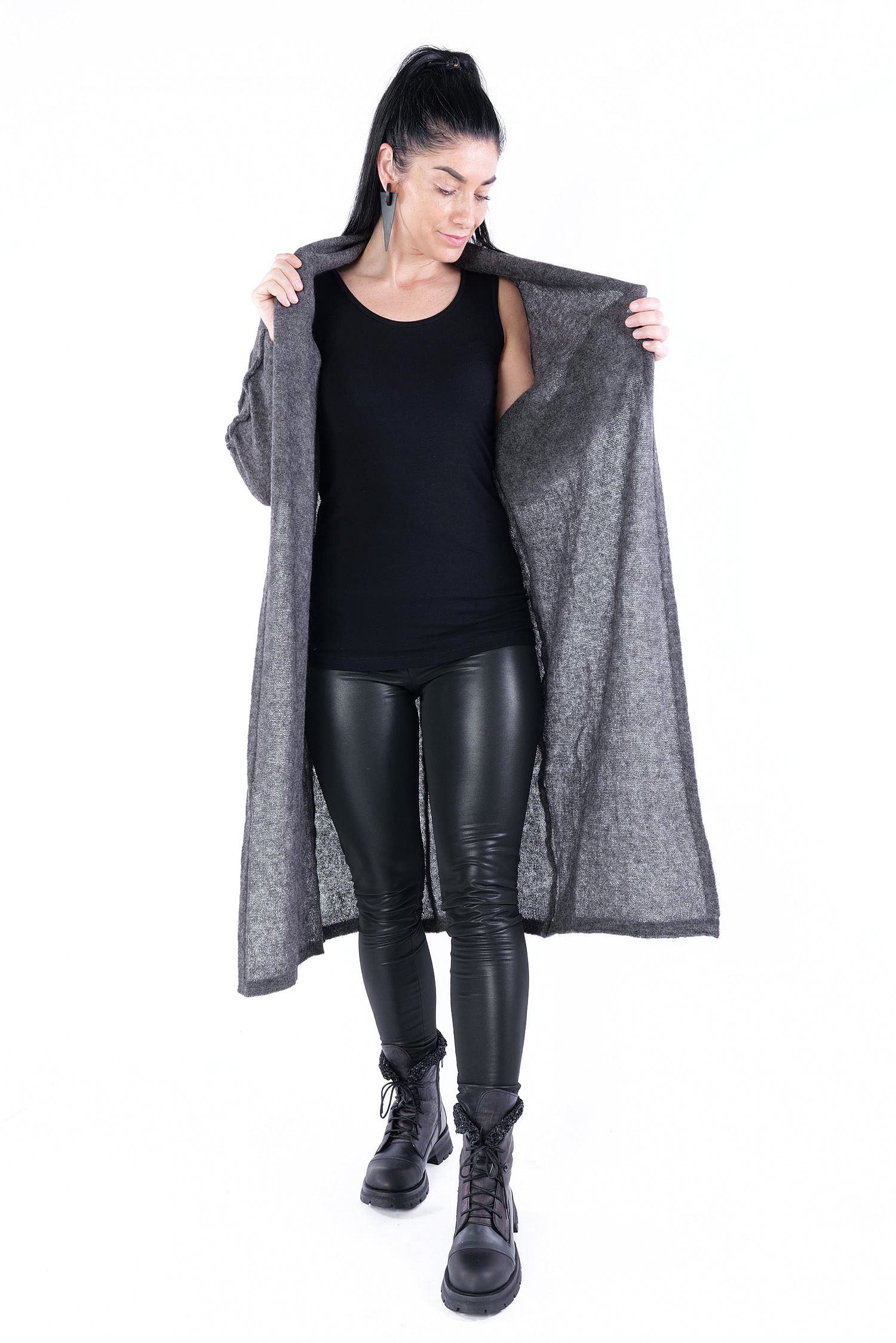 - Can be worn as a voluminous tunic or coat (if you do not put your head through neckline it can be worn as a knit coat, the neckline is located at the upper back then)