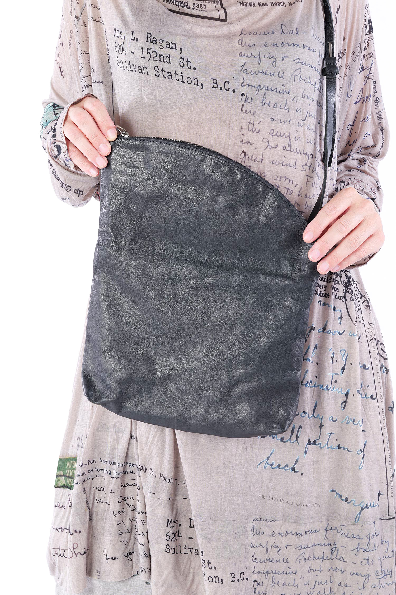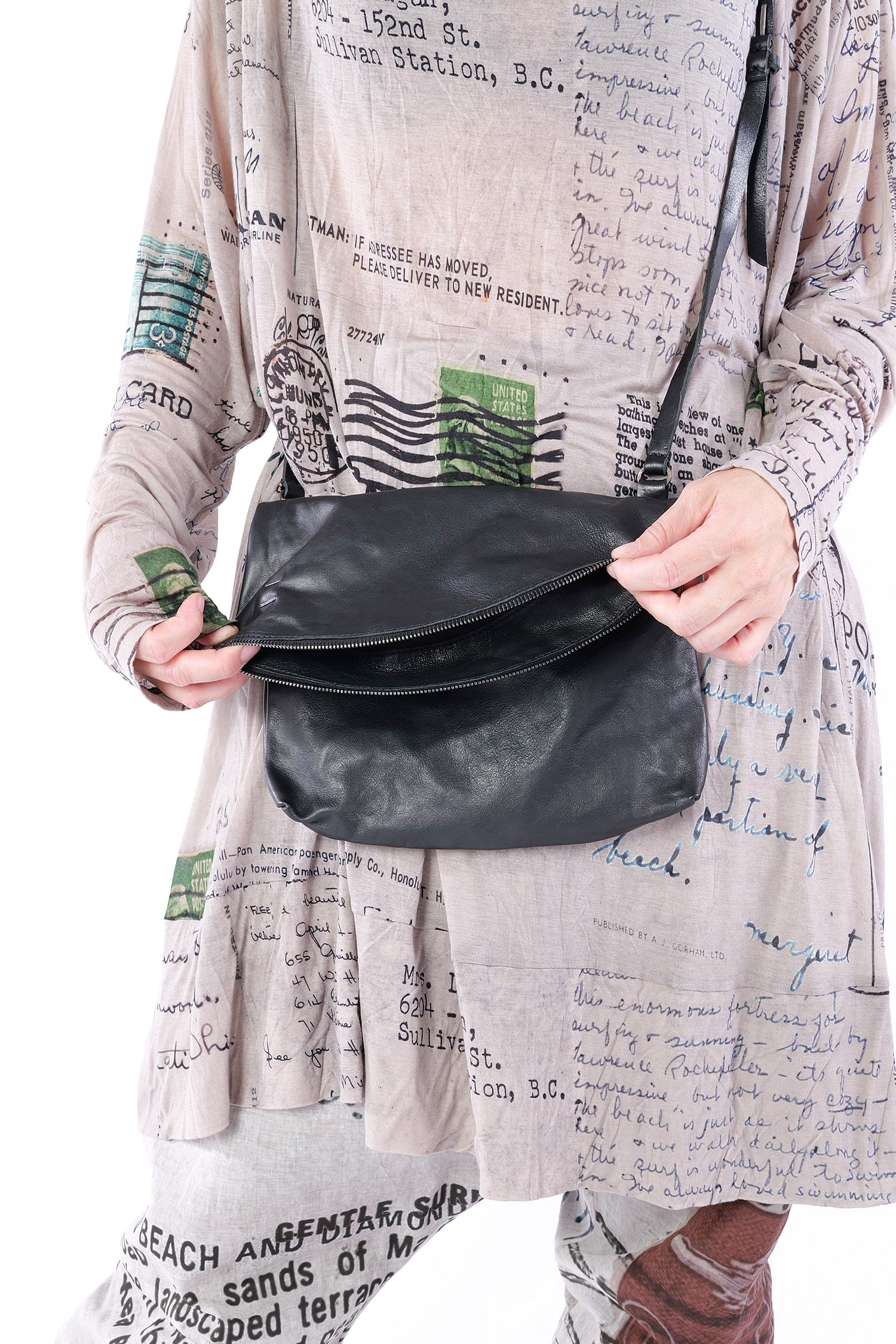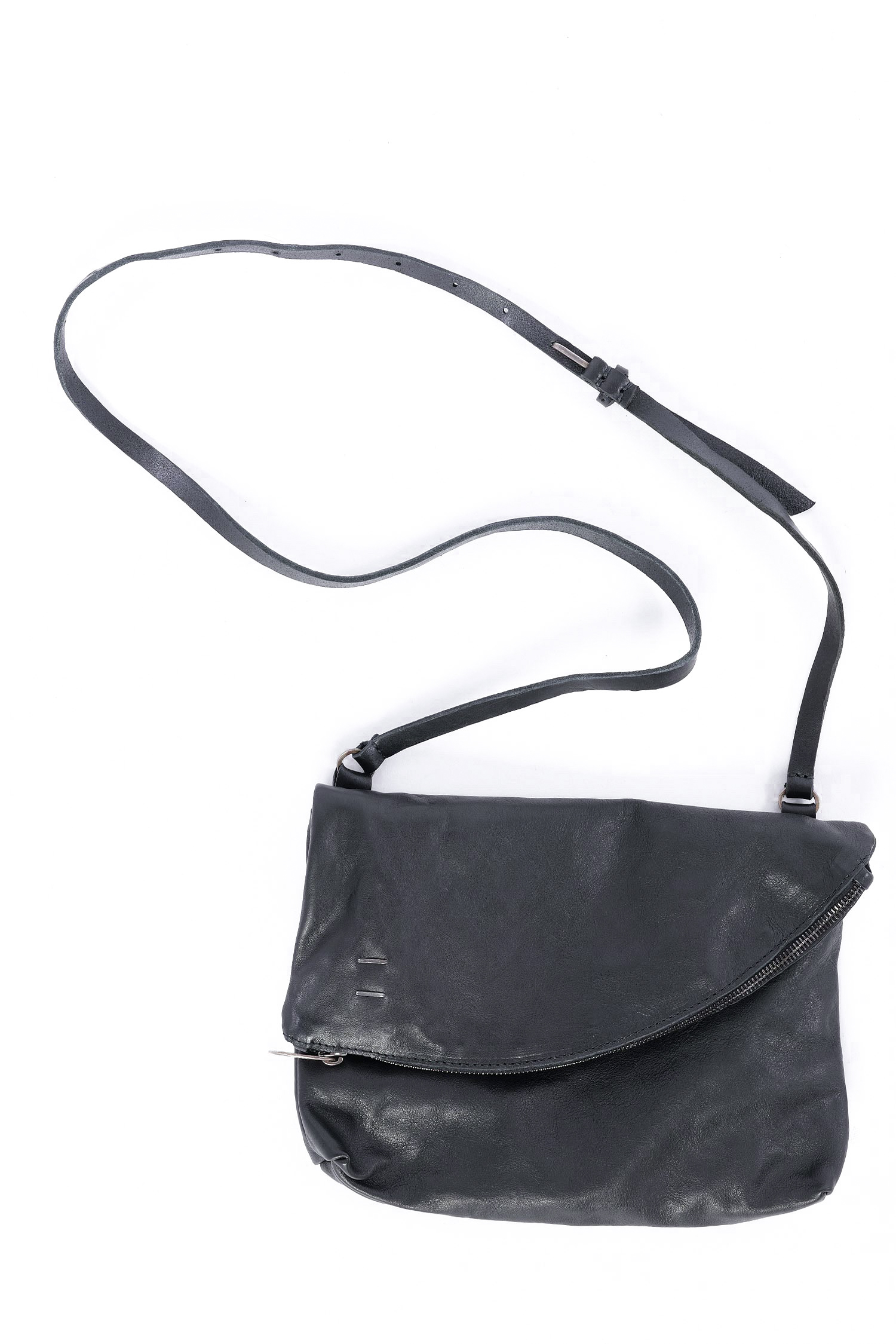 Details: - Turned-down look - Soft leather - Decorative silver details - Zipper with pendant made of silver - Long detailed adjustable leather strap with silver fastener - Cotton lining