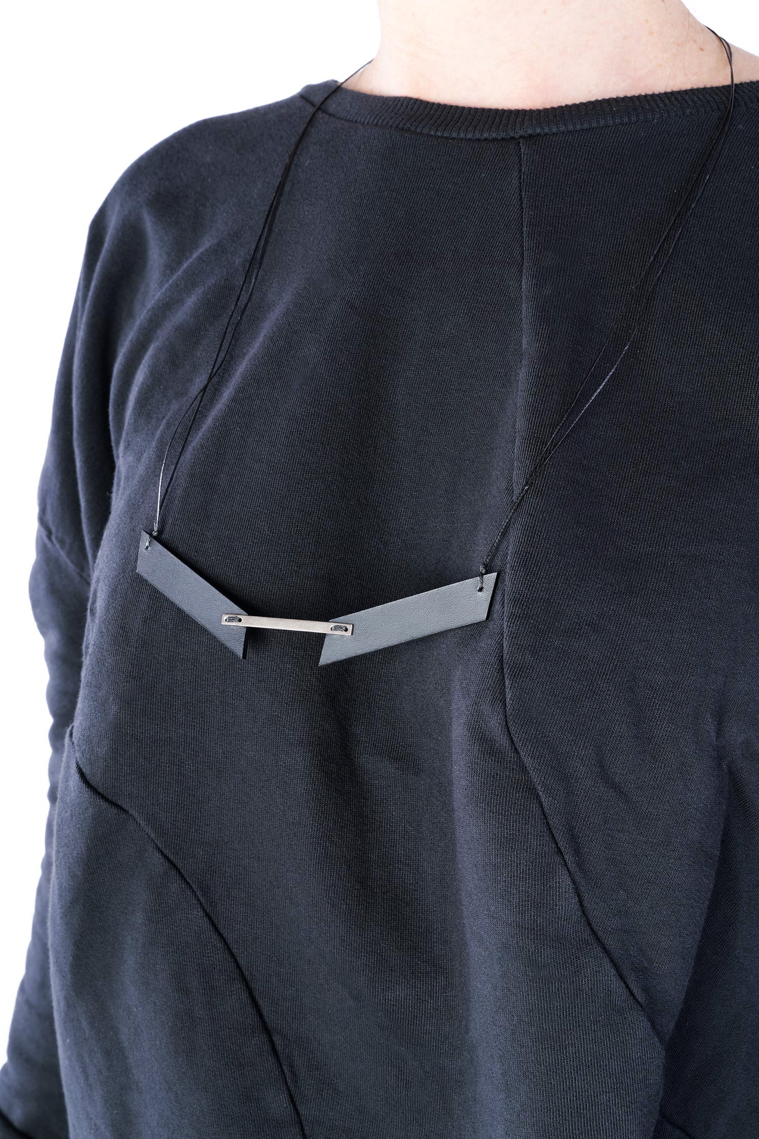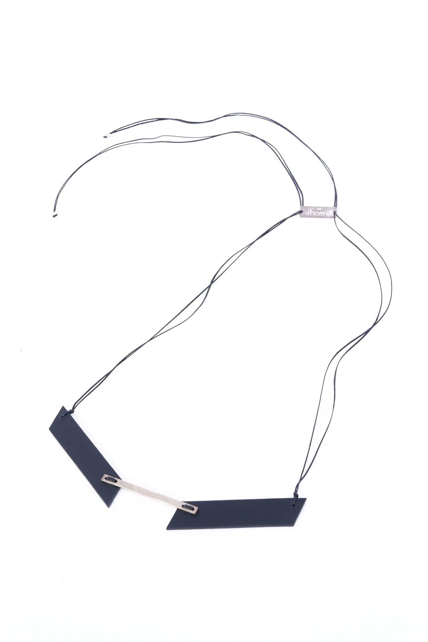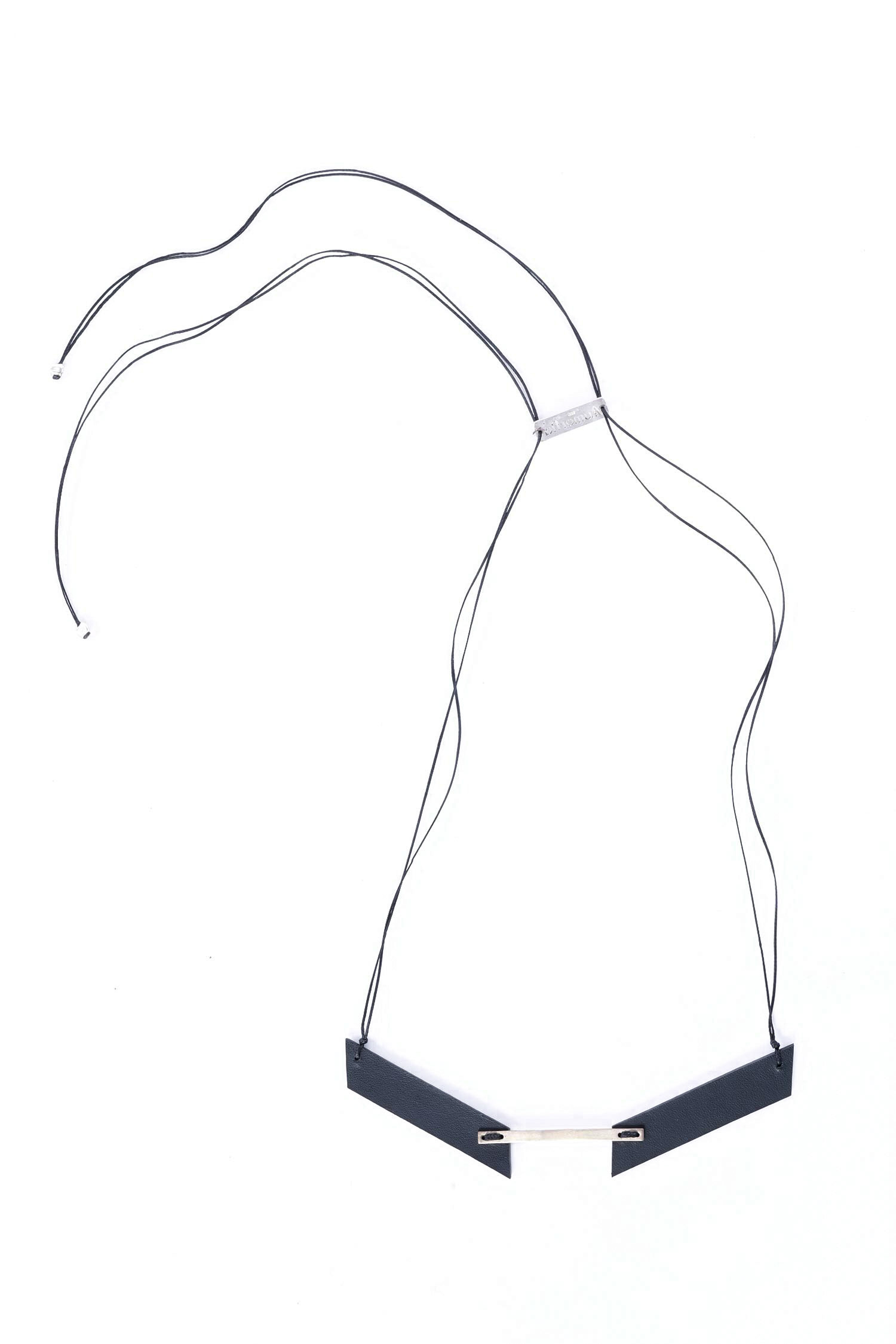Fine necklace with two leather rectangles and a silver bar by Aumorfia.