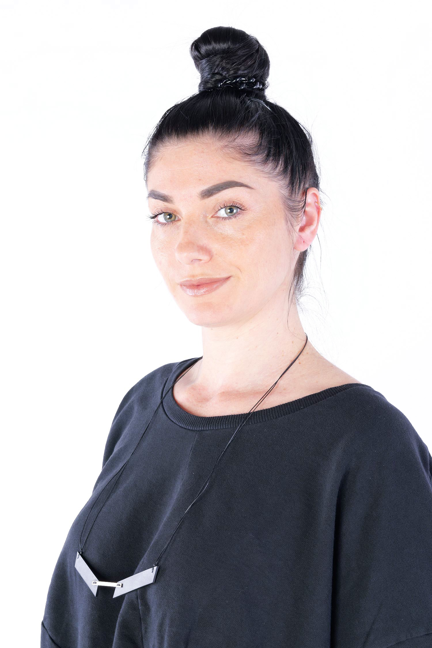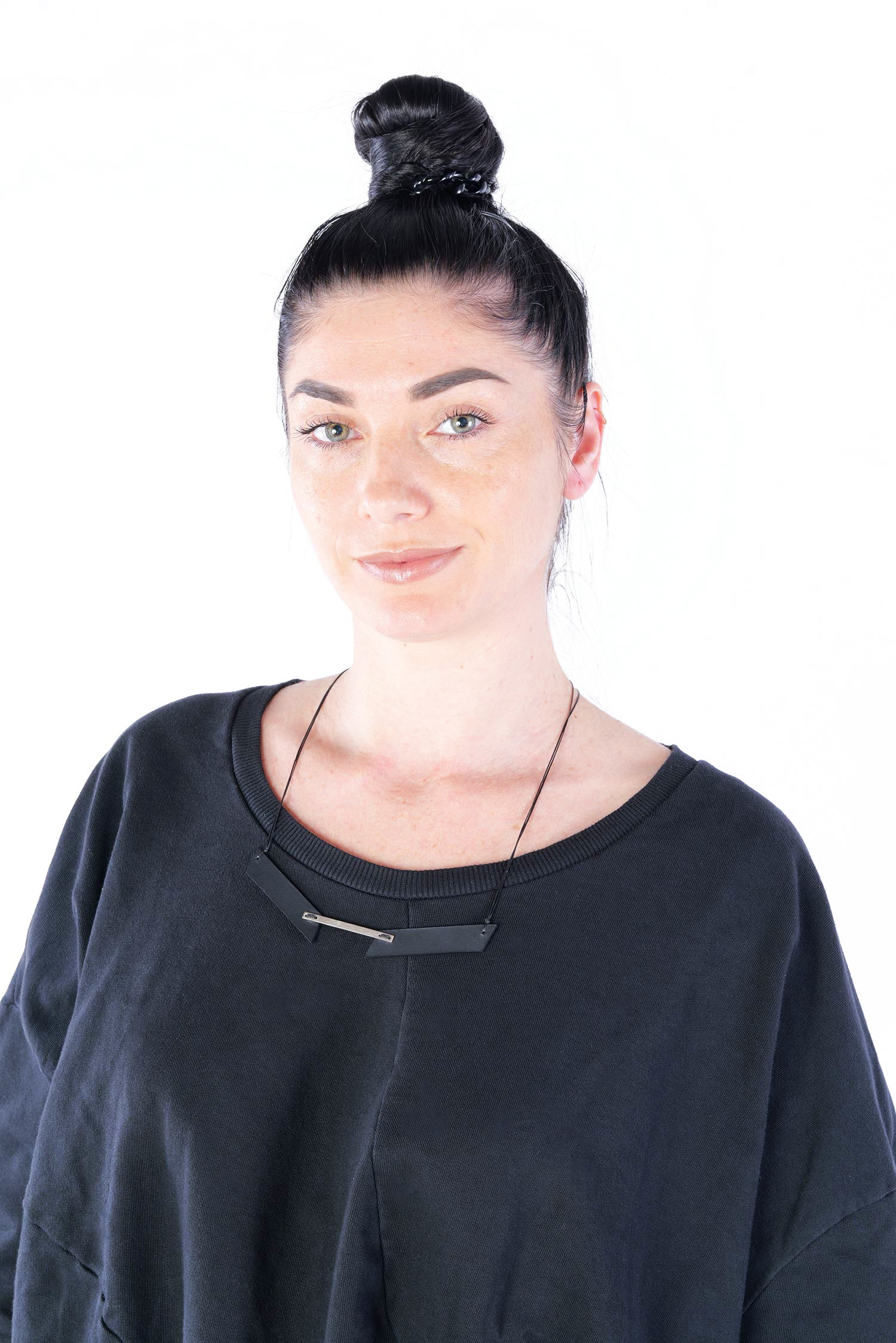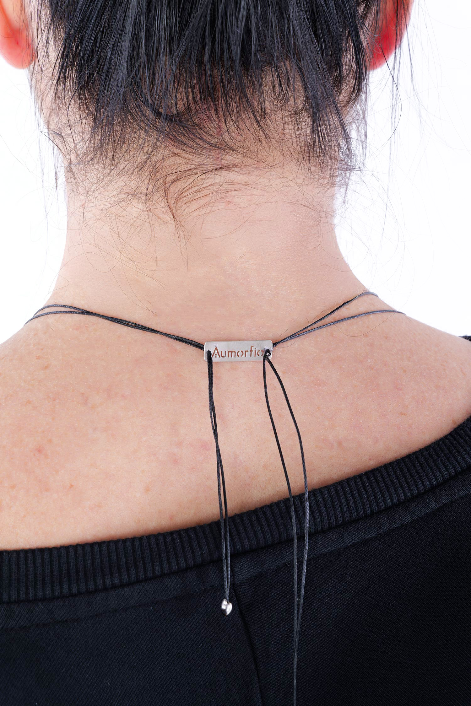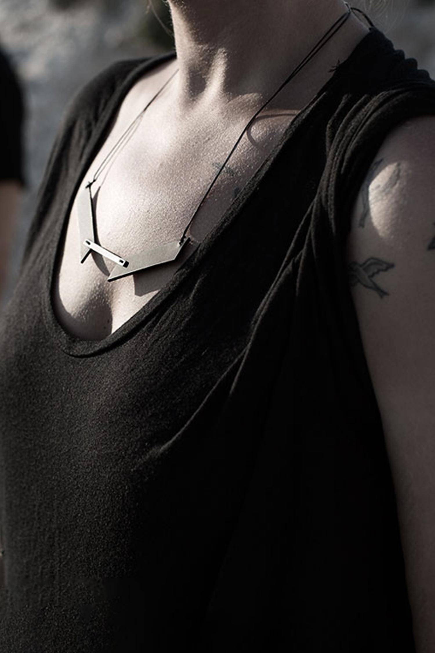 Fine necklace with two leather rectangles and a silver bar by Aumorfia.