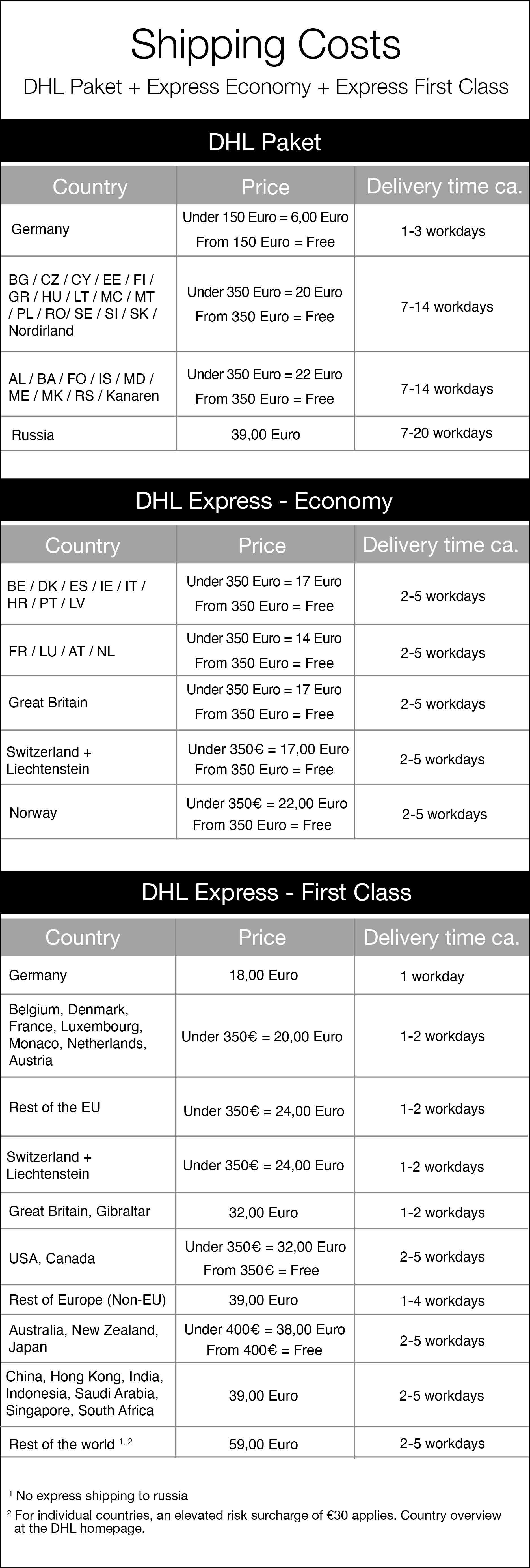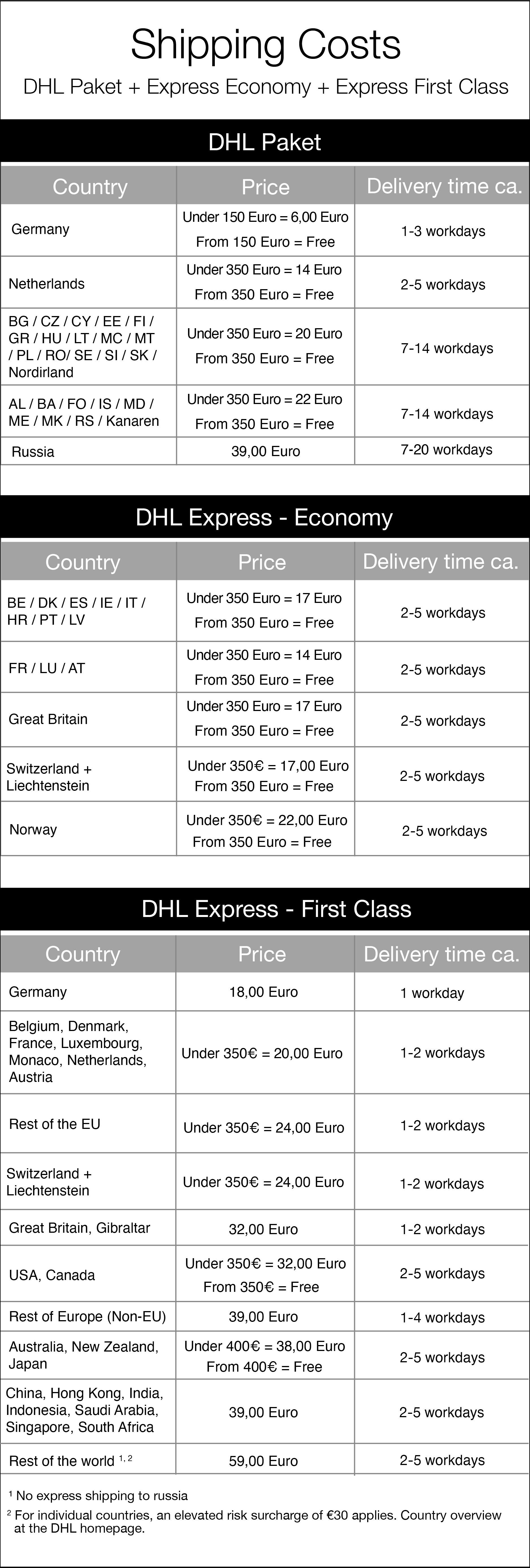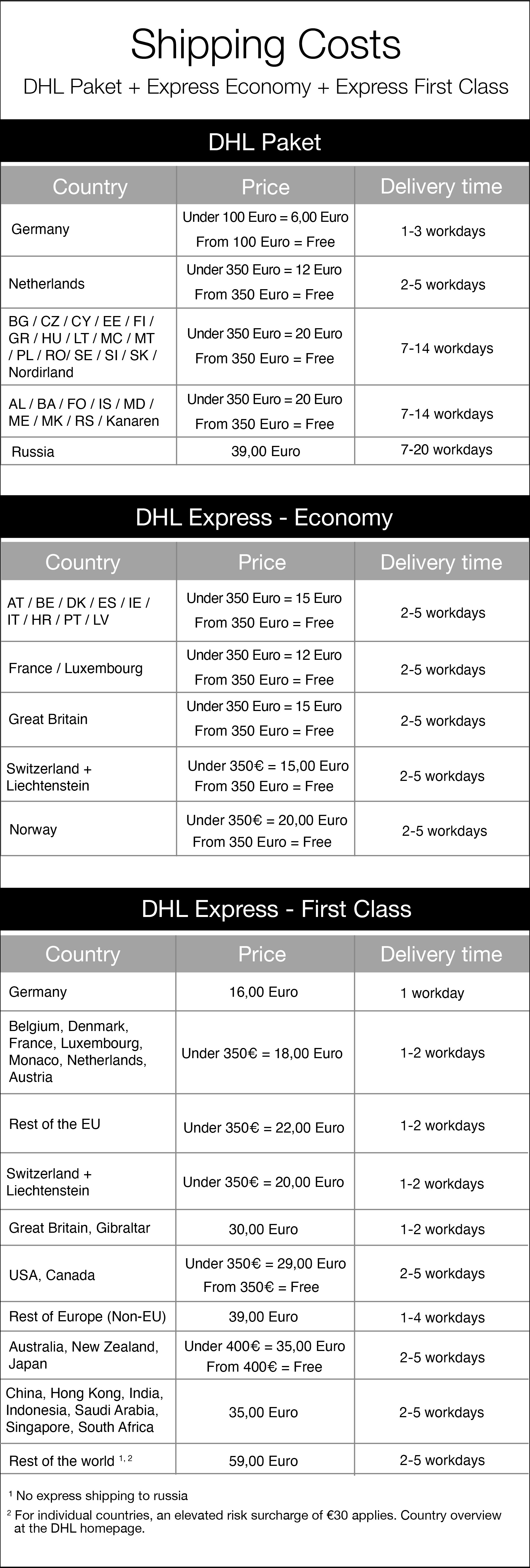 In case of an order with a value of goods over €1000 and a delivery address outside the EU, shipping will be delayed by +1-3 working days due to the customs exit declaration.