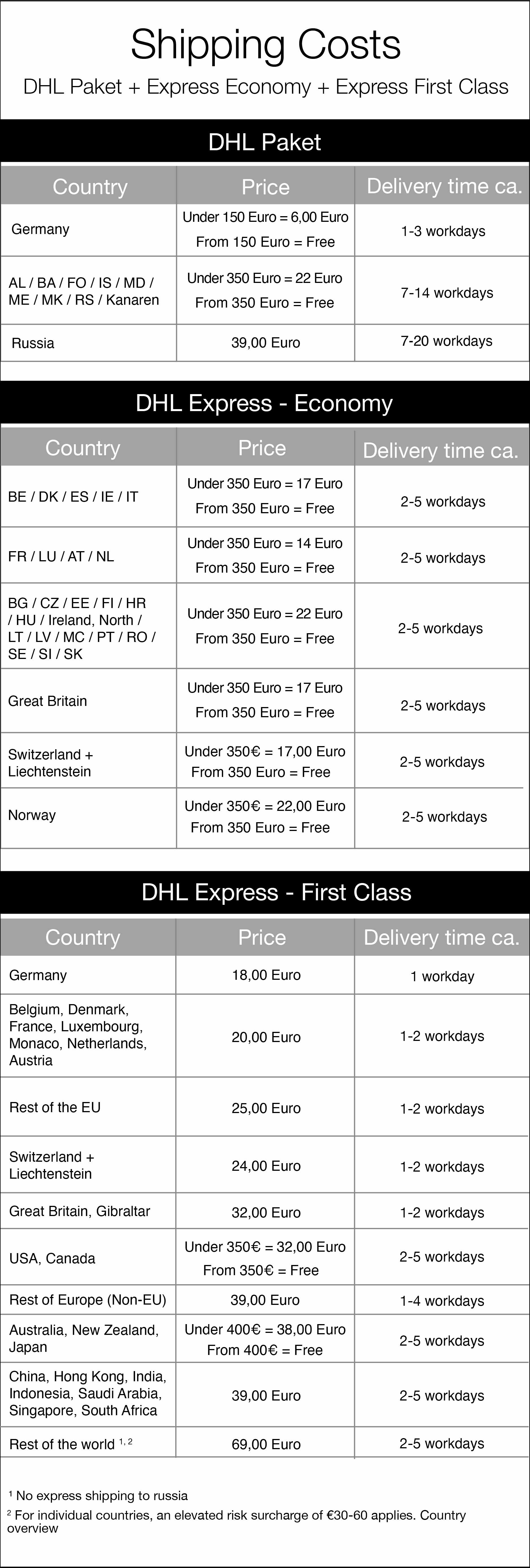 In case of an order with a value of goods over €1000 and a delivery address outside the EU, shipping will be delayed by +1-3 working days due to the customs exit declaration.
