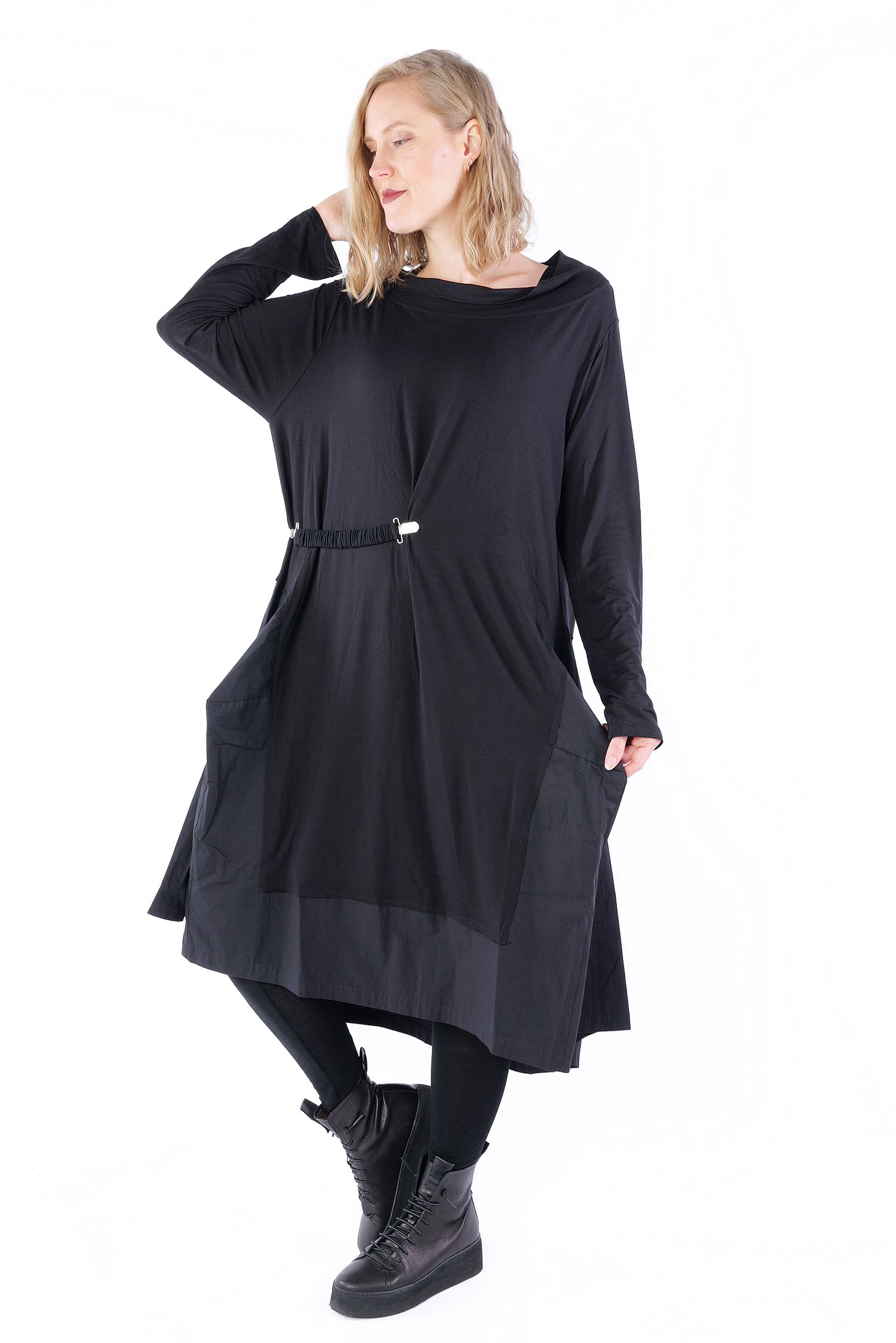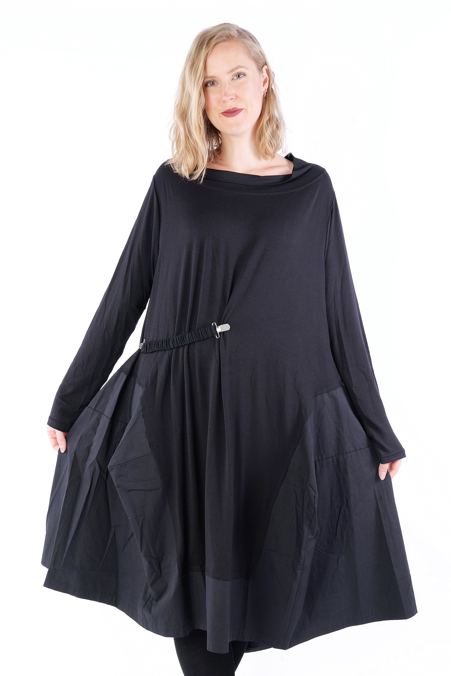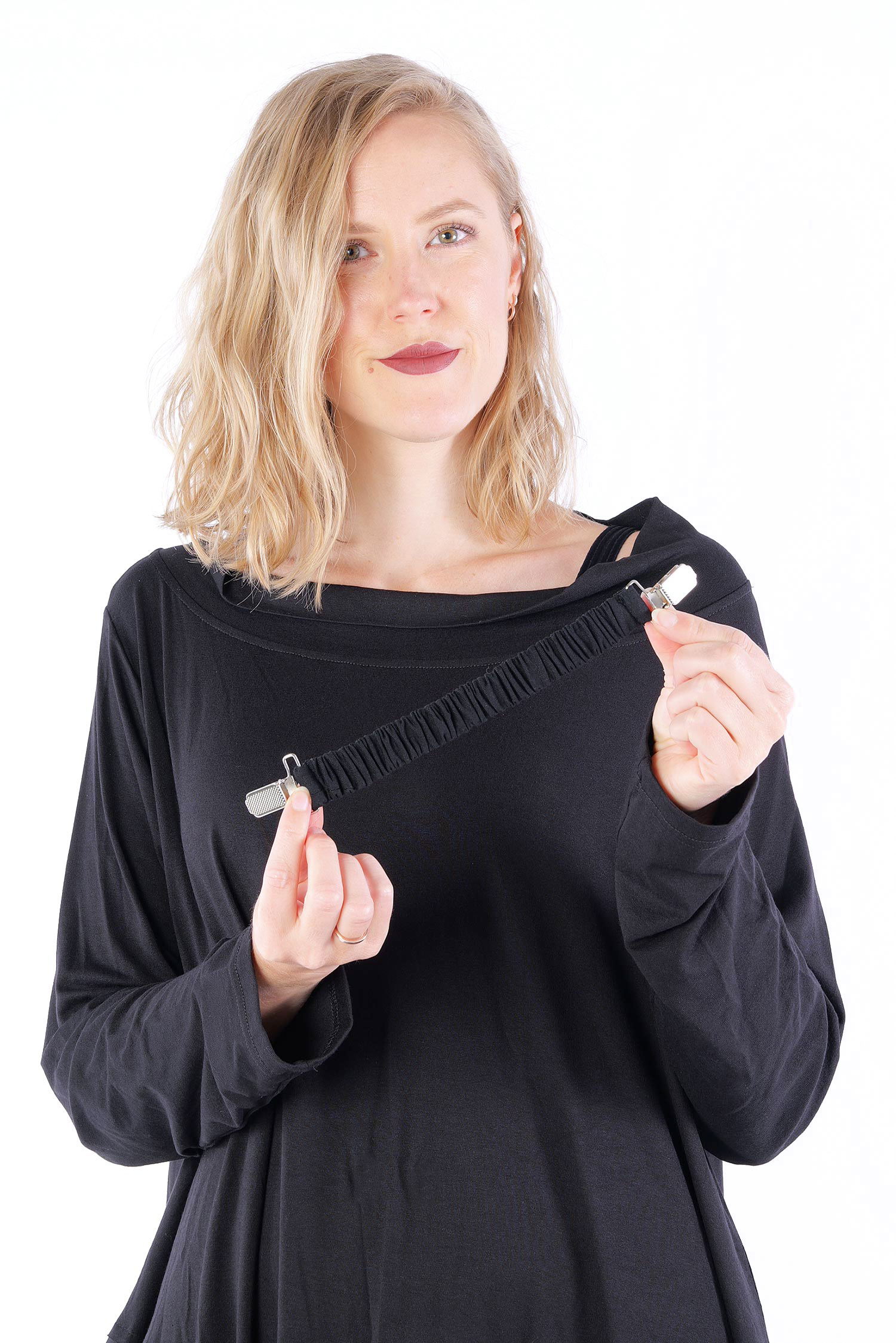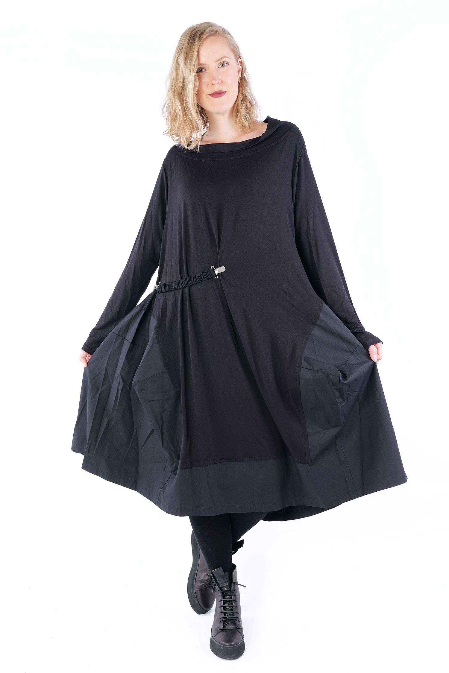 Details: - High neckline with waterfall-look - Jersey material - Cotton material at the side and on hem - Long sleeves - Tulip-shaped cut - Trimmed edges - Clip to vary width included