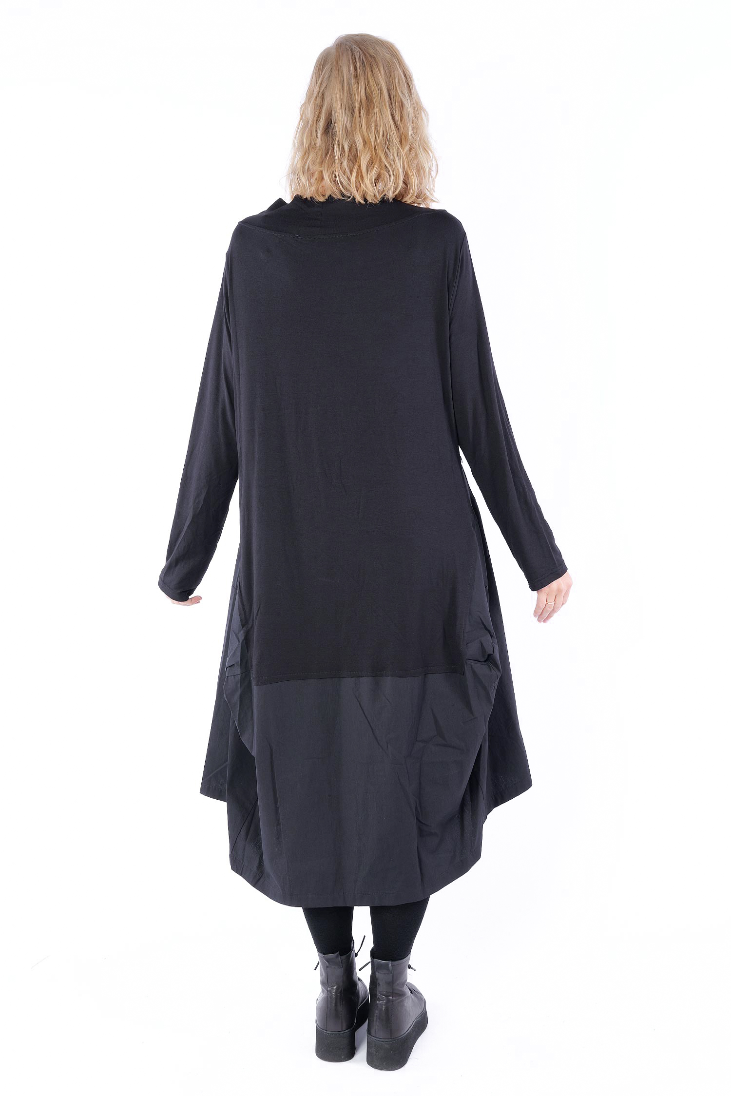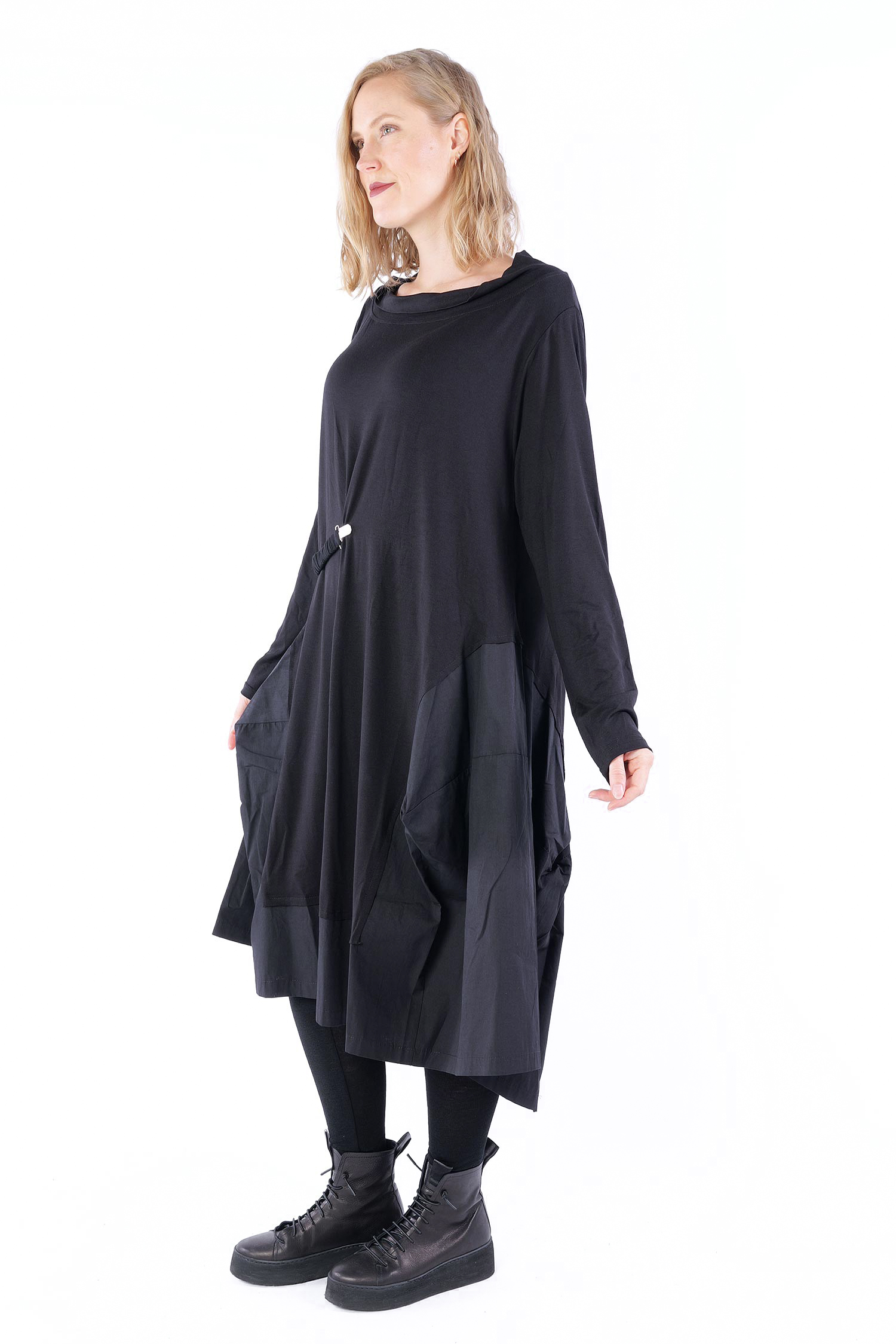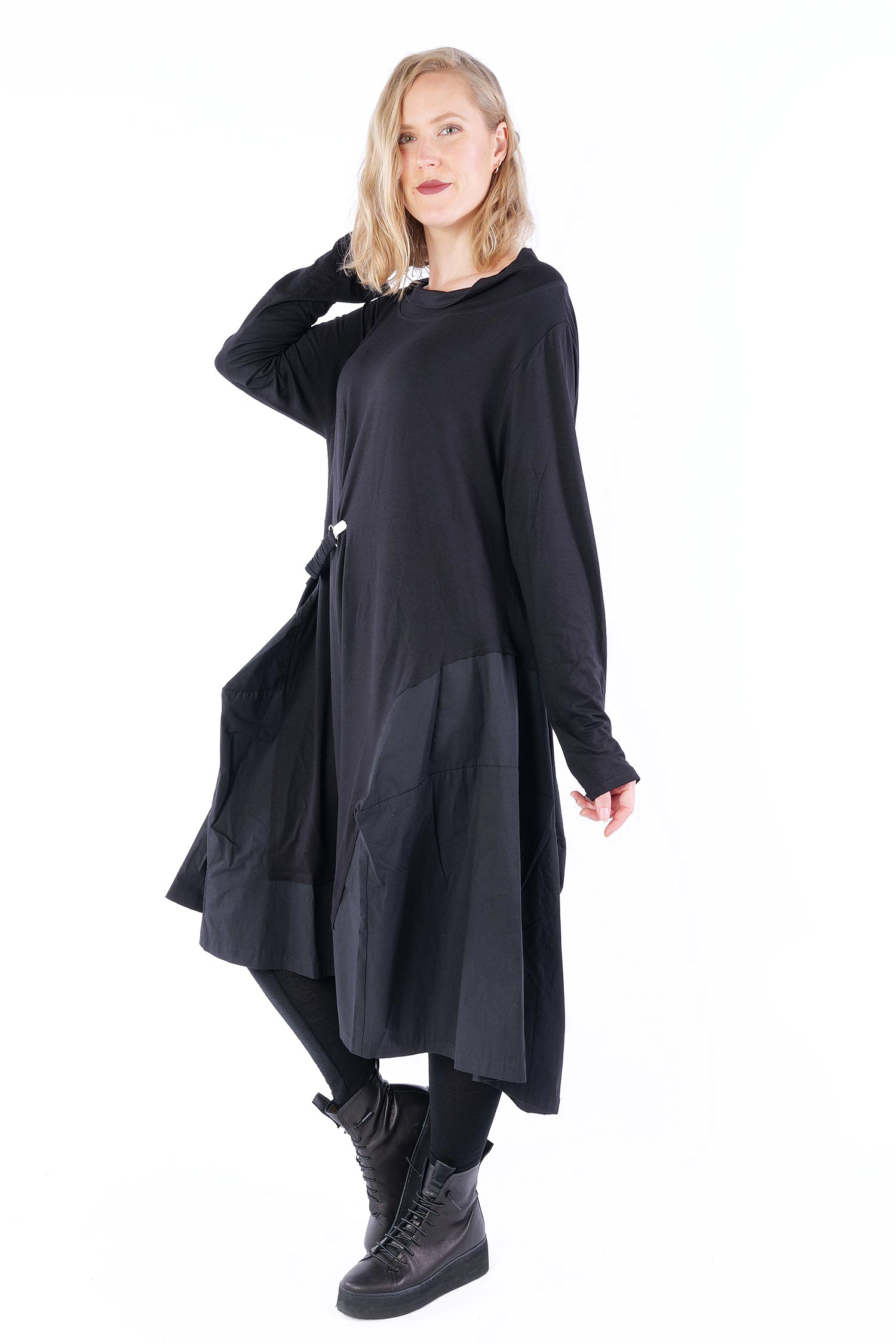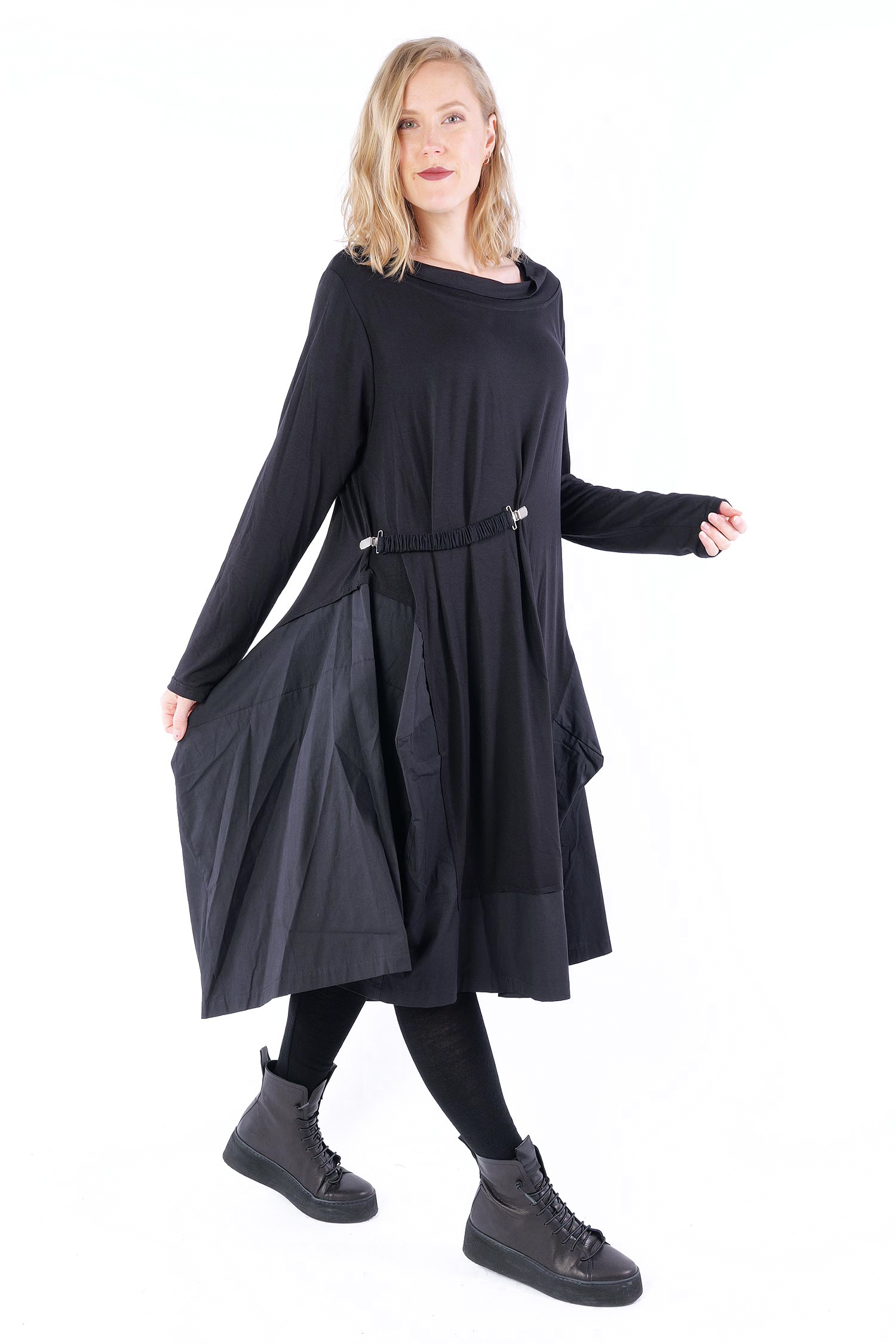 Details: - High neckline with waterfall-look - Jersey material - Cotton material at the side and on hem - Long sleeves - Tulip-shaped cut - Trimmed edges - Clip to vary width included