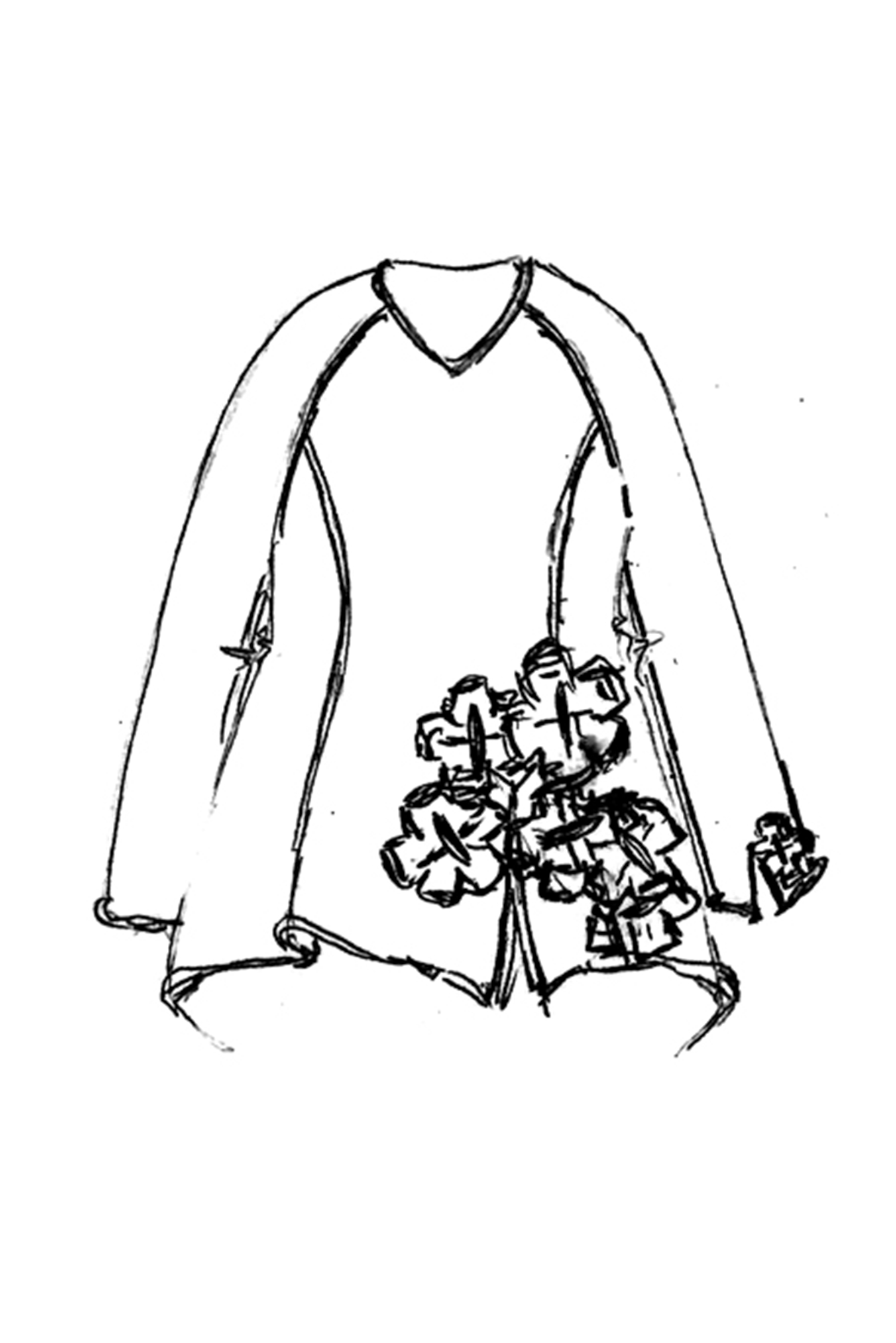 Details: - Hems rolled up - Cut on one sleeve - A-line - Cut at the front side of hem - Round neck - Abstract blossom appliqués - Seams towards the outside