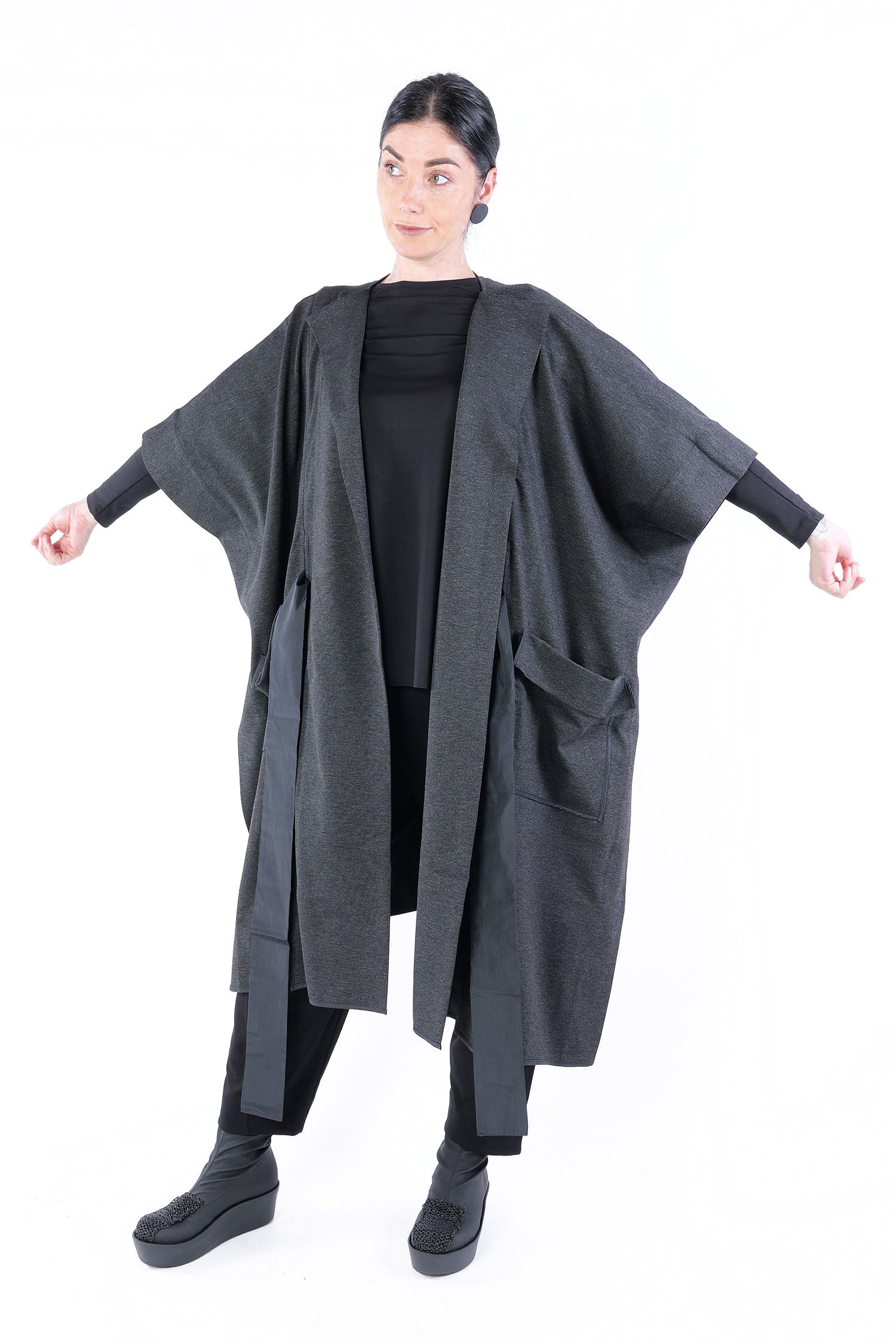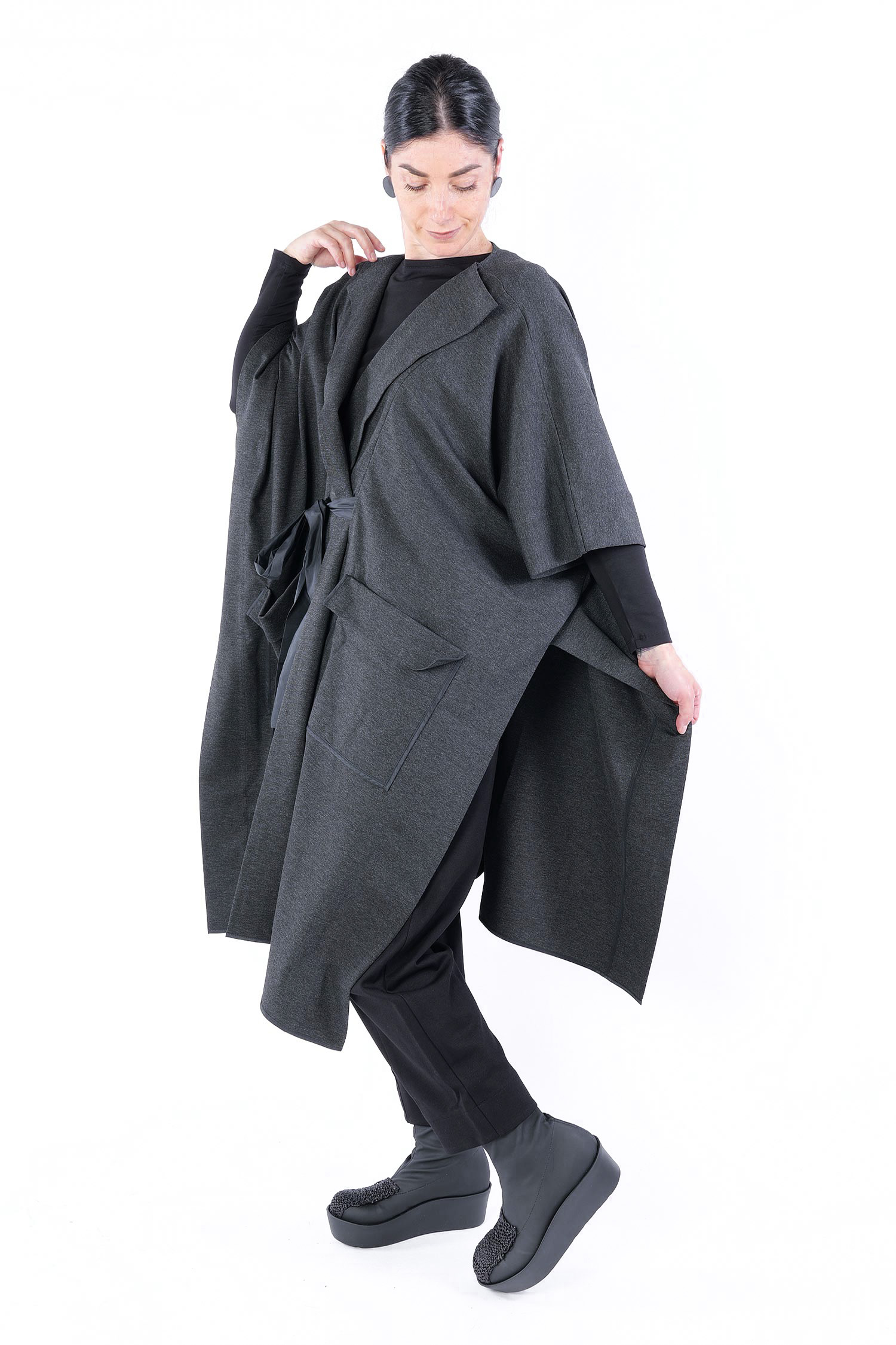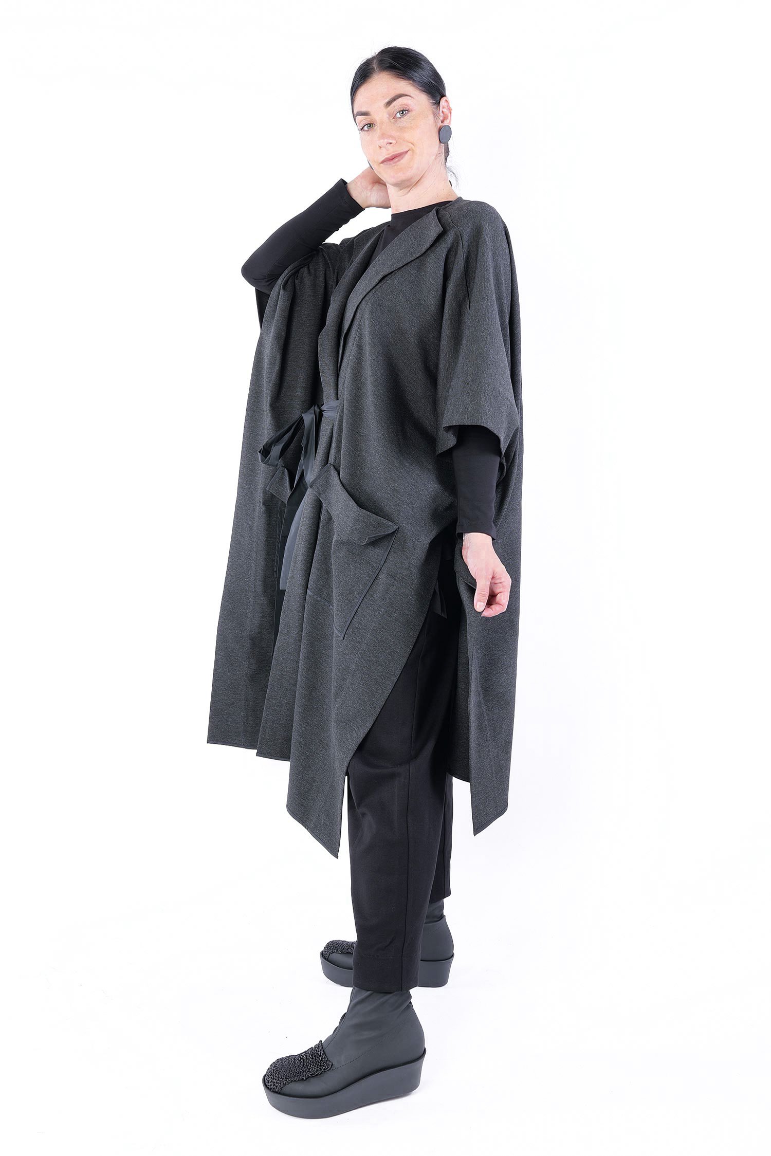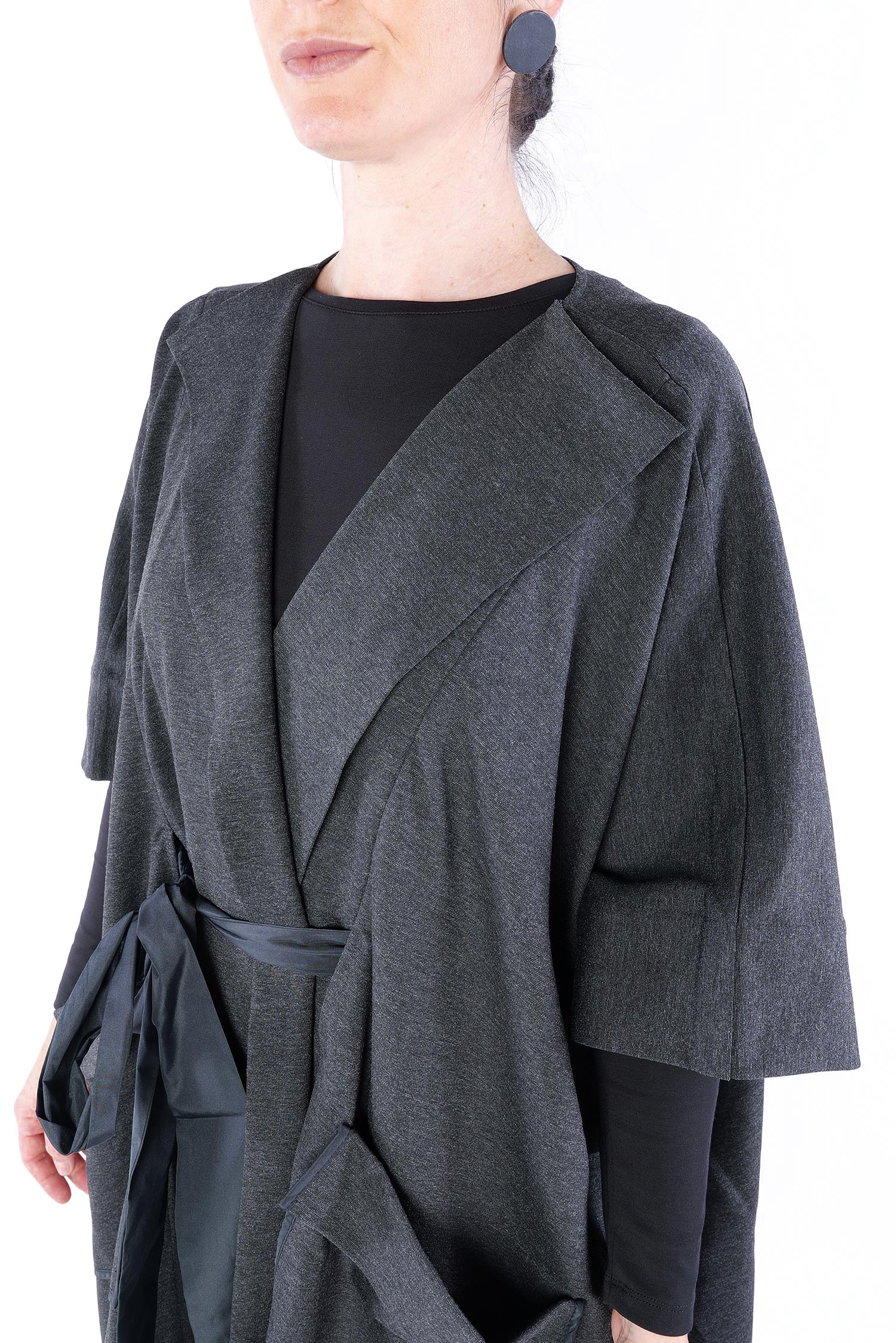 Details: - Extended shoulder, ¾ length sleeves - Tie belt made of taffeta at inner back side, which creates enough width - Very loose and square - Attached pockets piped with taffeta - Trimmed edges - Cape-like cut - Extended shoulder
